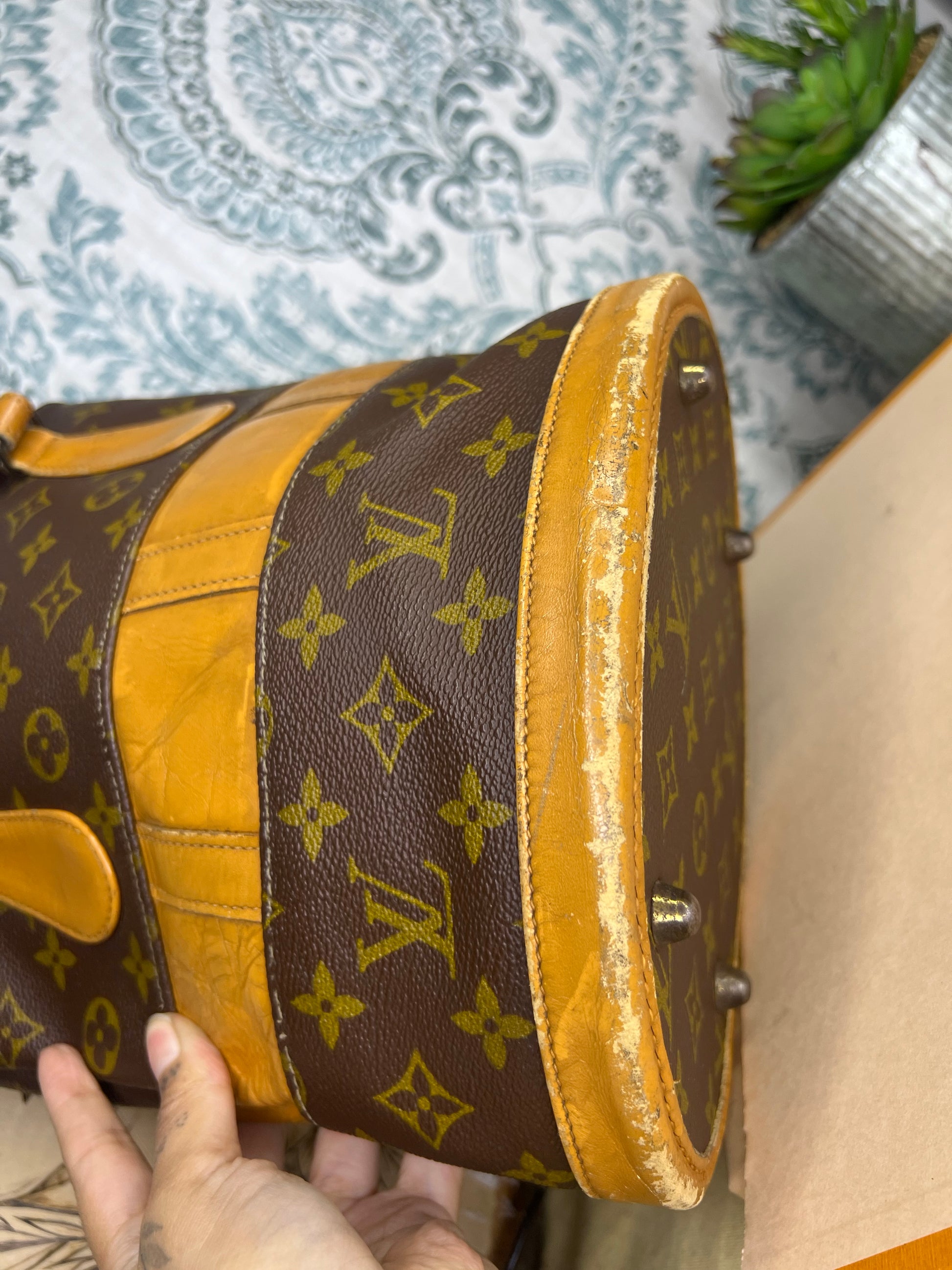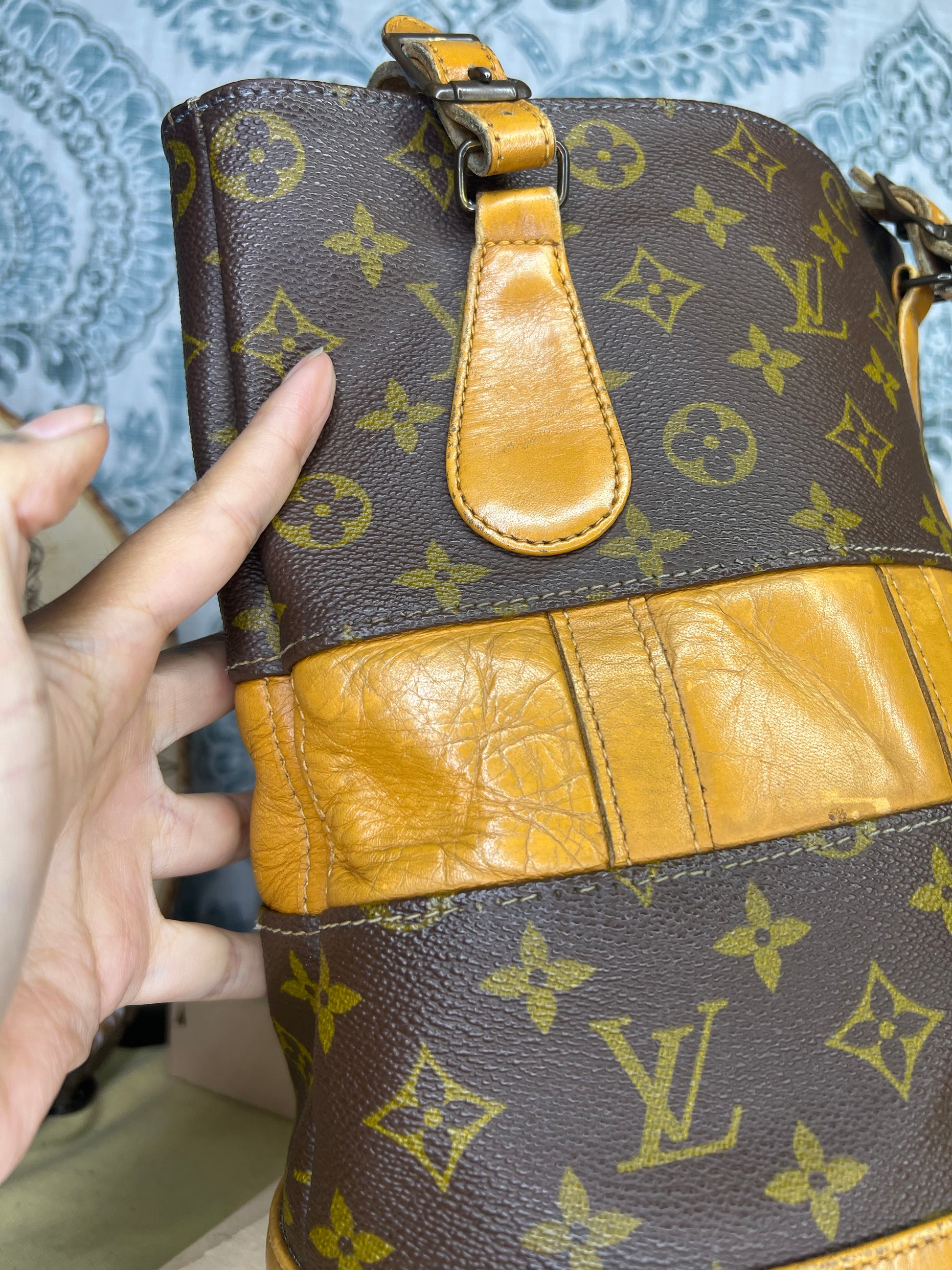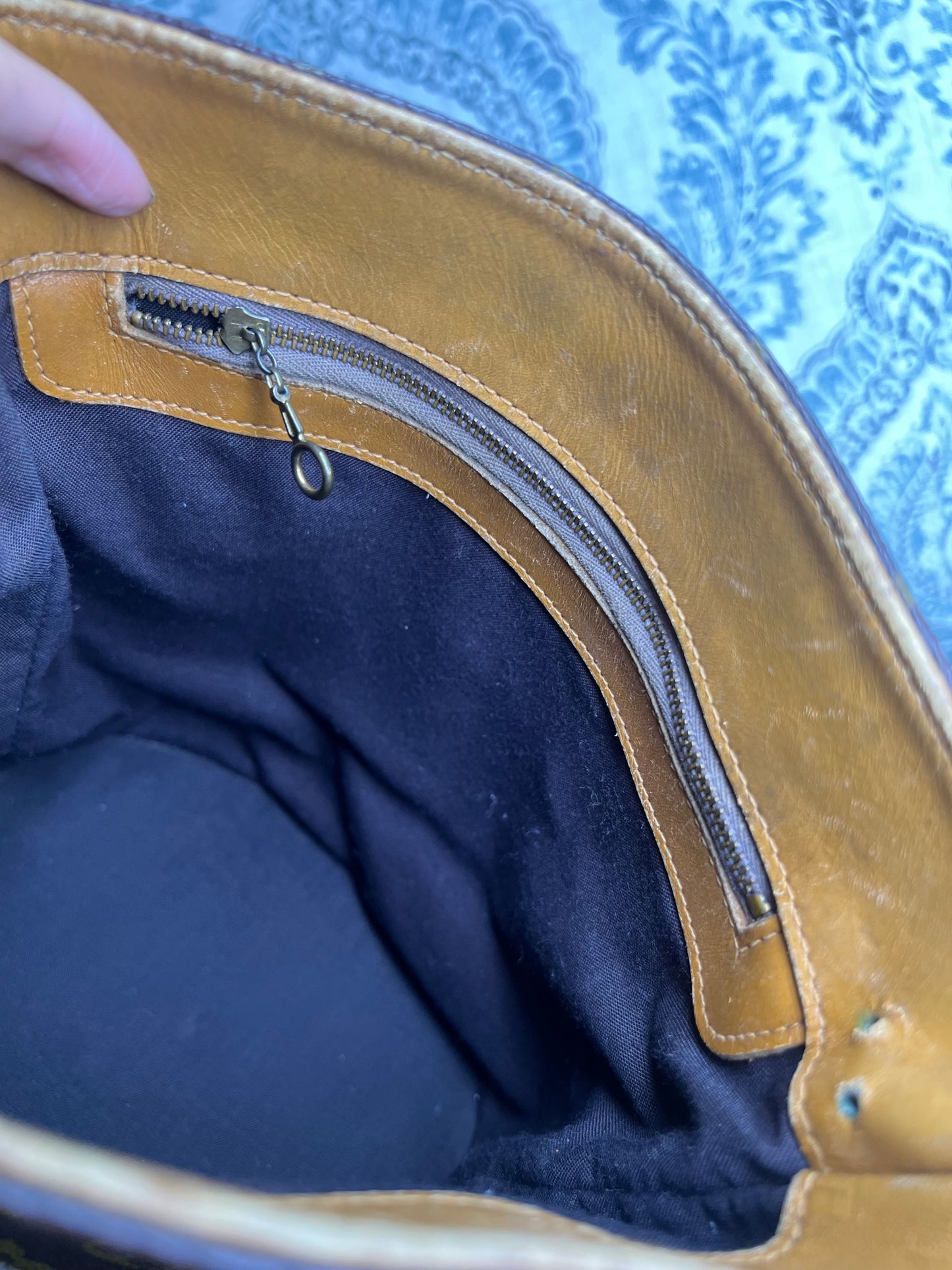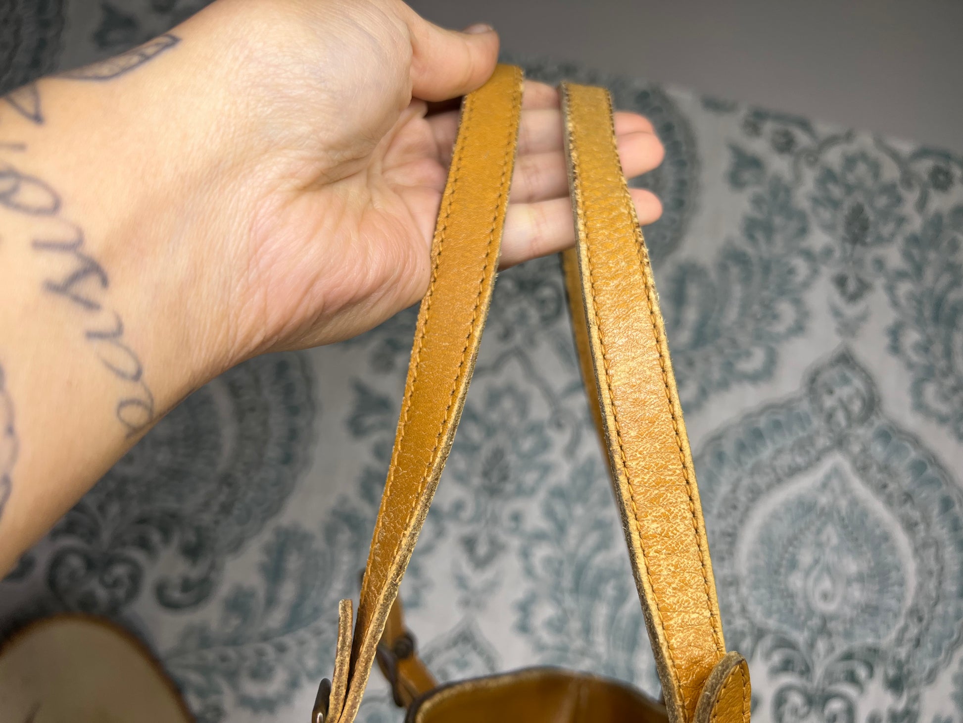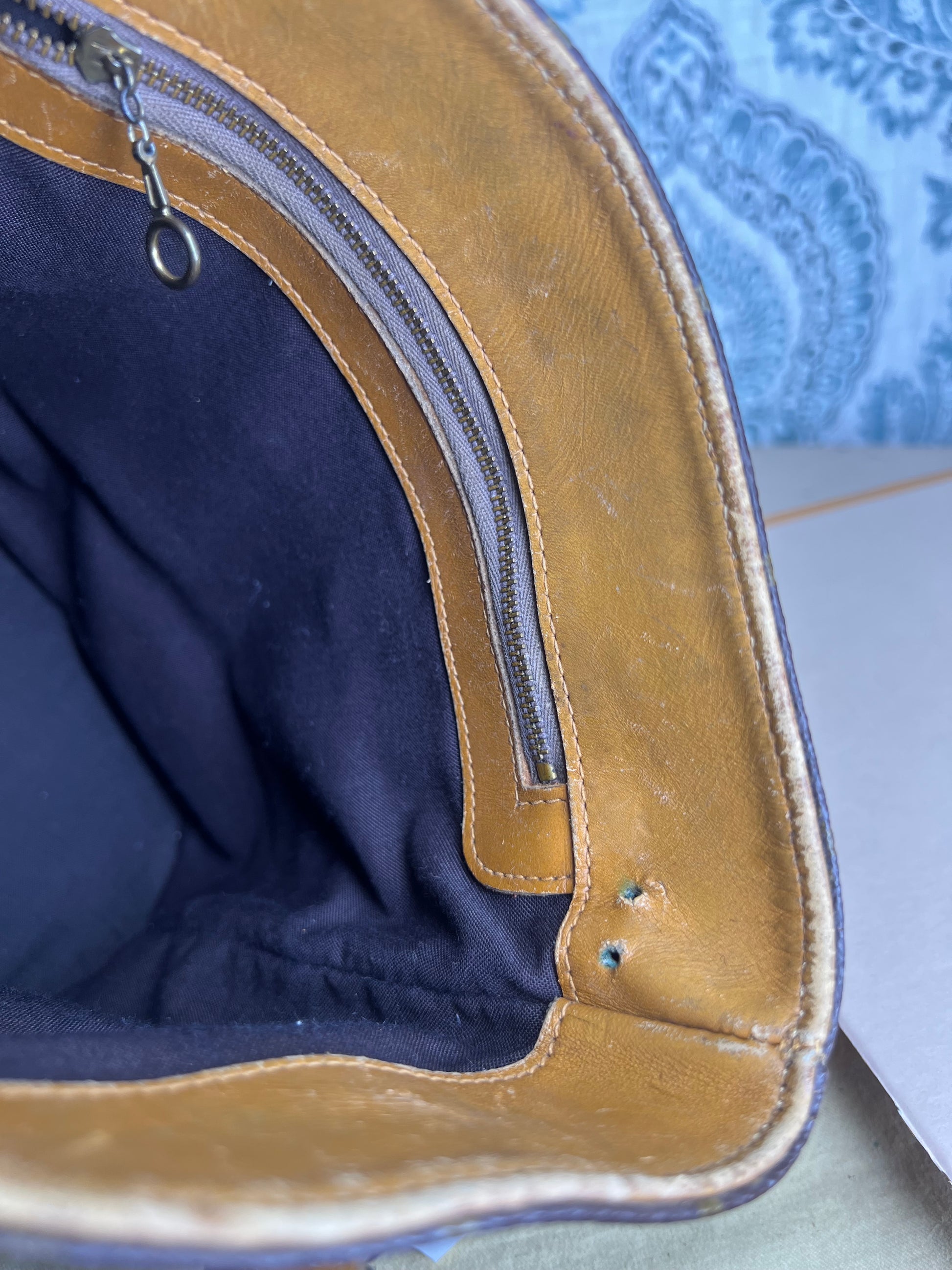 šø Handles have scuffs and surface cracking, but are sturdy overall. Chaps are strong. Dryness and scuffs present on leather. Base of the bag has scuffs and rubs. Some black staining on leather