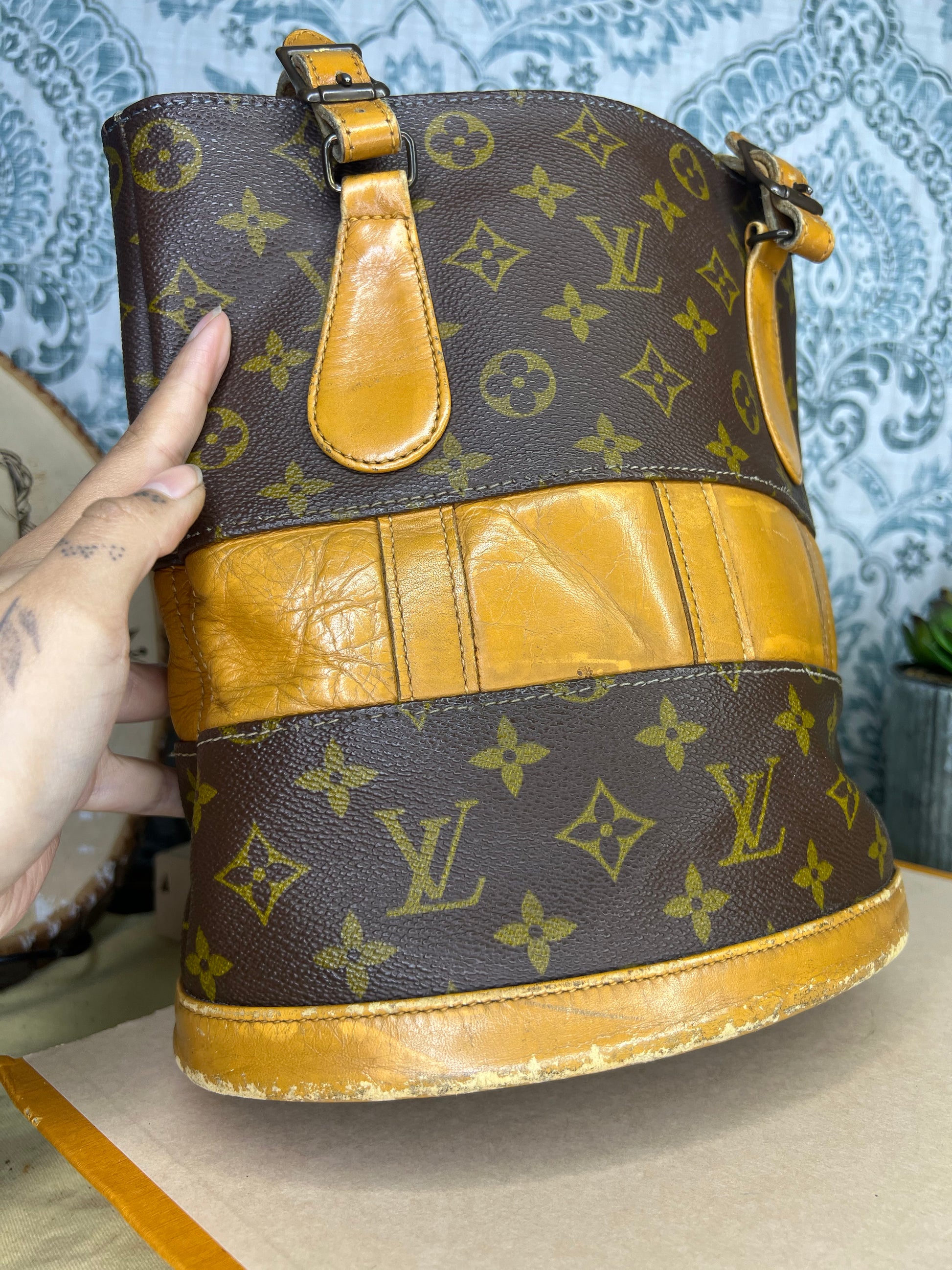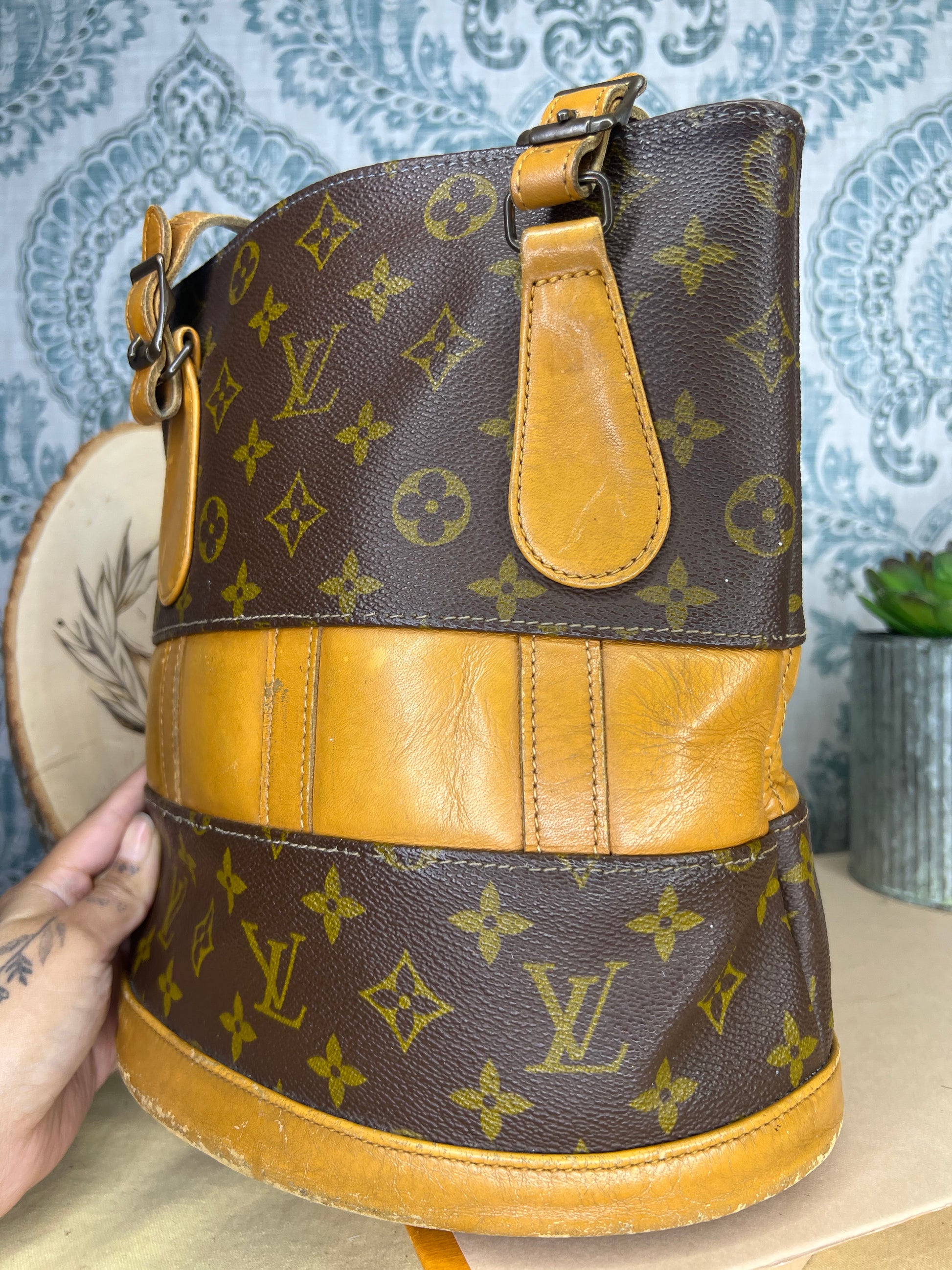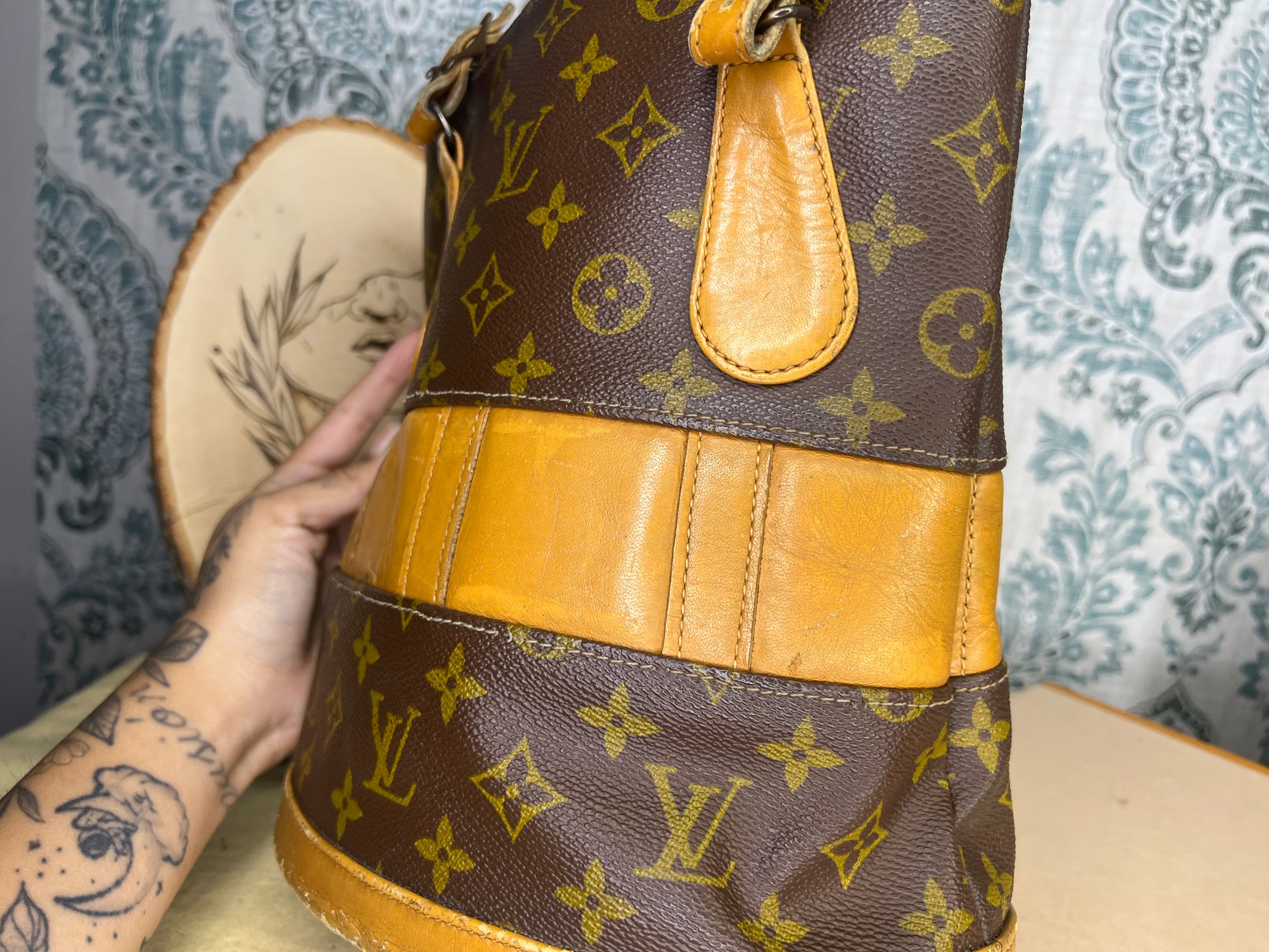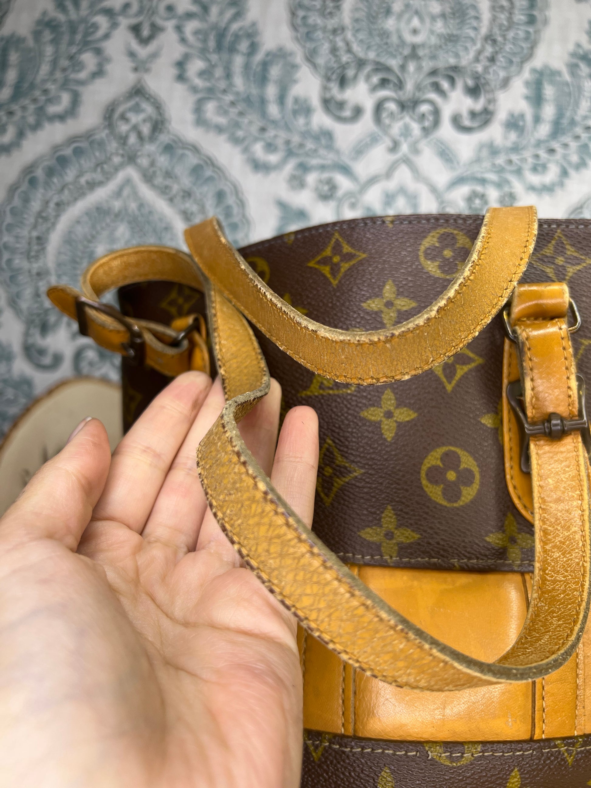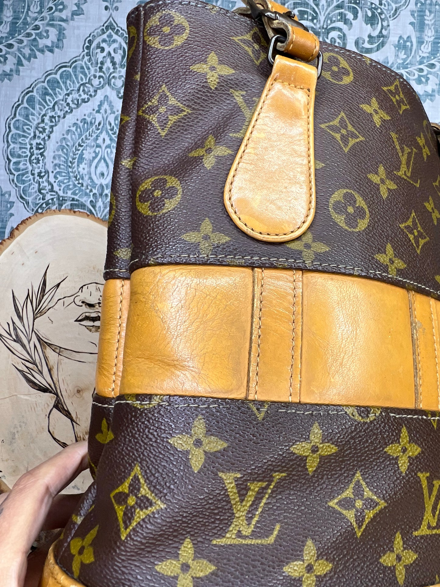 šø Handles have scuffs and surface cracking, but are sturdy overall. Chaps are strong. Dryness and scuffs present on leather. Base of the bag has scuffs and rubs. Some black staining on leather