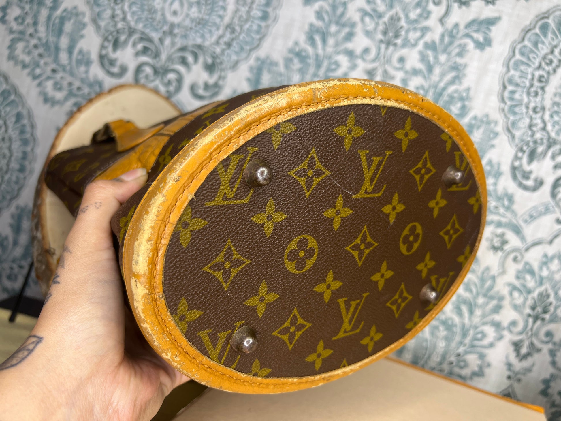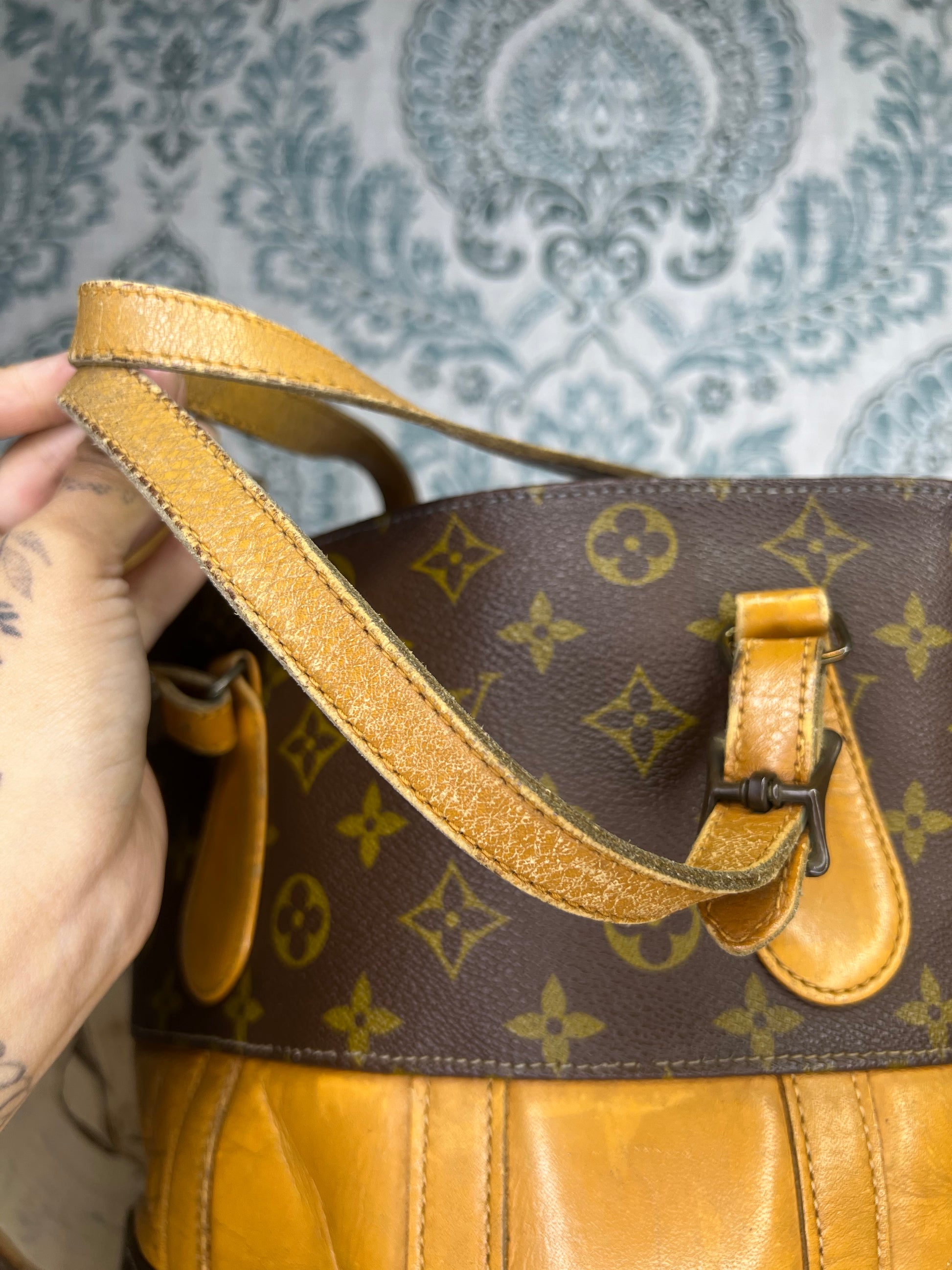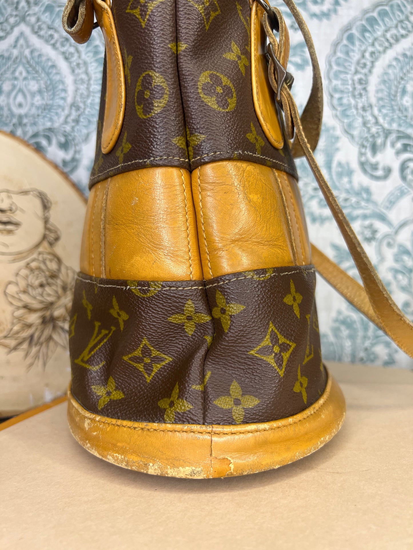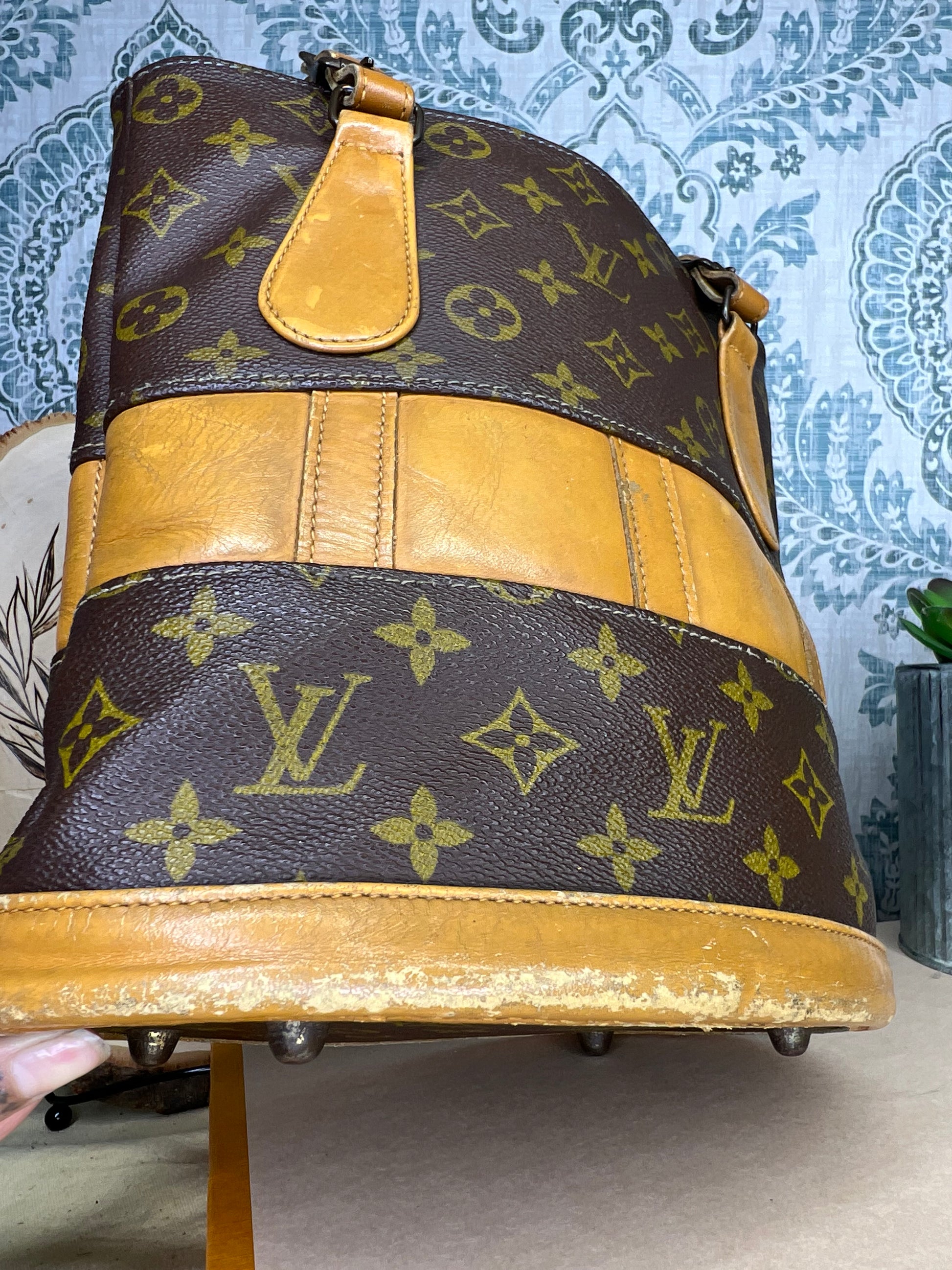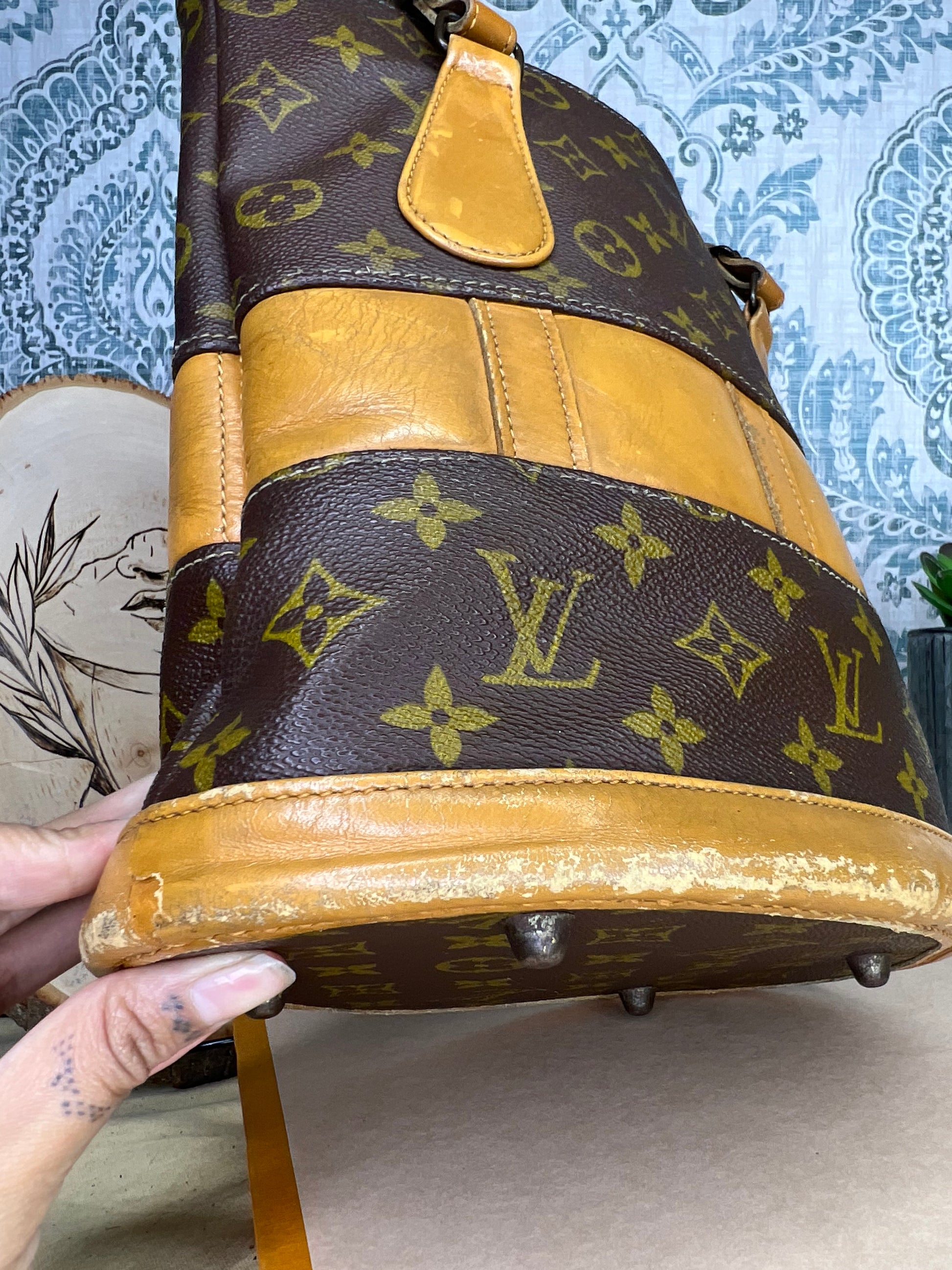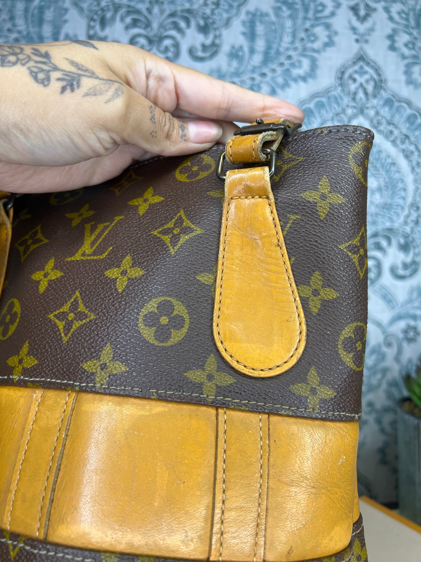 šø Handles have scuffs and surface cracking, but are sturdy overall. Chaps are strong. Dryness and scuffs present on leather. Base of the bag has scuffs and rubs. Some black staining on leather