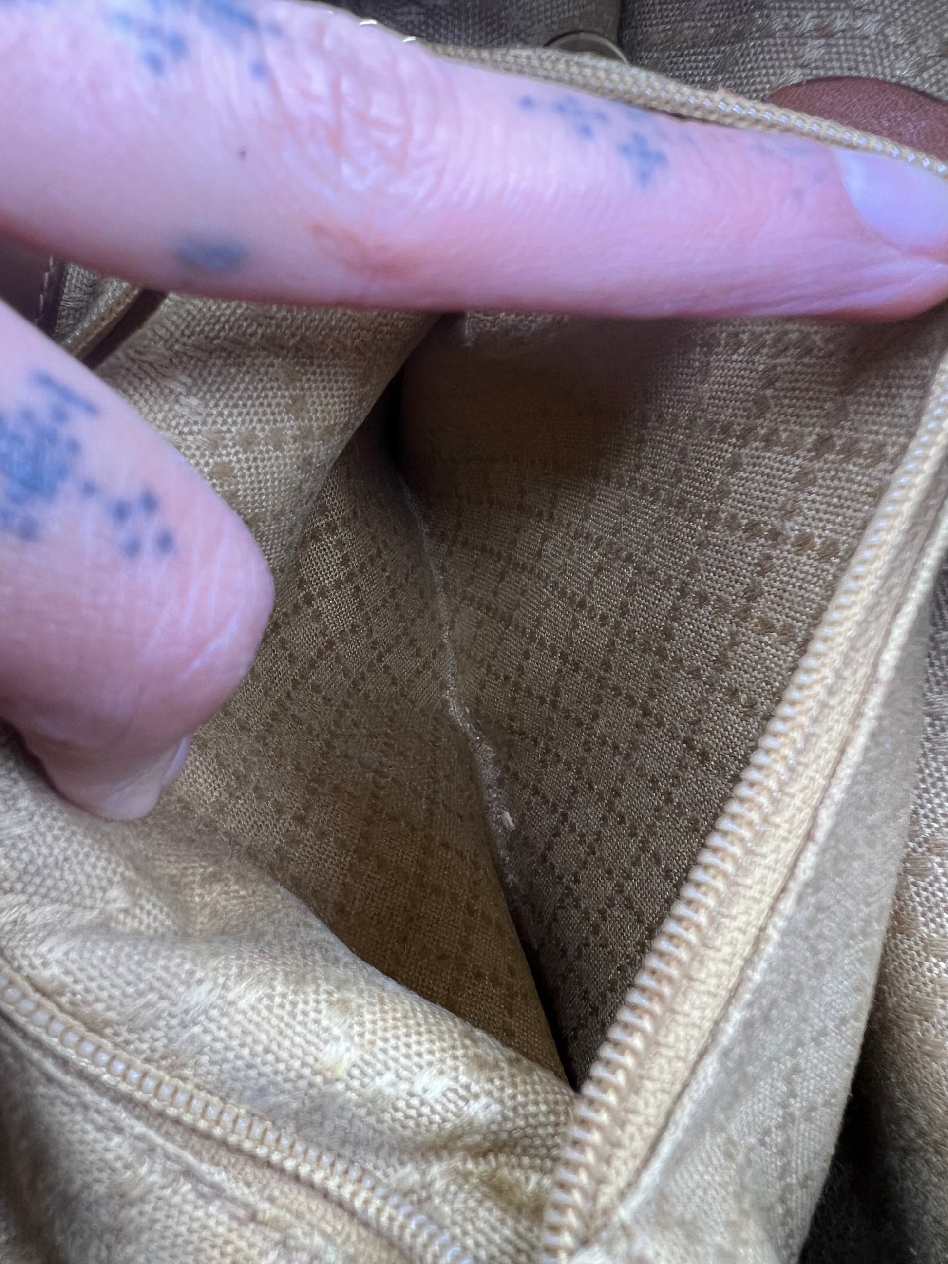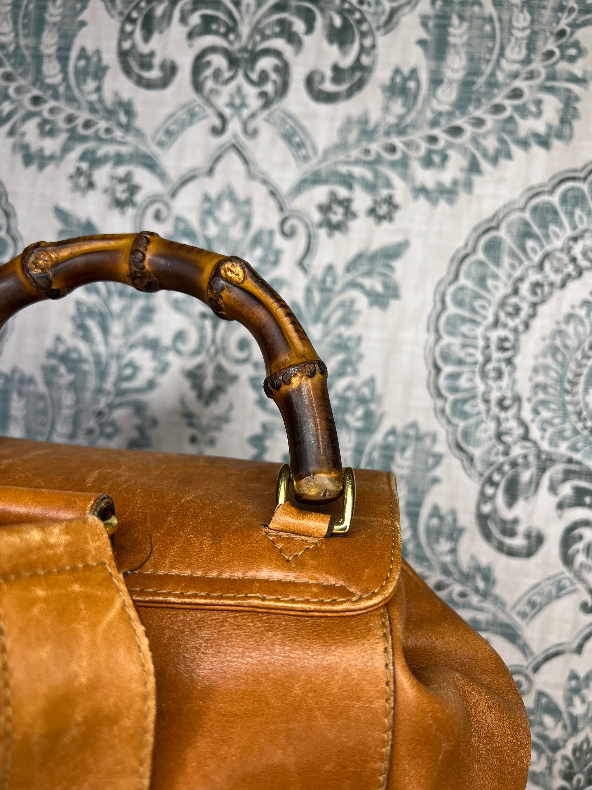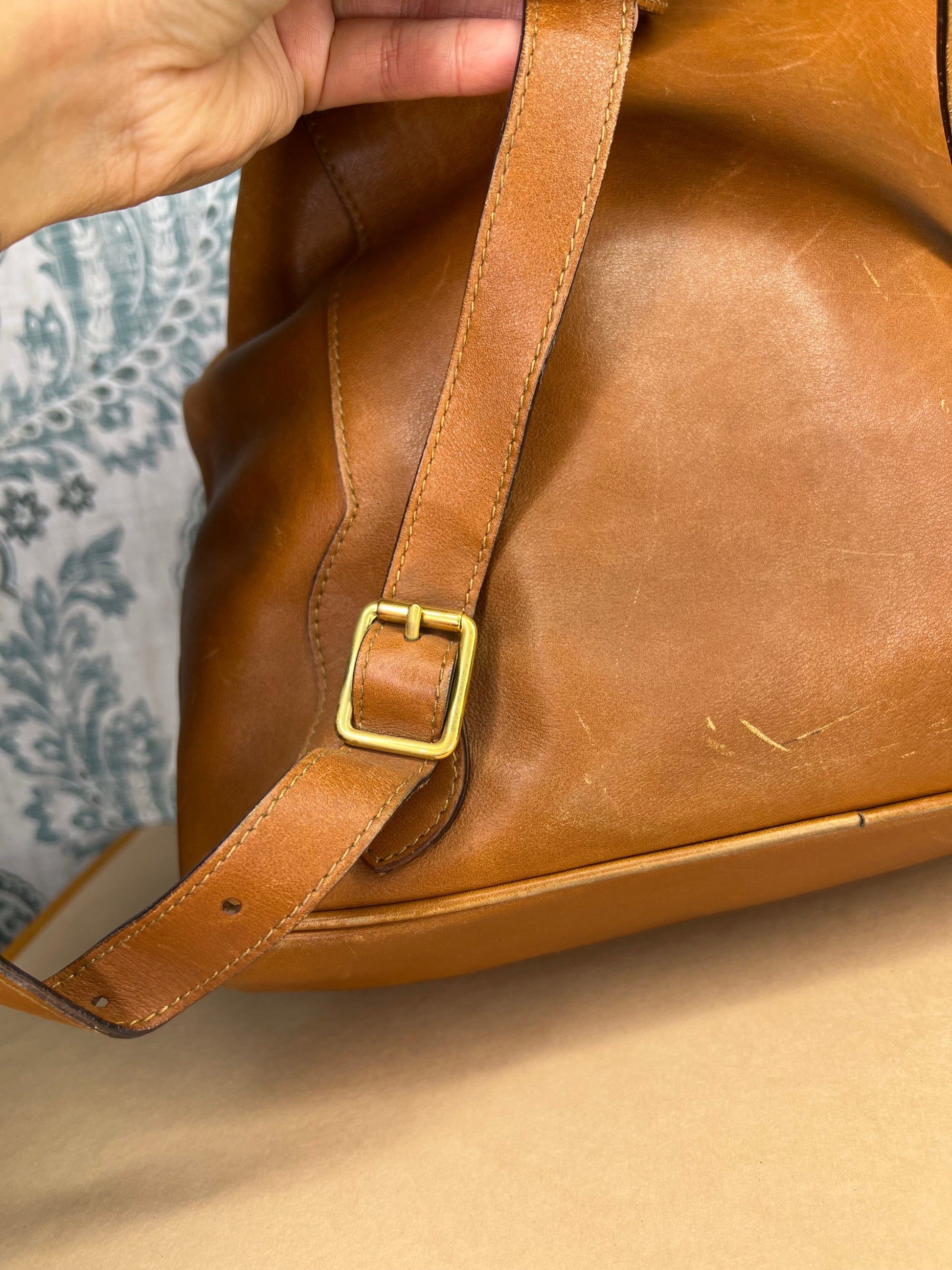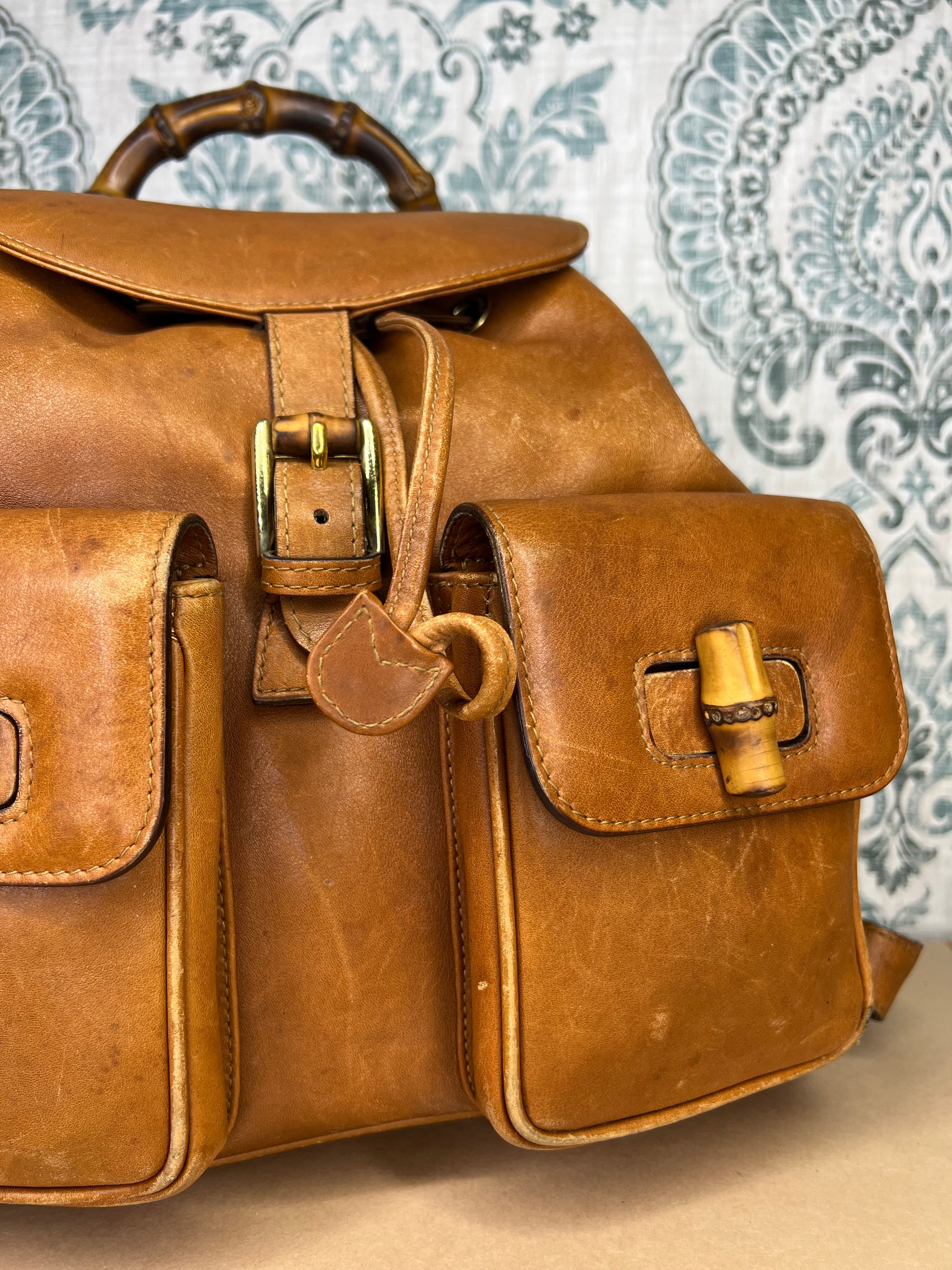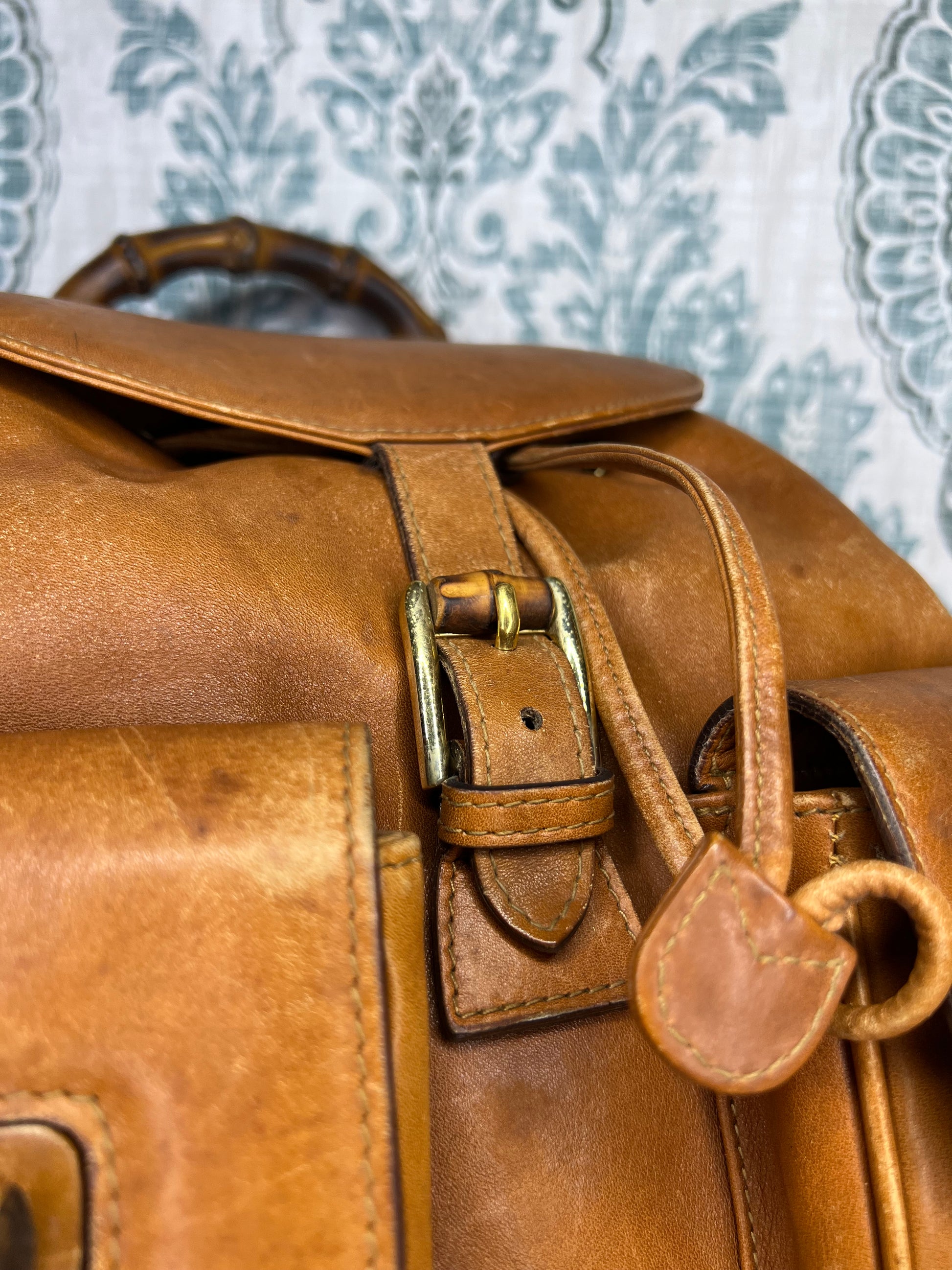 🌸 Leather has scuffs, wrinkles, and stains through out, but no damage that affects the use of the backpack. Drawstring is intact. Straps have glazing wear, but are in strong shape. No torn areas. Bamboo handle is sturdy