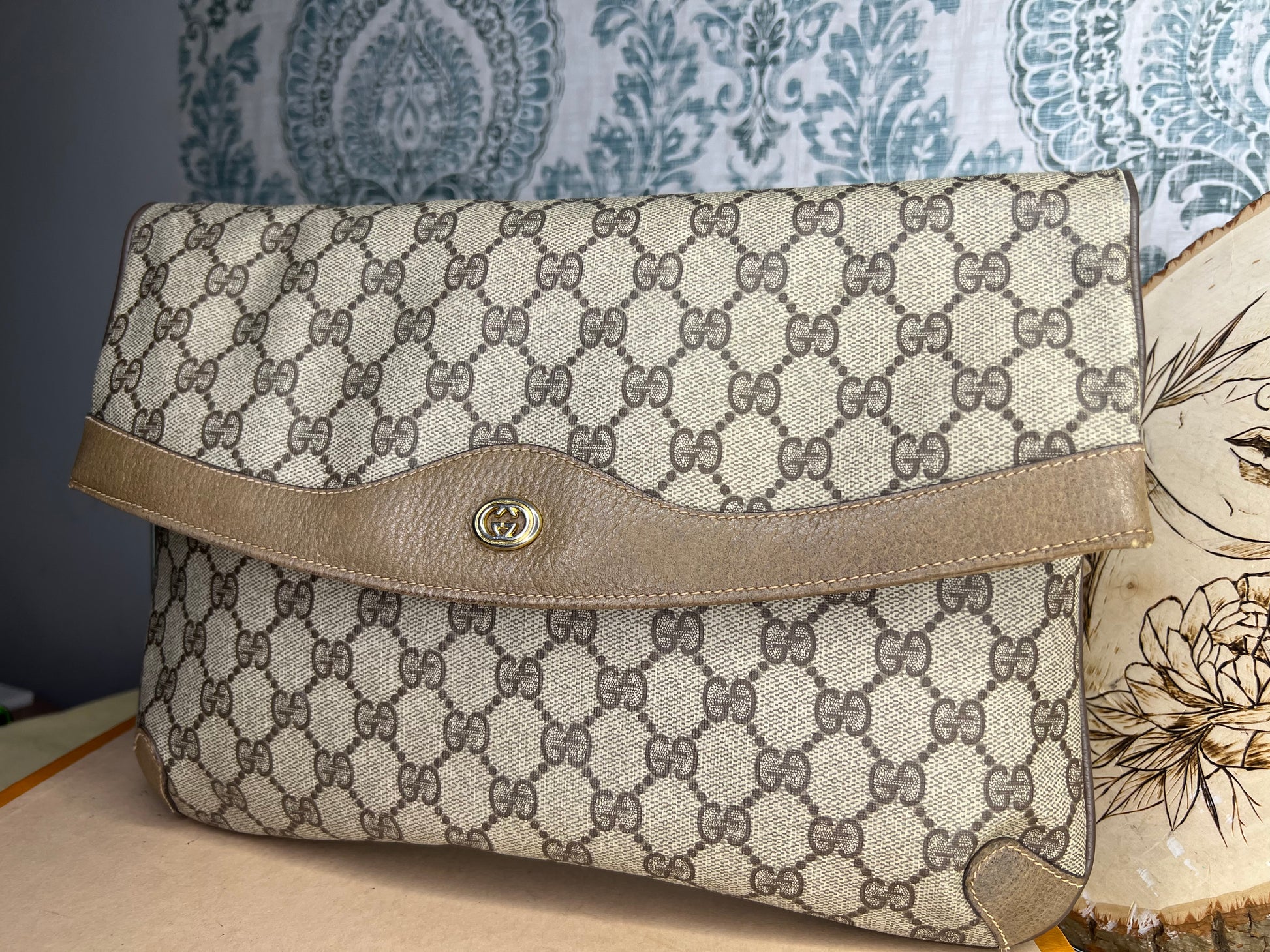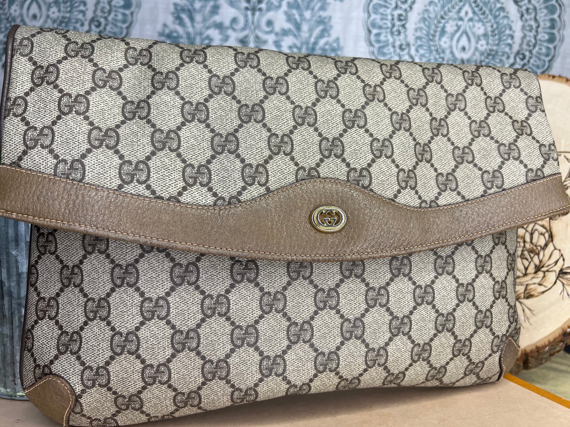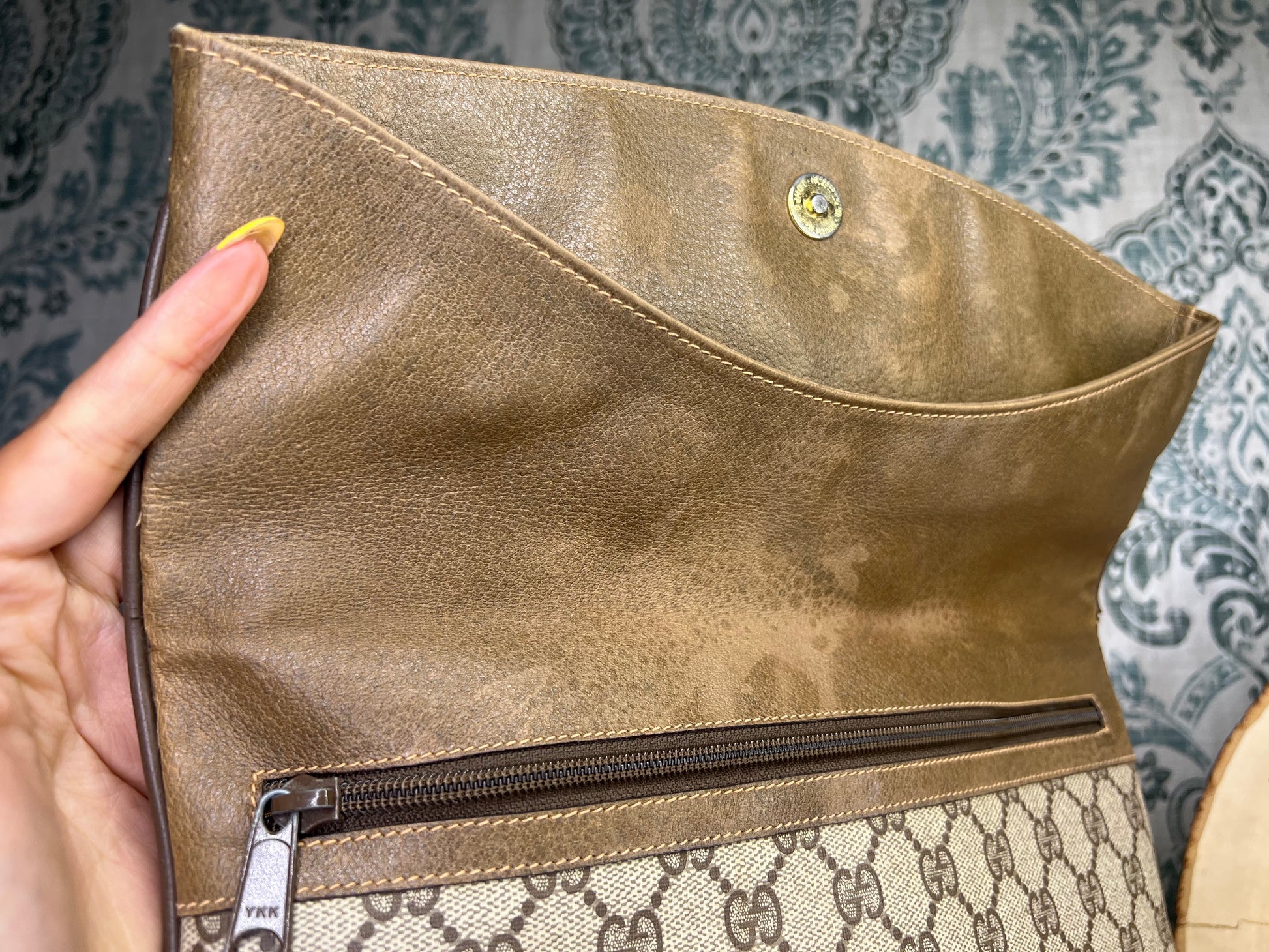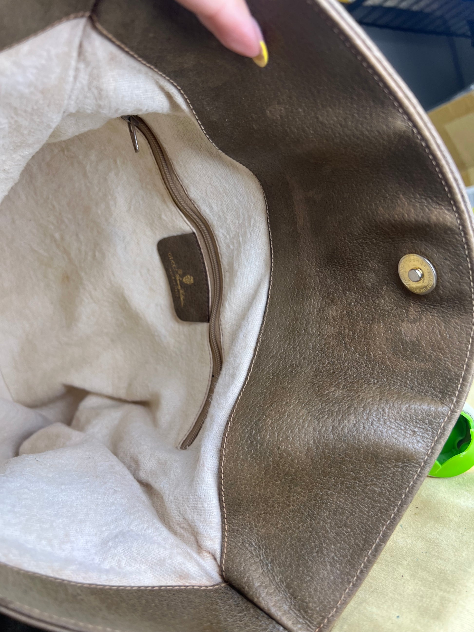 πΈ Piping has a small amount of cracking on the interior part where the clutch folds. Leather has a few rubs and scuffs, but no serious issues. There are water stains on the interior part of the leather