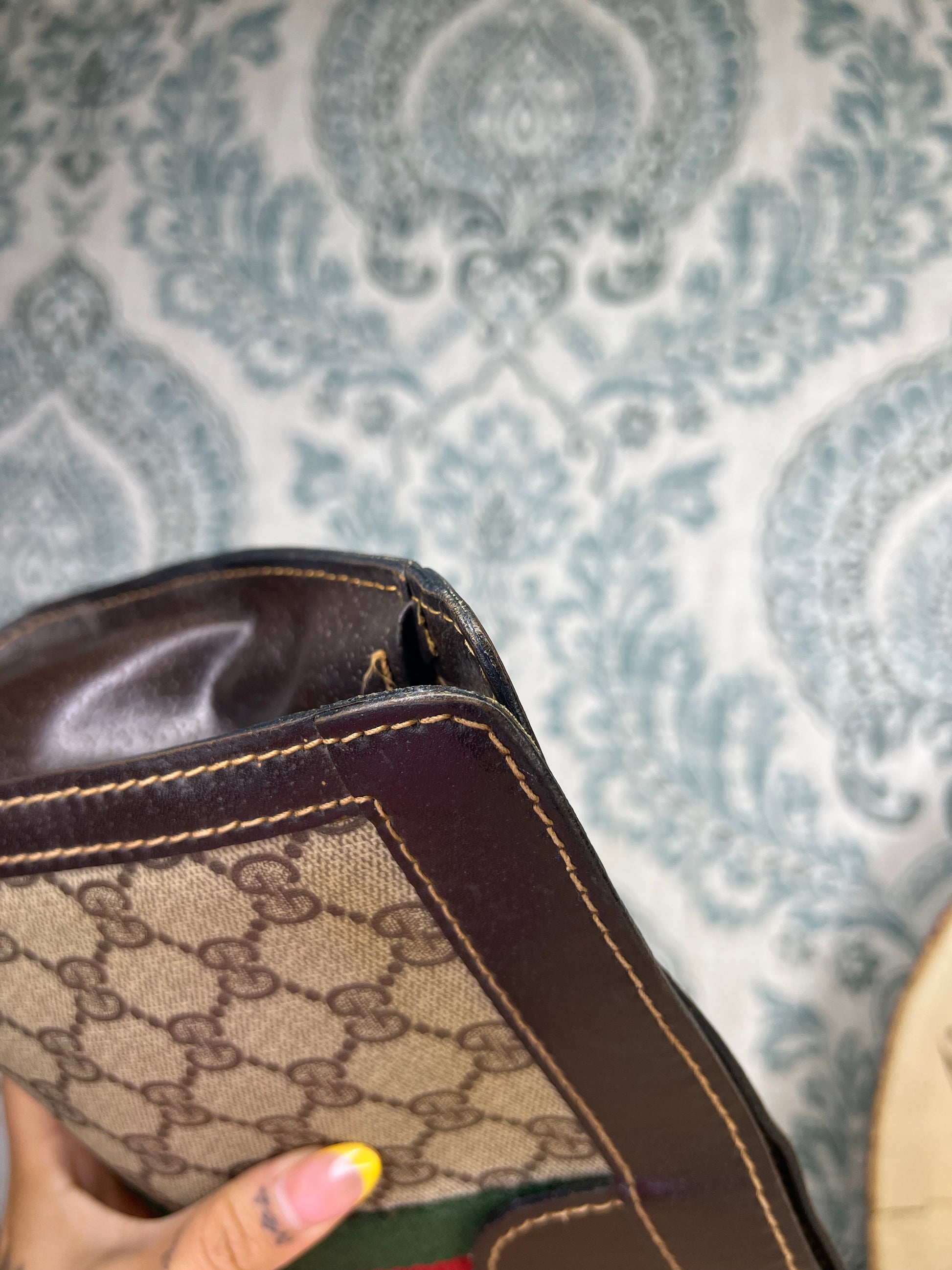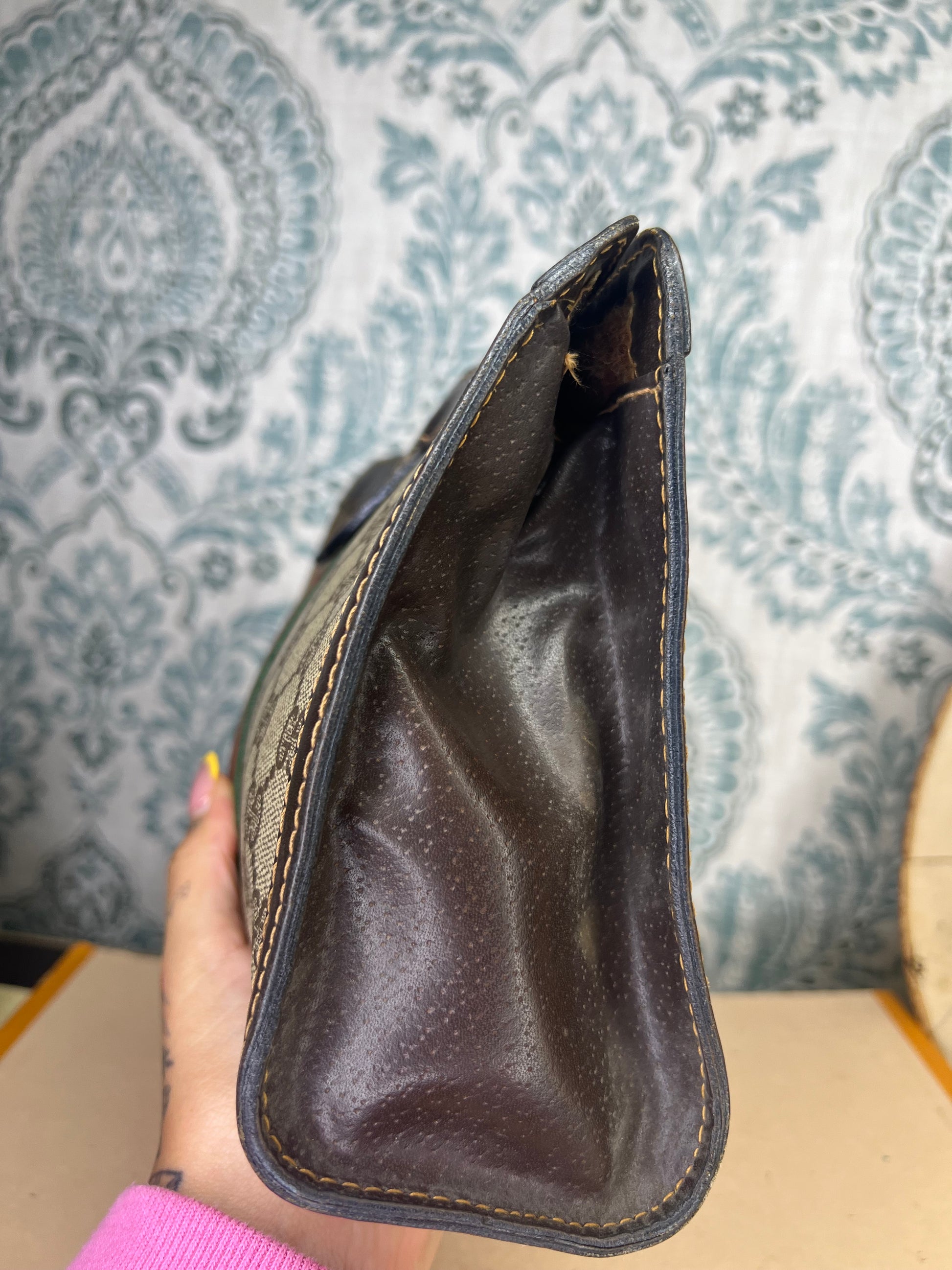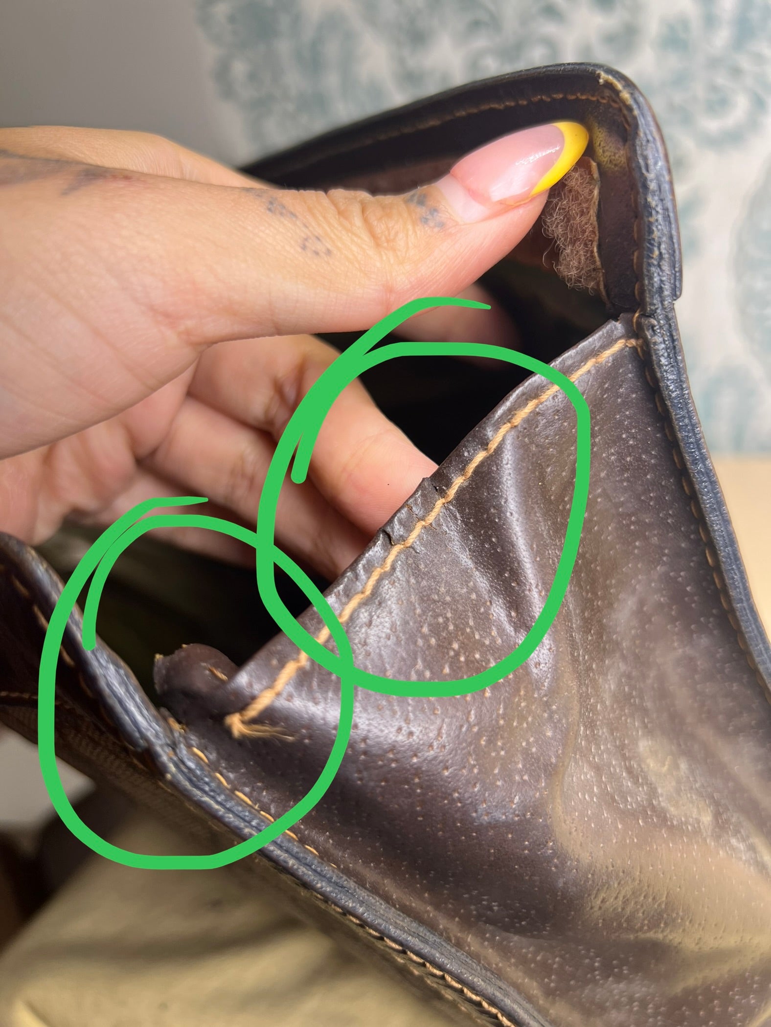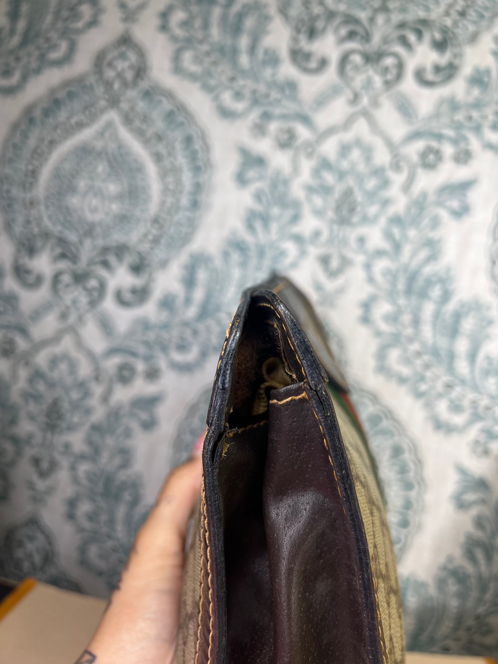 🌸 Most of the leather is in good condition, but there is cracking/tearing on each side folds of the pouch. Please view photos with green circle