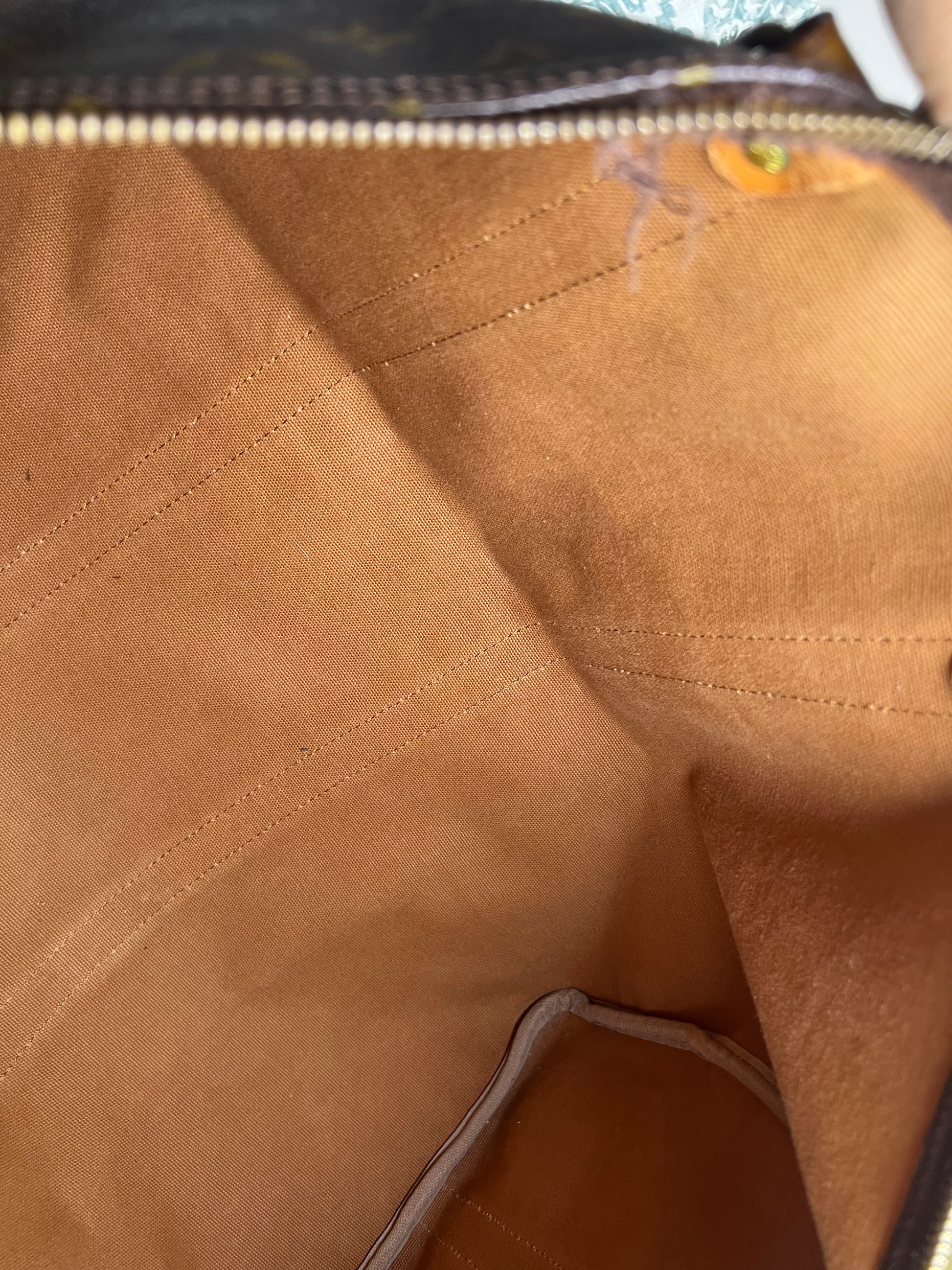 πΈ Vachetta does have staining and scuffs present. There is wrinkling and surface cracking on the bands. Handles are darkened/scuffed, but are sturdy. Chaps are strong. Piping has rubs, but no exposed areas. Zipper pull is cracked. Piping has rubs, but no exposed areas.