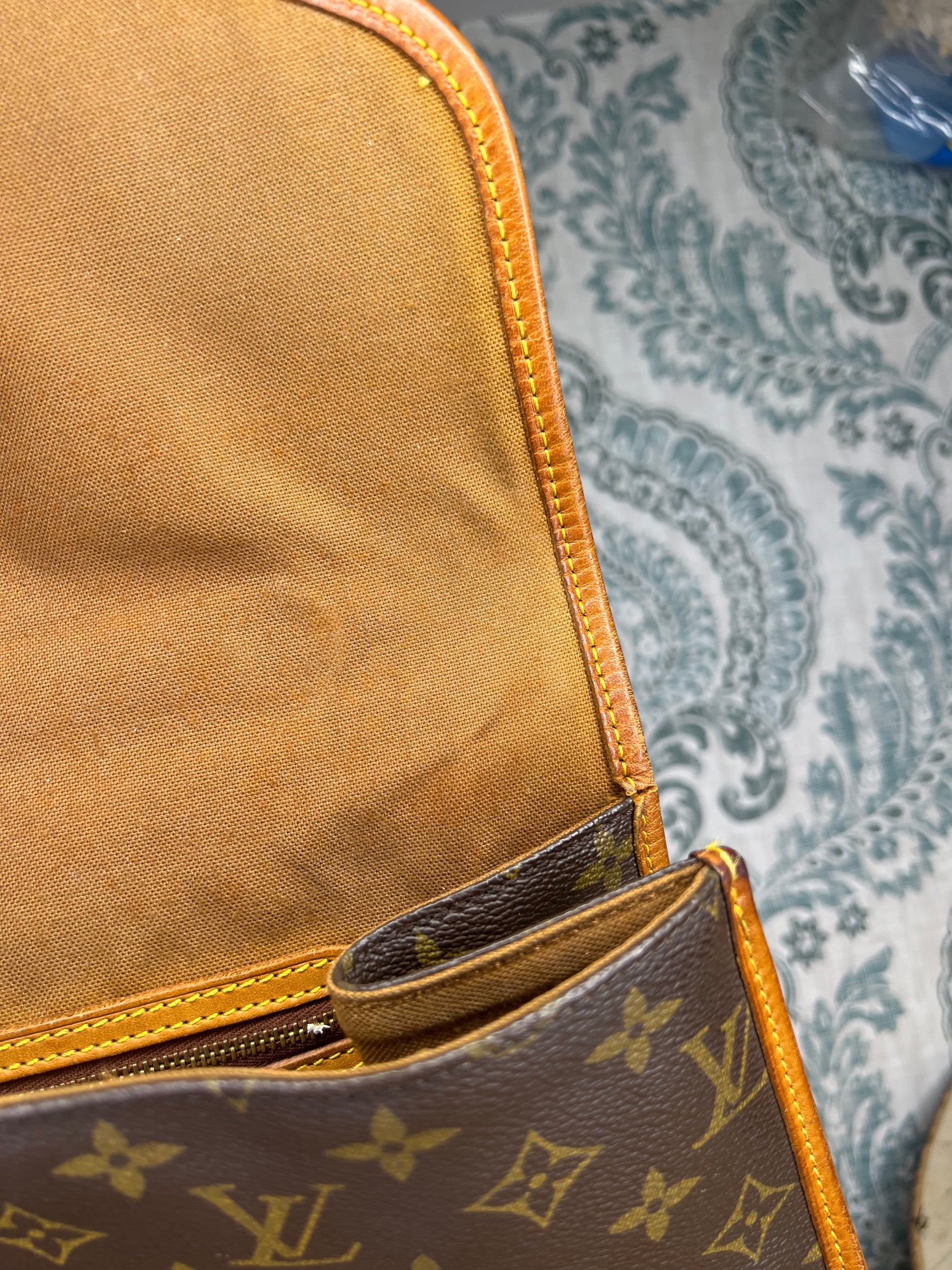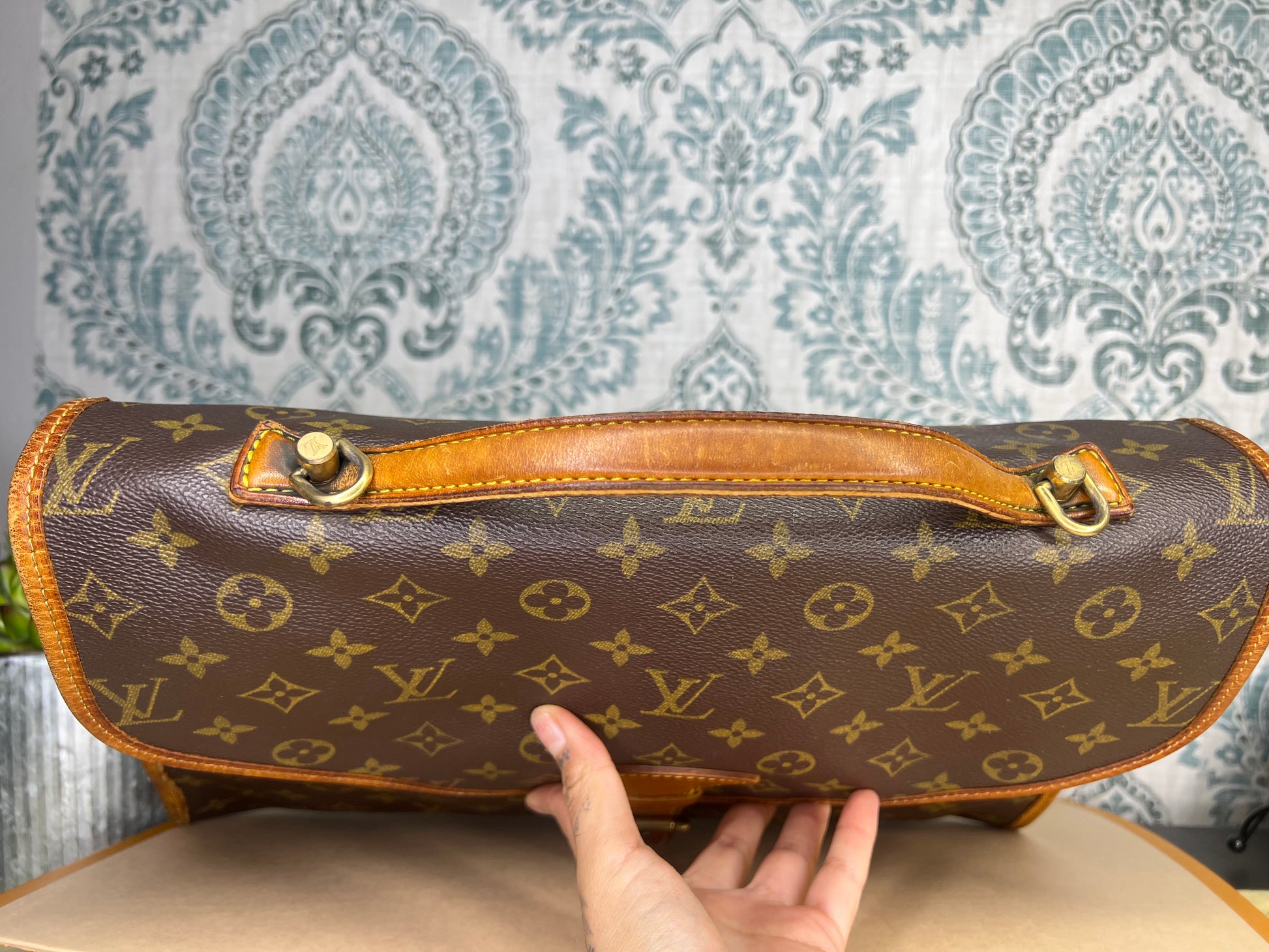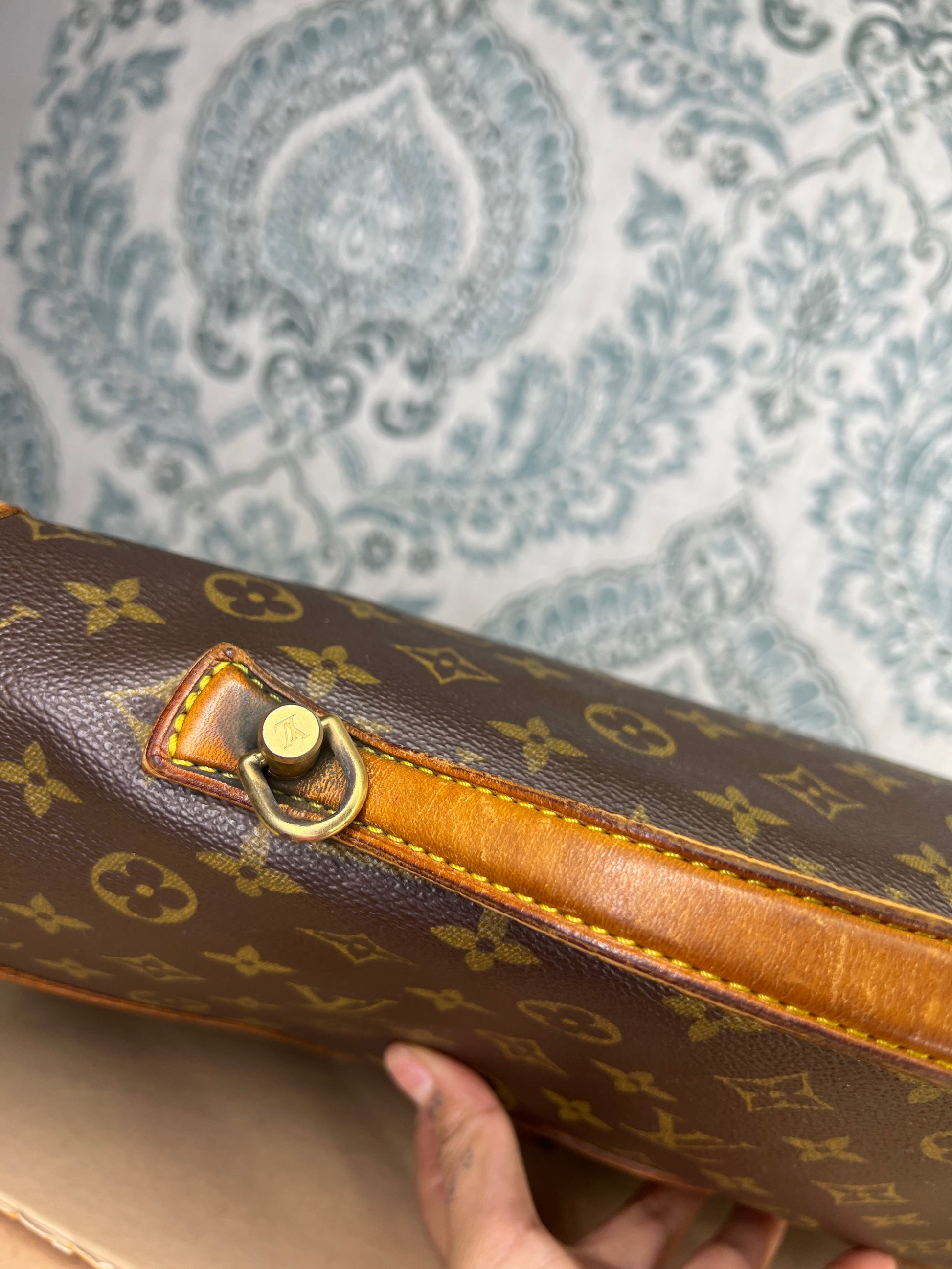 πΈ Leather is in sturdy condition, but does have wear. Top handle is strong. Buckle piece has wrinkles, but is intact. Trim is rubbed and scuffed through out, but no missing pieces. Minor trim cracking on the interior part of the bag. No serious issues with the leather other than dryness/scuffs.