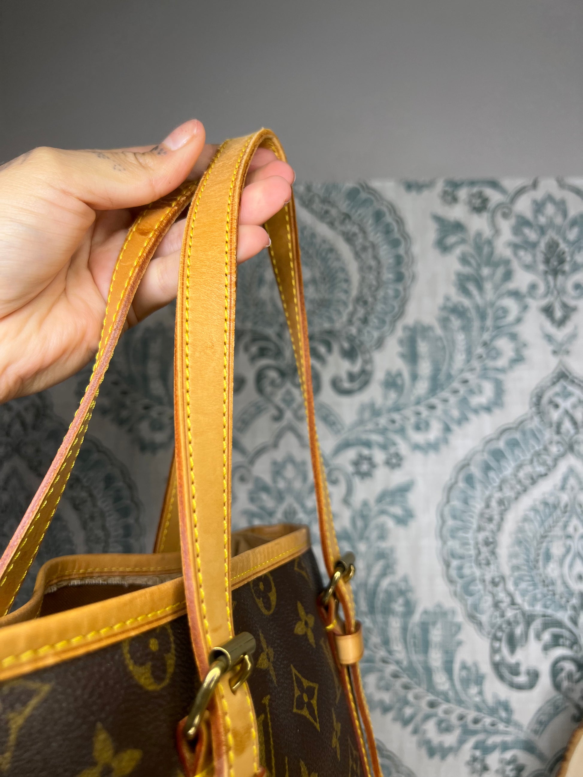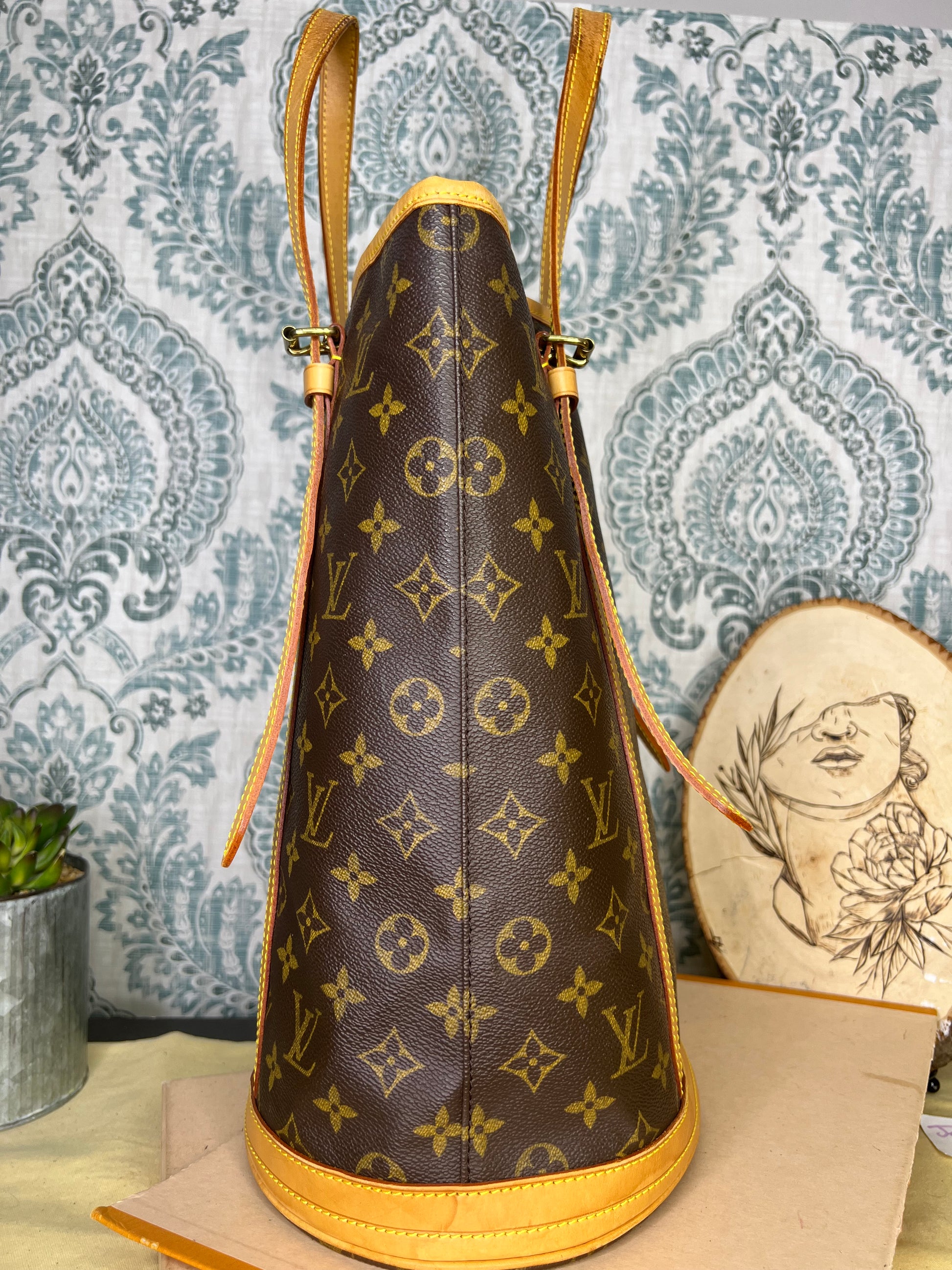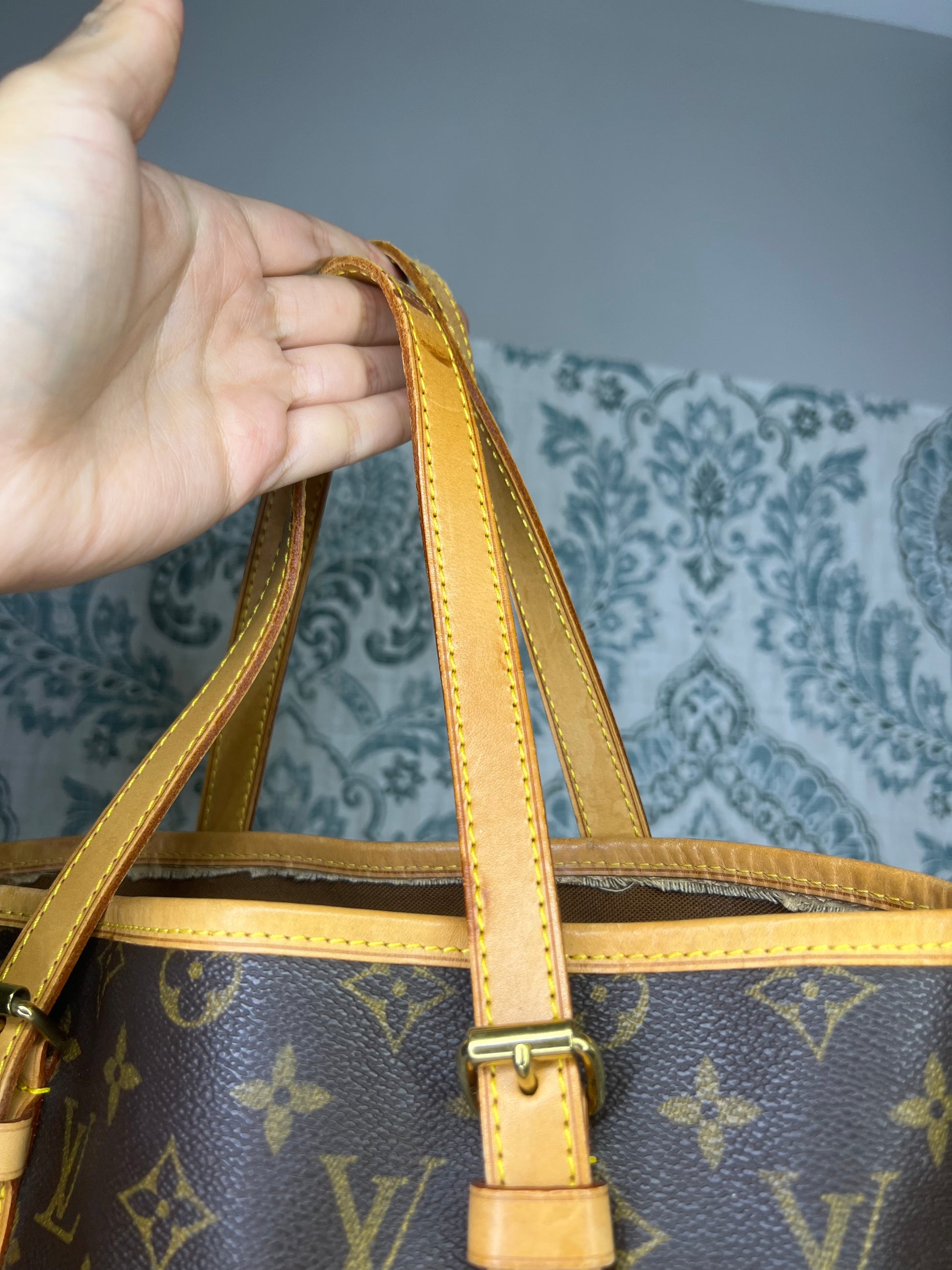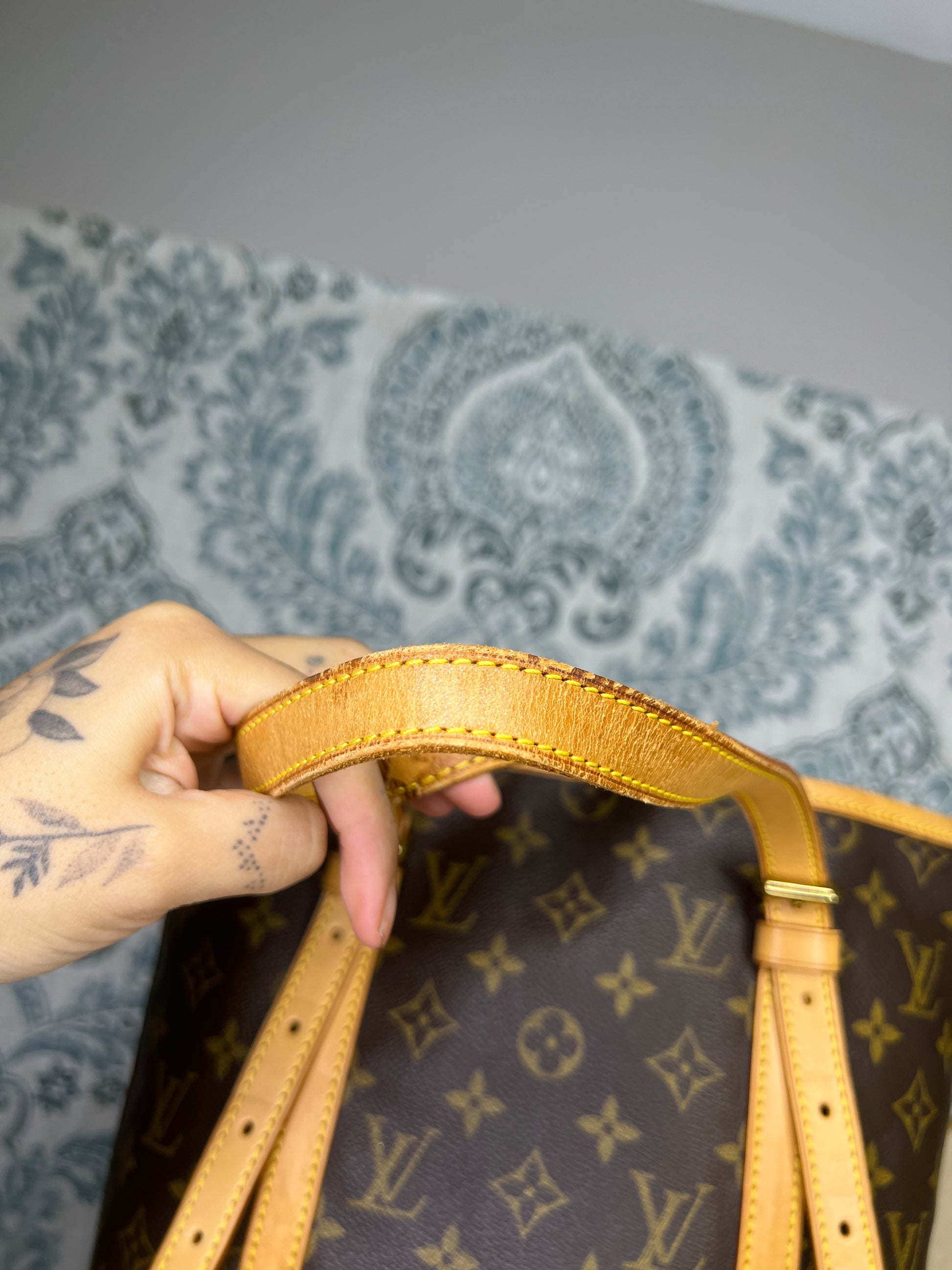 🌸 Handles do have watermarks and surface cracks mainly towards the top. Even with these flaws, they are strong. Trim is intact with minor scuffs. Bands are in good shape. There are watermarks on the bands and base of the bag. Vachetta does have a lighter patina