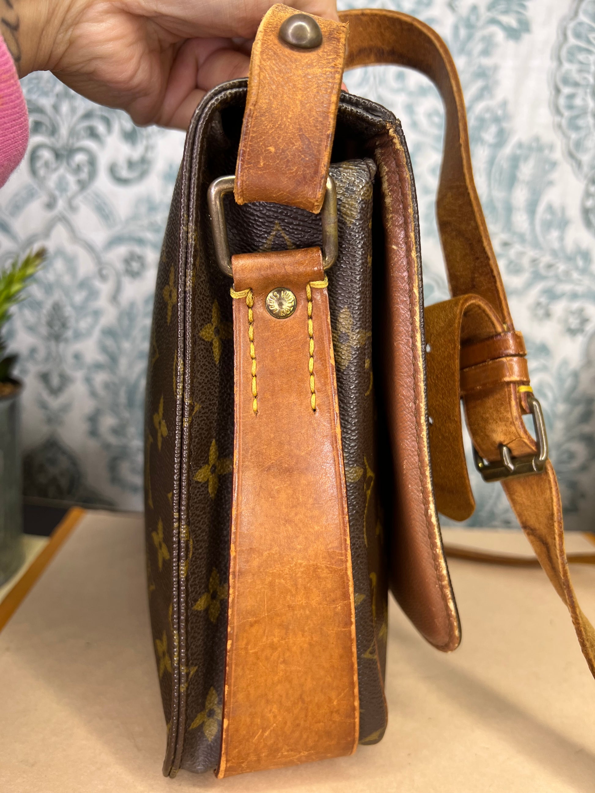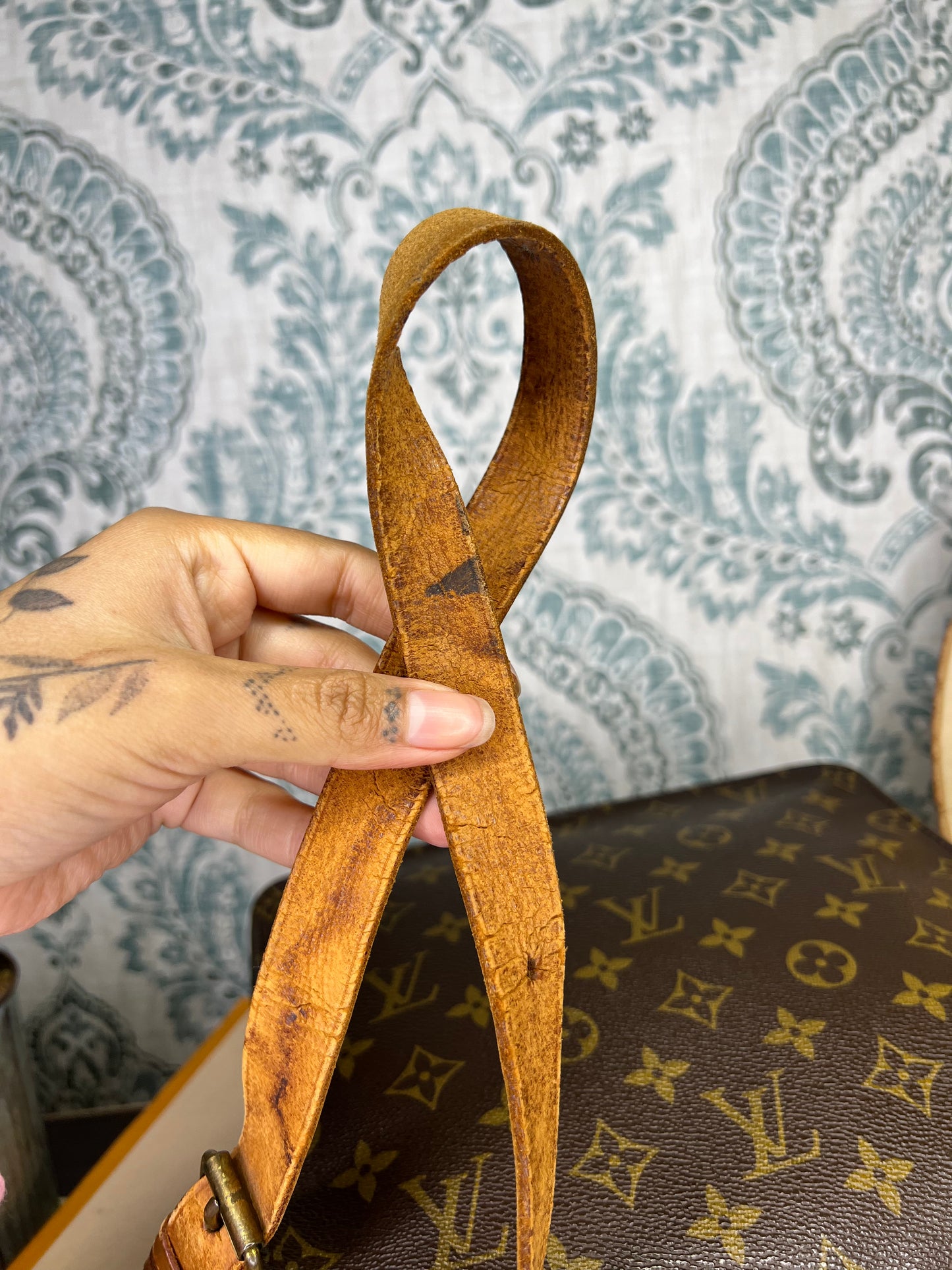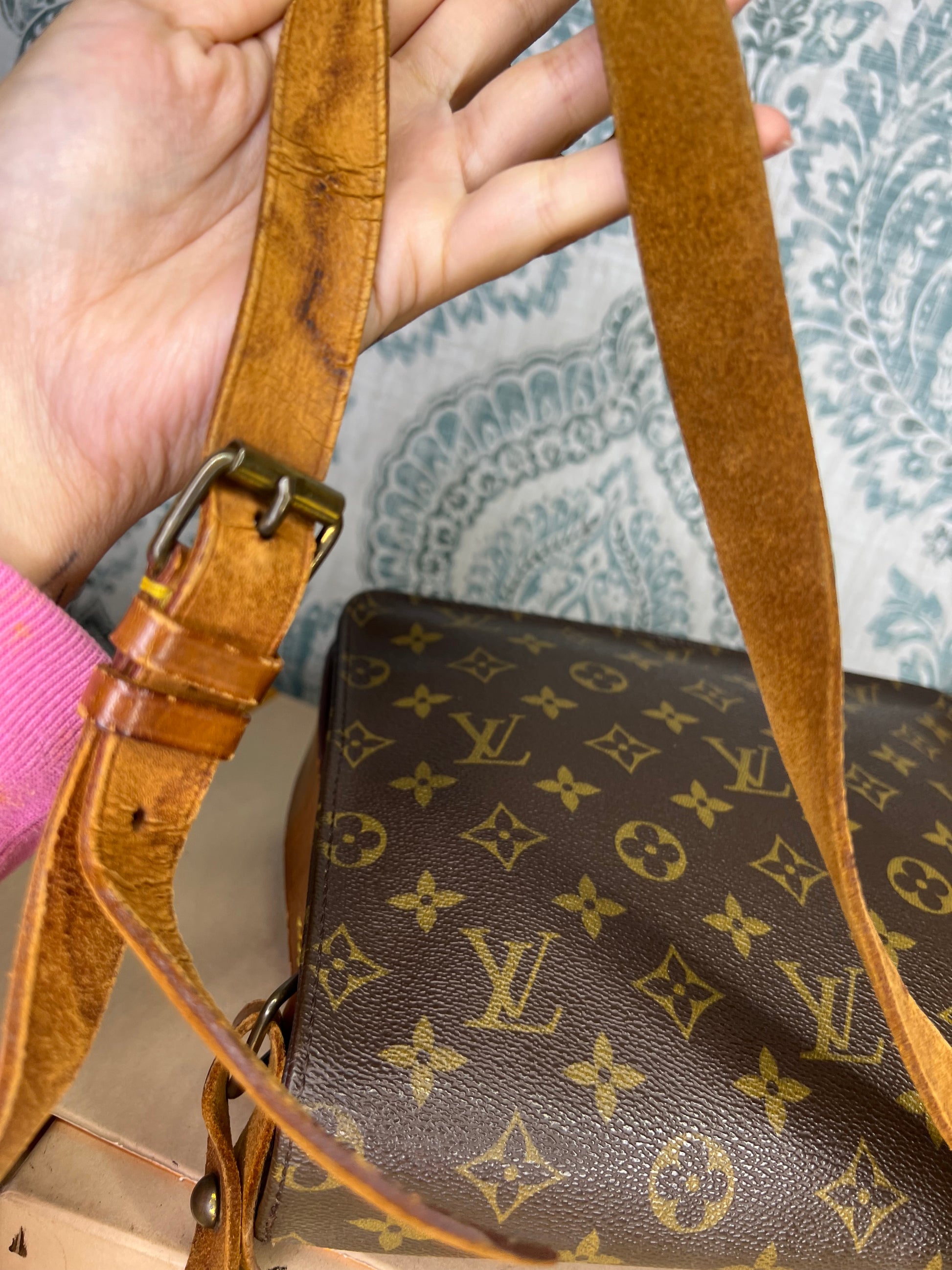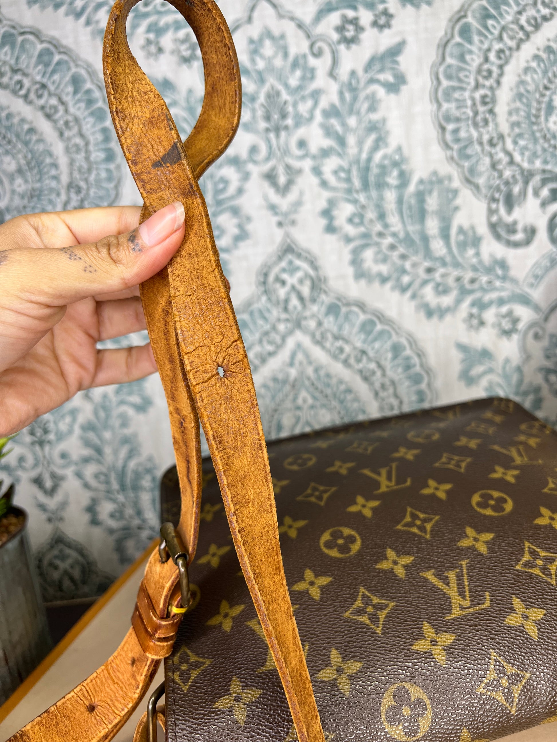 🌸 Strap is worn and cracked, there’s still life to it but it does have heavy wear. Vachetta on the body of the bag has scuffing and cracking. Buckle piece has rubs, but is intact. Piping has rubs, but is is intact, no exposed areas