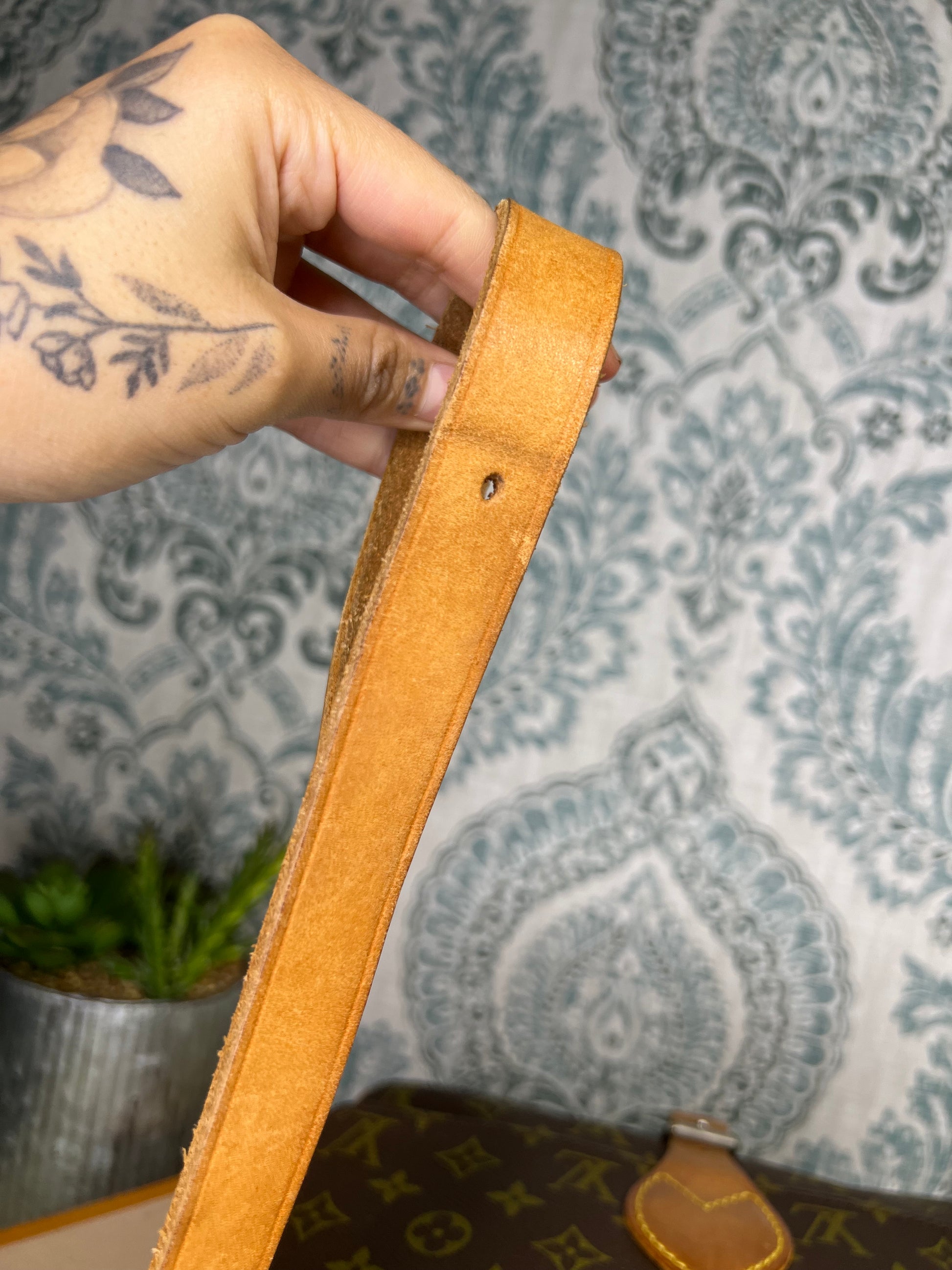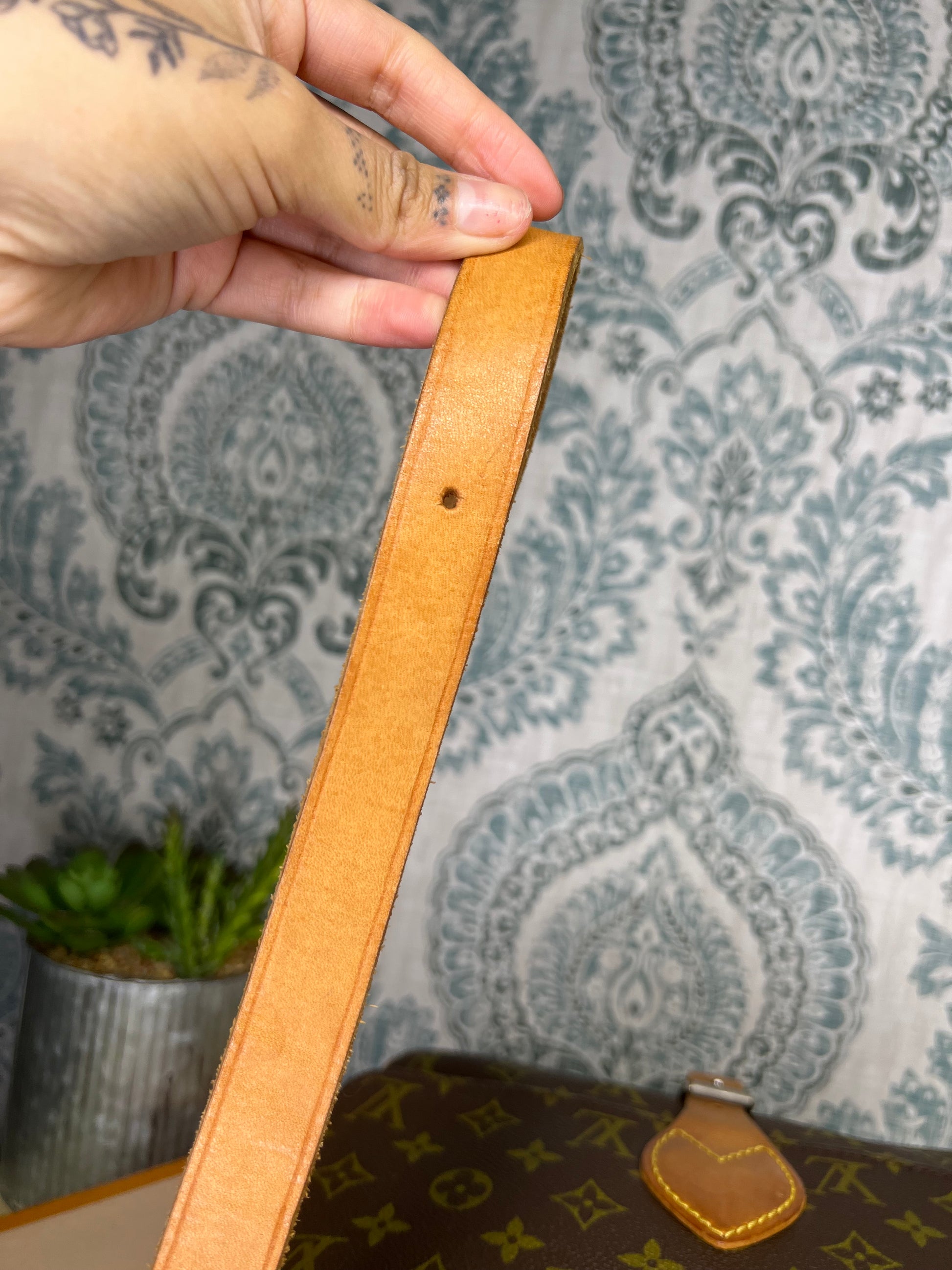 🌸 Strap has minor scuffs/surface wear, but it is strong. The strap has no cracking and only has small amounts of staining. Strap is interchangeable and can be removed without cutting it off. Chaps are sturdy. Vachetta on the body of the bag has scuffing and faint staining. Buckle piece has wrinkling/scuffs, but no cracking. Piping has rubs, but is intact with no exposed areas