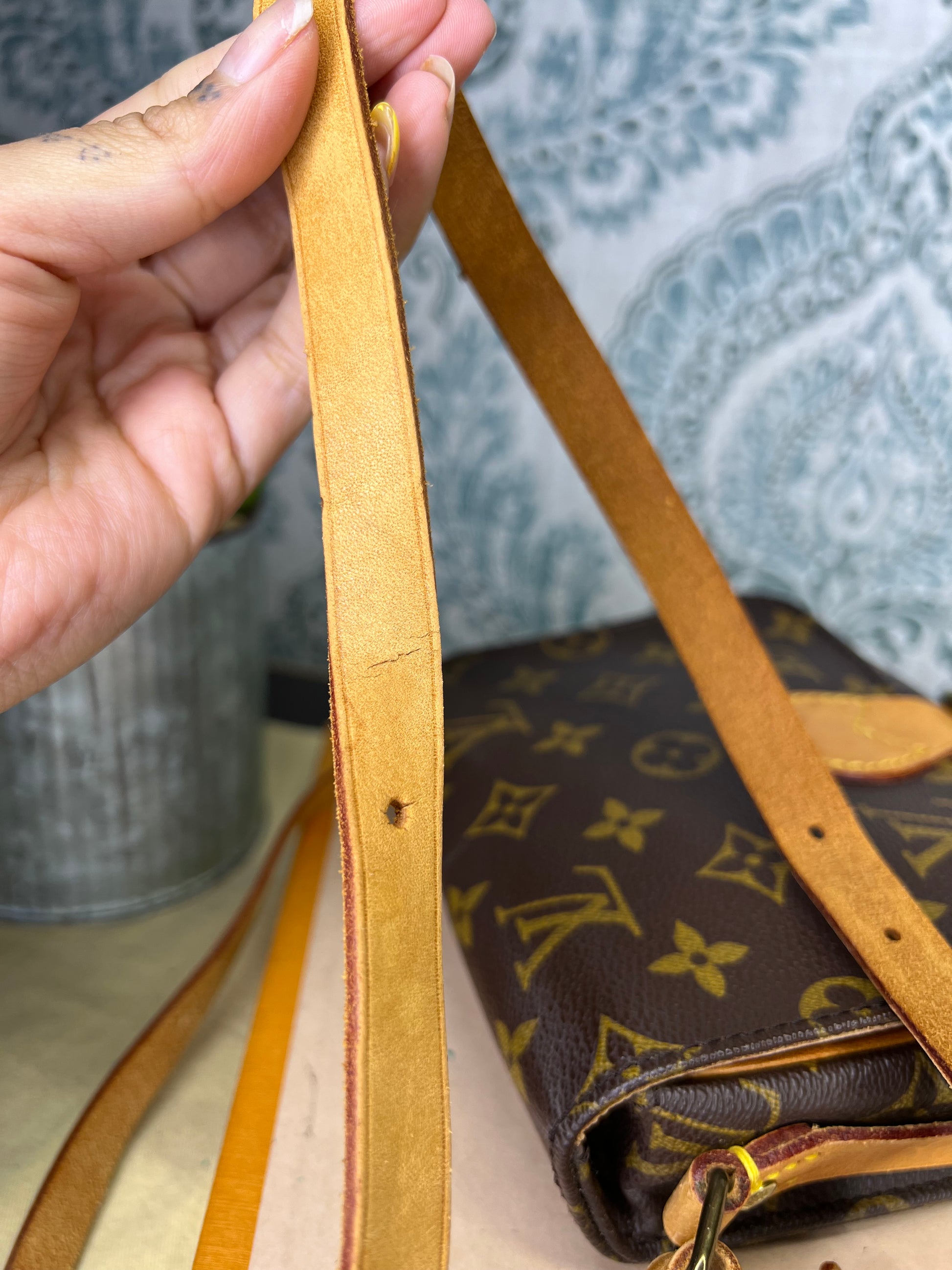 πΈ Strap does have a few sections with cracking. Since this is a lightweight bag, there should still be life left to the strap but may need to be replaced down the line. There are faint stains on the strap. Strap is interchangeable and can be swapped for a different strap without cutting it off. Chaps are strong. Vachetta on the body of the bag has scuffing. Buckle has scuffs and minor surface cracking