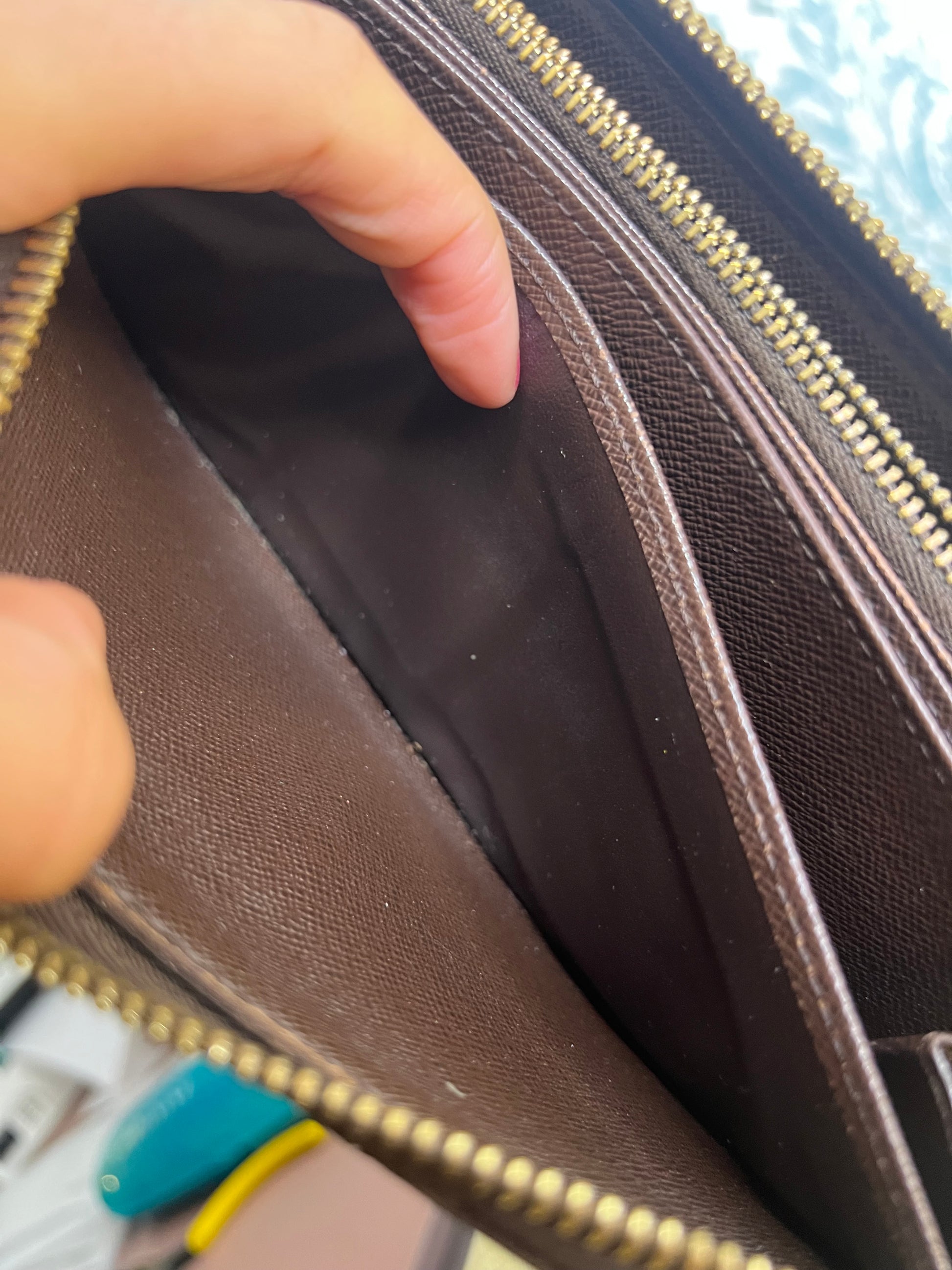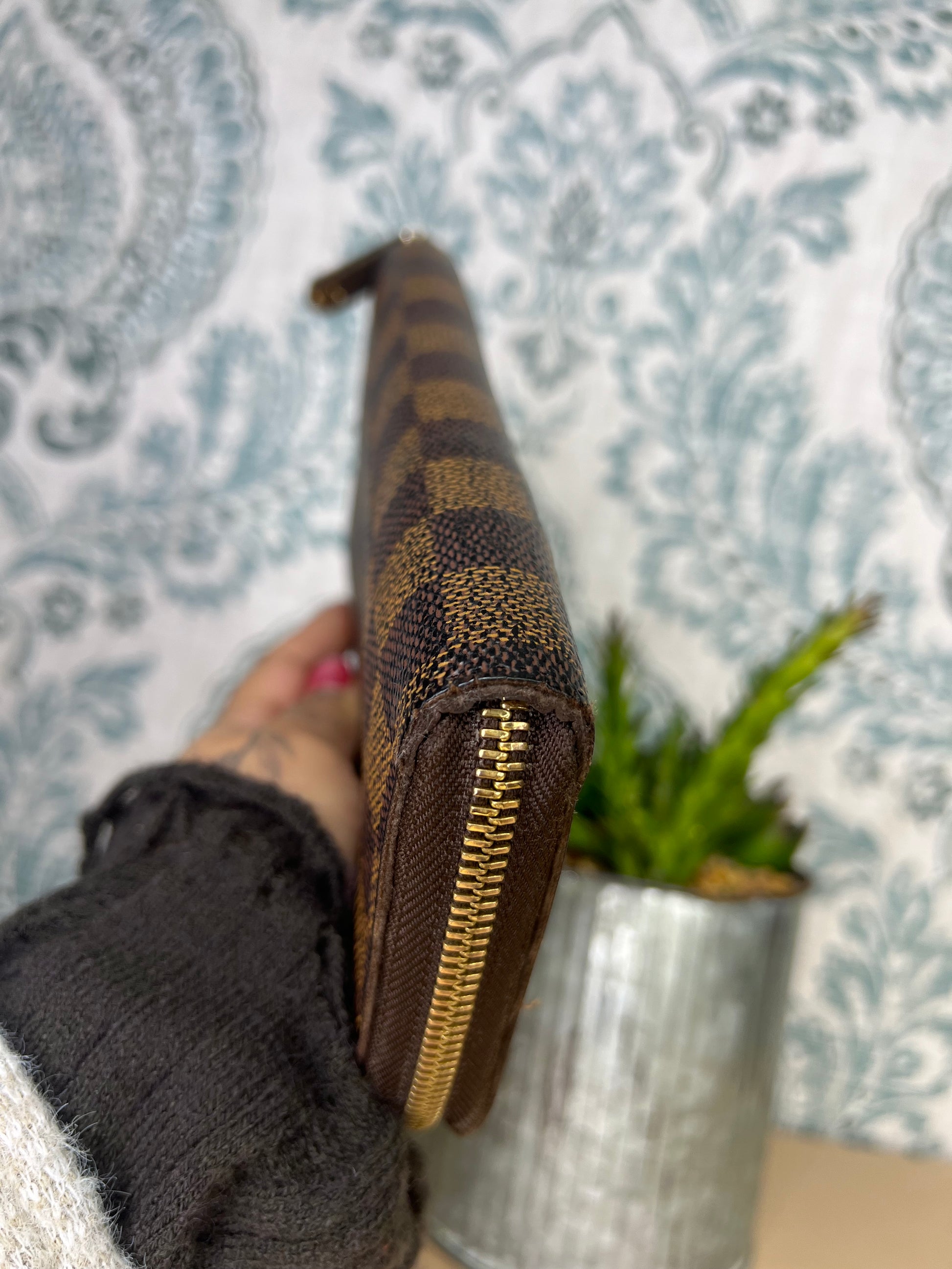 🌸 Damier print does have fading, but overall clear. Glazing does have wear. Canvas has micro cracks at edge corners of the wallet. No major canvas wear