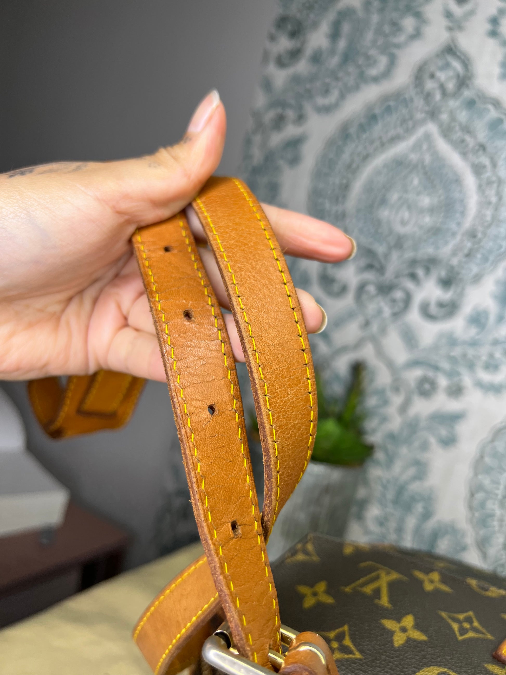 šø Strap has wrinkling, scuffs/minor surface cracks but is in sturdy shape. Faint stains on strap. Piping has wear, but is intact. Buckle piece looks good and only has minor scuffs.