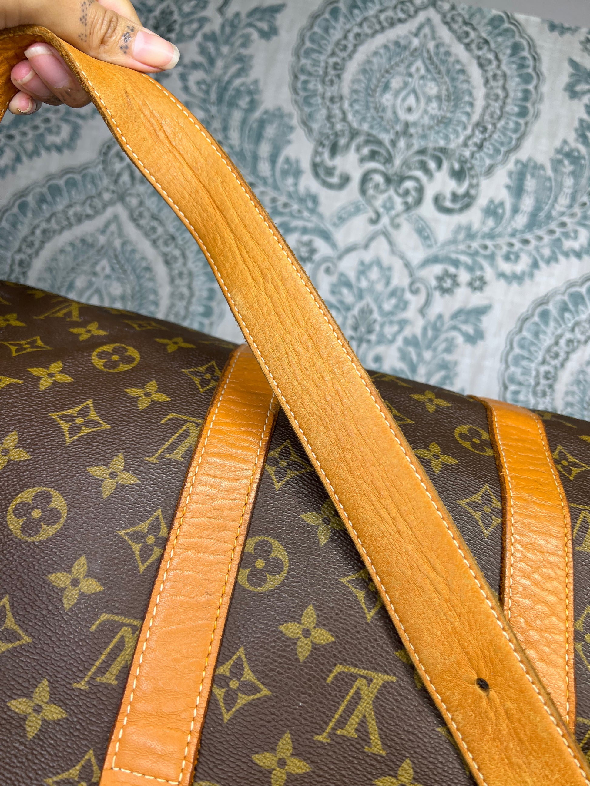 šø Leather has scuffs, marks, and wrinkles. The base of one handle does have cracking. There are also popped/loose stitching on both handles.Ā The top of one side band is cracking/stretched. These flaws will be circled in green. Piping has rubs, but no exposed areas. Shoulder strap is in strong shape.