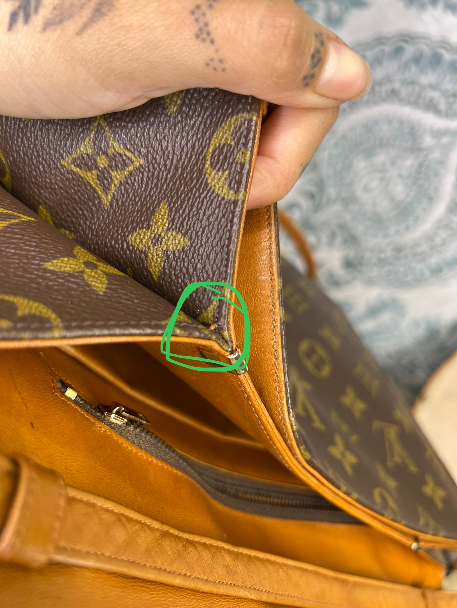 πΈ Canvas is in great shape, only very minor amount of wear hidden in the side flaps of the bag. These are minor and not noticed, shown in photos with green circle. Monogram is bright and clear through out
