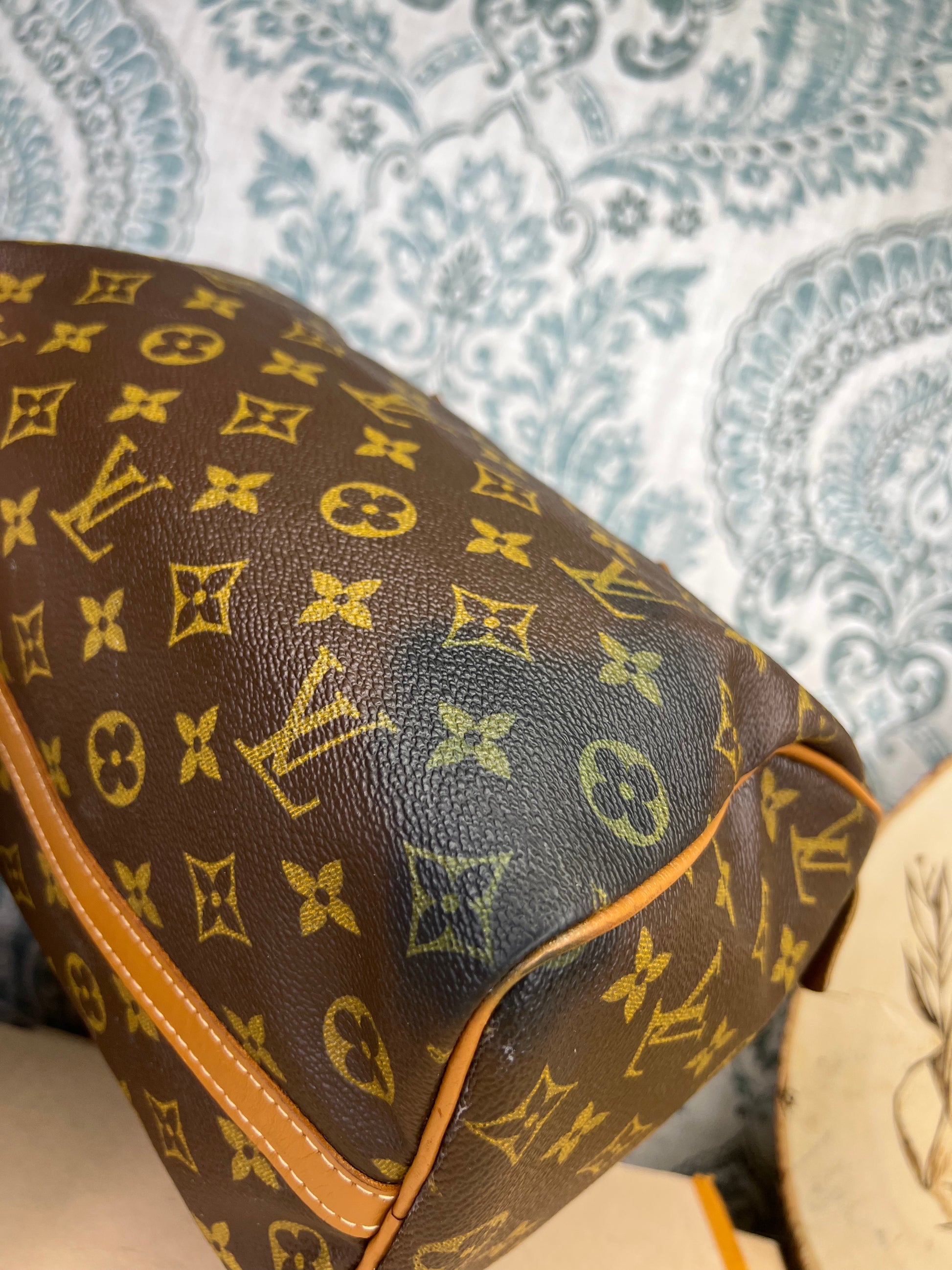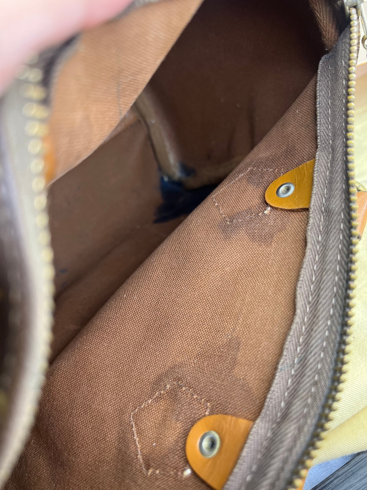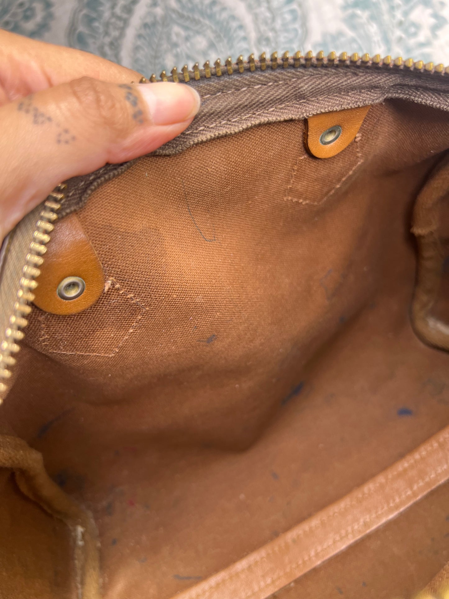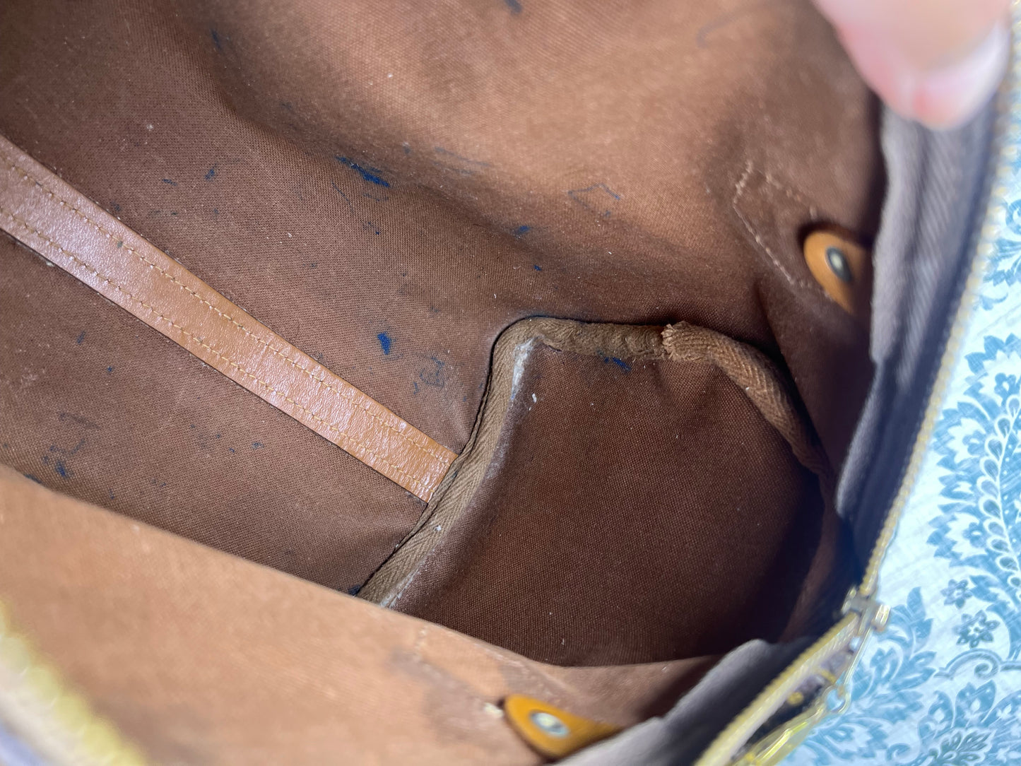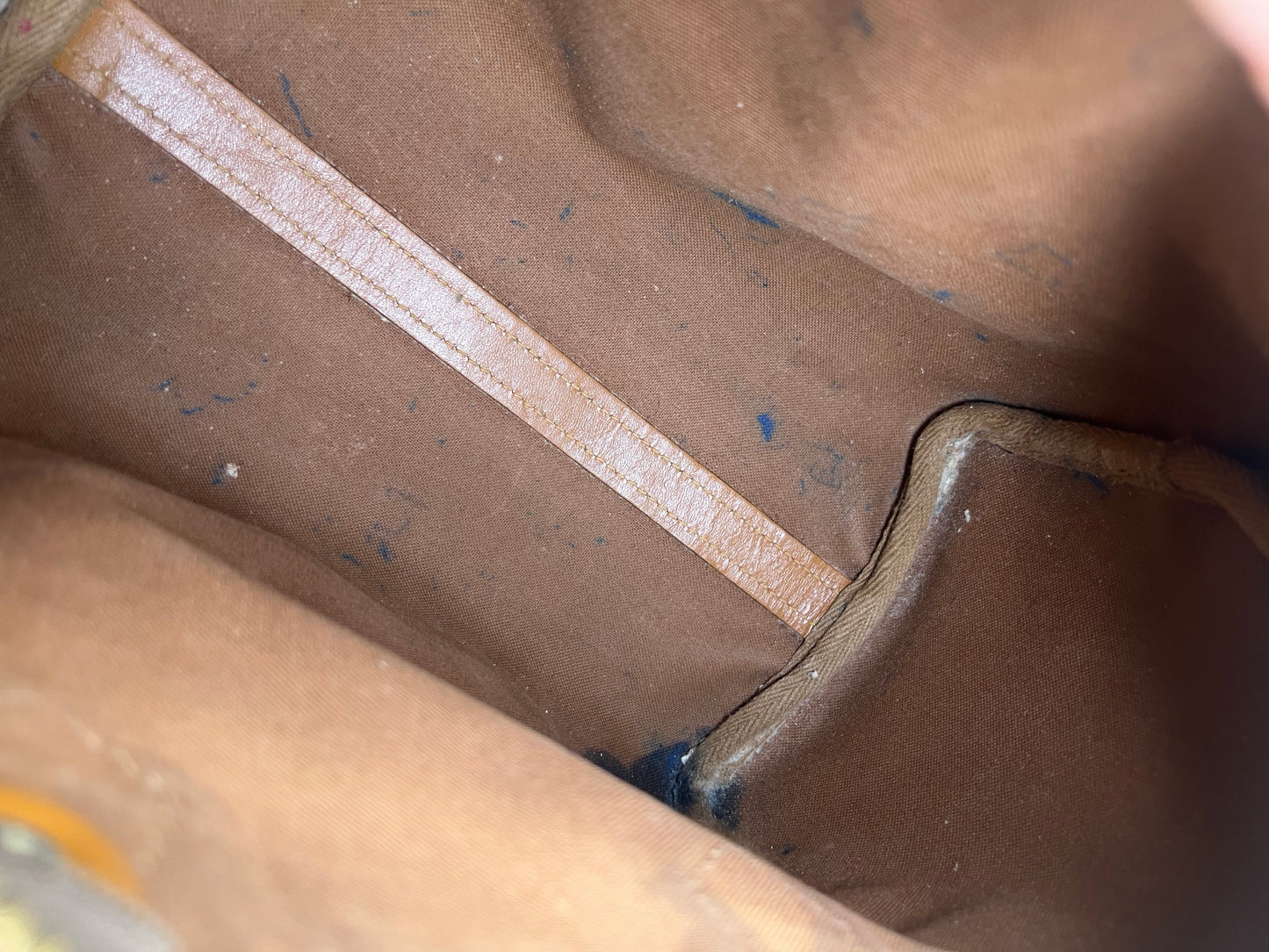 🌸 Canvas is in great shape and crack free. Nice and thick vintage canvas. Monogram is bright and clear, only minor amount of speckled fading but overall very bright and clear. There is an ink stains towards the base at one corner of the bag