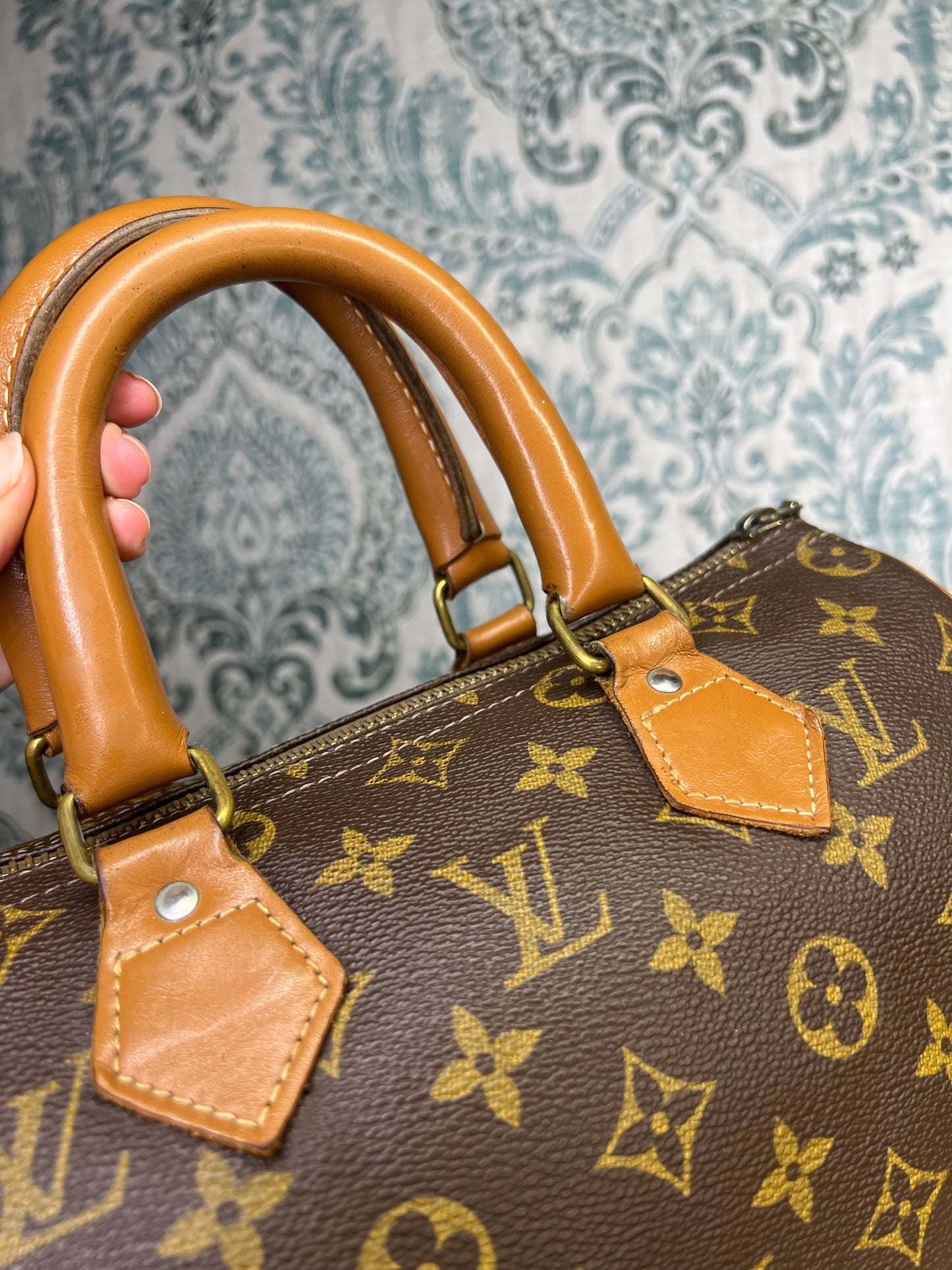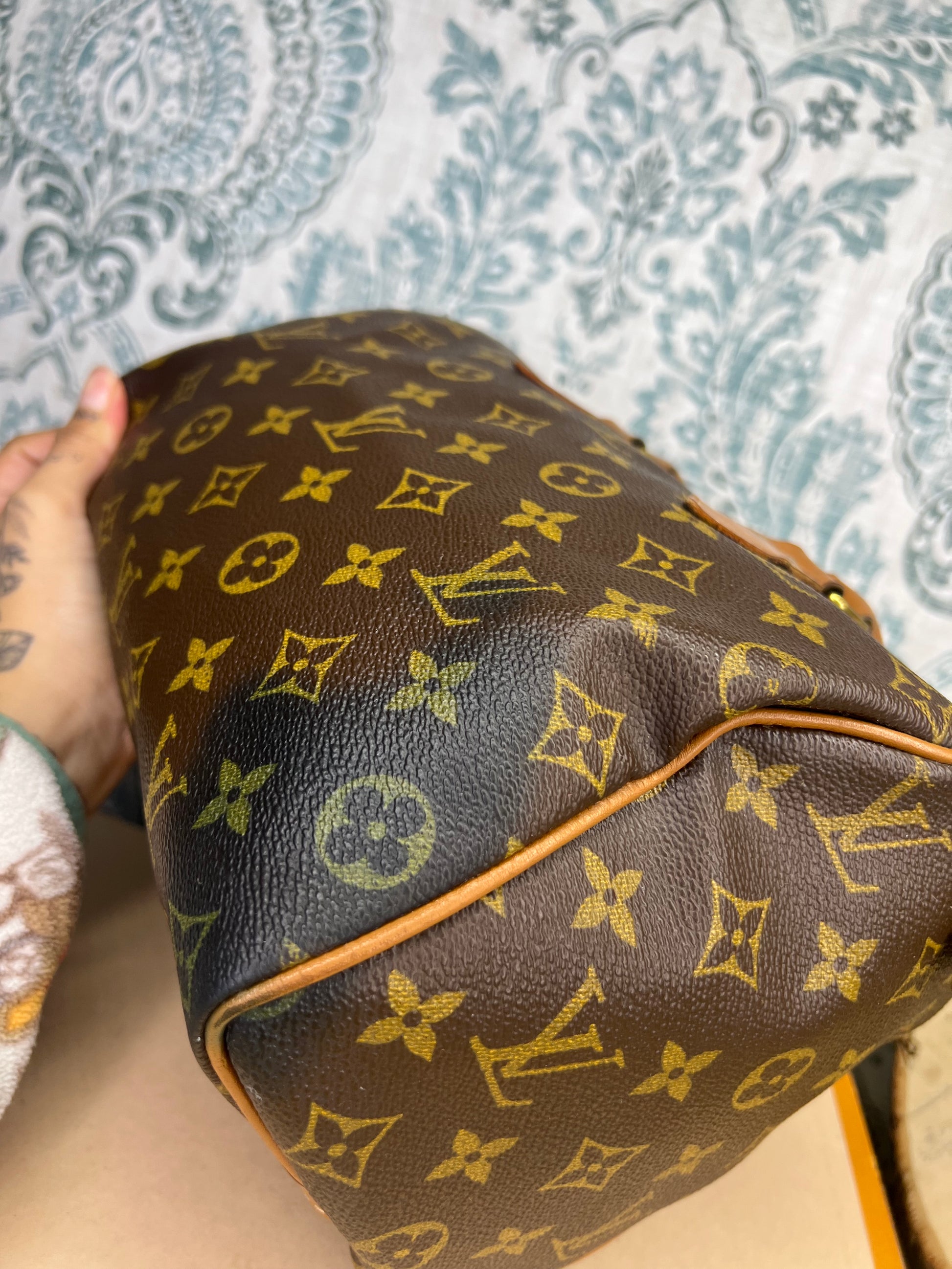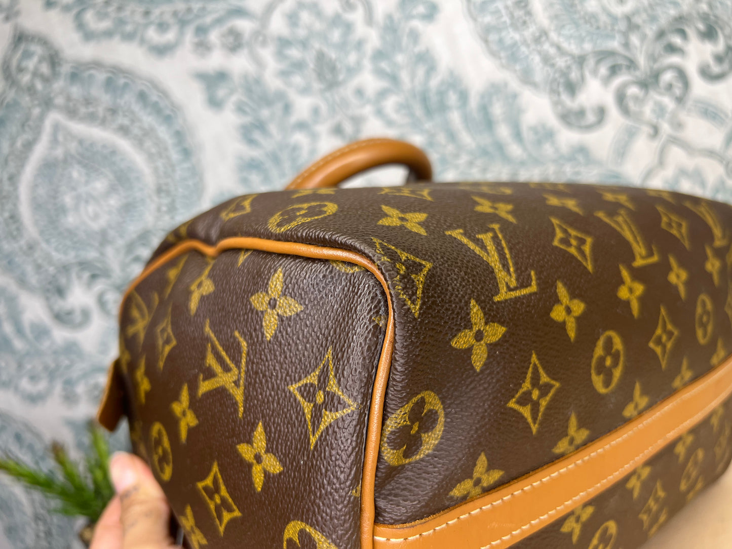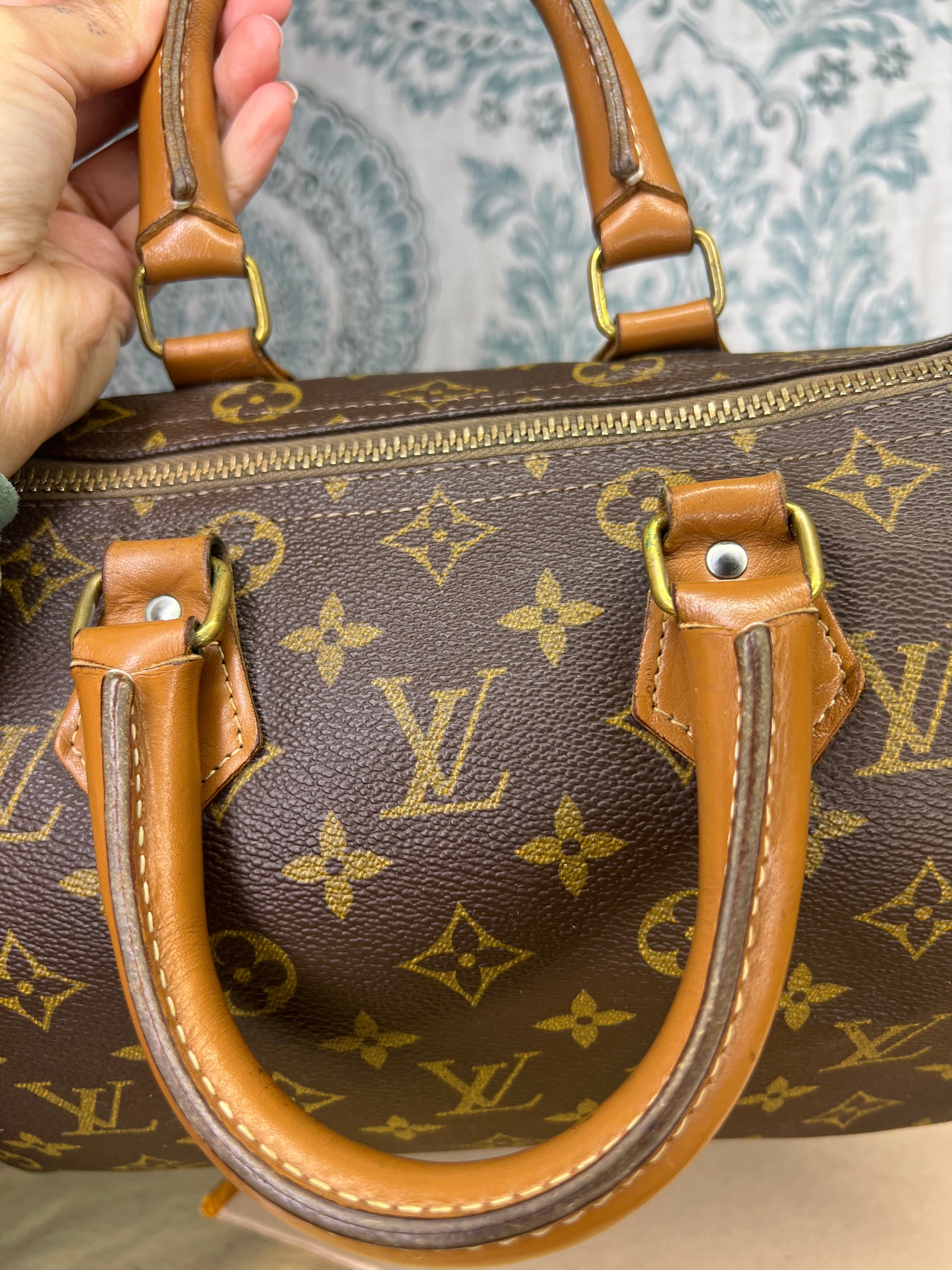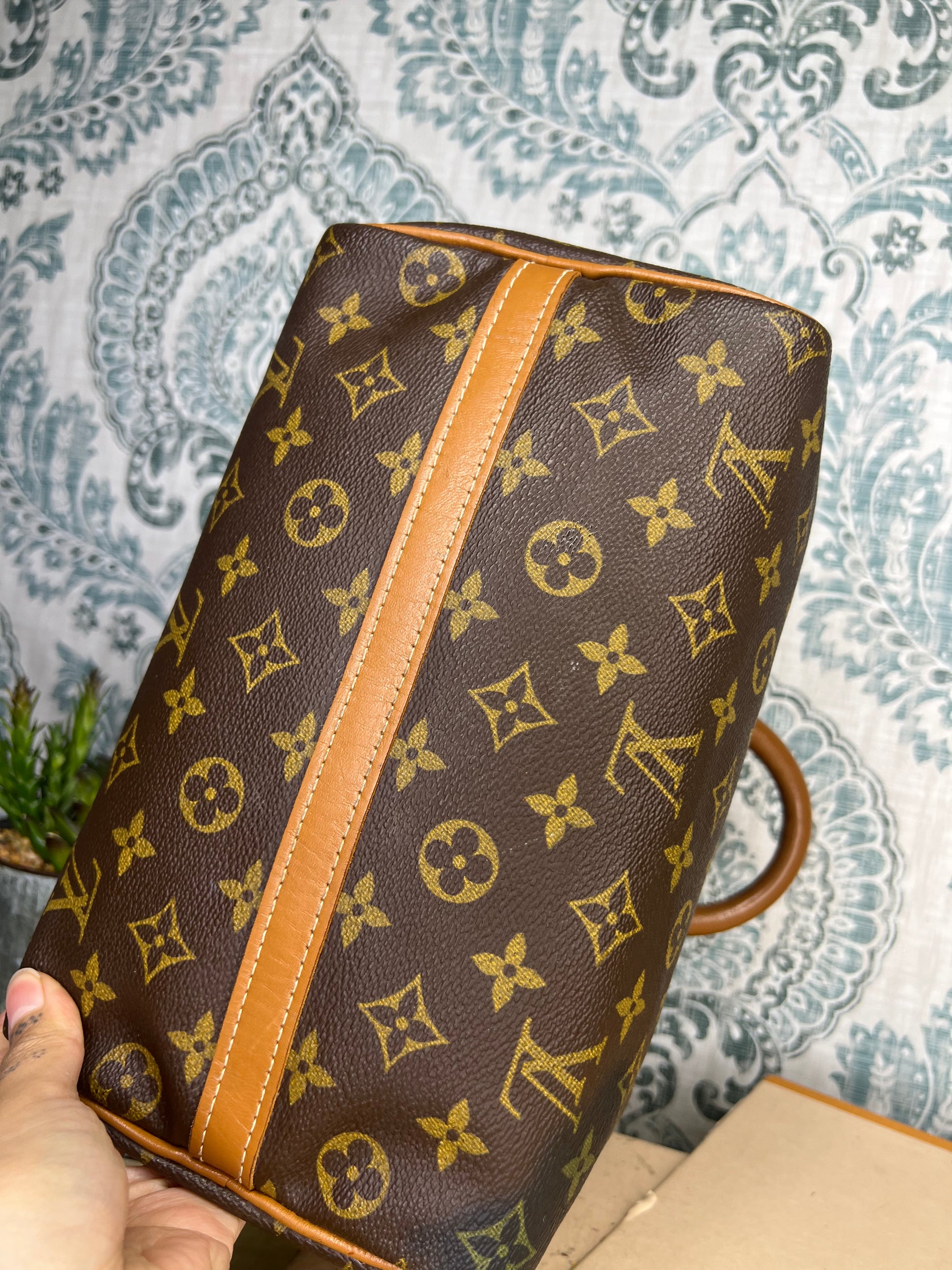 🌸 Canvas is in great shape and crack free. Nice and thick vintage canvas. Monogram is bright and clear, only minor amount of speckled fading but overall very bright and clear. There is an ink stains towards the base at one corner of the bag