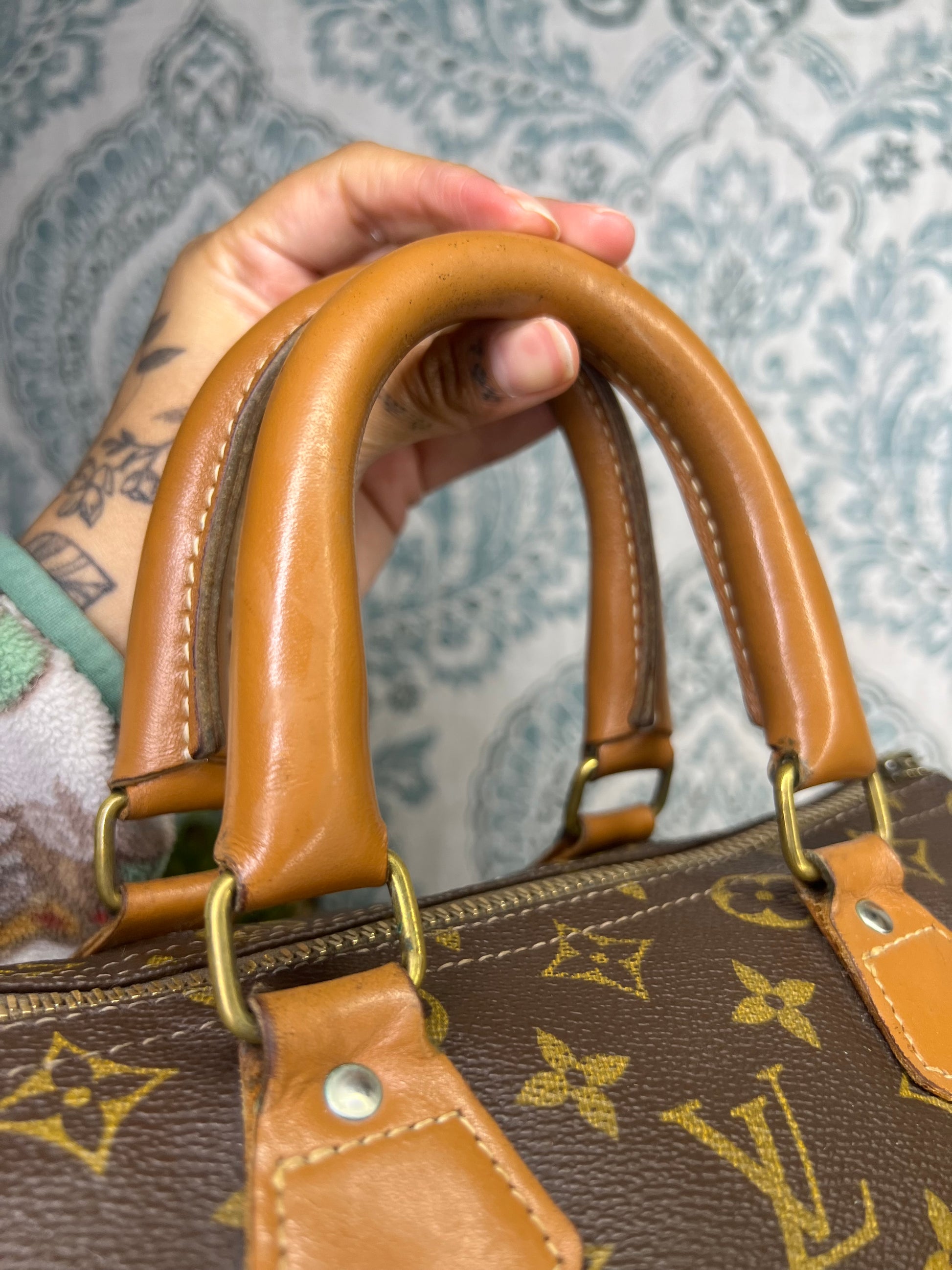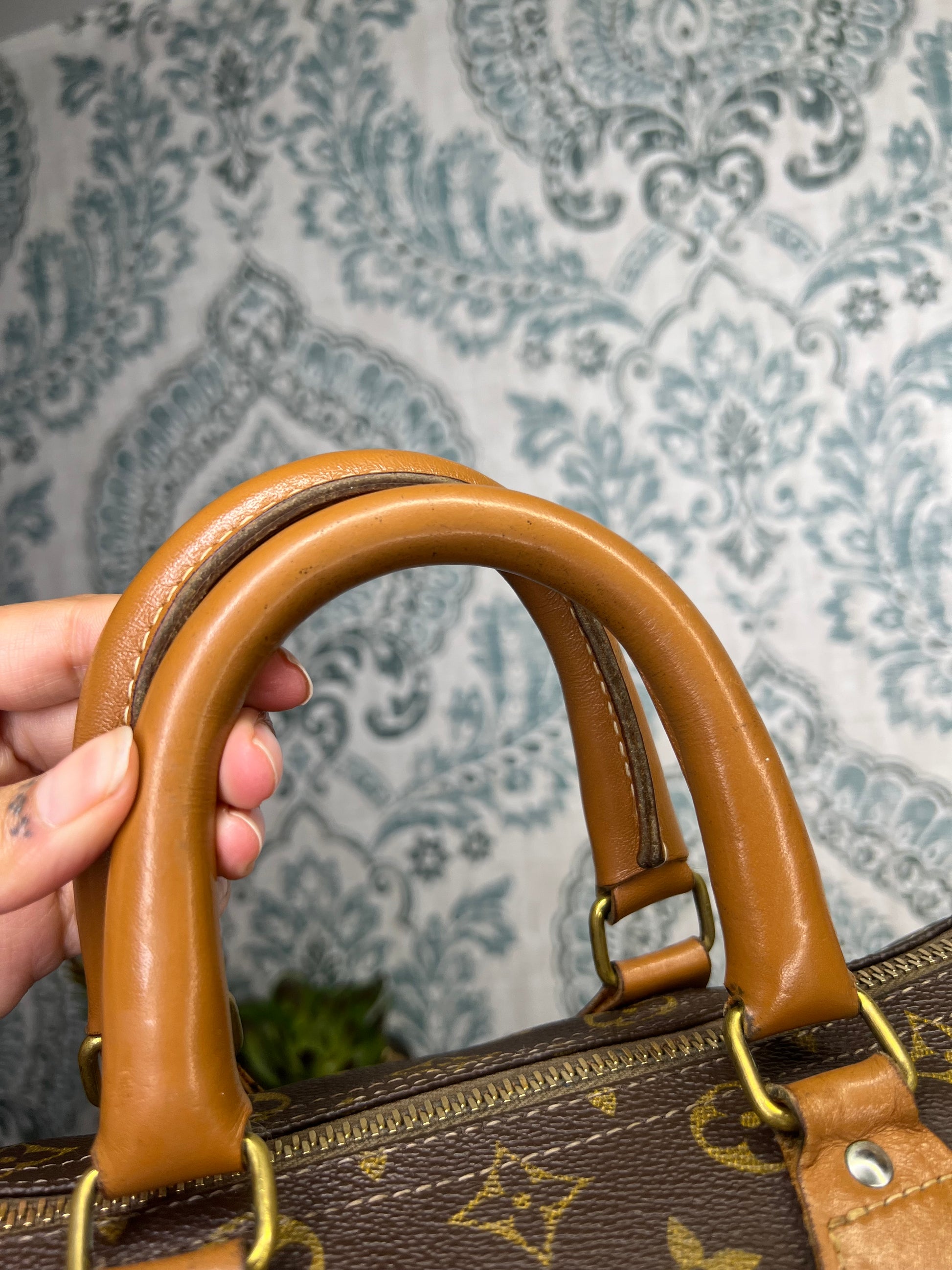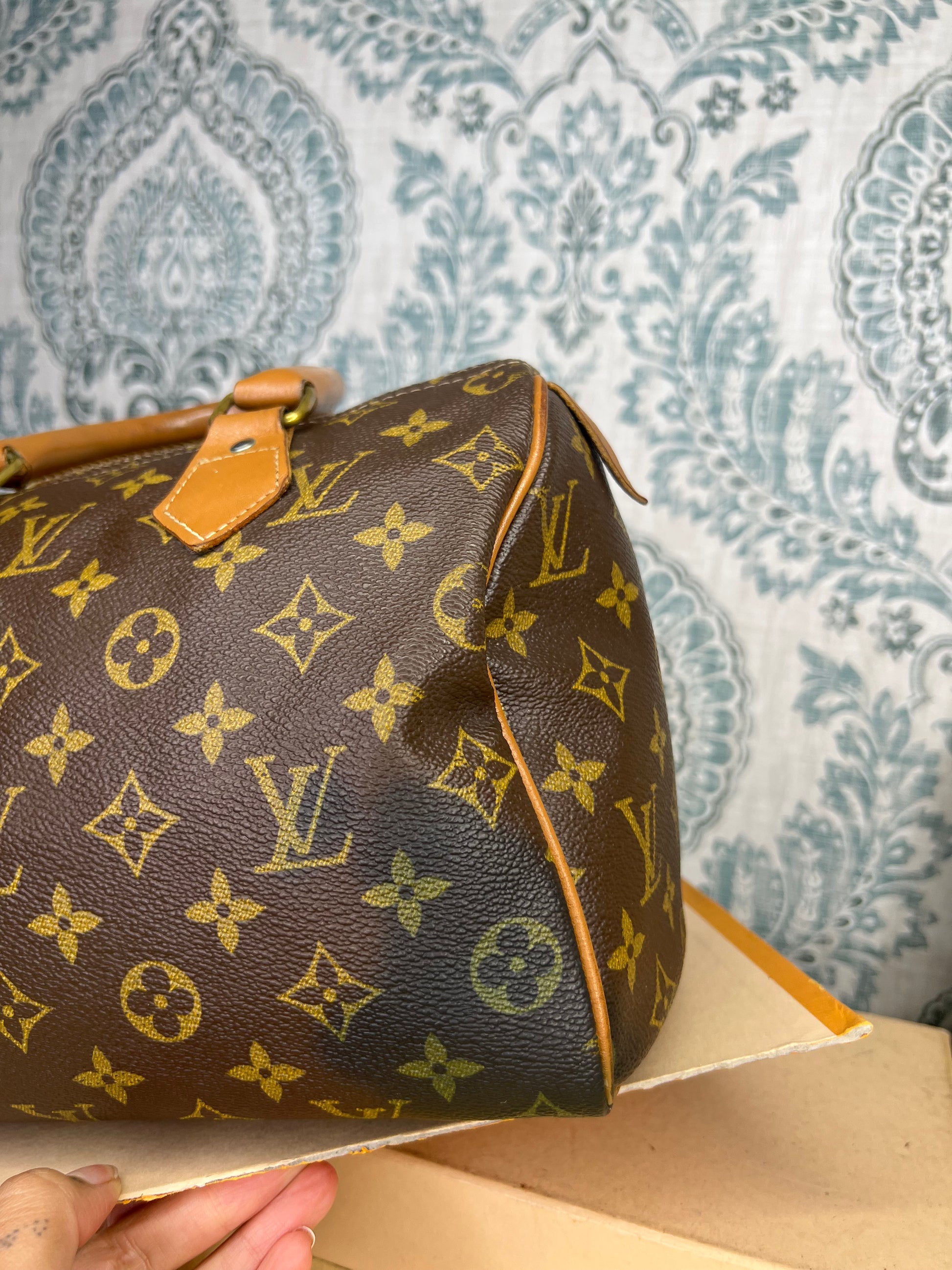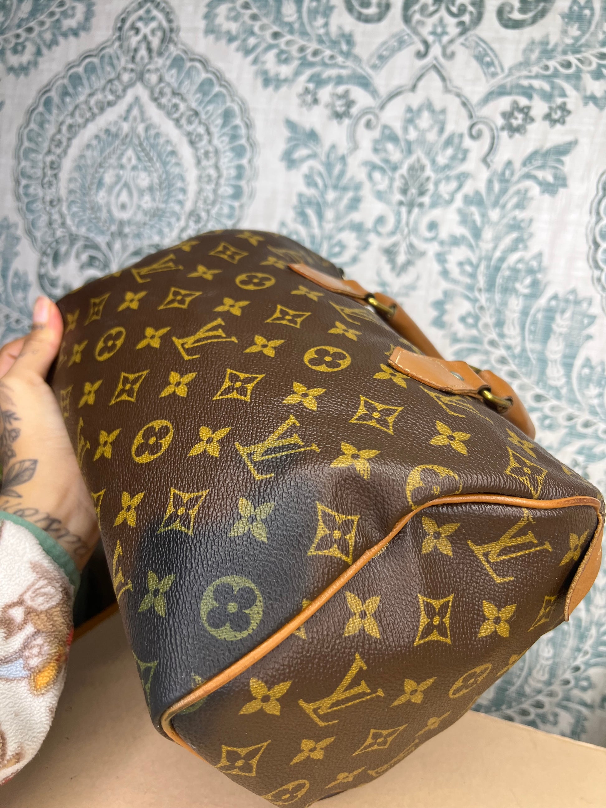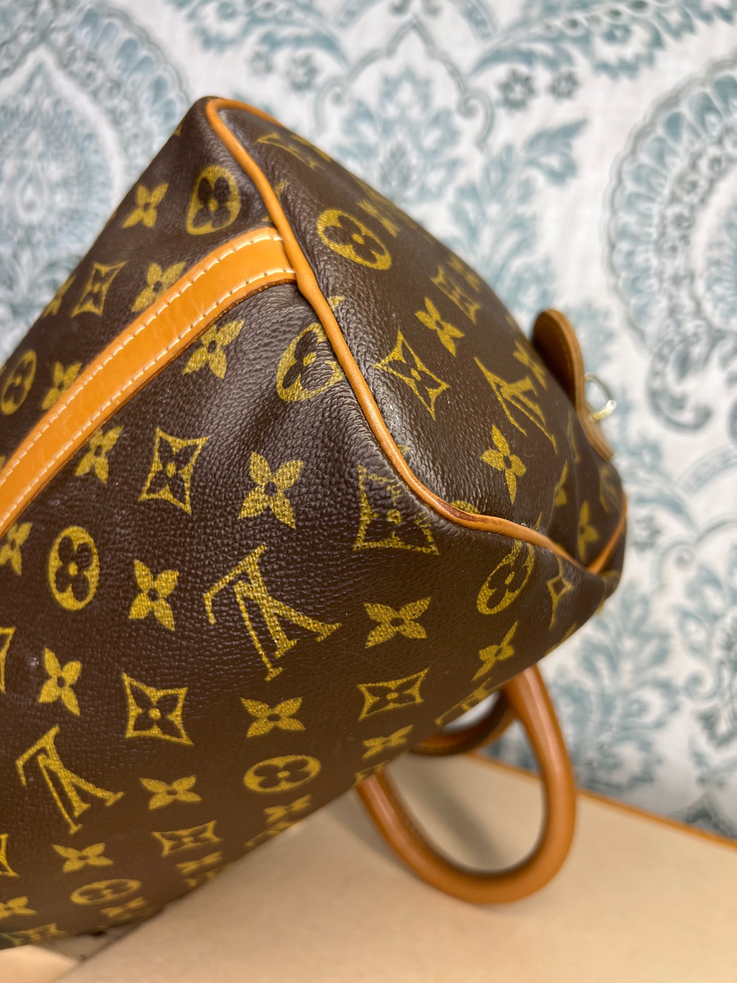 🌸 Canvas is in great shape and crack free. Nice and thick vintage canvas. Monogram is bright and clear, only minor amount of speckled fading but overall very bright and clear. There is an ink stains towards the base at one corner of the bag