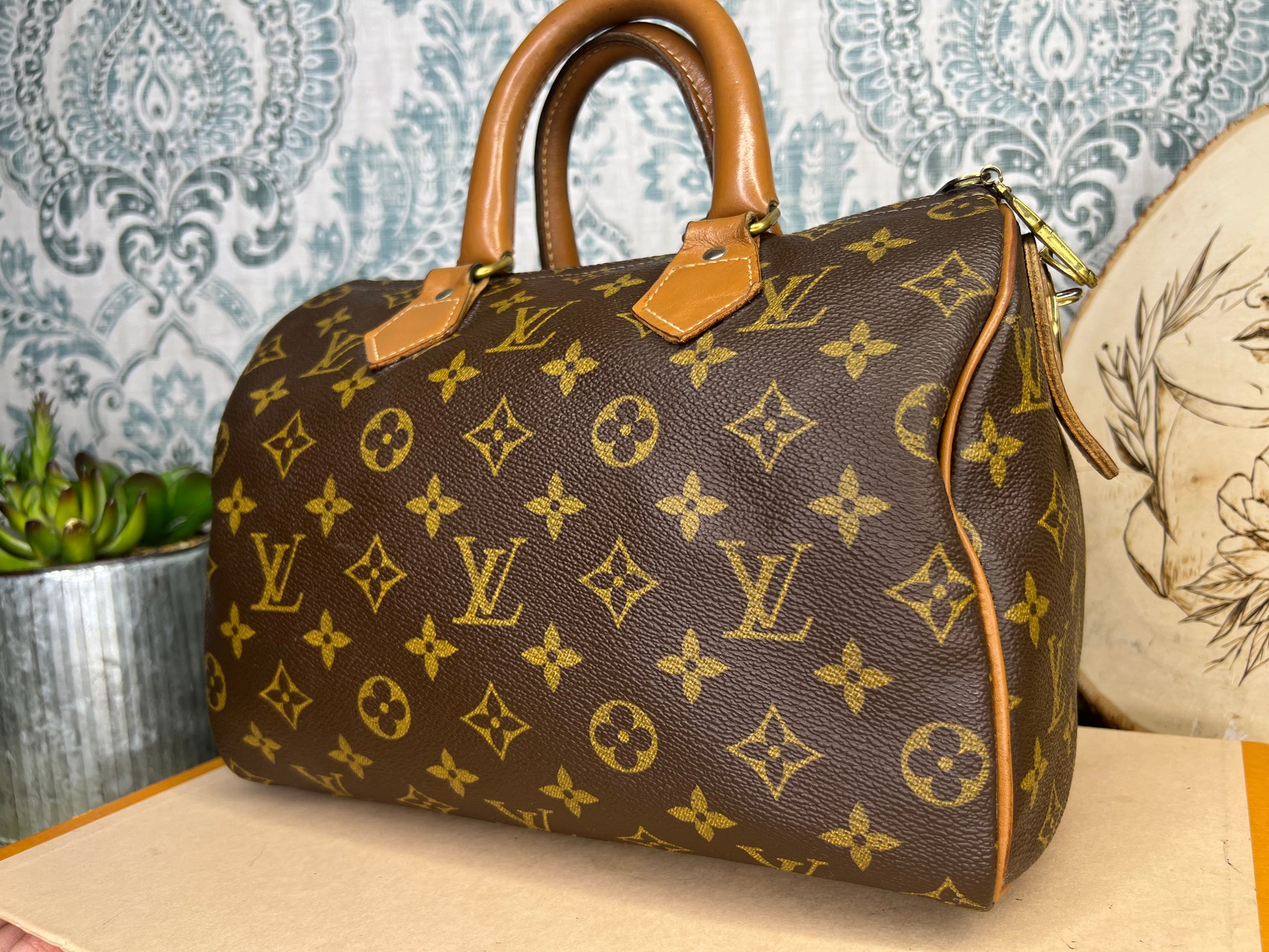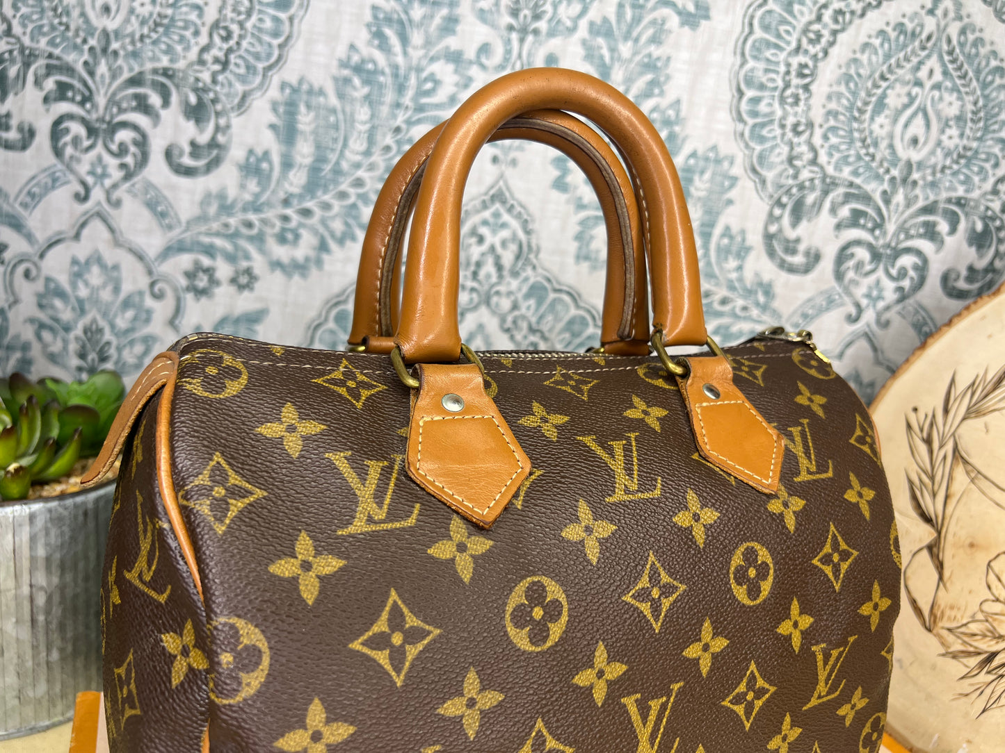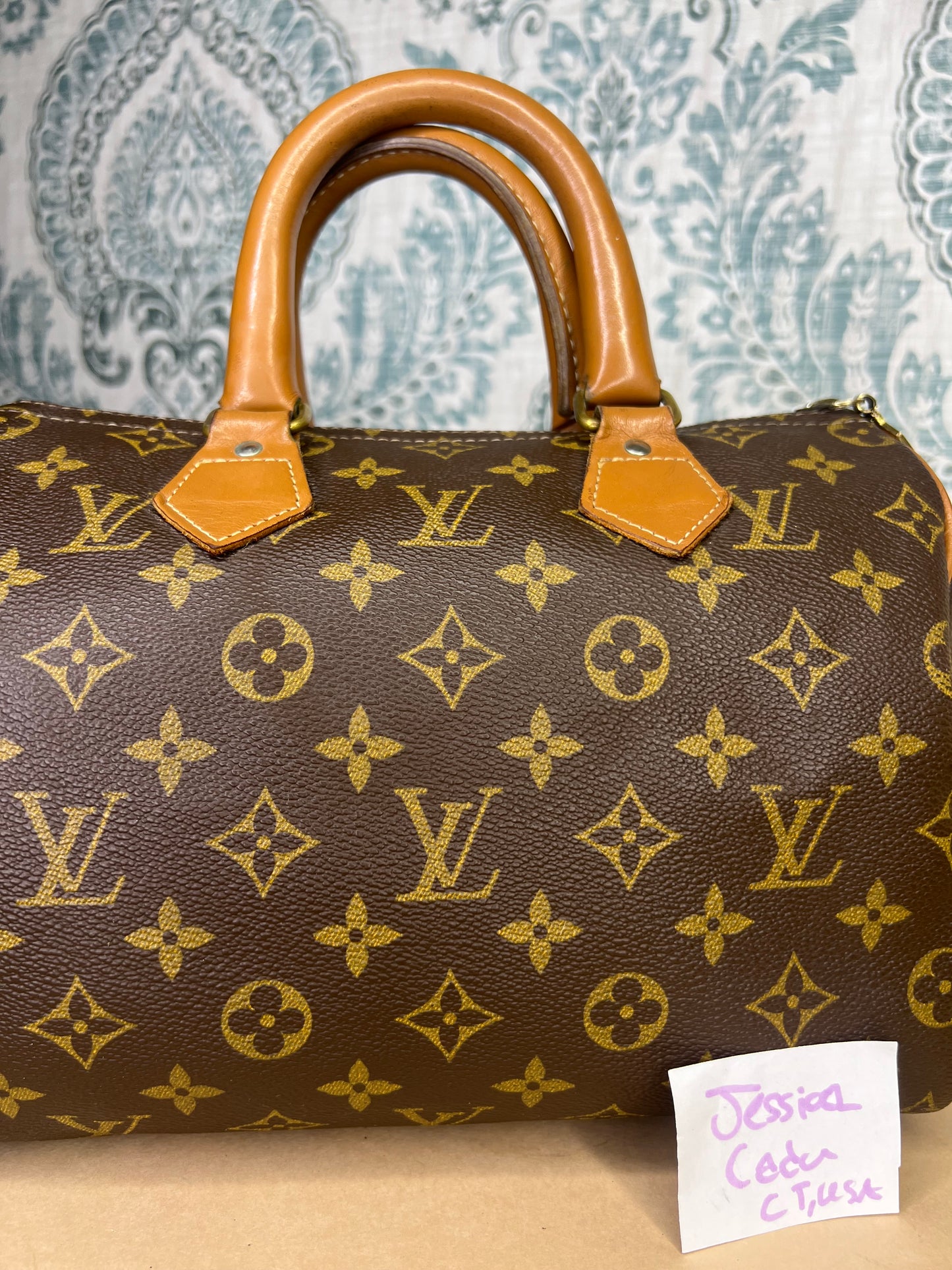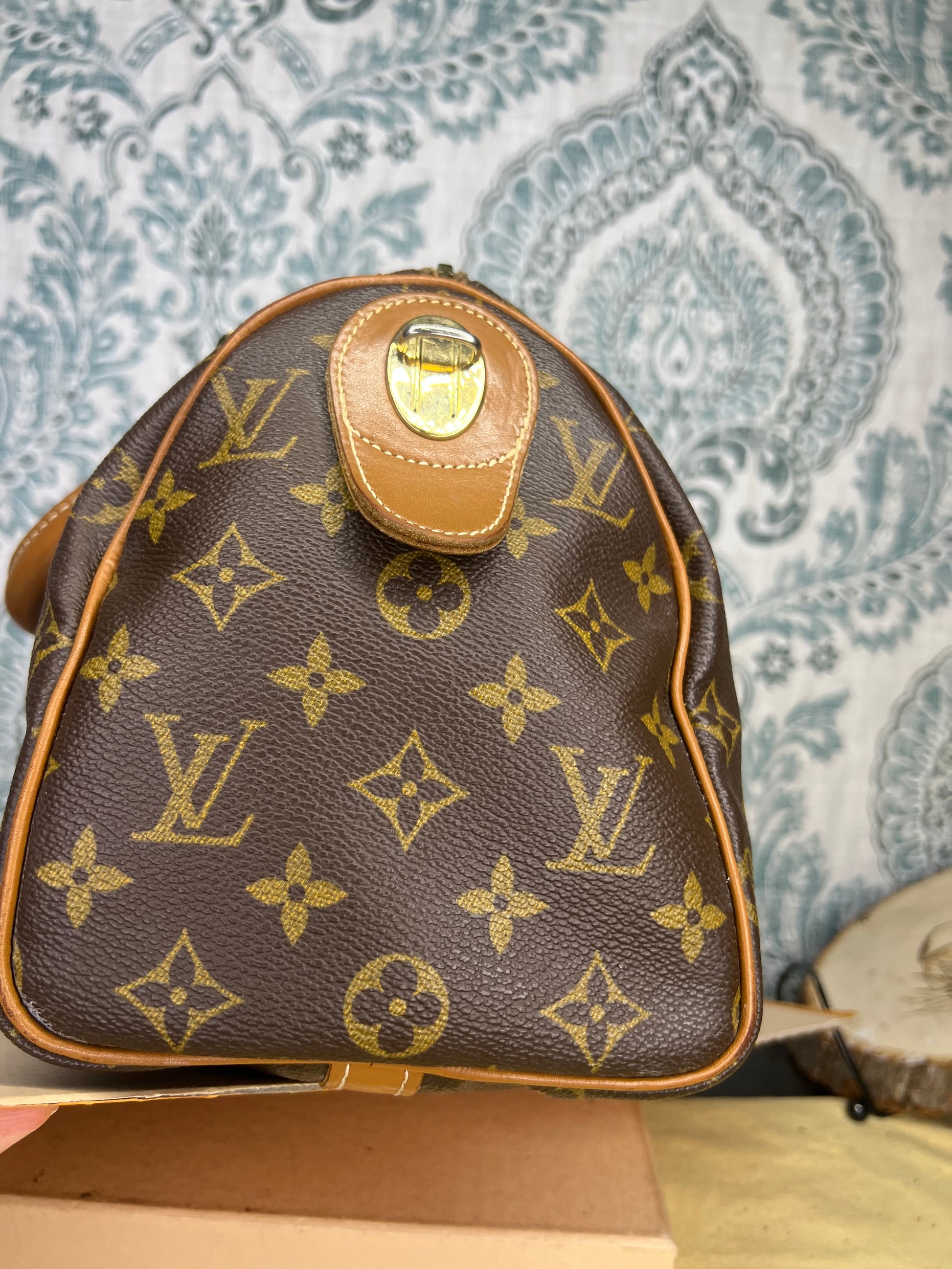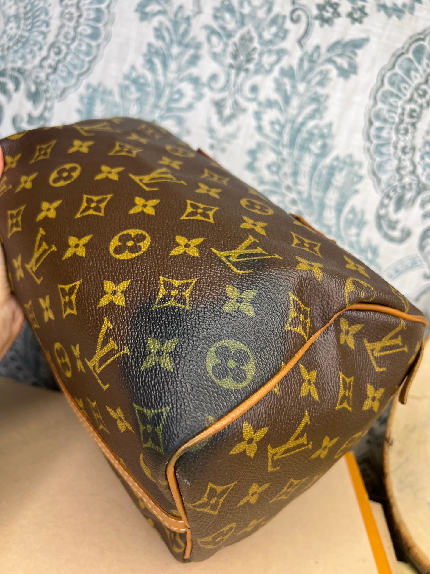 🌸 Canvas is in great shape and crack free. Nice and thick vintage canvas. Monogram is bright and clear, only minor amount of speckled fading but overall very bright and clear. There is an ink stains towards the base at one corner of the bag