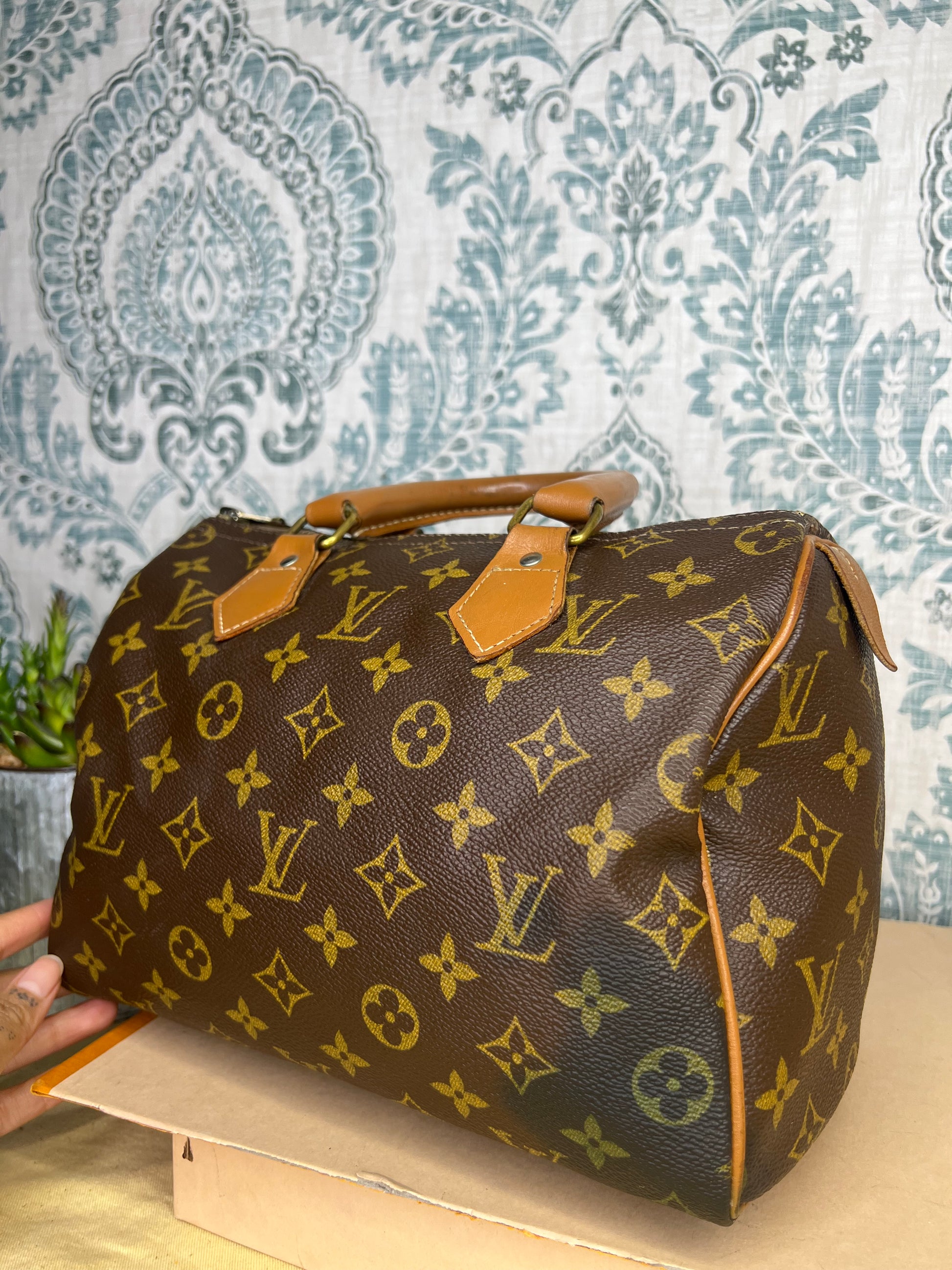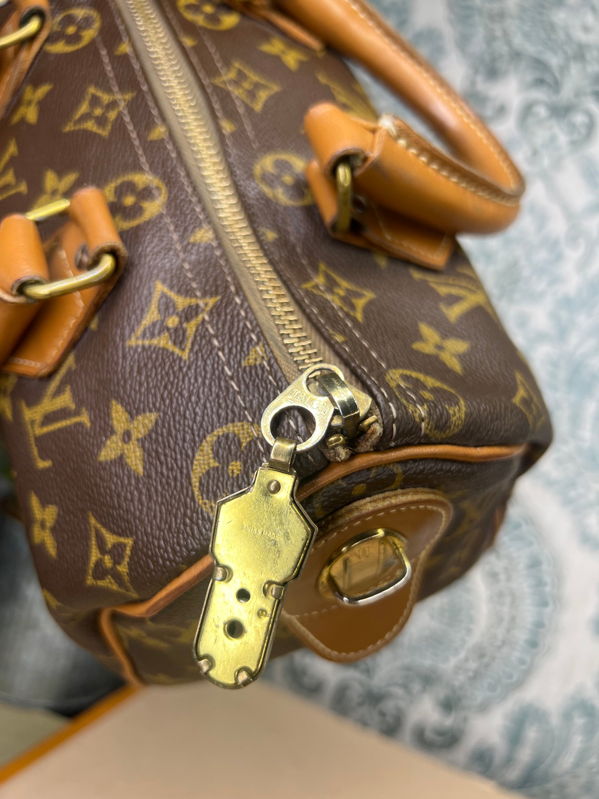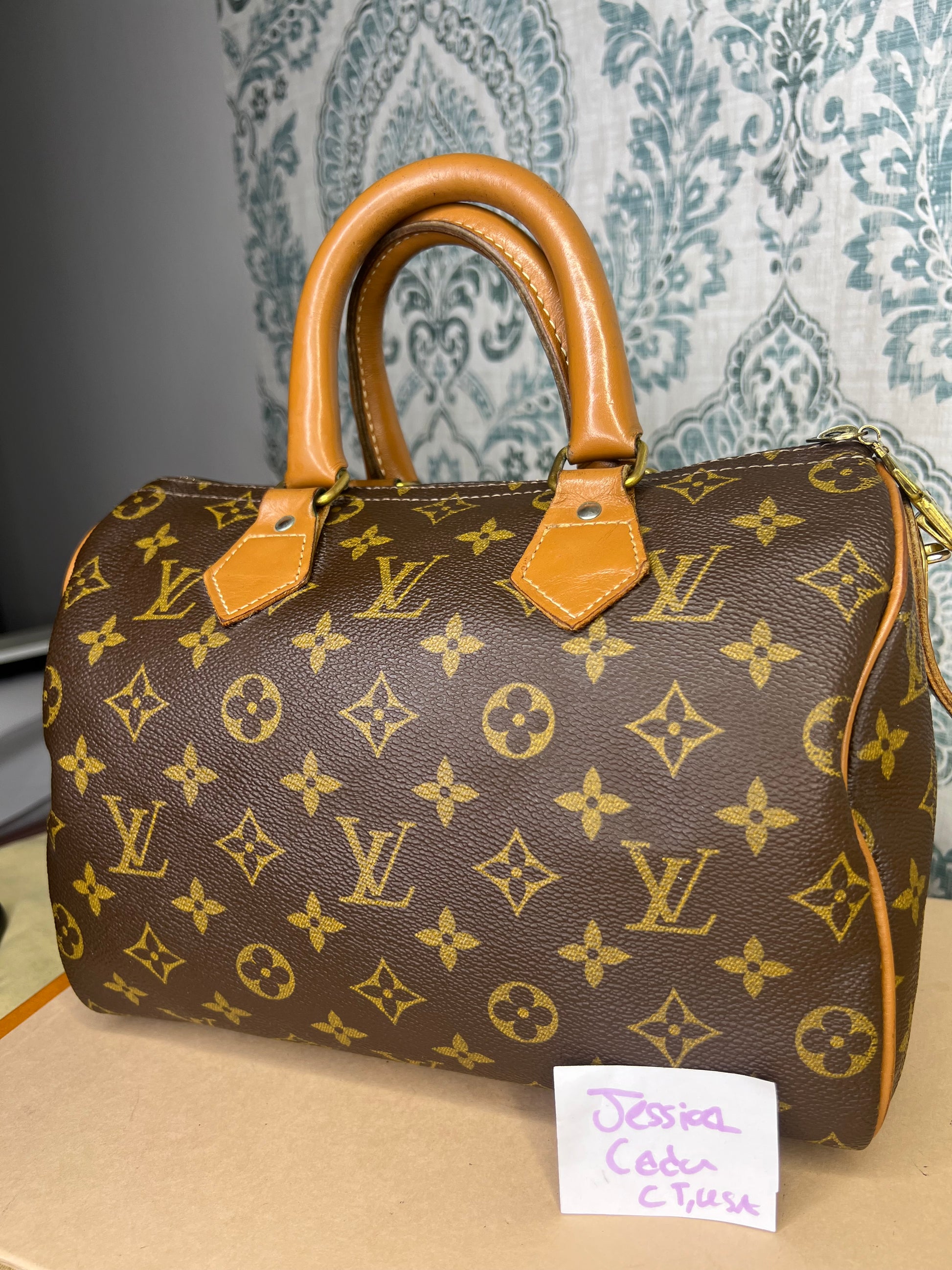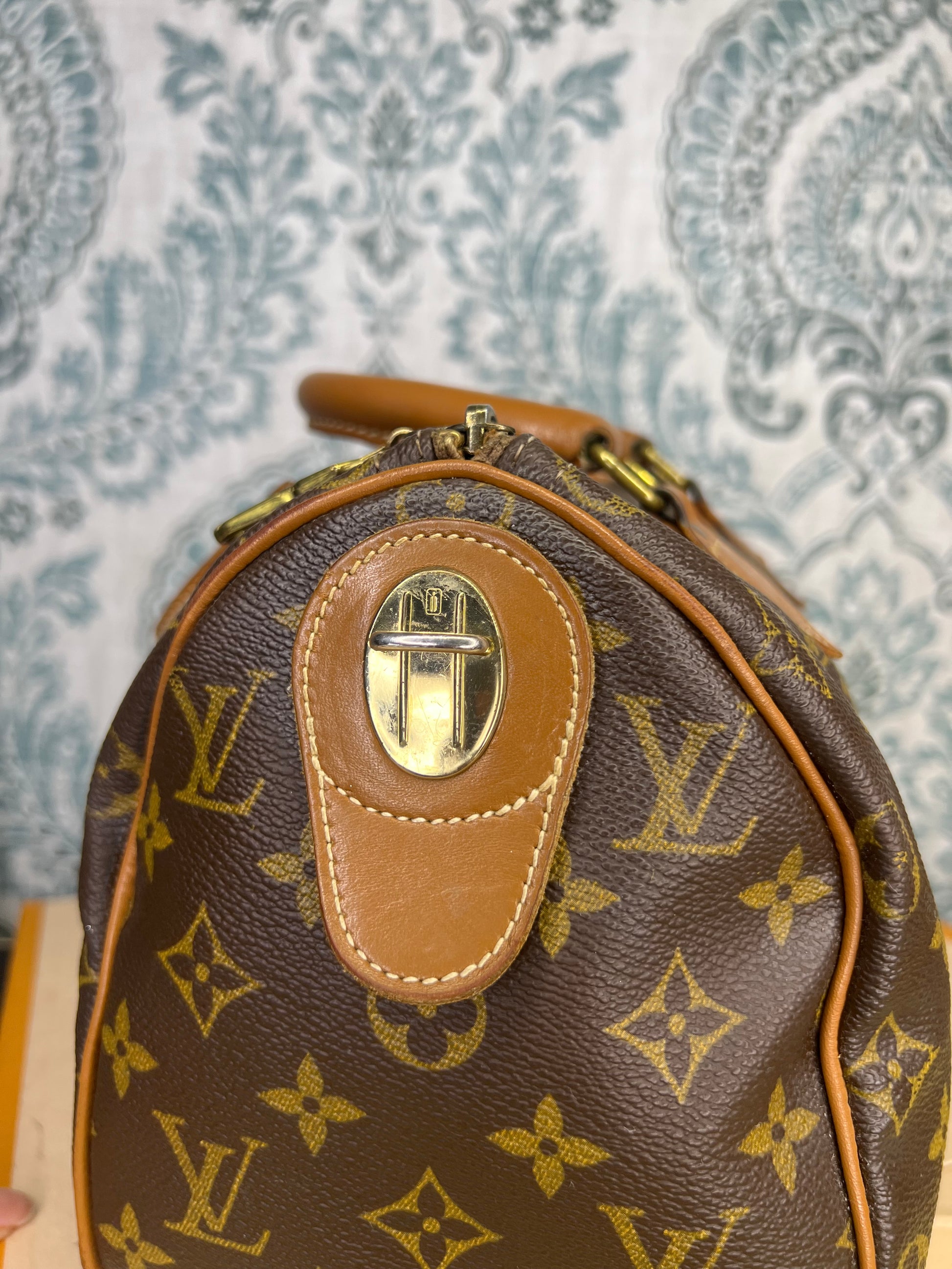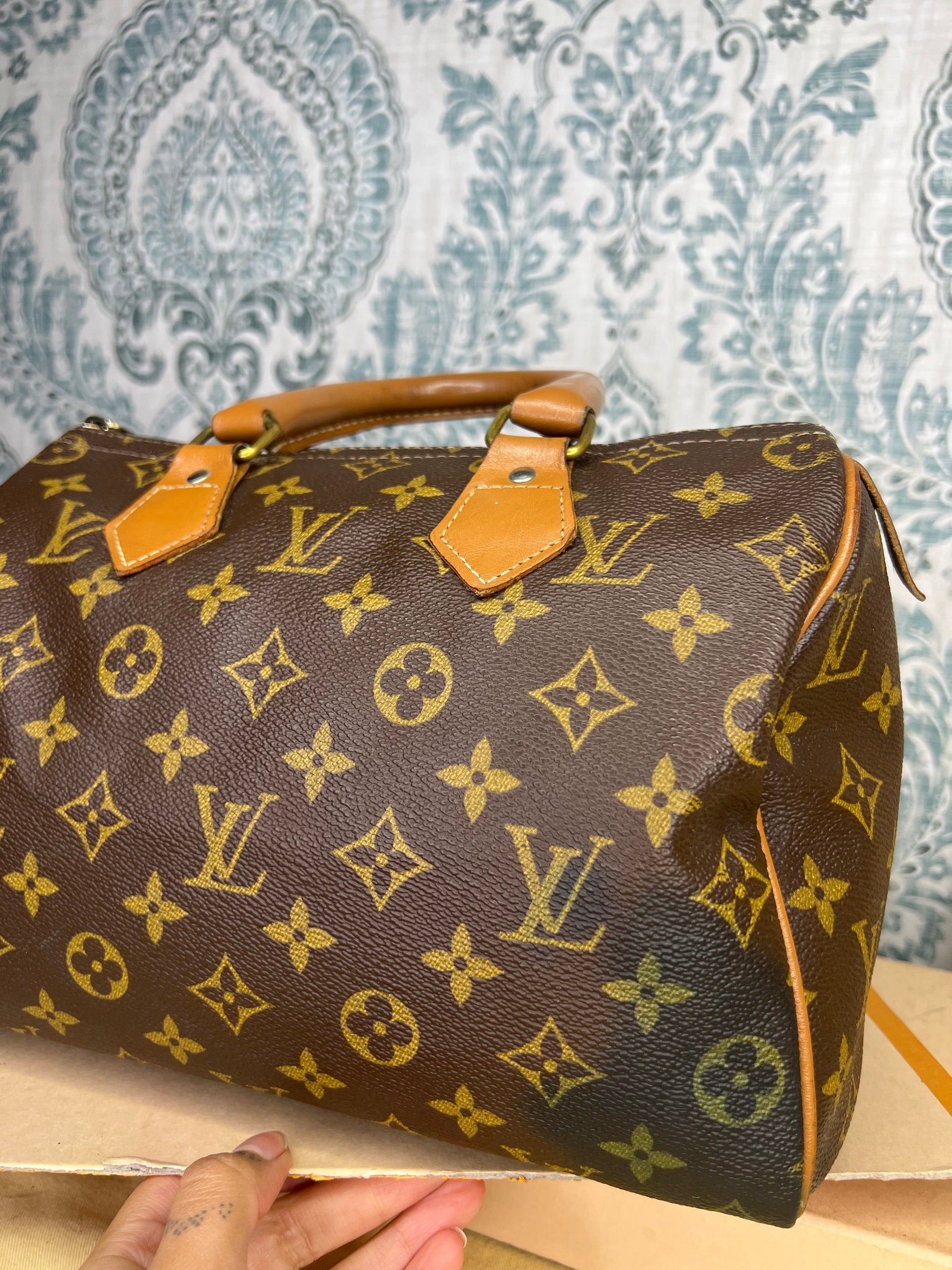 🌸 Canvas is in great shape and crack free. Nice and thick vintage canvas. Monogram is bright and clear, only minor amount of speckled fading but overall very bright and clear. There is an ink stains towards the base at one corner of the bag