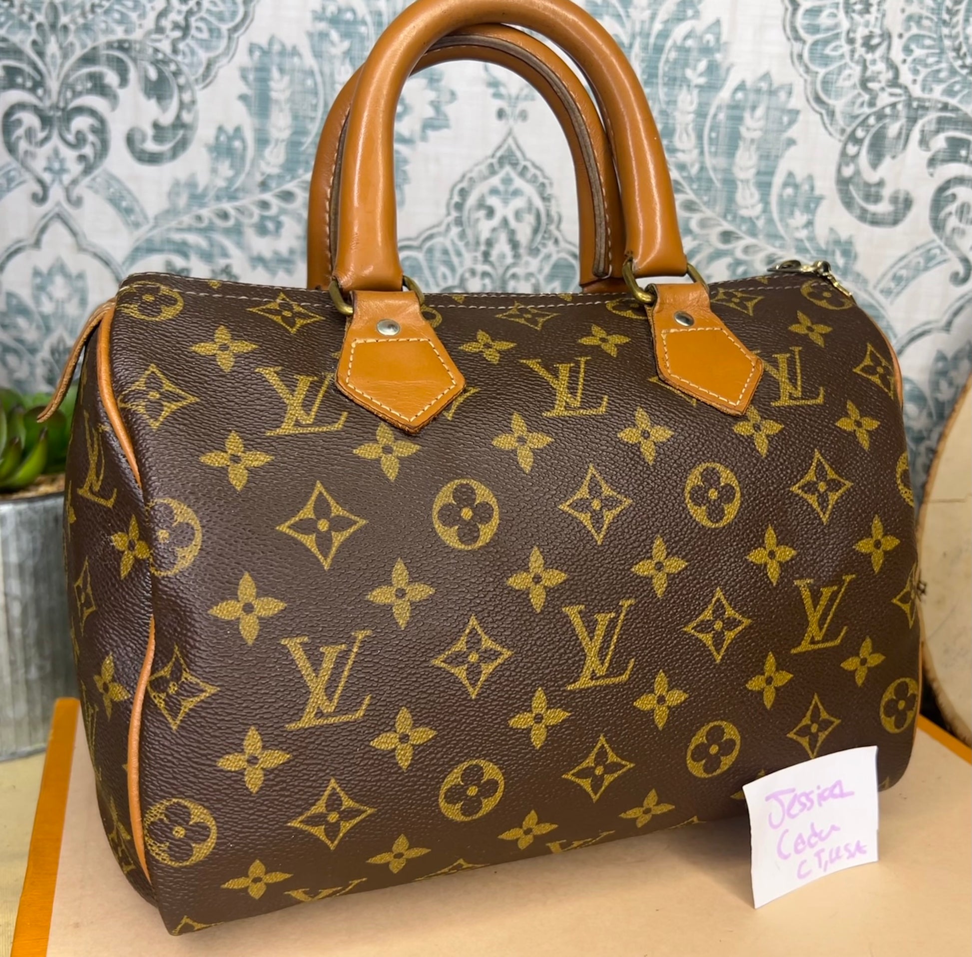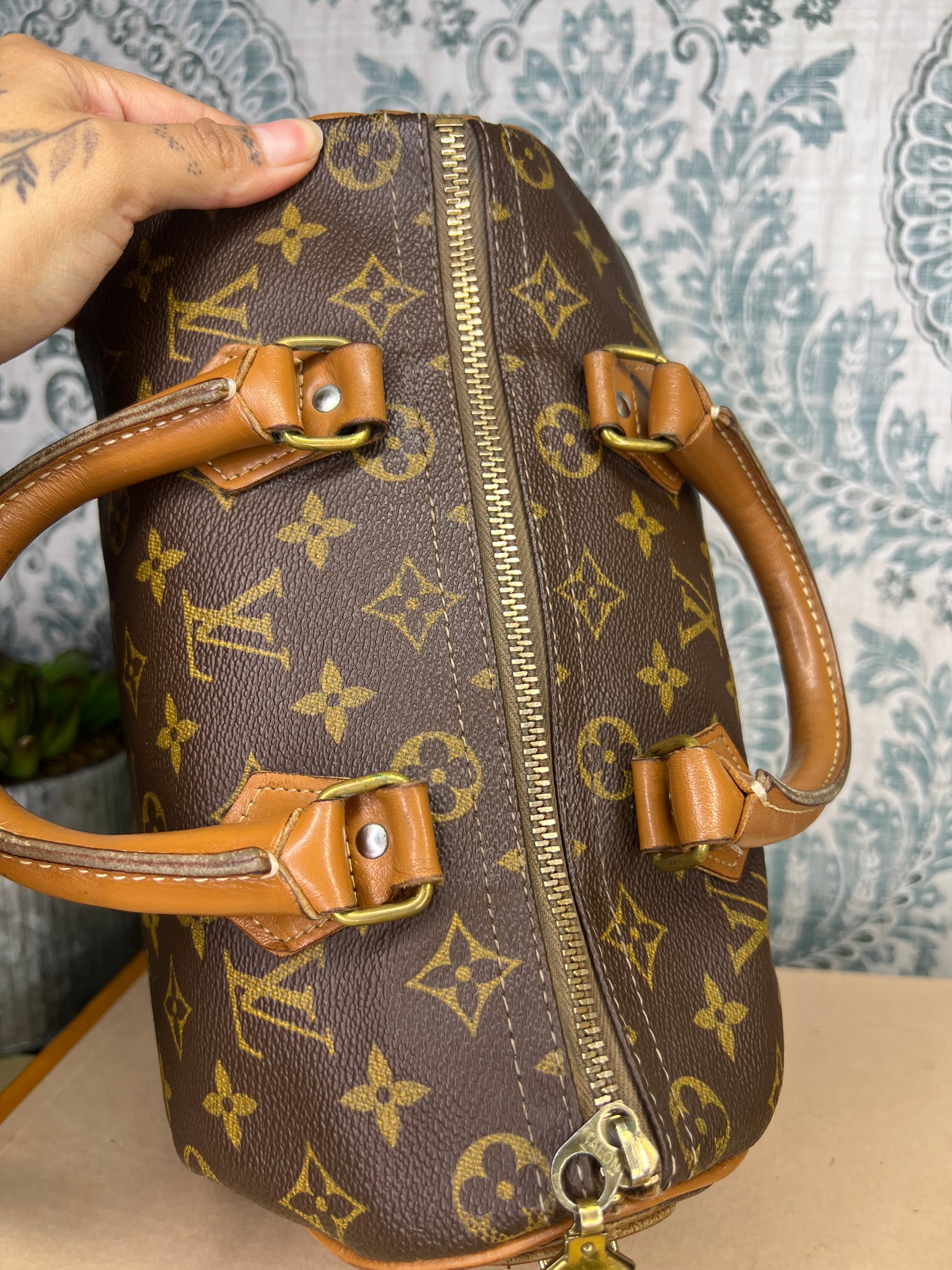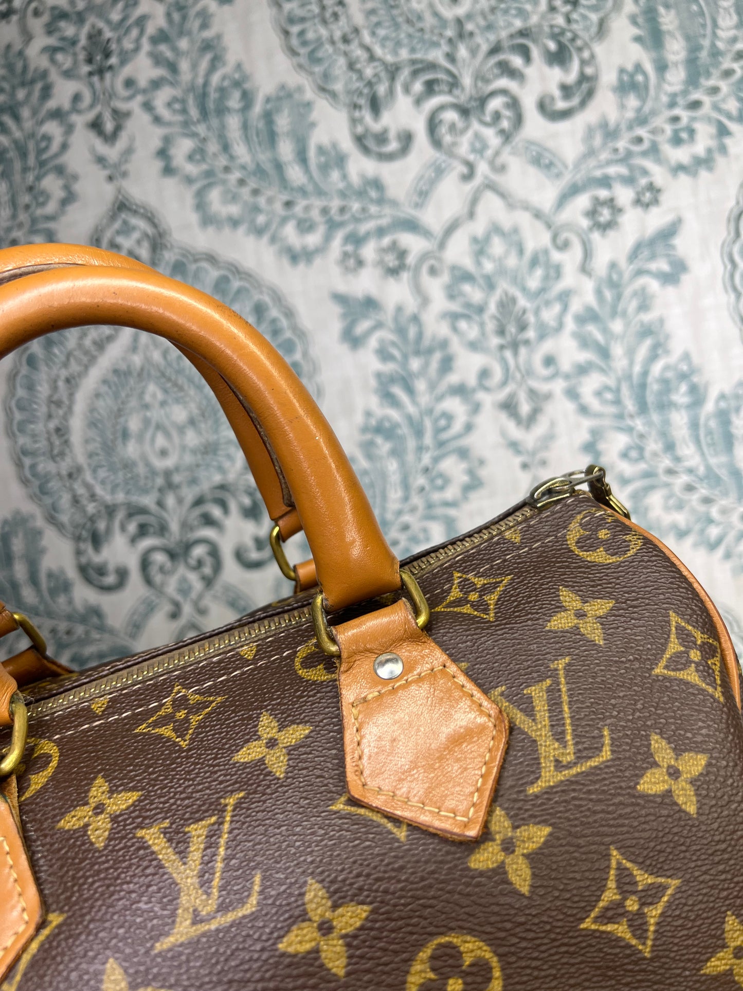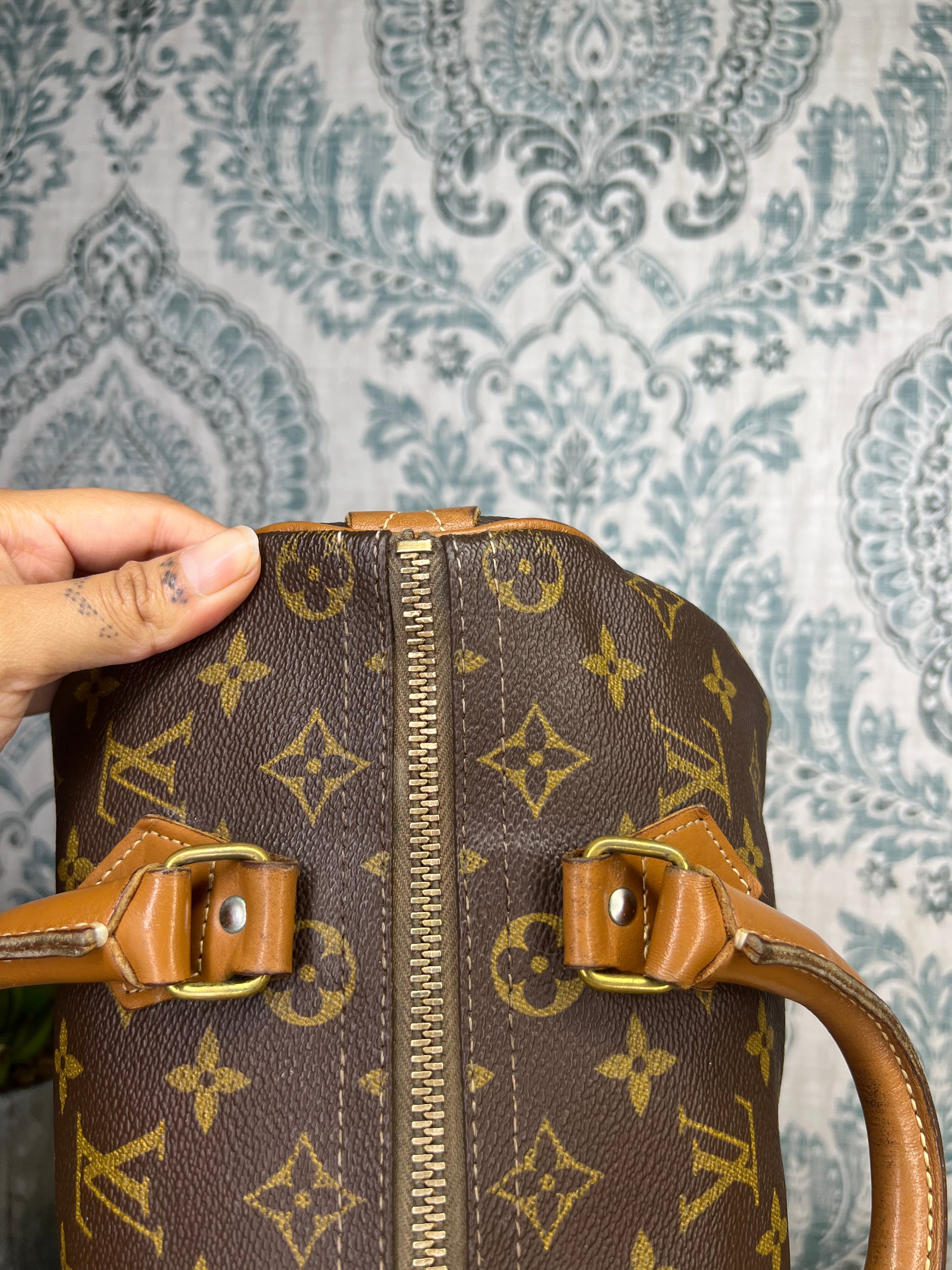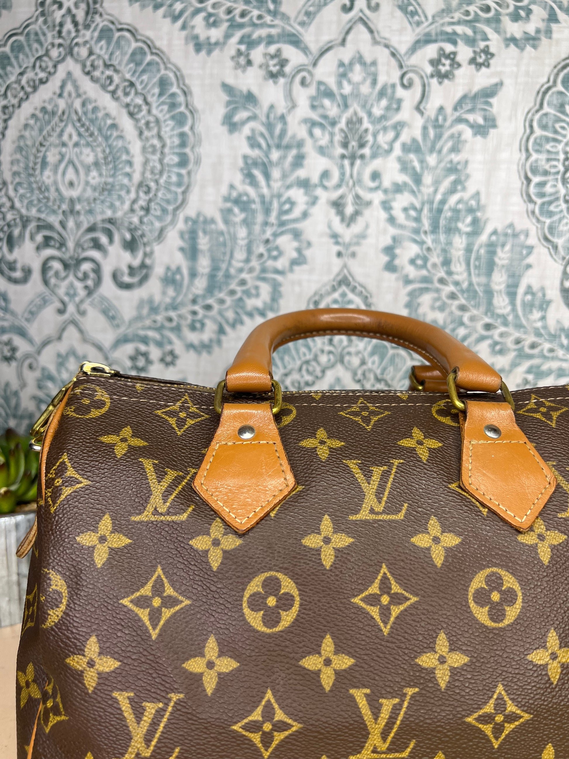 🌸 Canvas is in great shape and crack free. Nice and thick vintage canvas. Monogram is bright and clear, only minor amount of speckled fading but overall very bright and clear. There is an ink stains towards the base at one corner of the bag