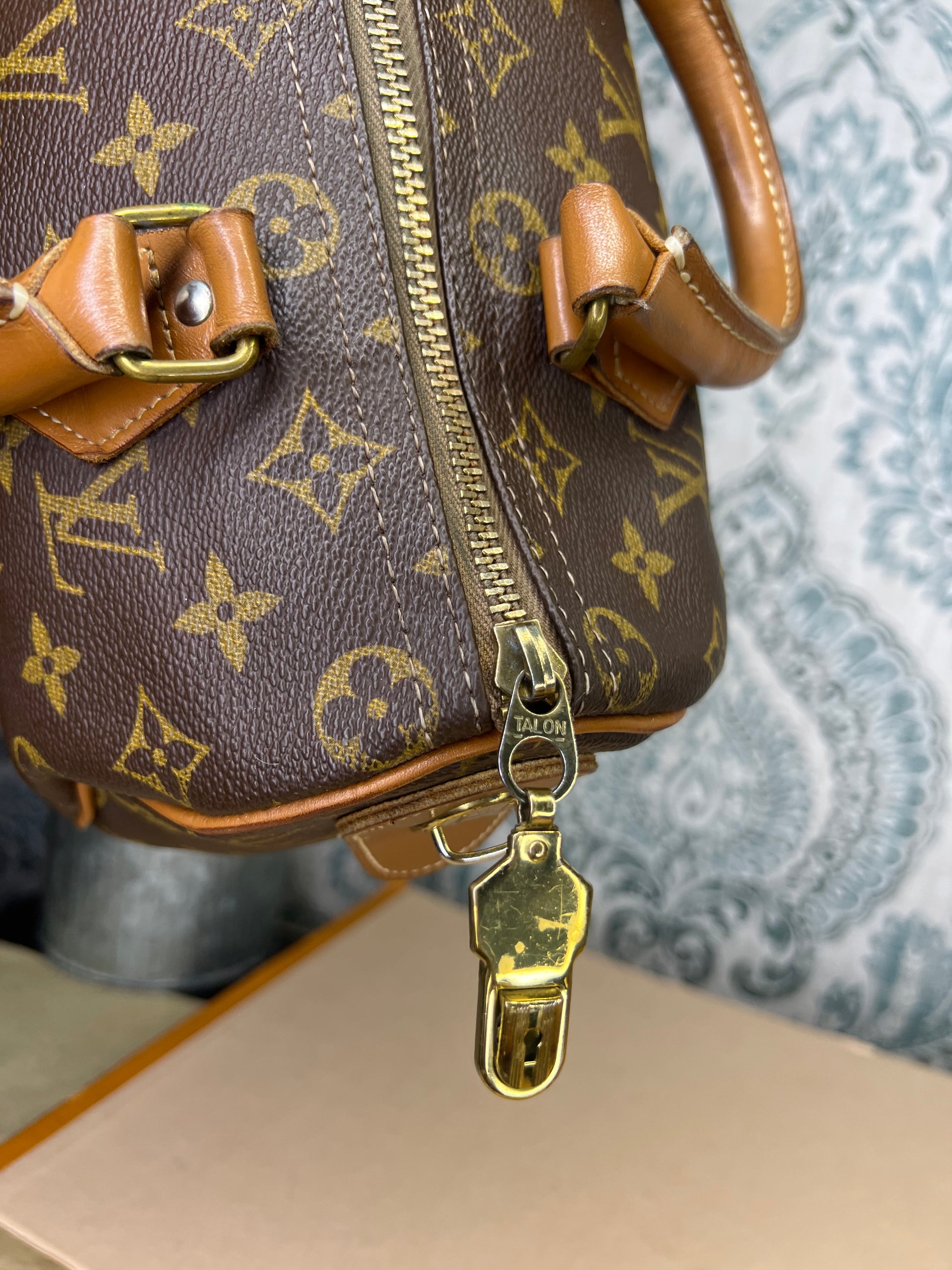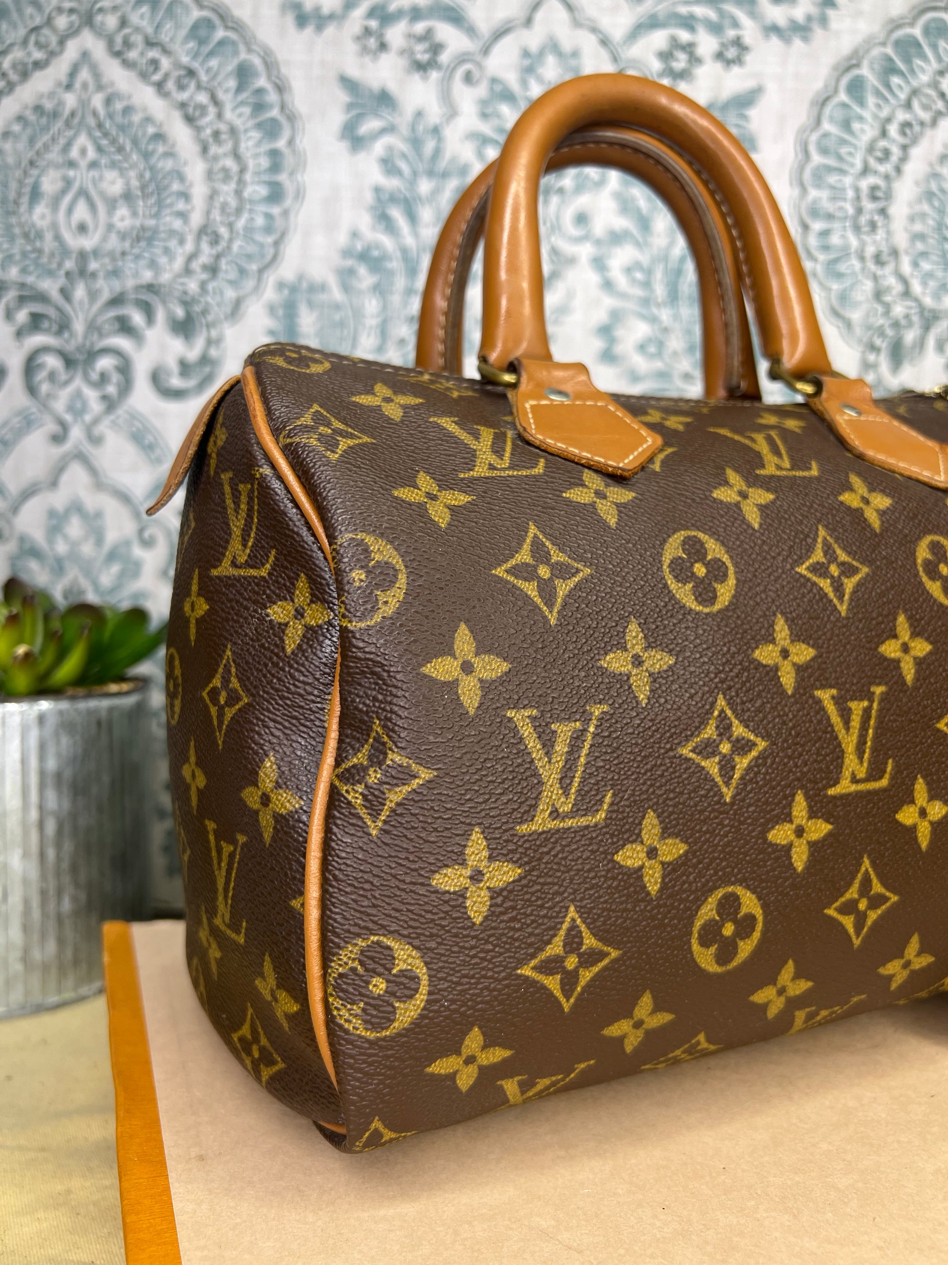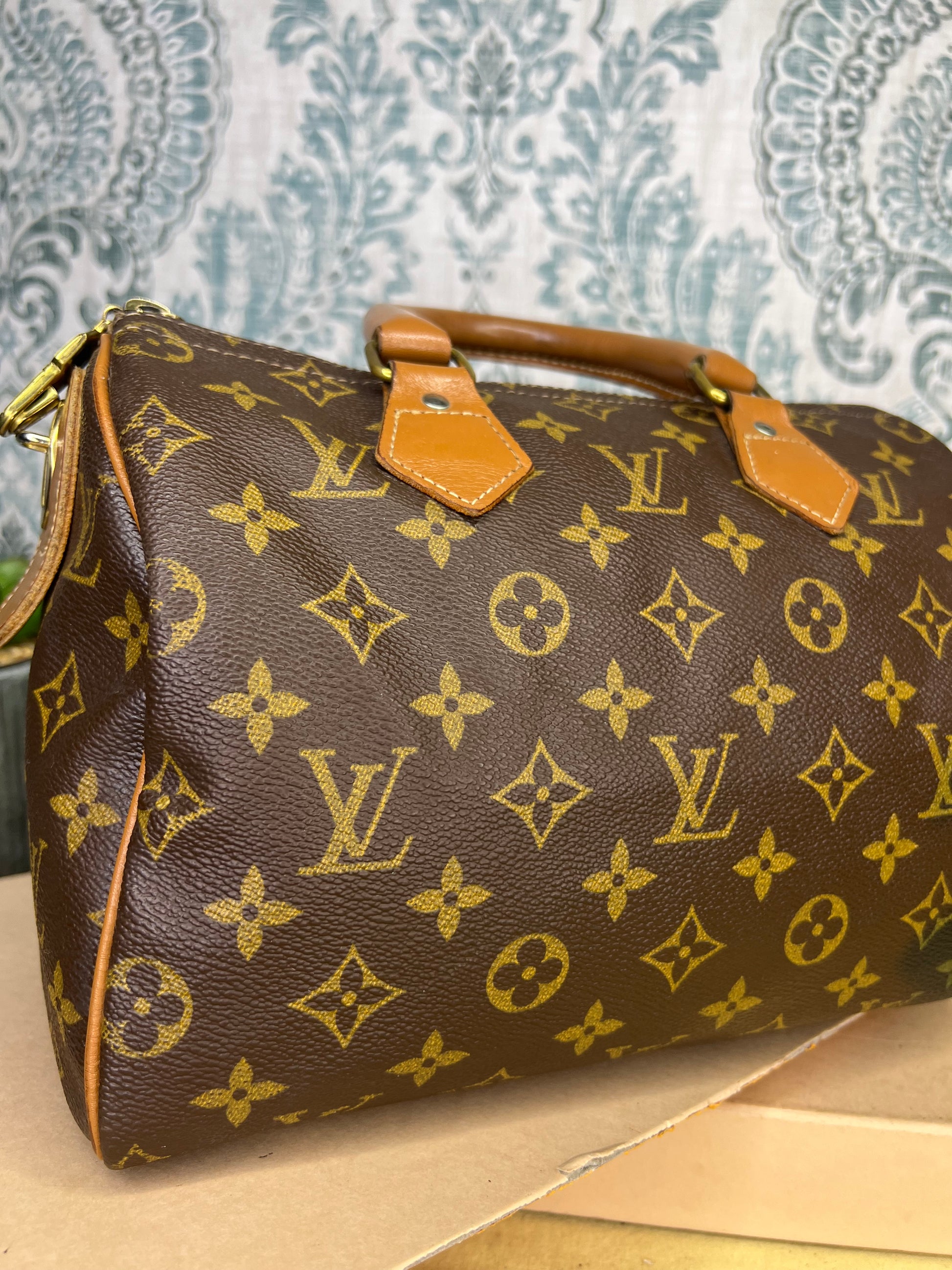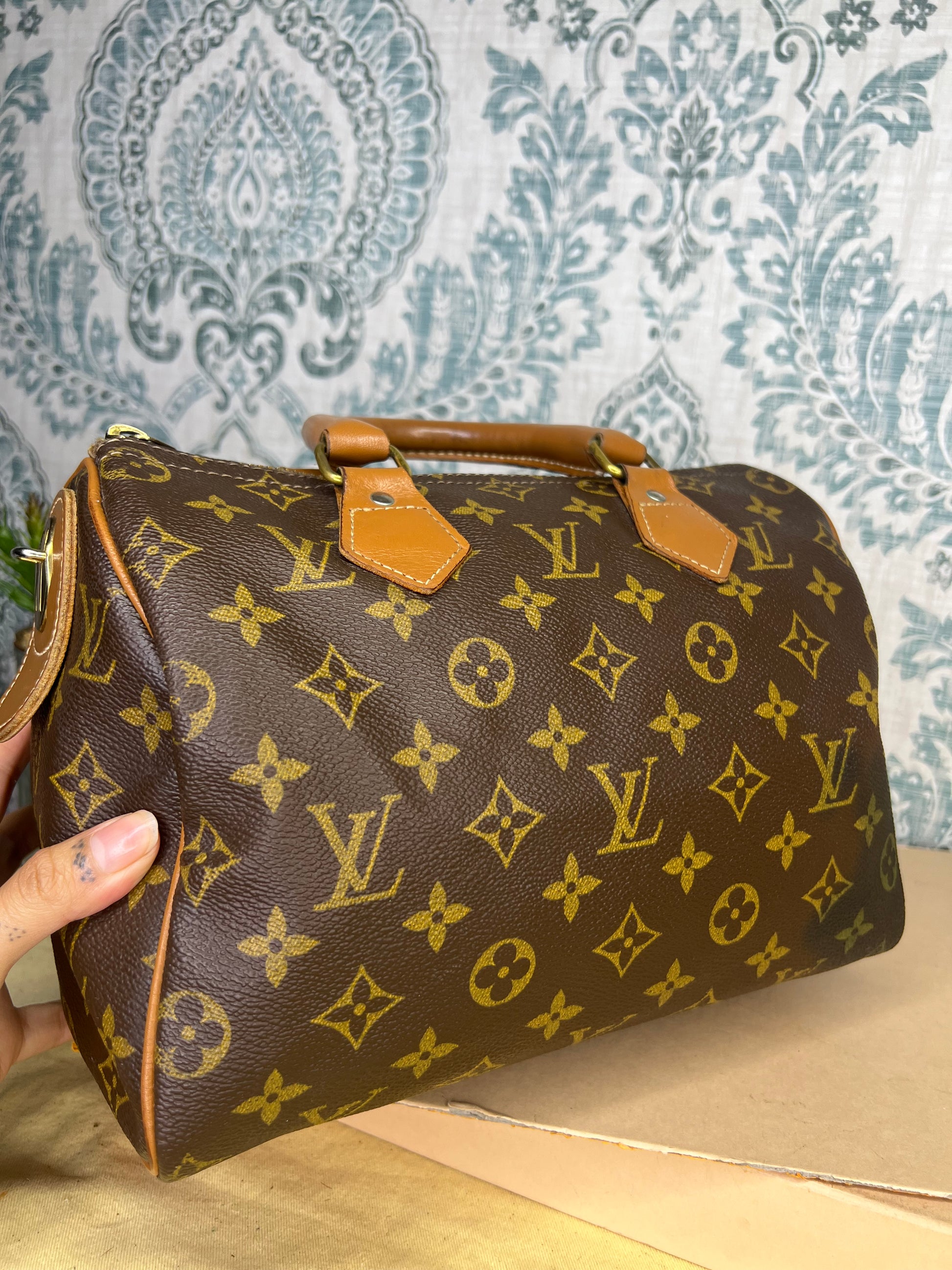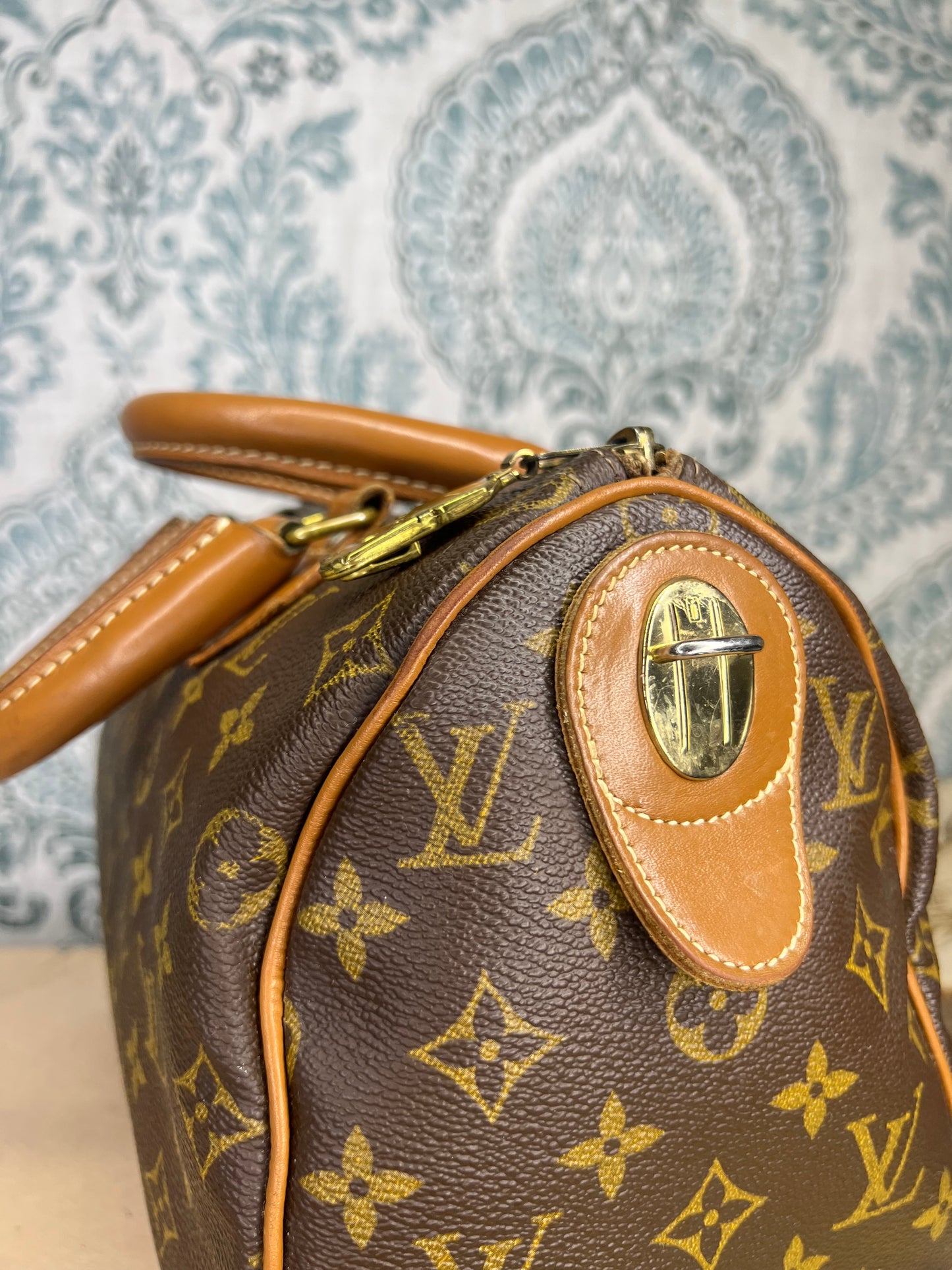 🌸 Canvas is in great shape and crack free. Nice and thick vintage canvas. Monogram is bright and clear, only minor amount of speckled fading but overall very bright and clear. There is an ink stains towards the base at one corner of the bag