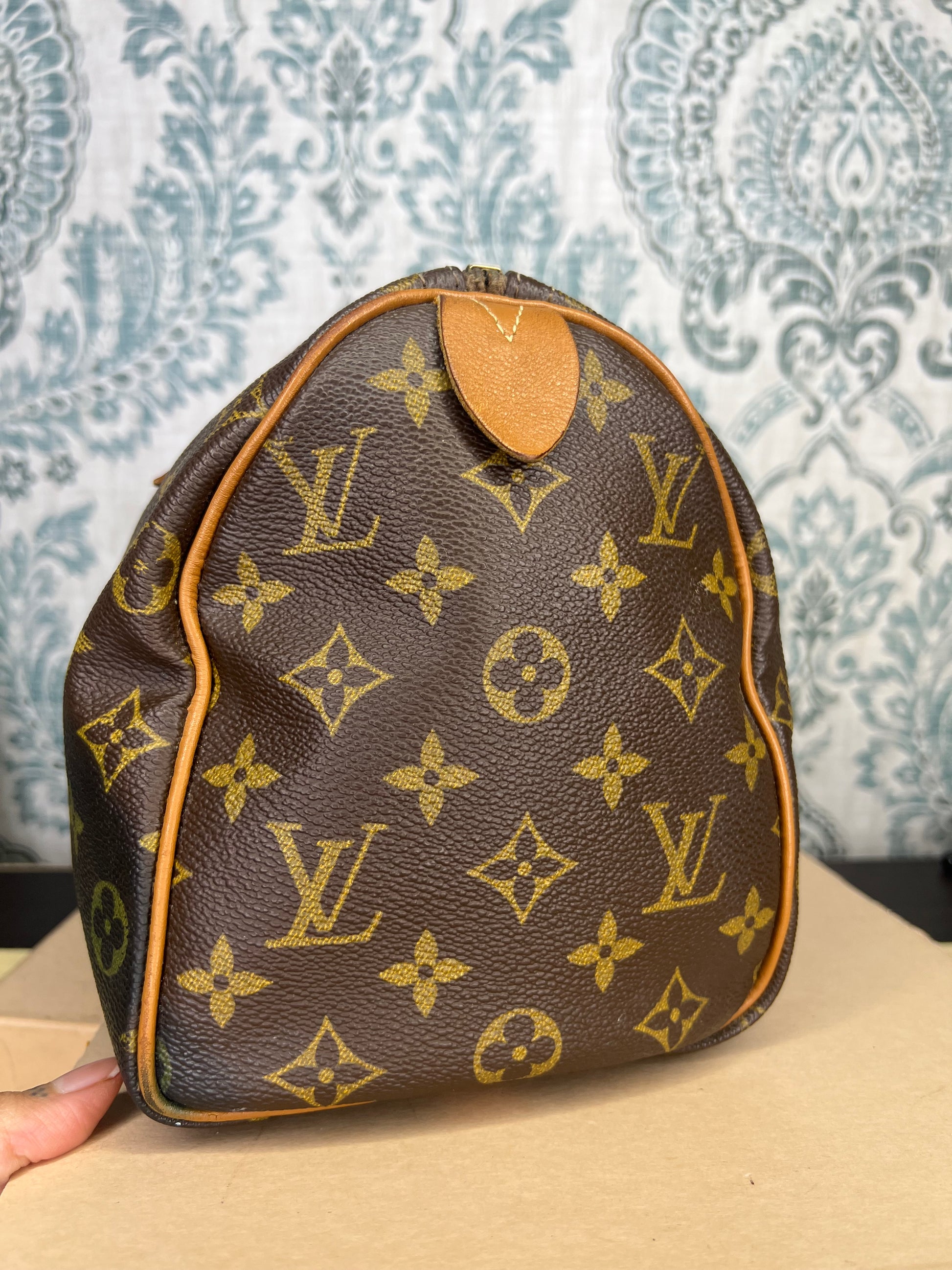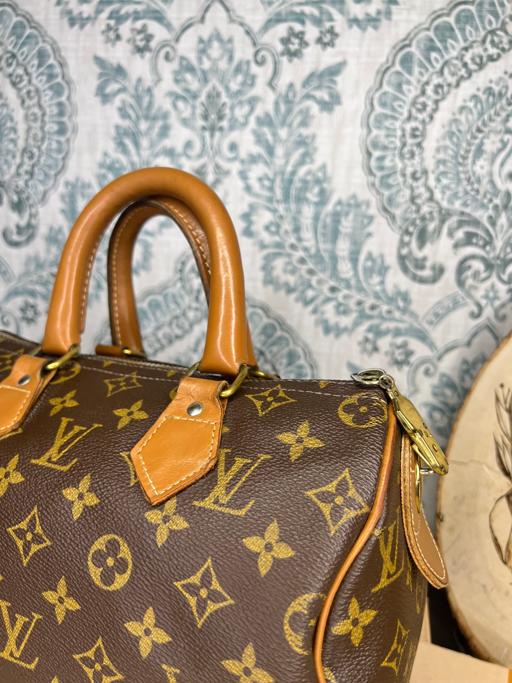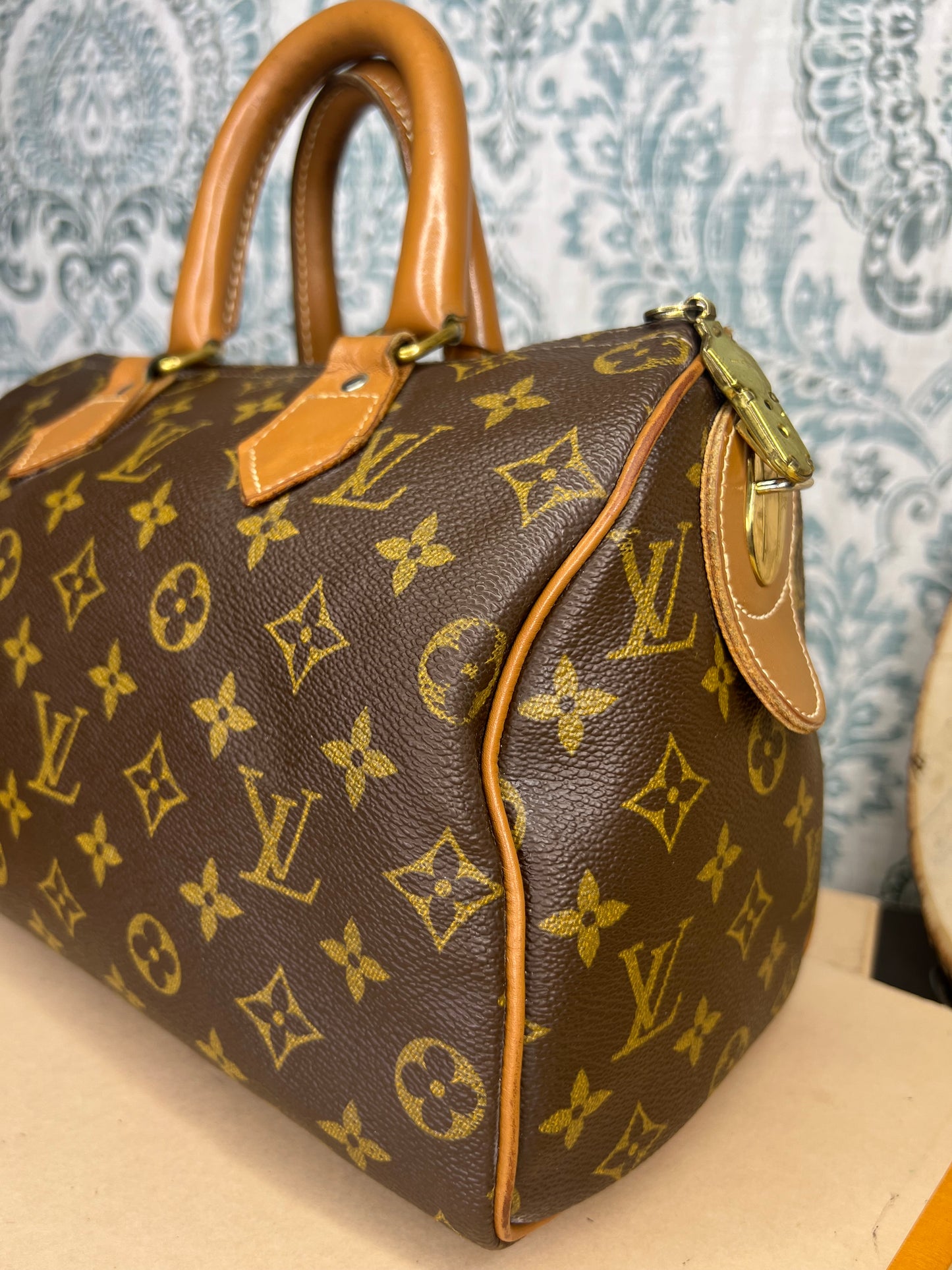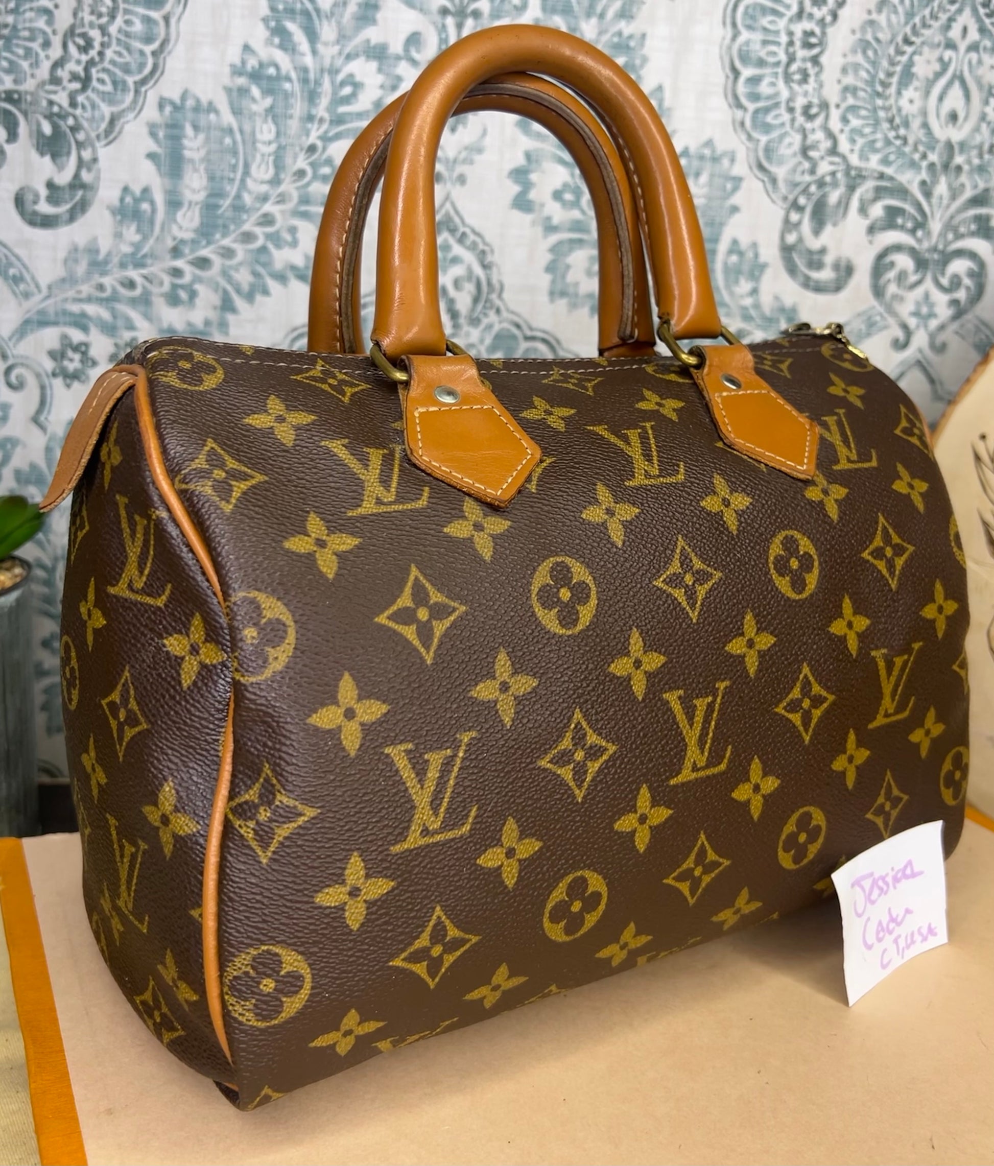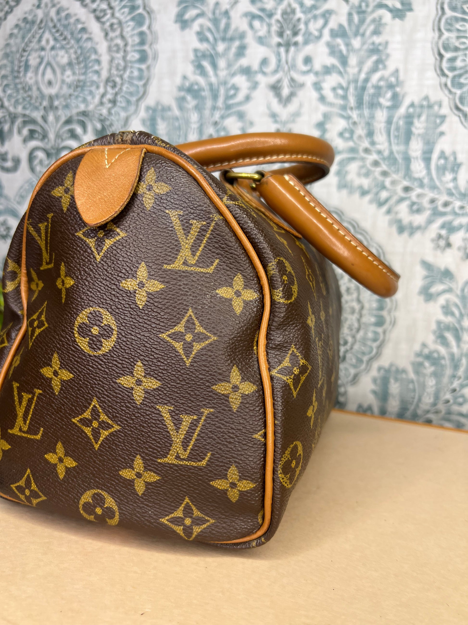 🌸 Canvas is in great shape and crack free. Nice and thick vintage canvas. Monogram is bright and clear, only minor amount of speckled fading but overall very bright and clear. There is an ink stains towards the base at one corner of the bag