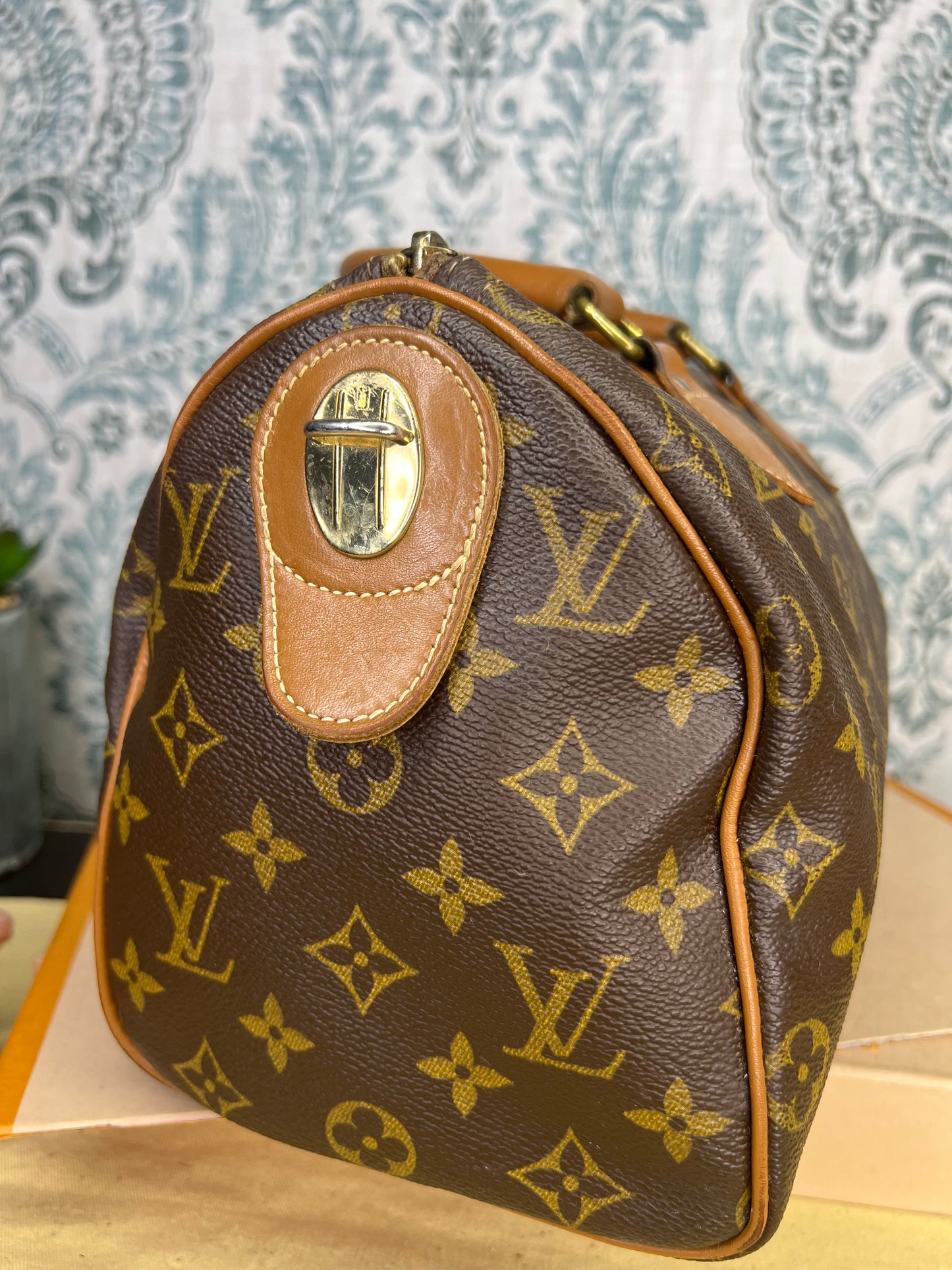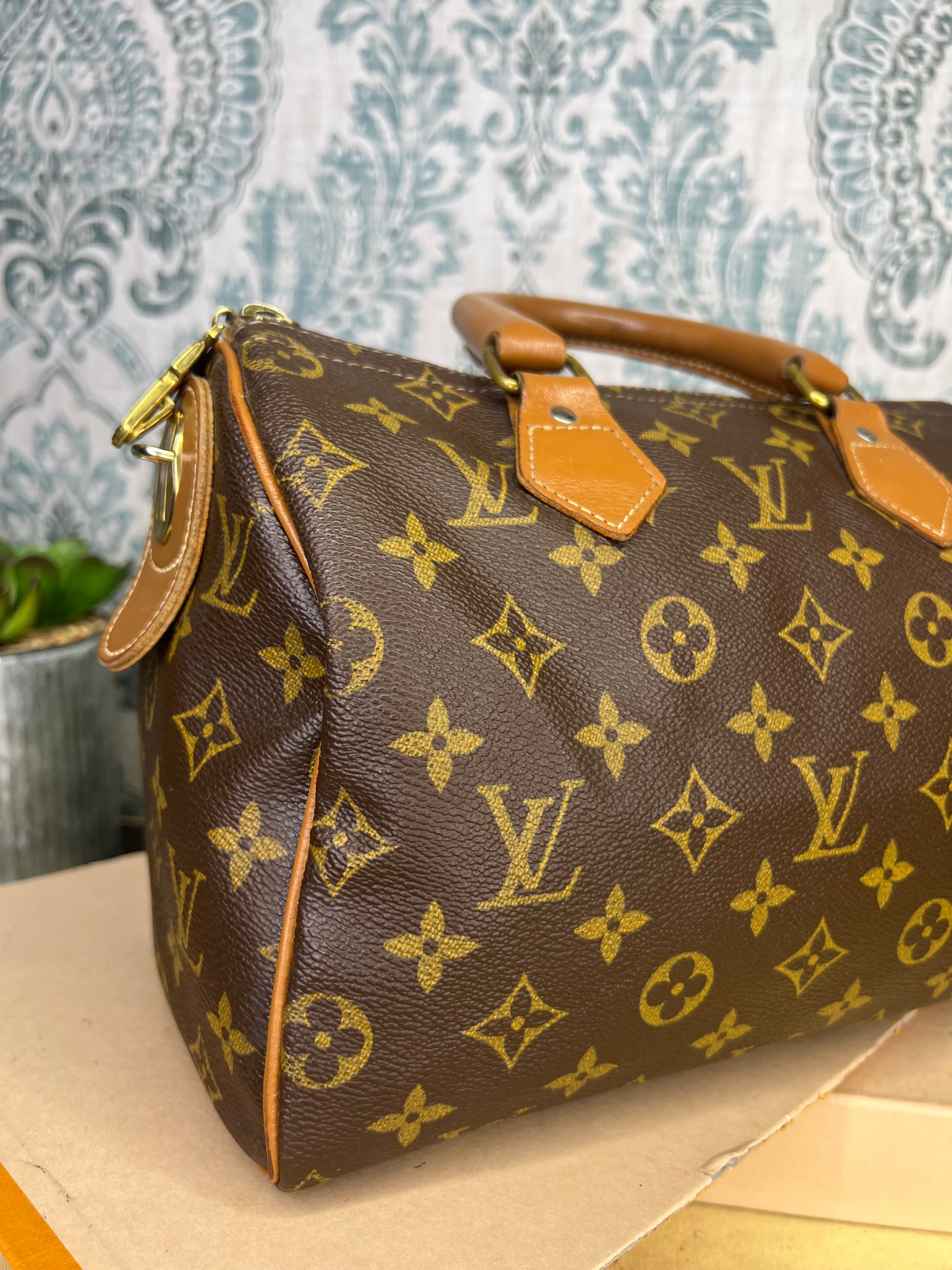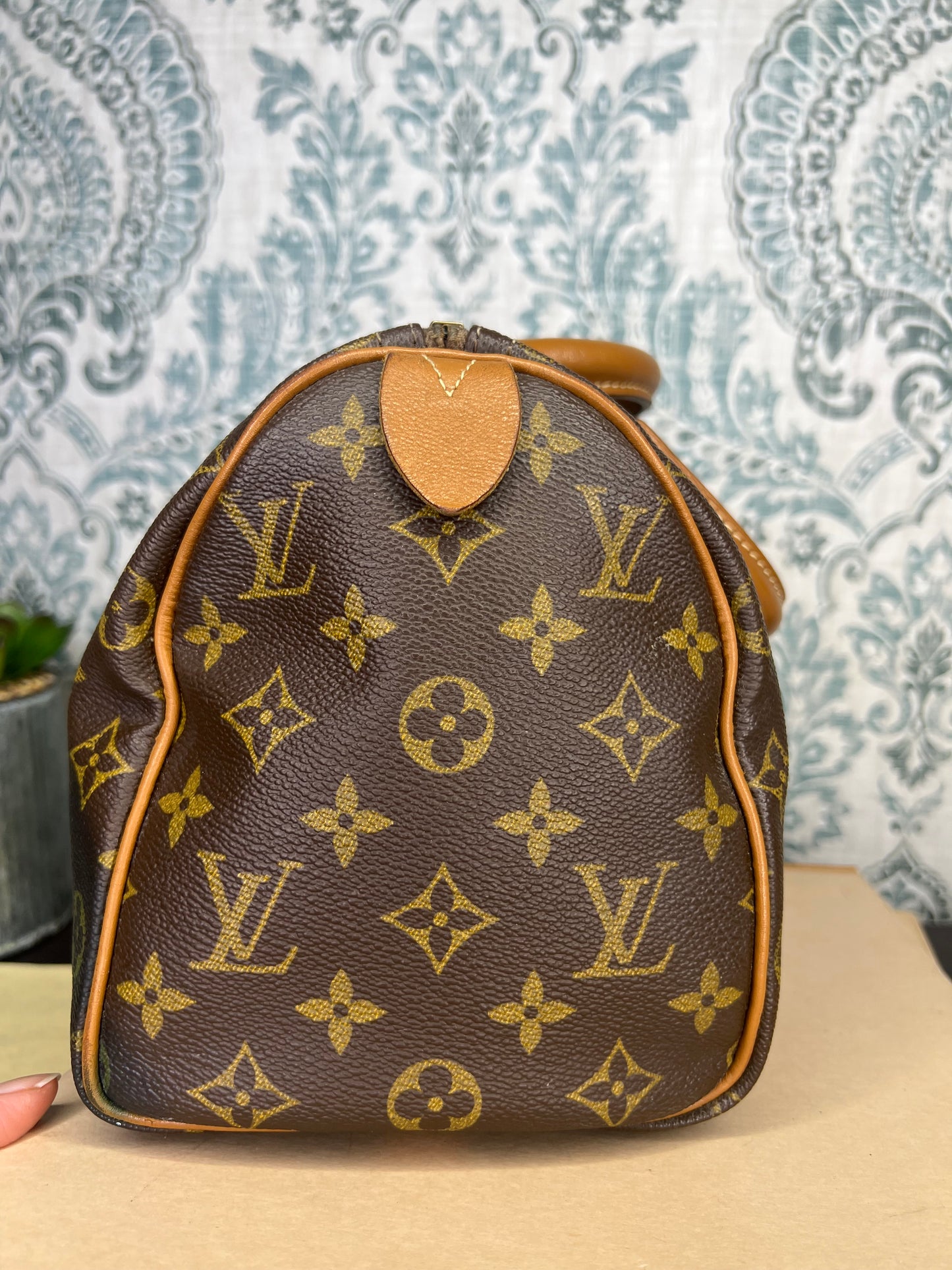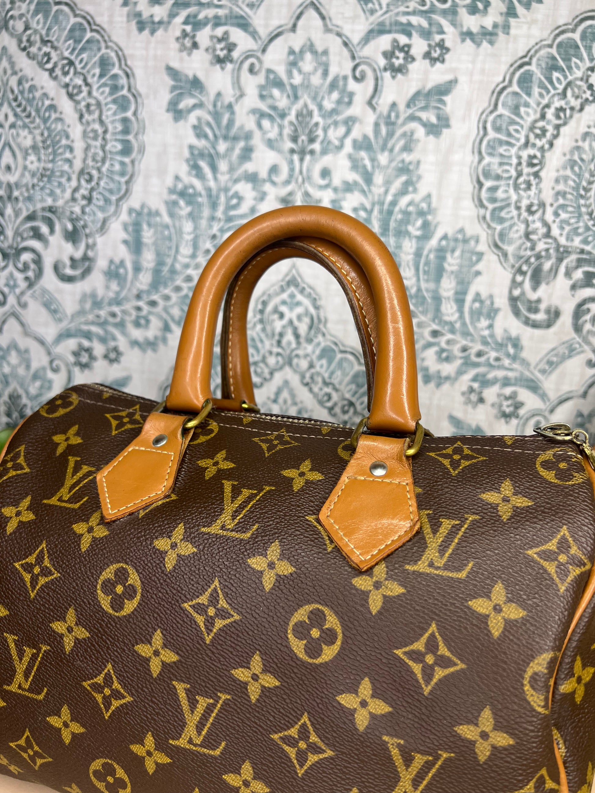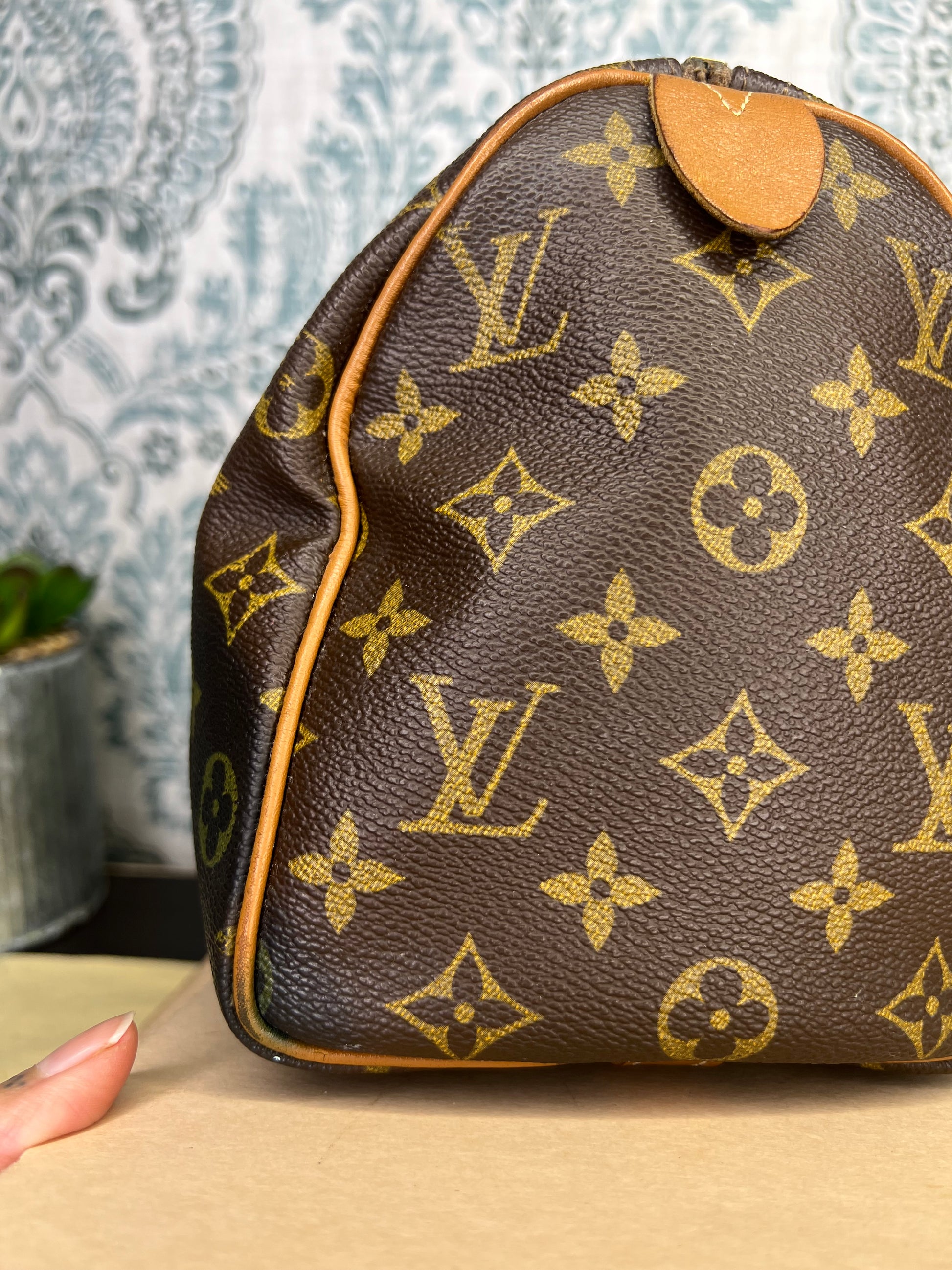 🌸 Canvas is in great shape and crack free. Nice and thick vintage canvas. Monogram is bright and clear, only minor amount of speckled fading but overall very bright and clear. There is an ink stains towards the base at one corner of the bag