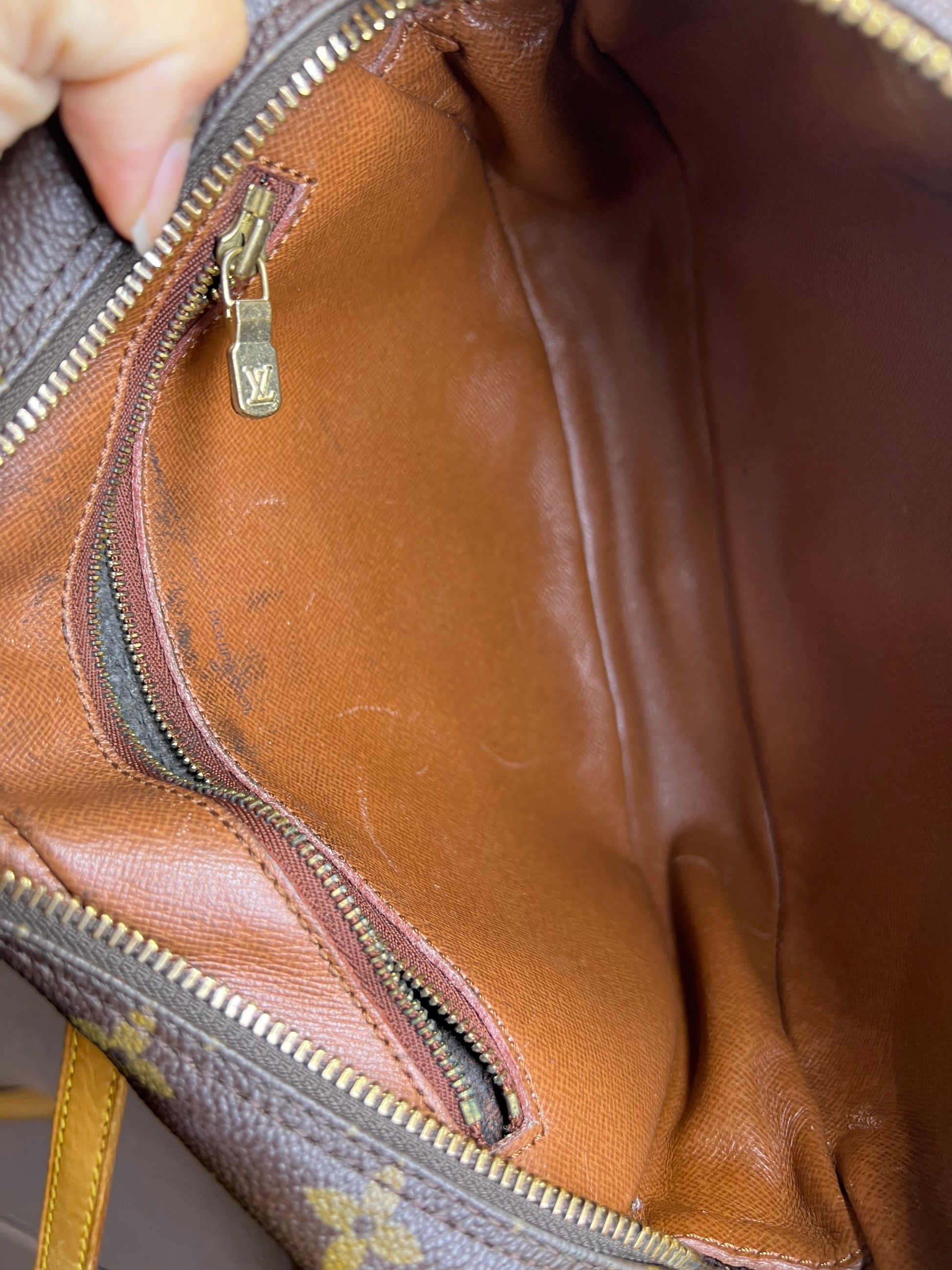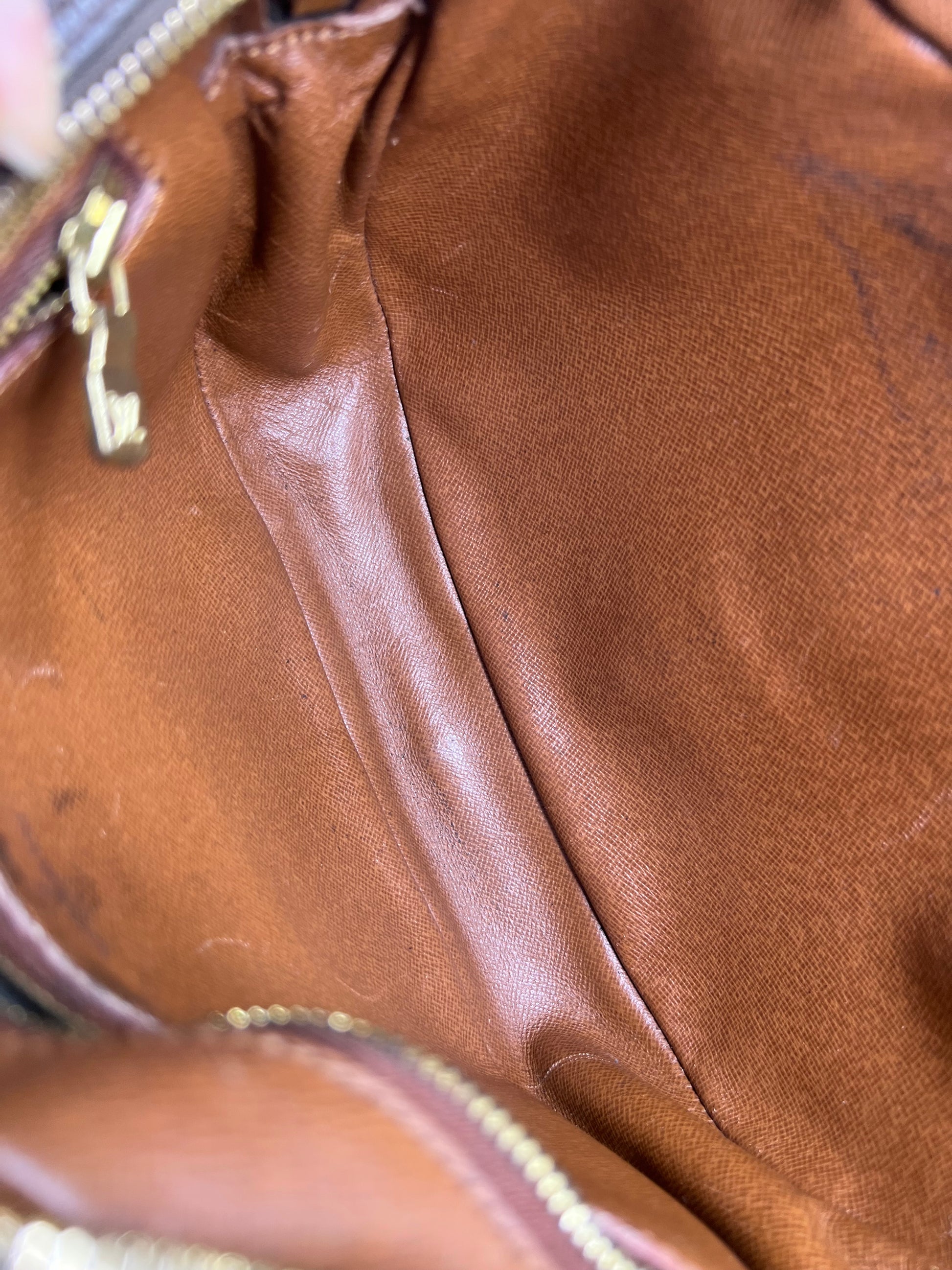 πΈ Interior has scuffs and stains, but is usable. Interior zipped pocket and exterior front/back pocket have peeled lining. These can be relined or cleaned out. Main compartment has no issues with use