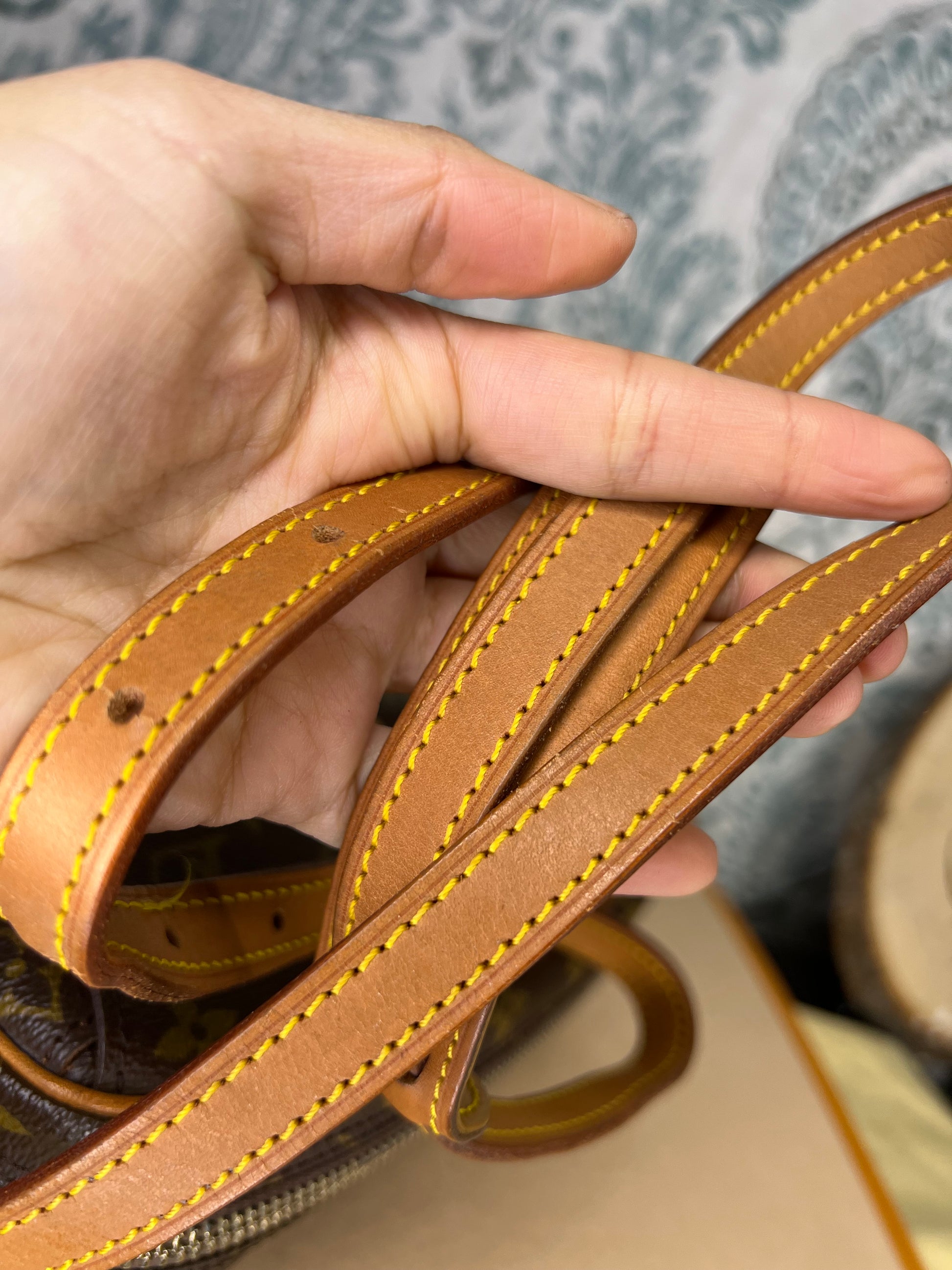 🌸 Strap has wrinkling and a few surface cracks, but is in strong shape. Minor leather scuffs and marks present. Piping is intact. Buckle piece has a bit of surface cracking.