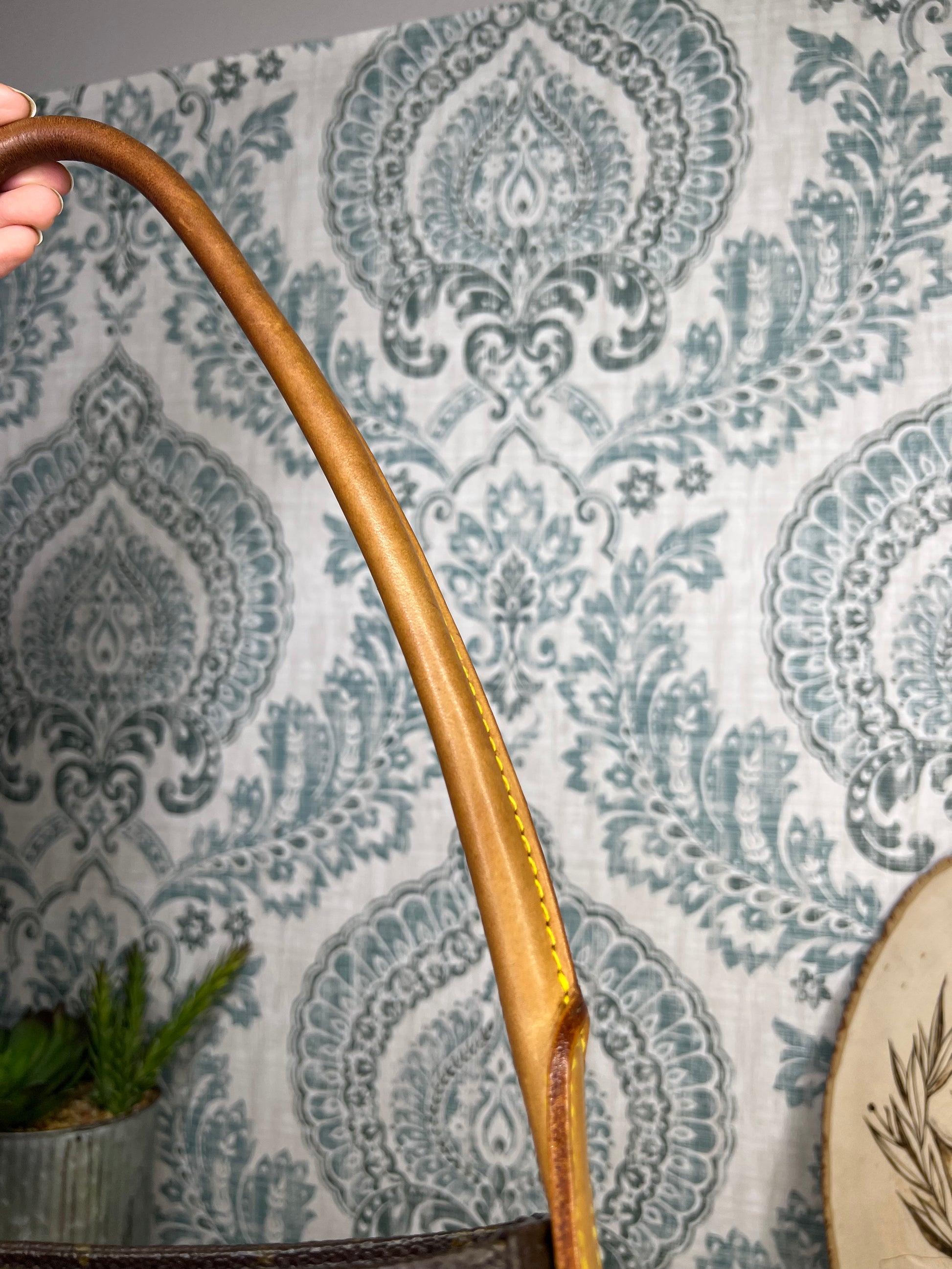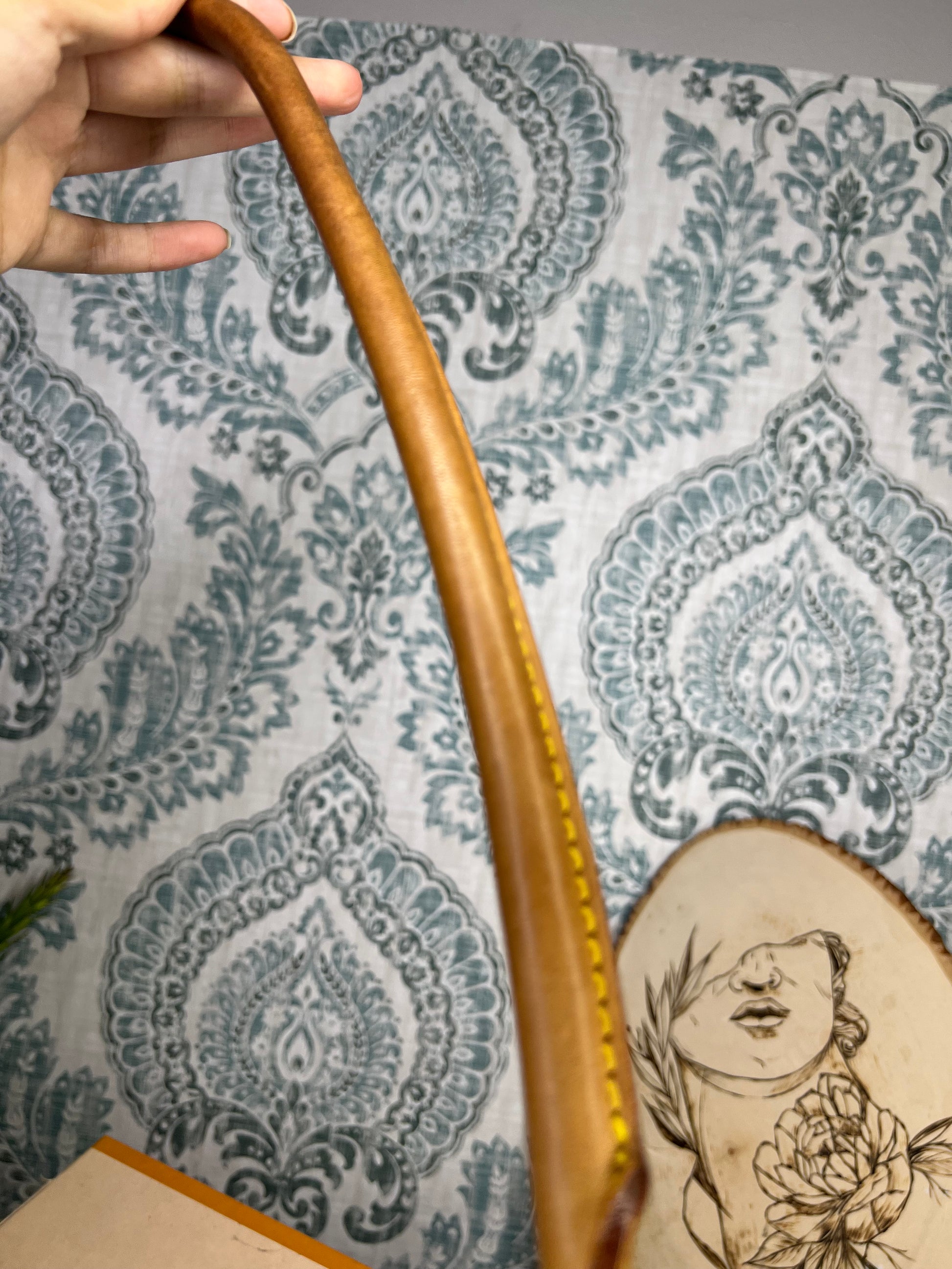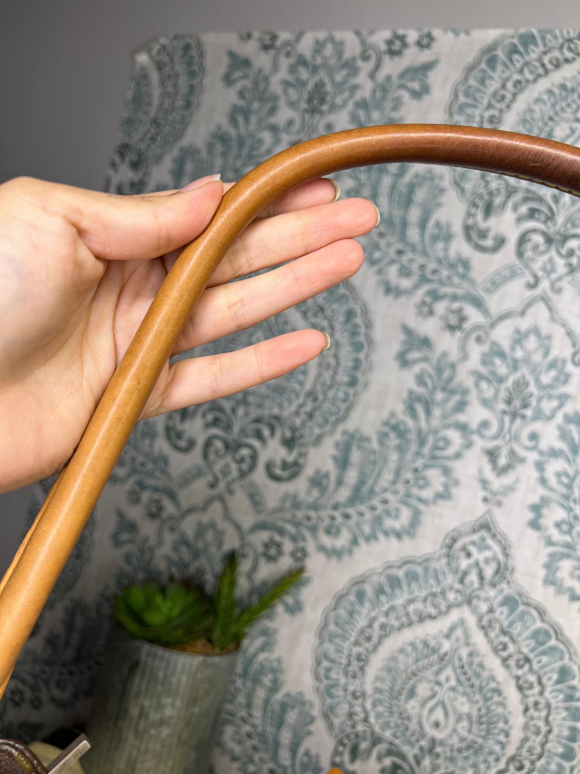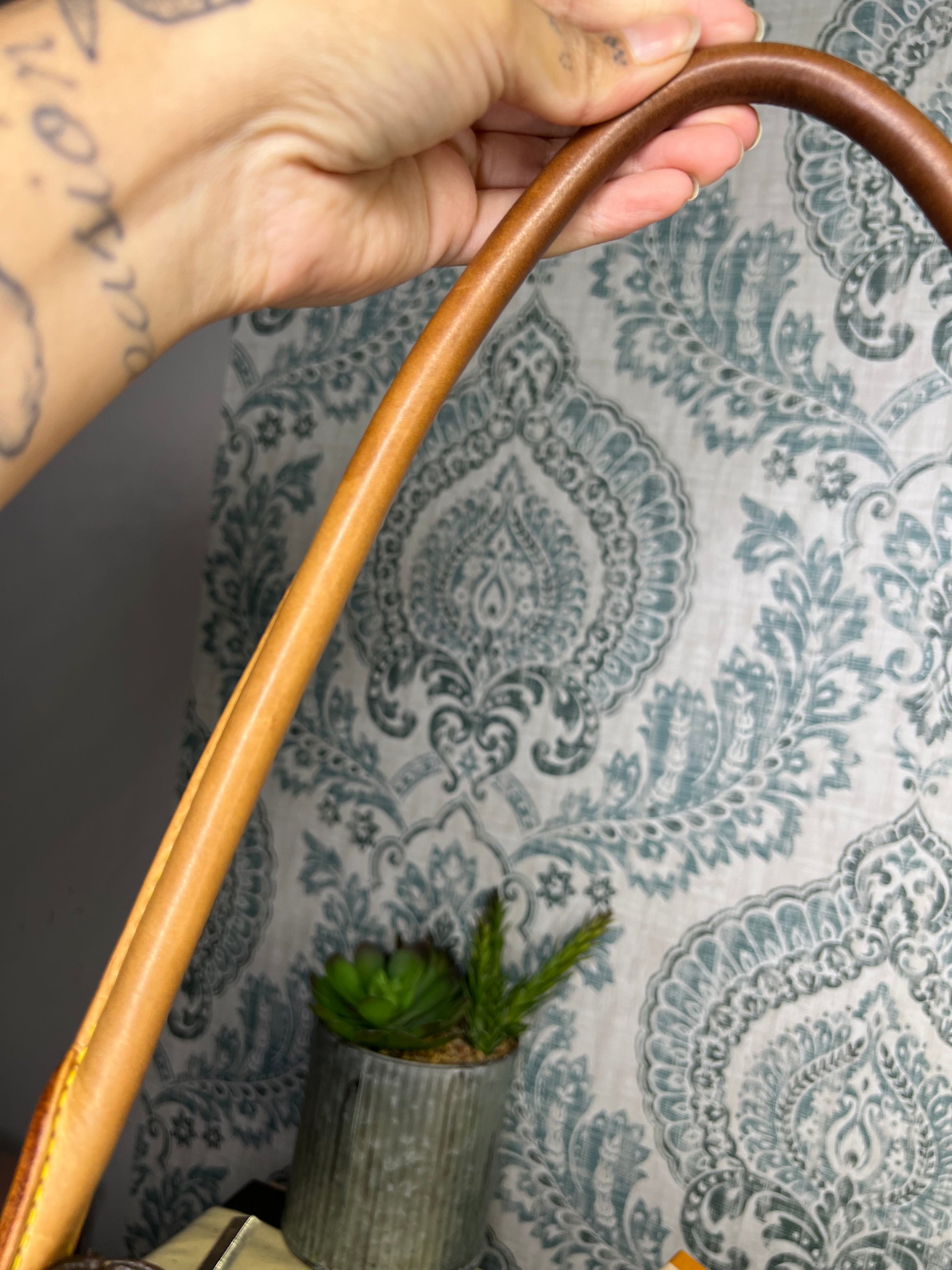 🌸 Shoulder strap has darkened towards the top of the strap, but is in strong shape. It is flexible and does not have any cracking, only wrinkles. Faint water spots present.