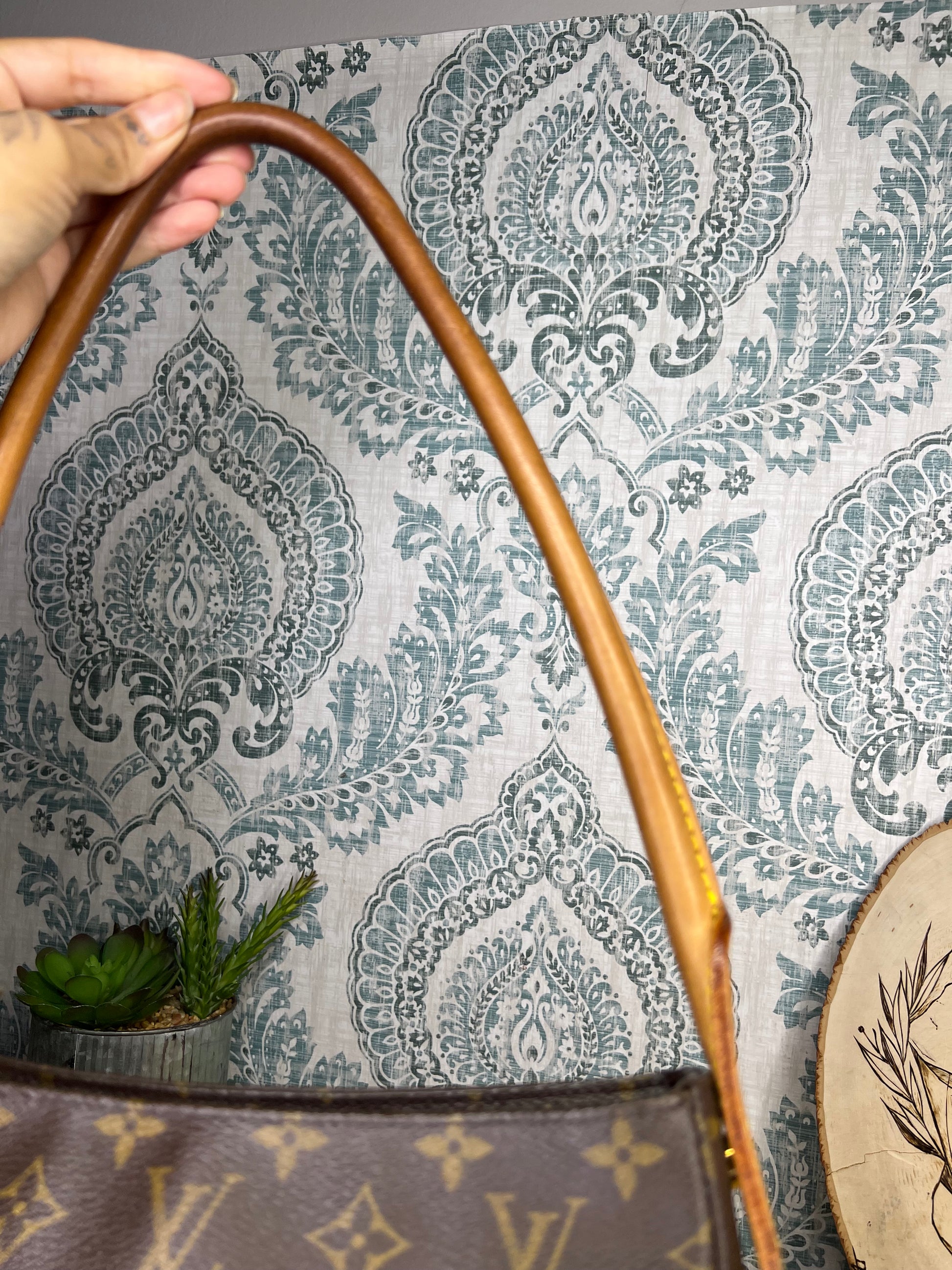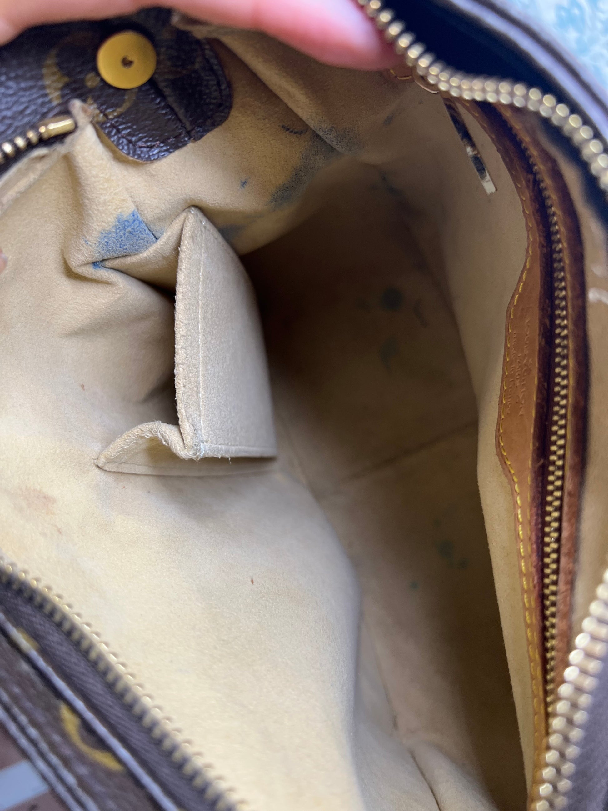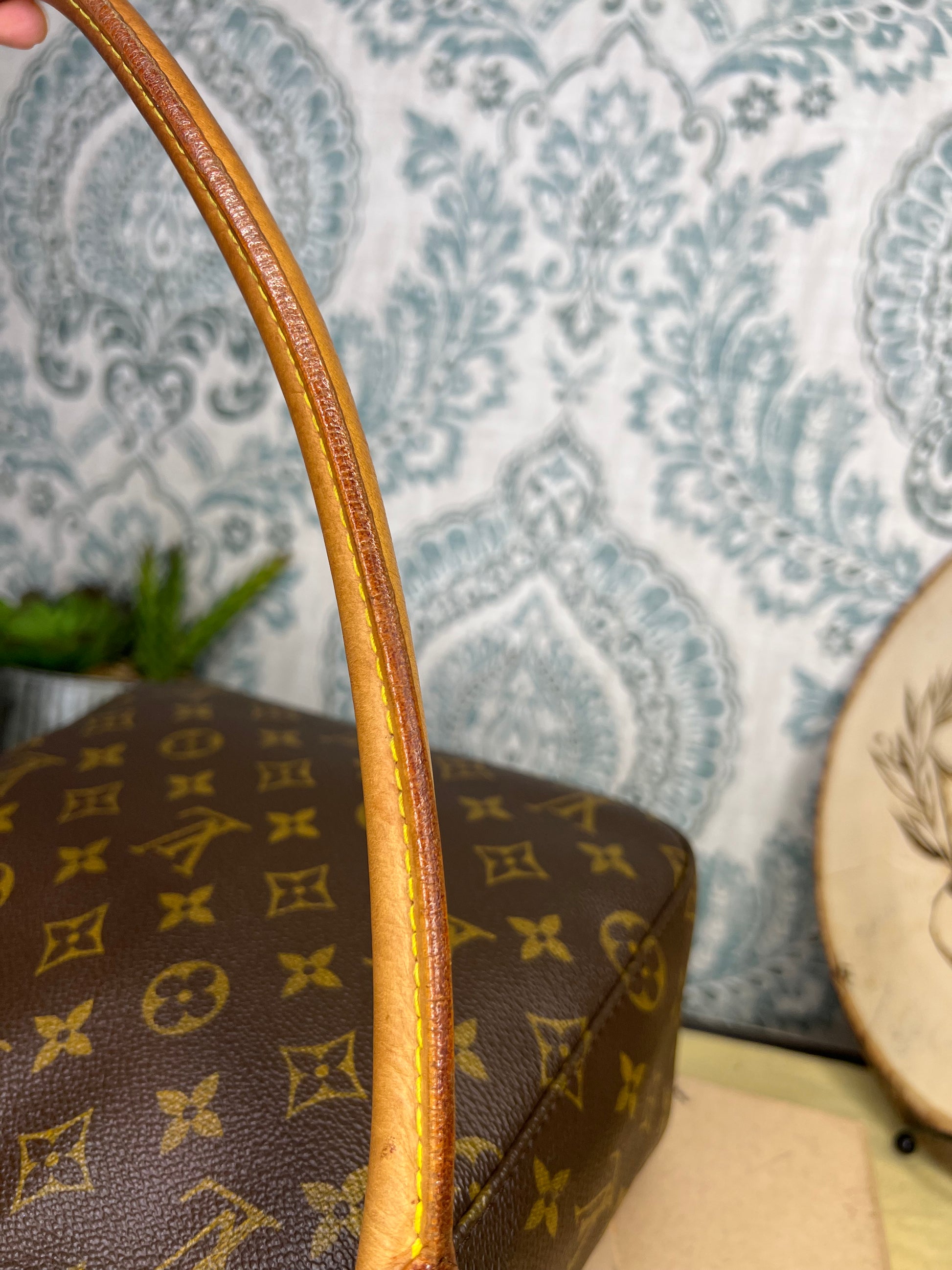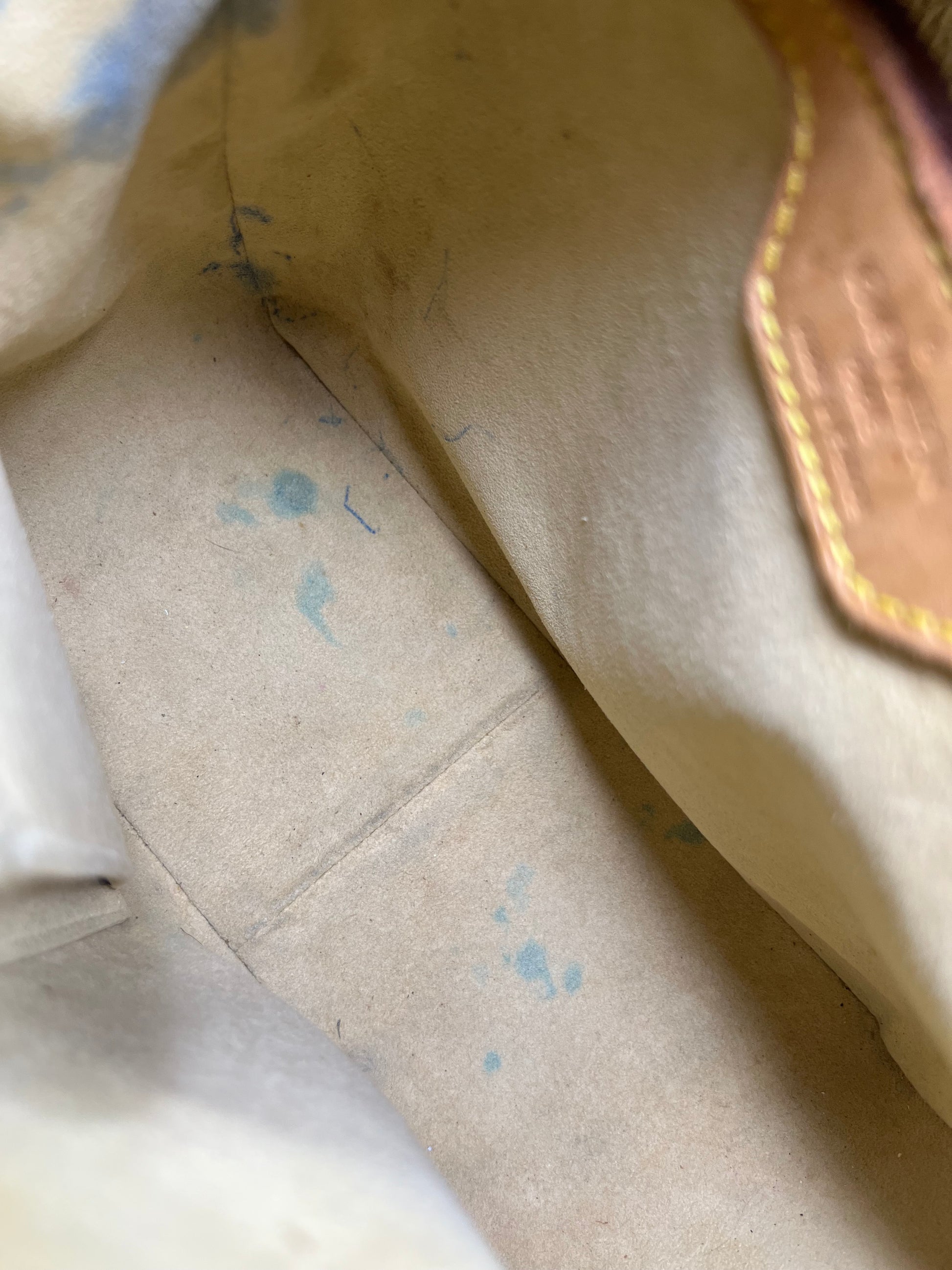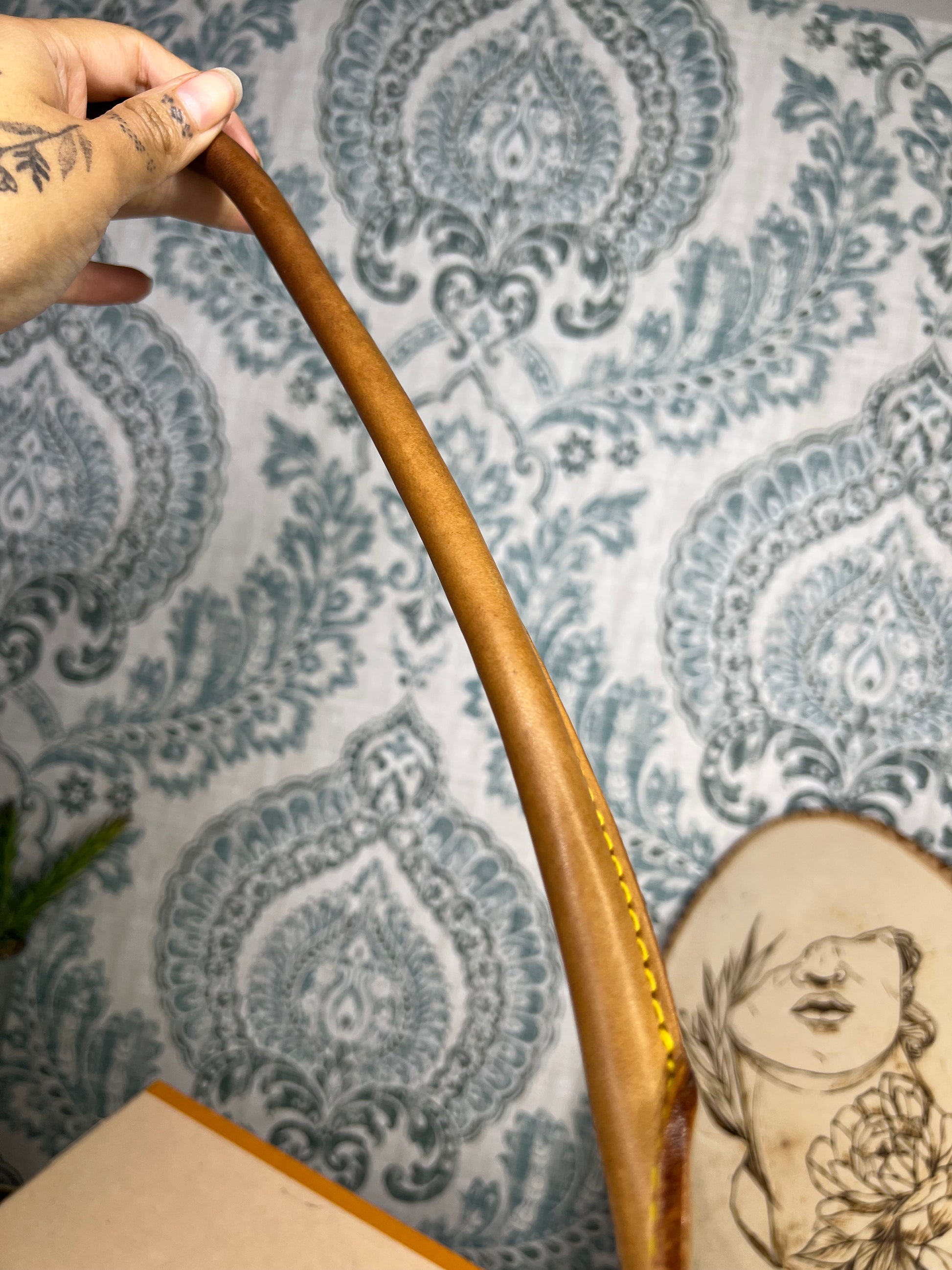 🌸 Shoulder strap has darkened towards the top of the strap, but is in strong shape. It is flexible and does not have any cracking, only wrinkles. Faint water spots present.