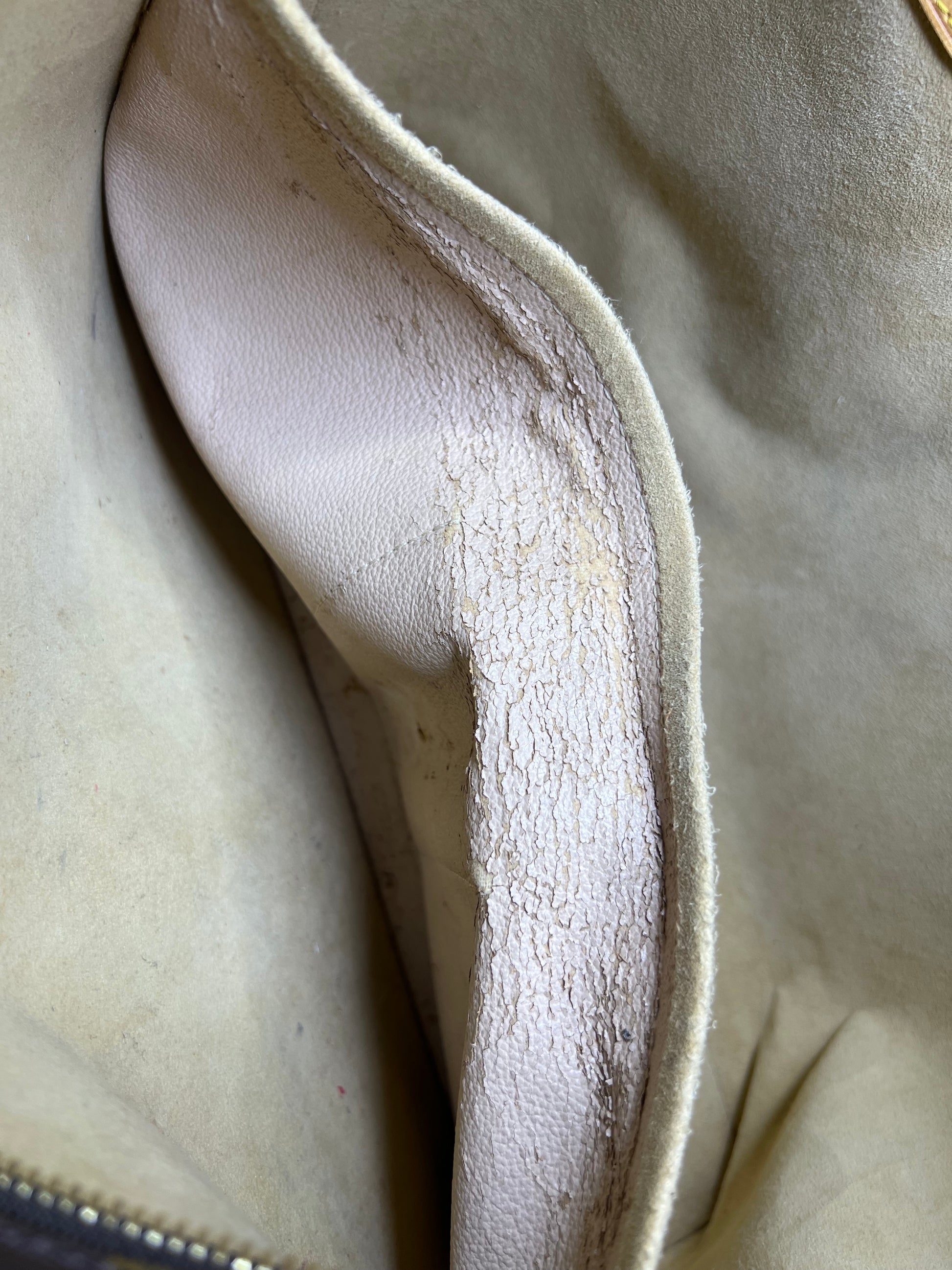 πΈ Interior has signs of use. Staining present. Side pocket linings are peeling and tacky. Main compartment is usable. There is fraying in the lining. An insert can be used to cover up these flaws.