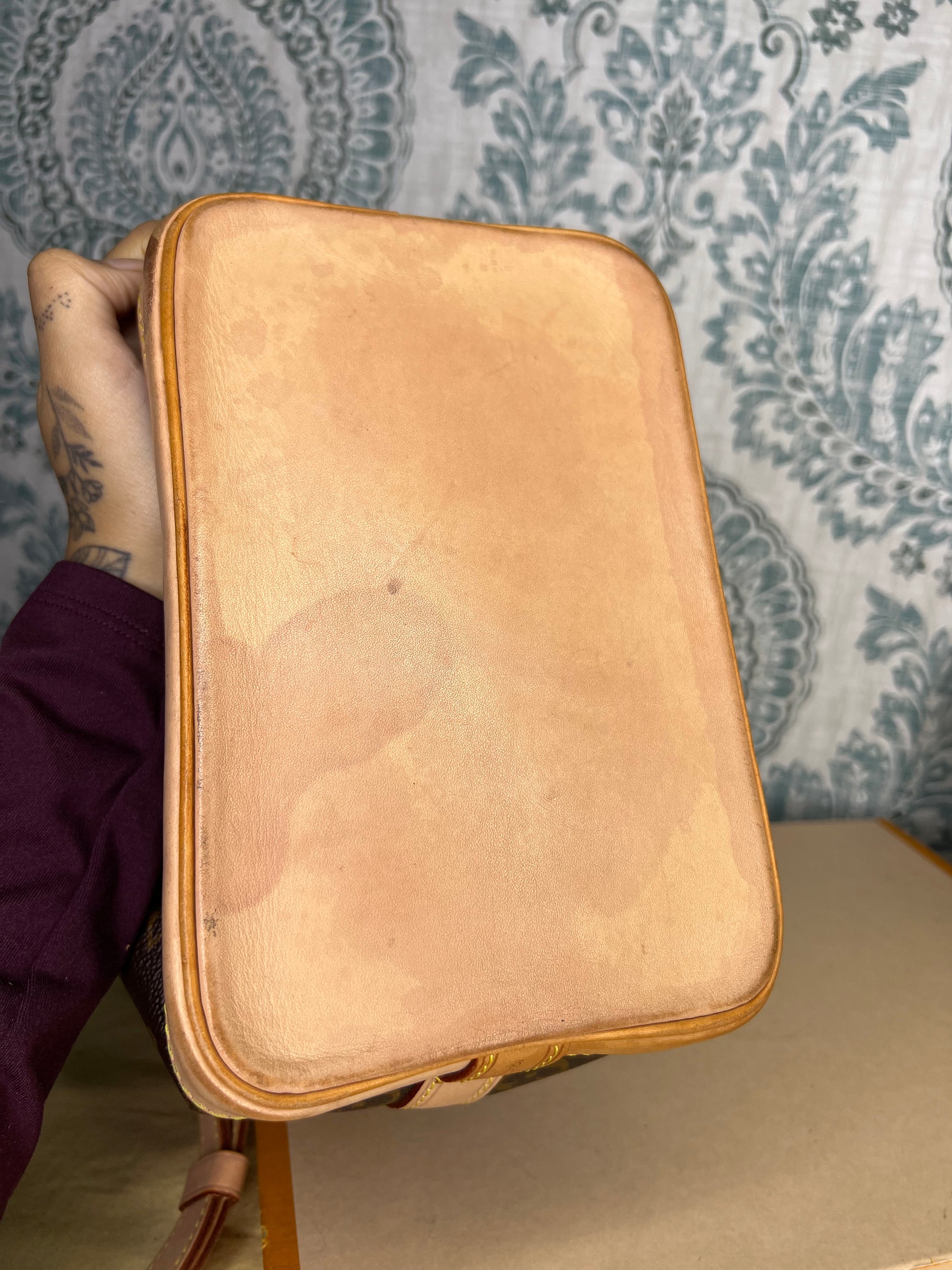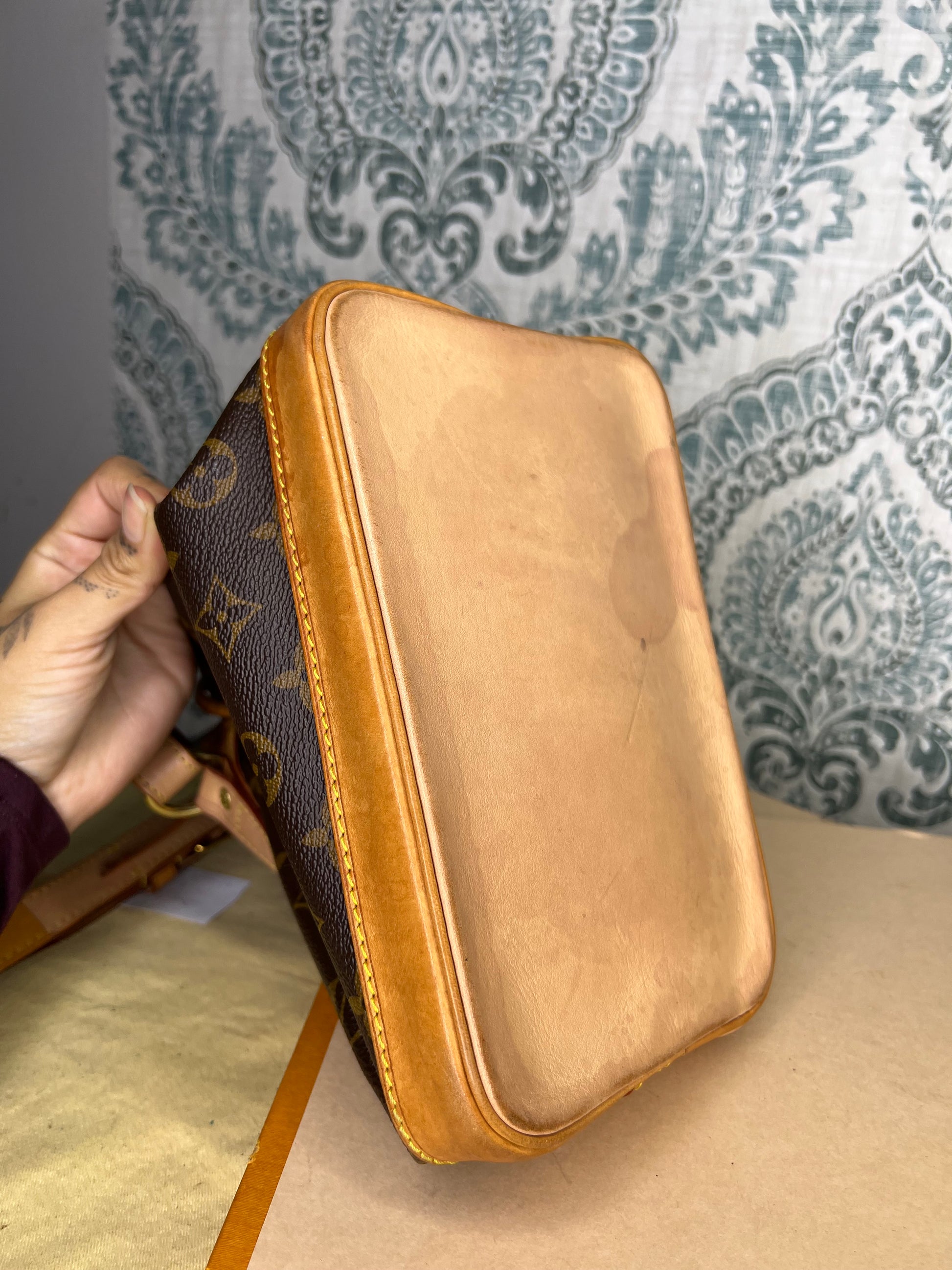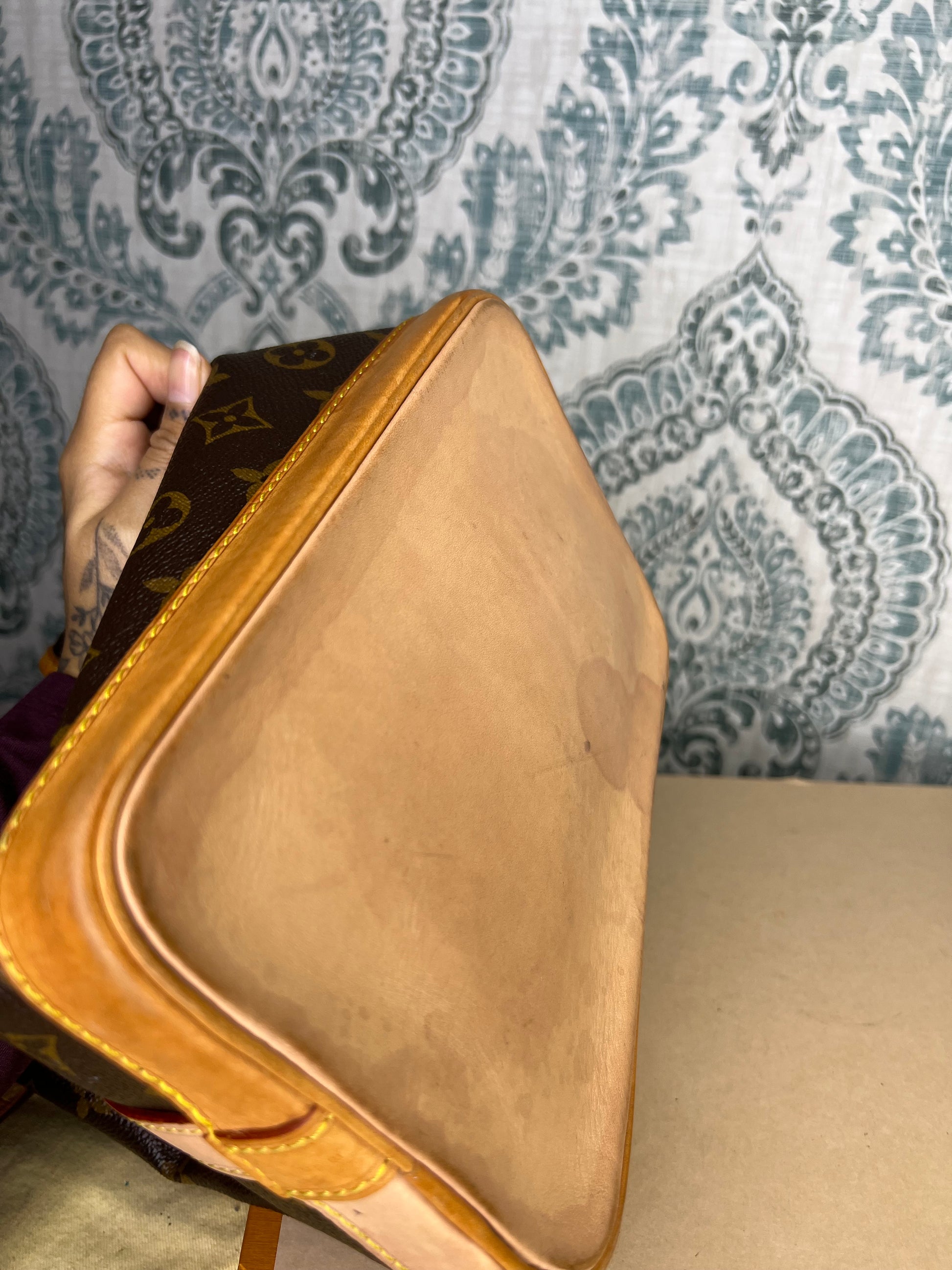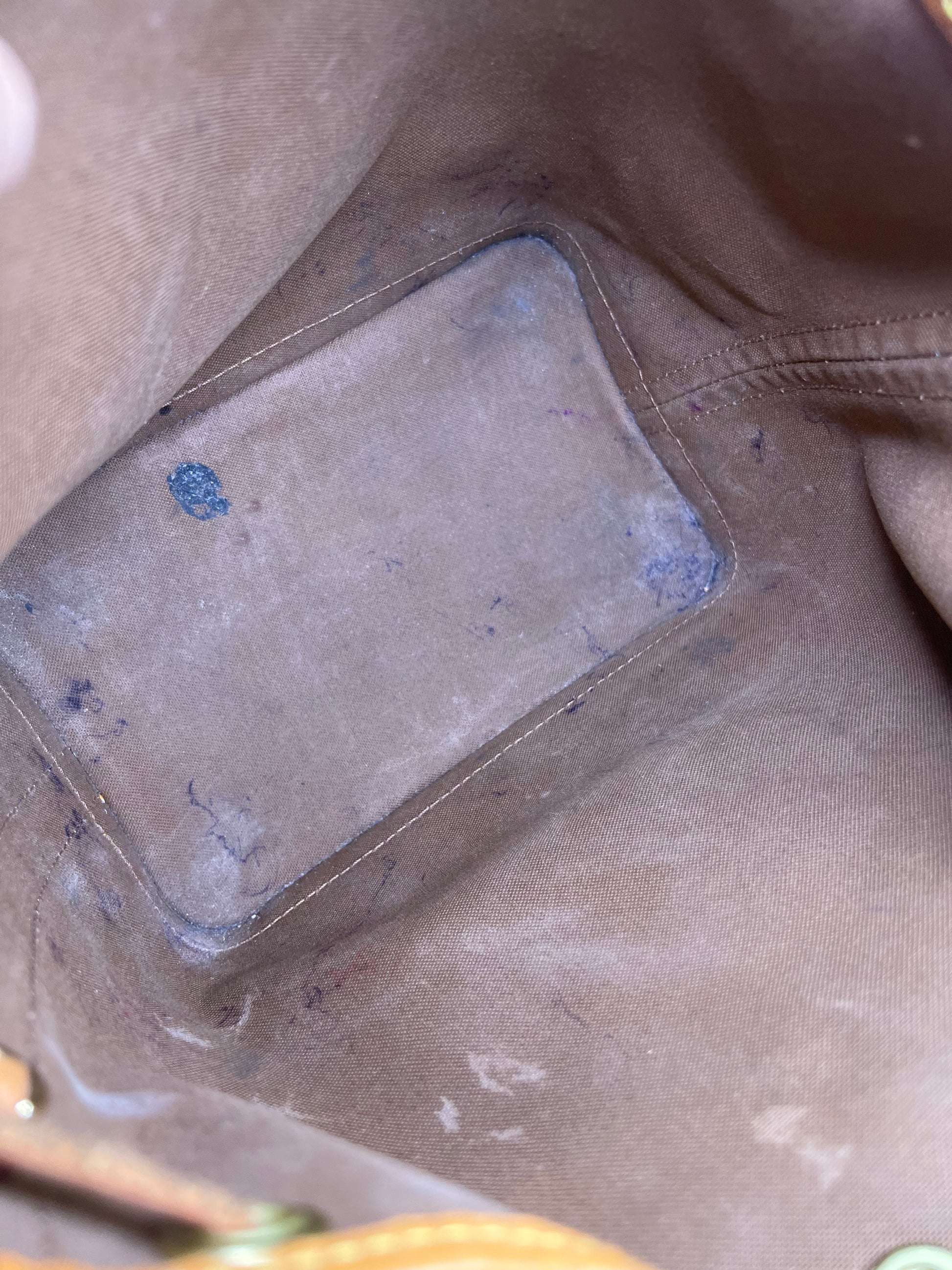 šø Leather does have different shades of patina through out. Some of the leather has a honey patina while other parts have a lighter color. Chaps are strong. Drawstring has wear, but is intact. Side bands look good. Trim is intact. Vachetta does watermarks and scuffs, but is sturdy. Strap is crack free and strong.