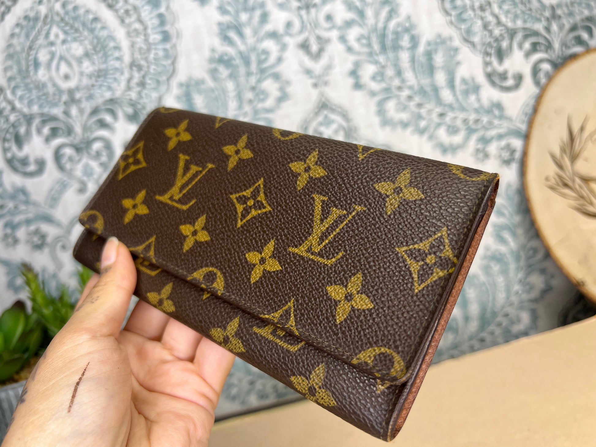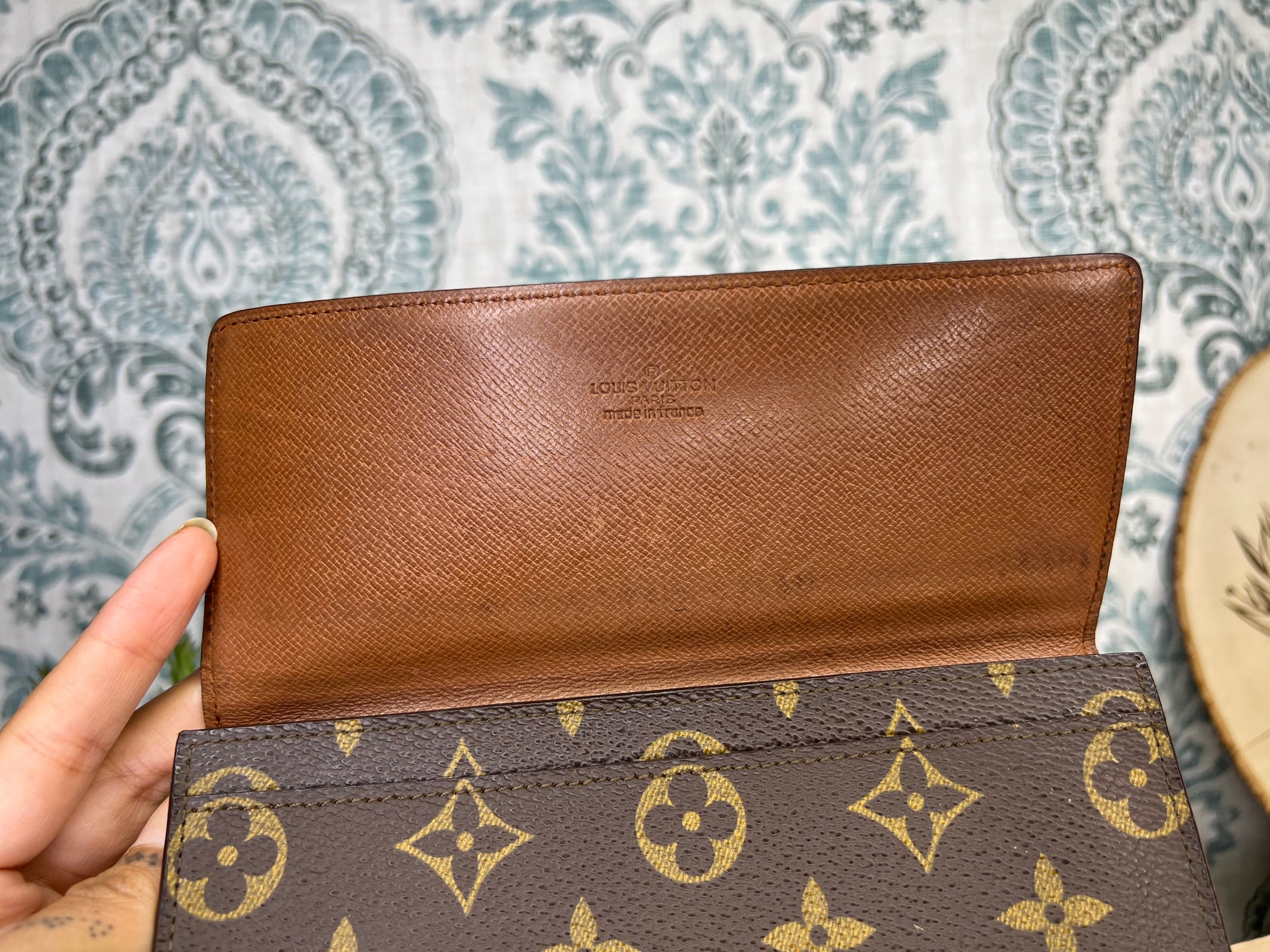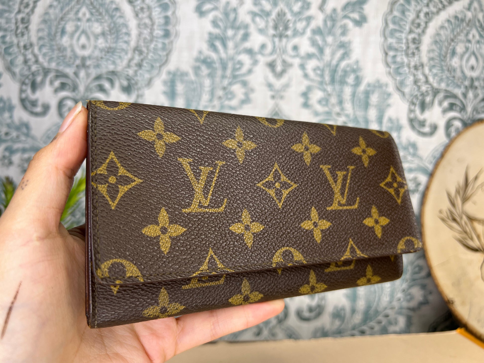 šø Monogram is bright and clear, only a small speckled amount of fading present. Canvas has a teeny tiny amount of cracking towards top edge corners of the wallet. Popped stitching present, but wallet is sturdy and intact. There is glazing wear present