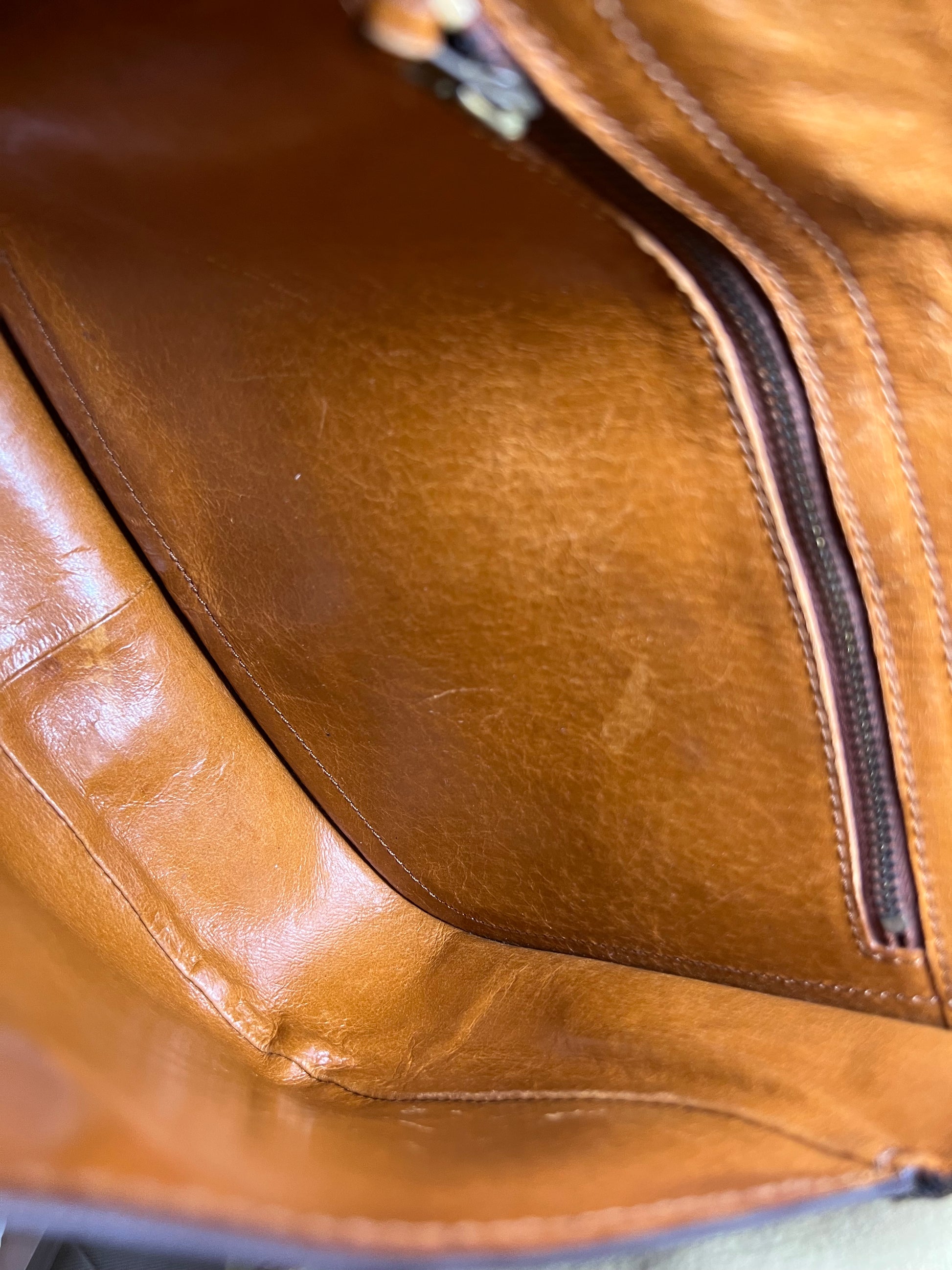 šø This is a vintage model. There is no back pocket. Interior pockets are both clean. This model does not have any of the lining that is prone to stickiness or peeling.