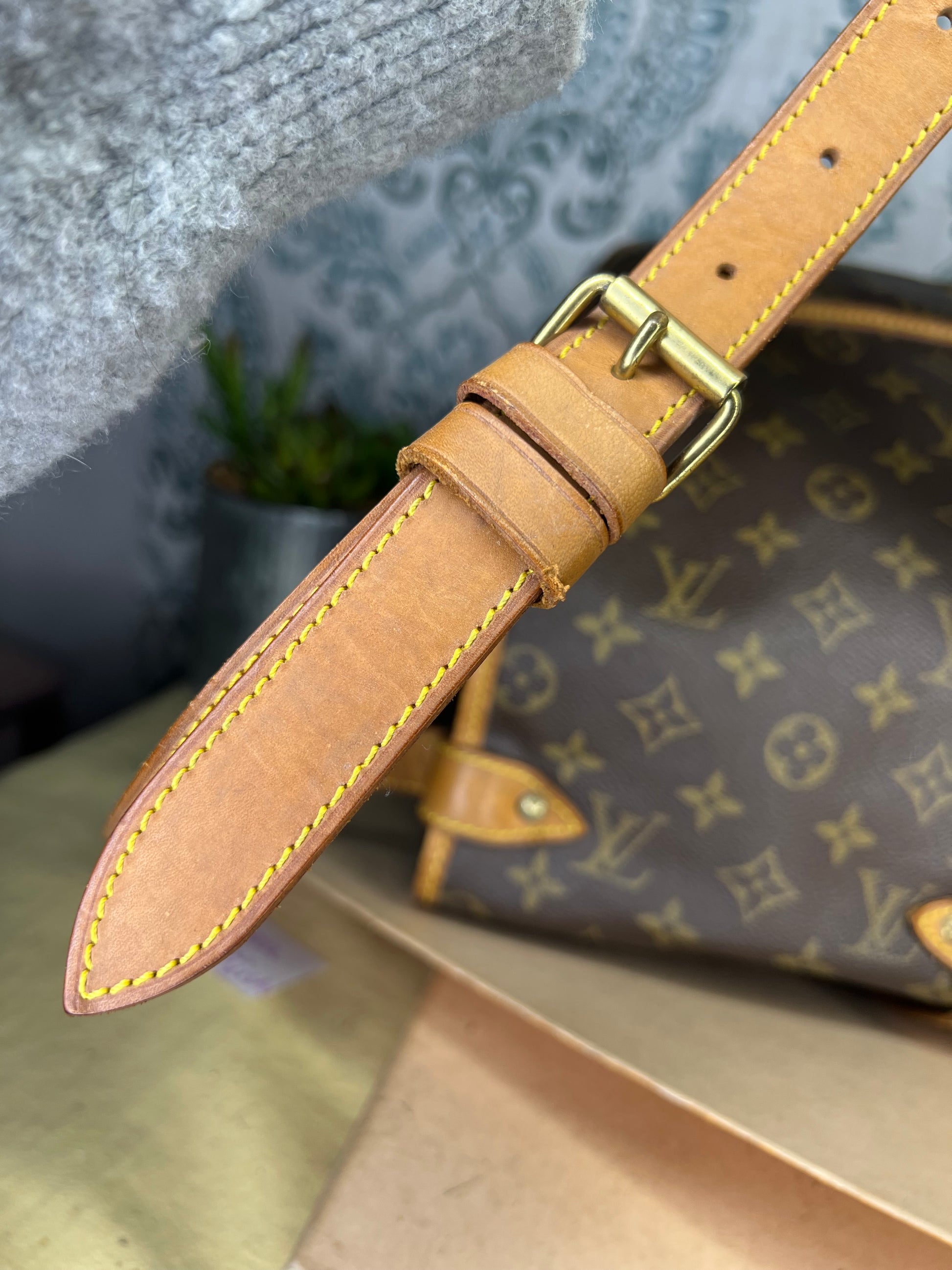 πΈ The strap does have minor surface cracking present cracking present but is overall strong. Buckle pieces have minor surface wear. Trim and piping are intact. Faint marks and spots present on leather