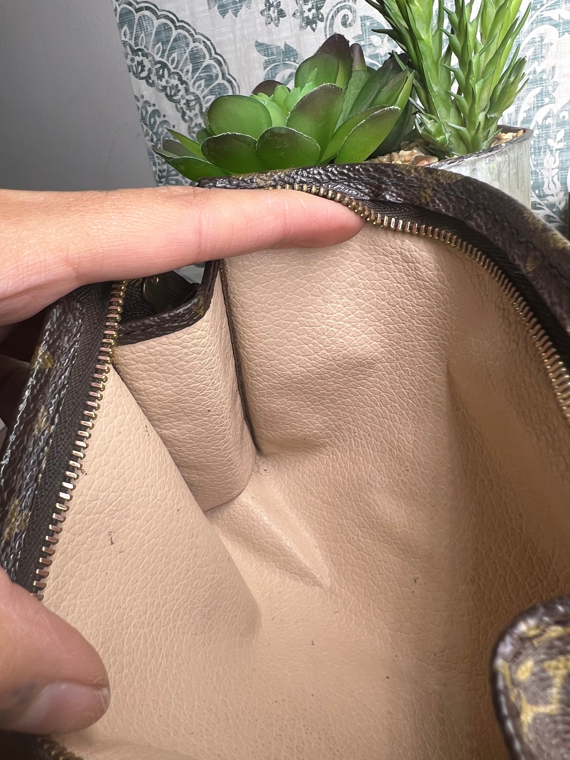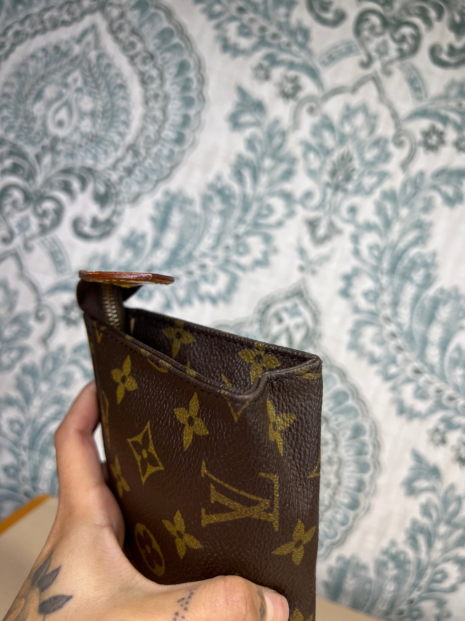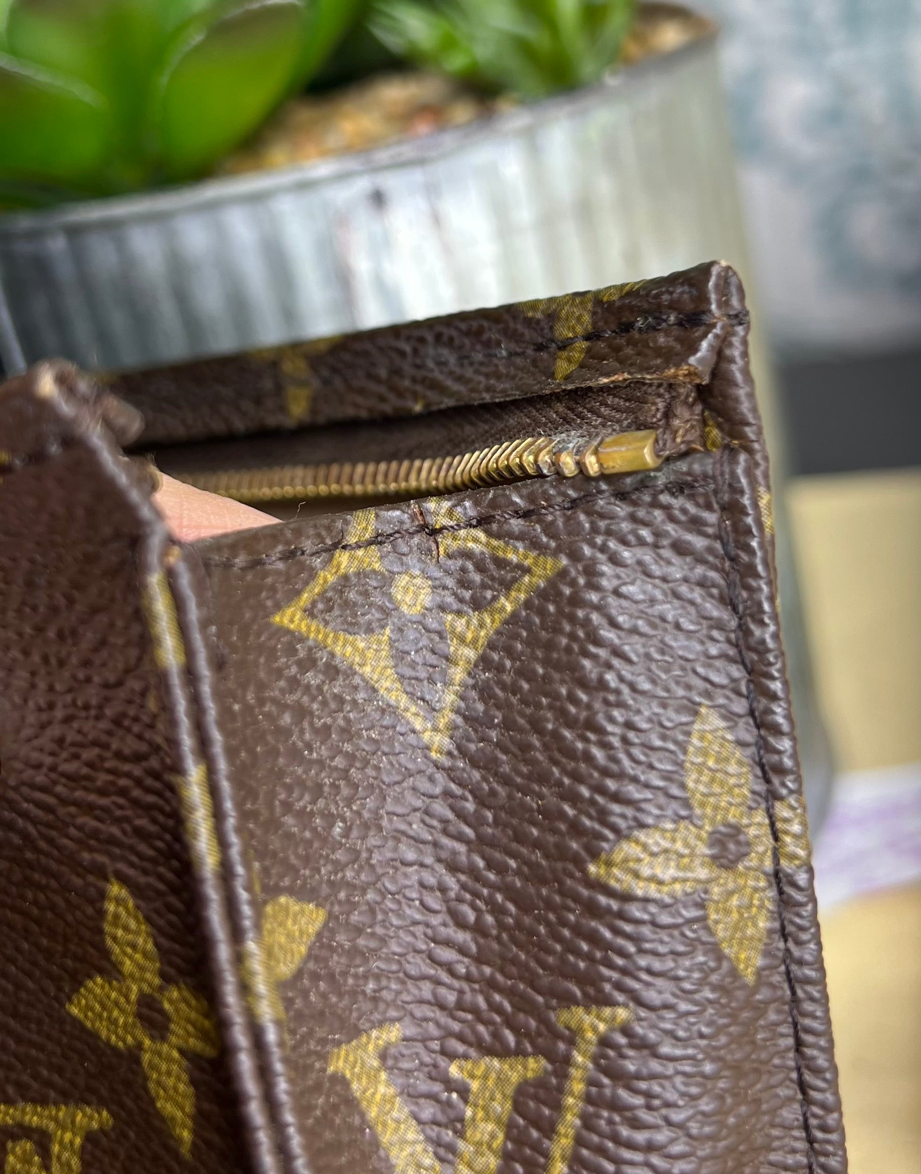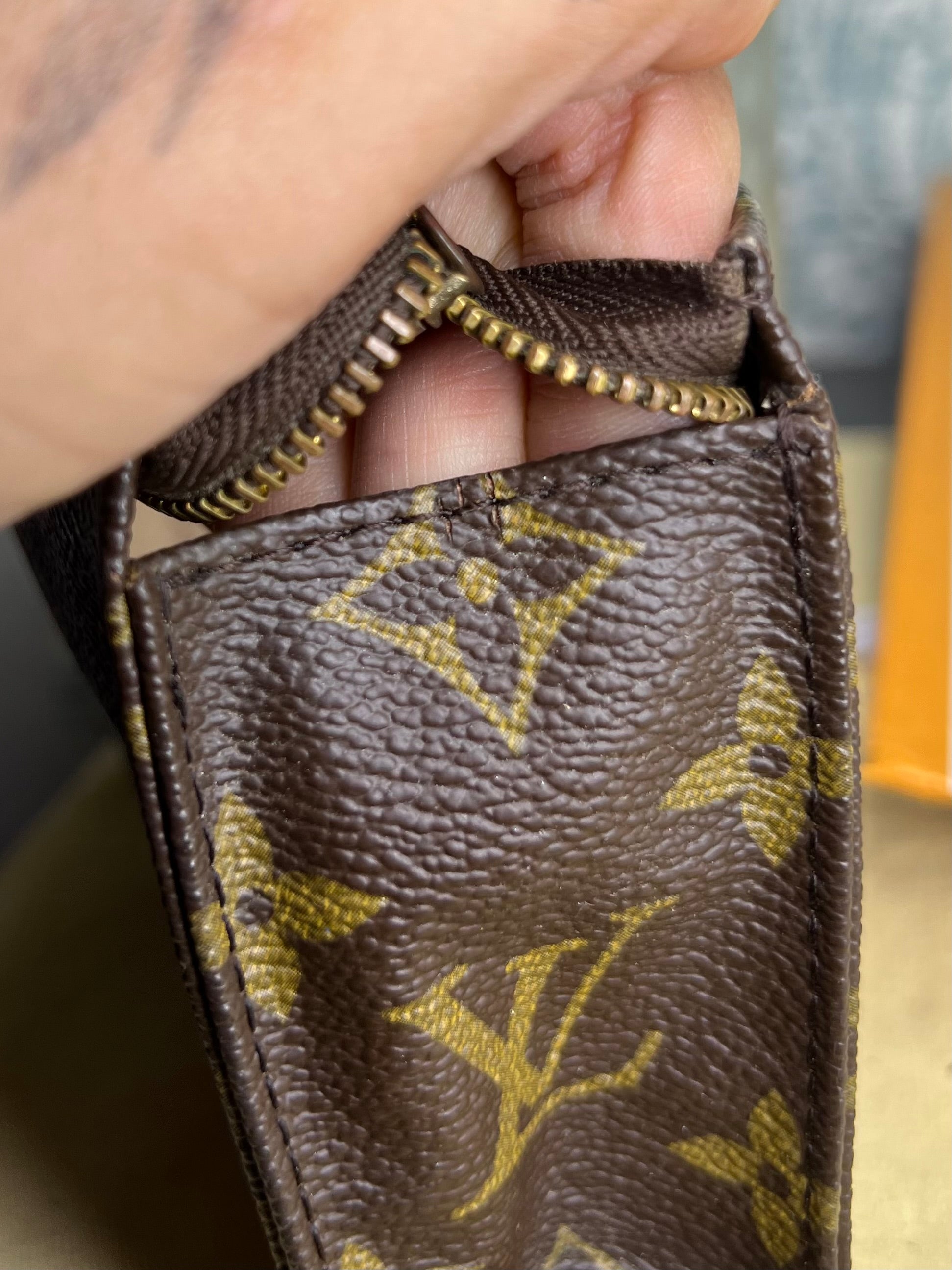 🌸 Only very small hidden hairline cracks at folds of the pouch. Very minors at base corners. Canvas is in nice shape overall.