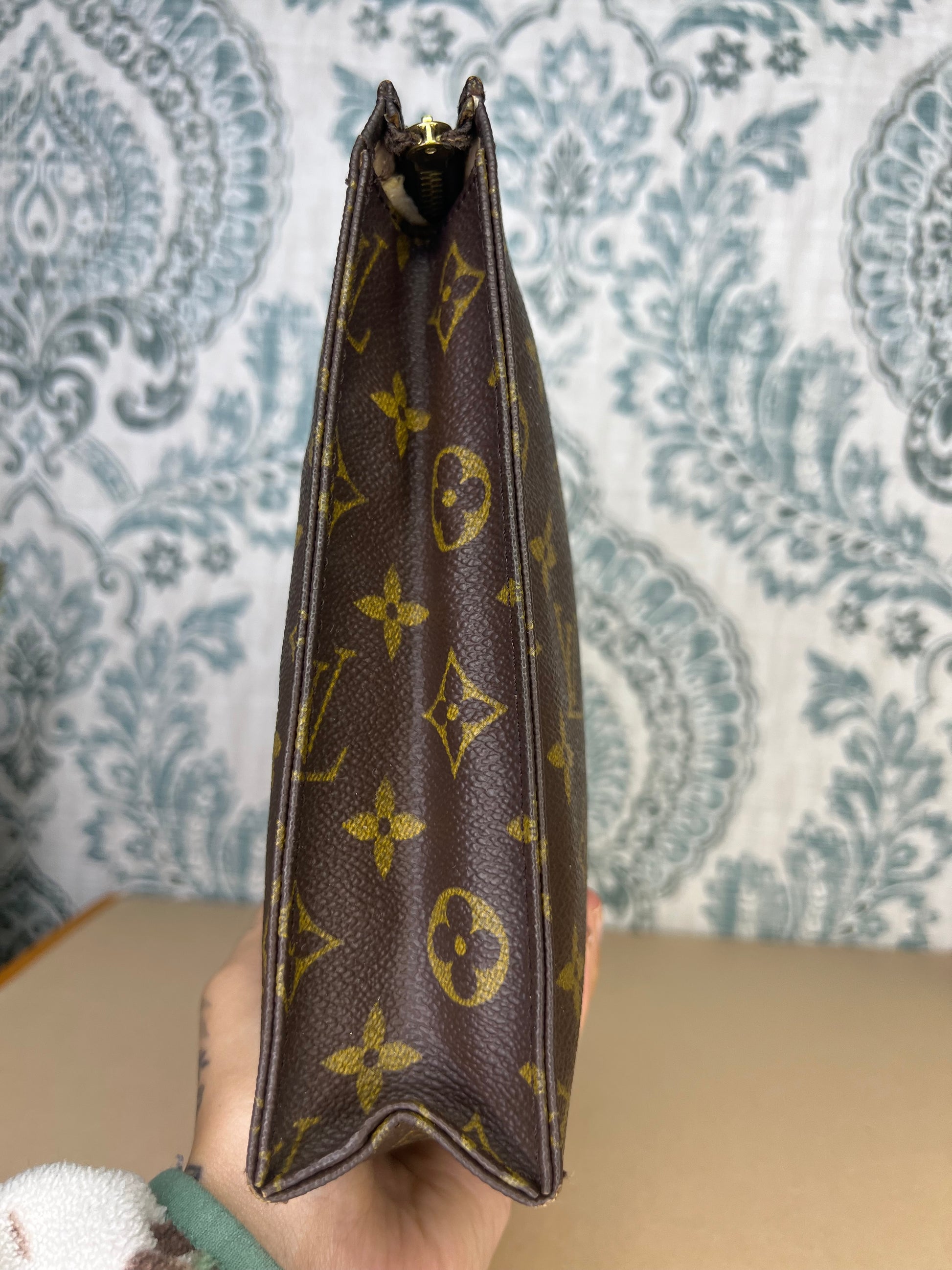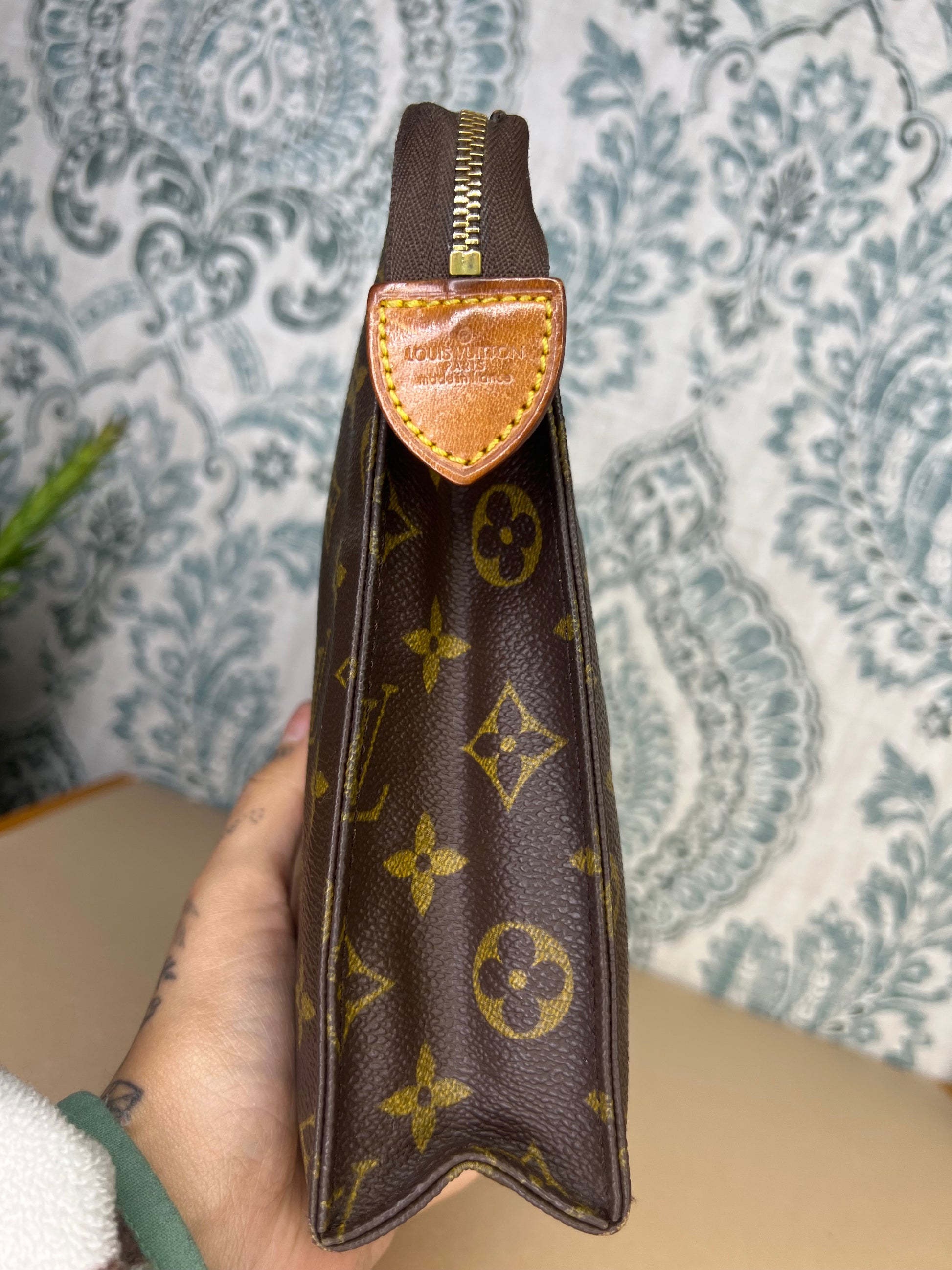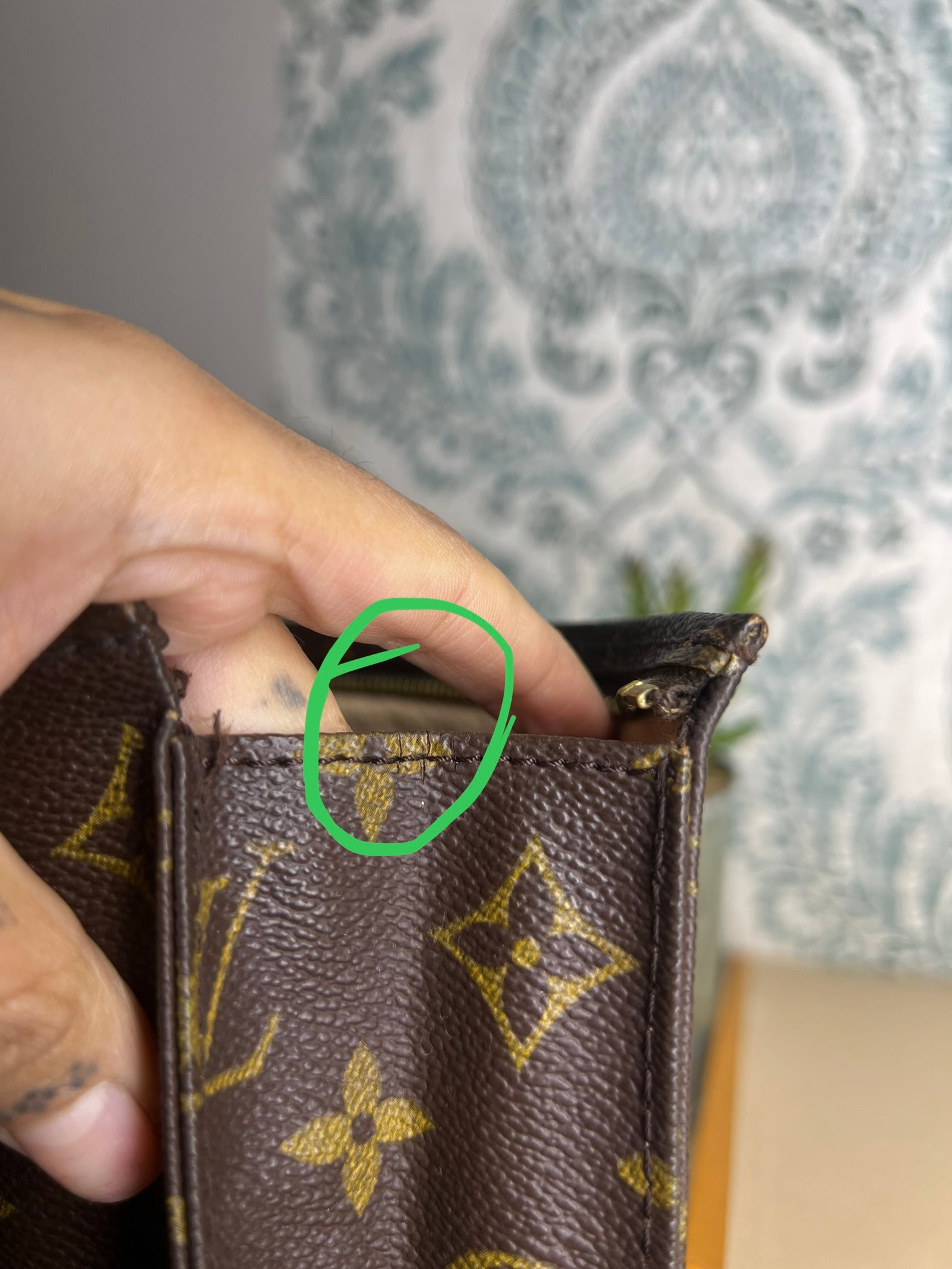 🌸 Canvas has minor chipping at base corners. There is also a tiny amount of hairline cracking hidden at top side folds of the pouch. This flaw is shown in the photos with the green circles. Canvas is overall in good shape. Monogram is bright and clear through out.