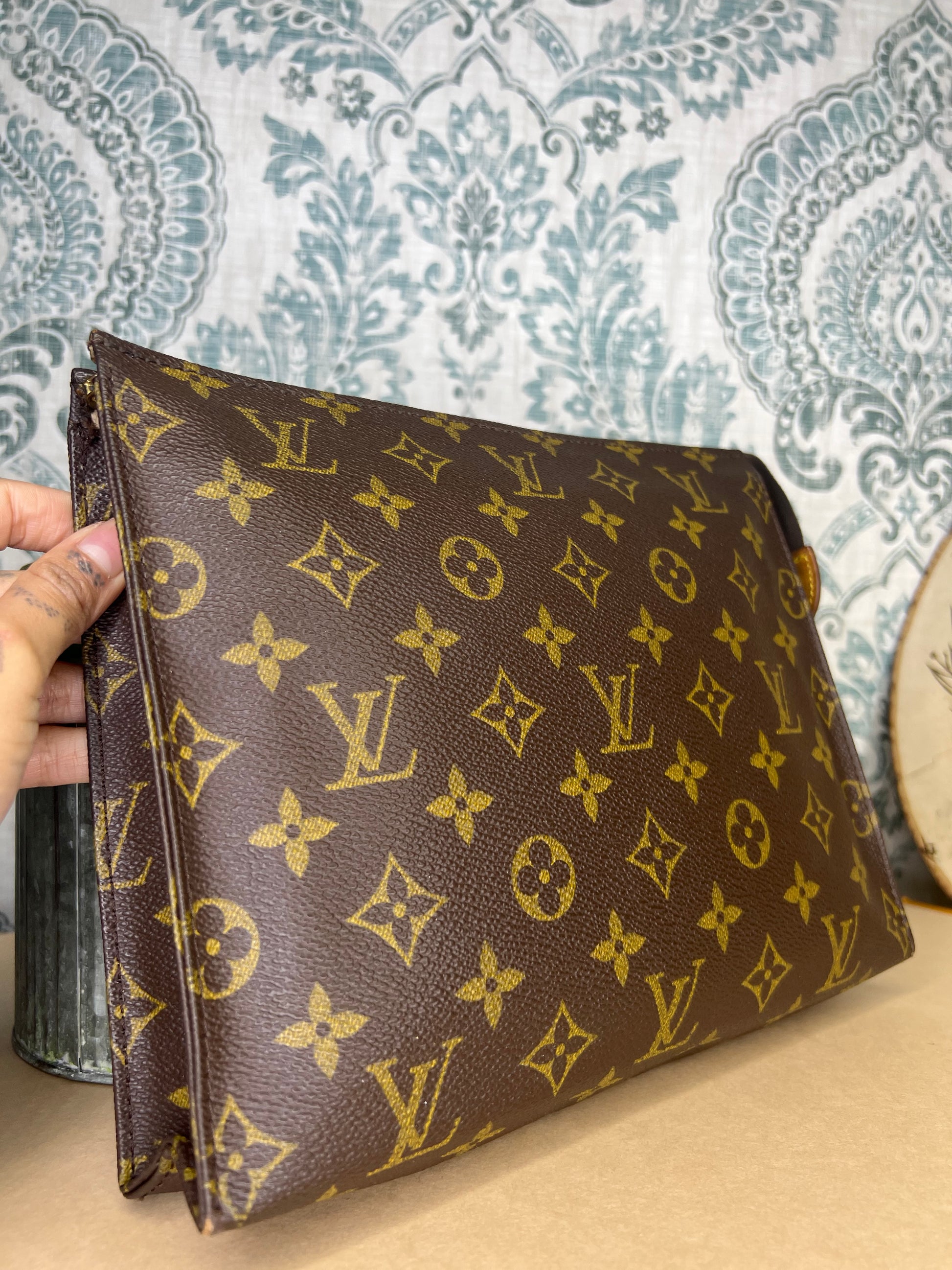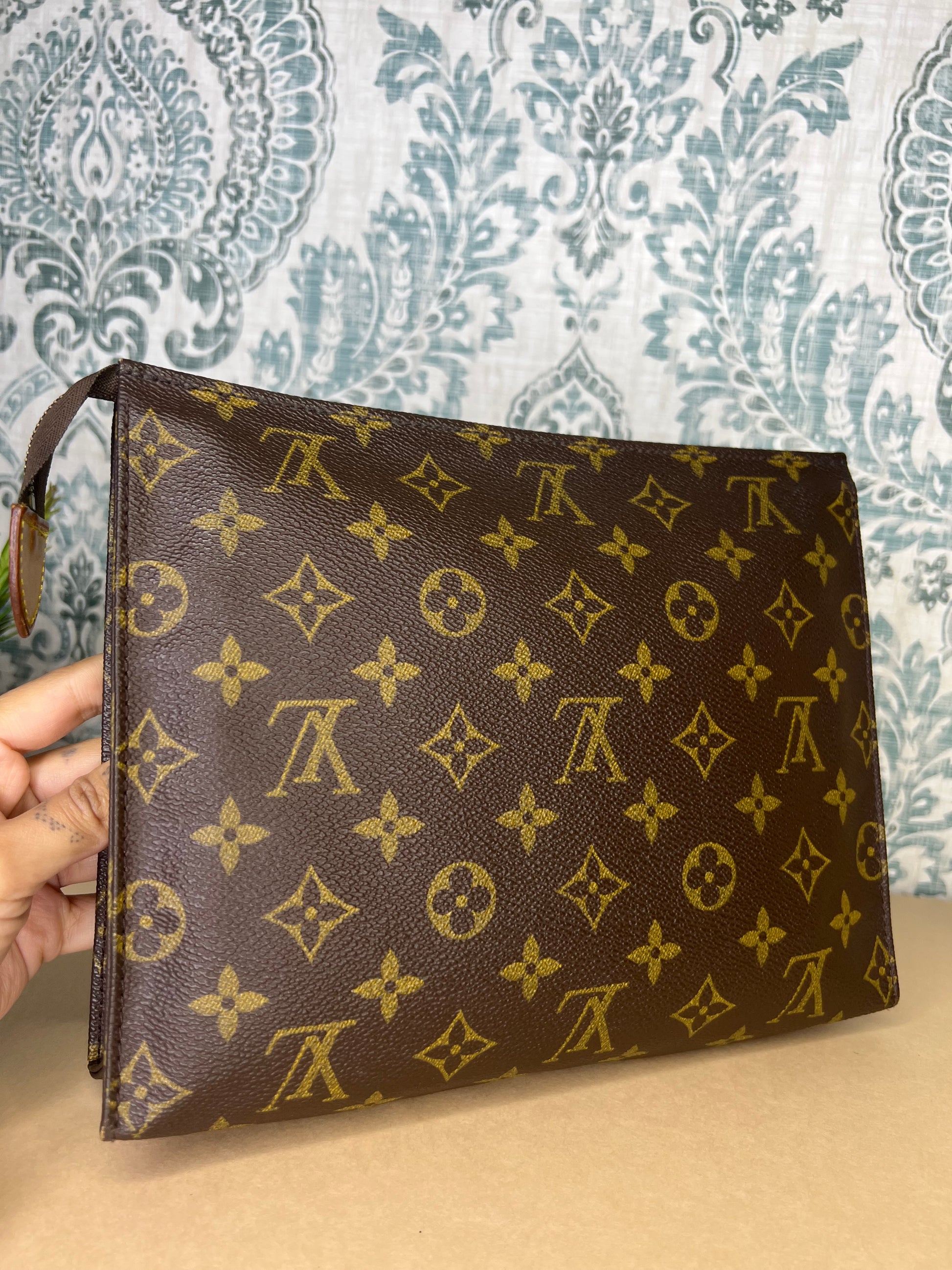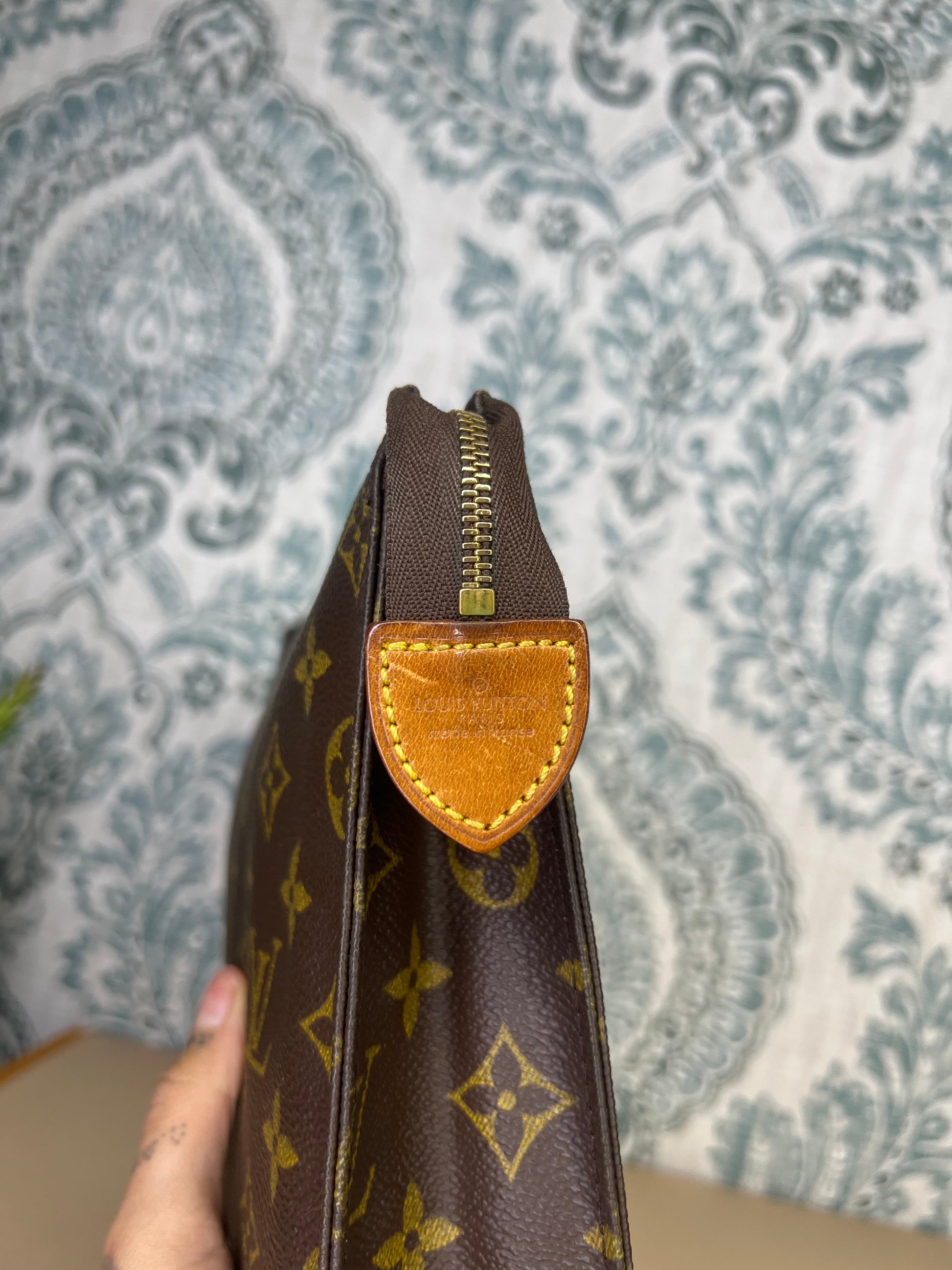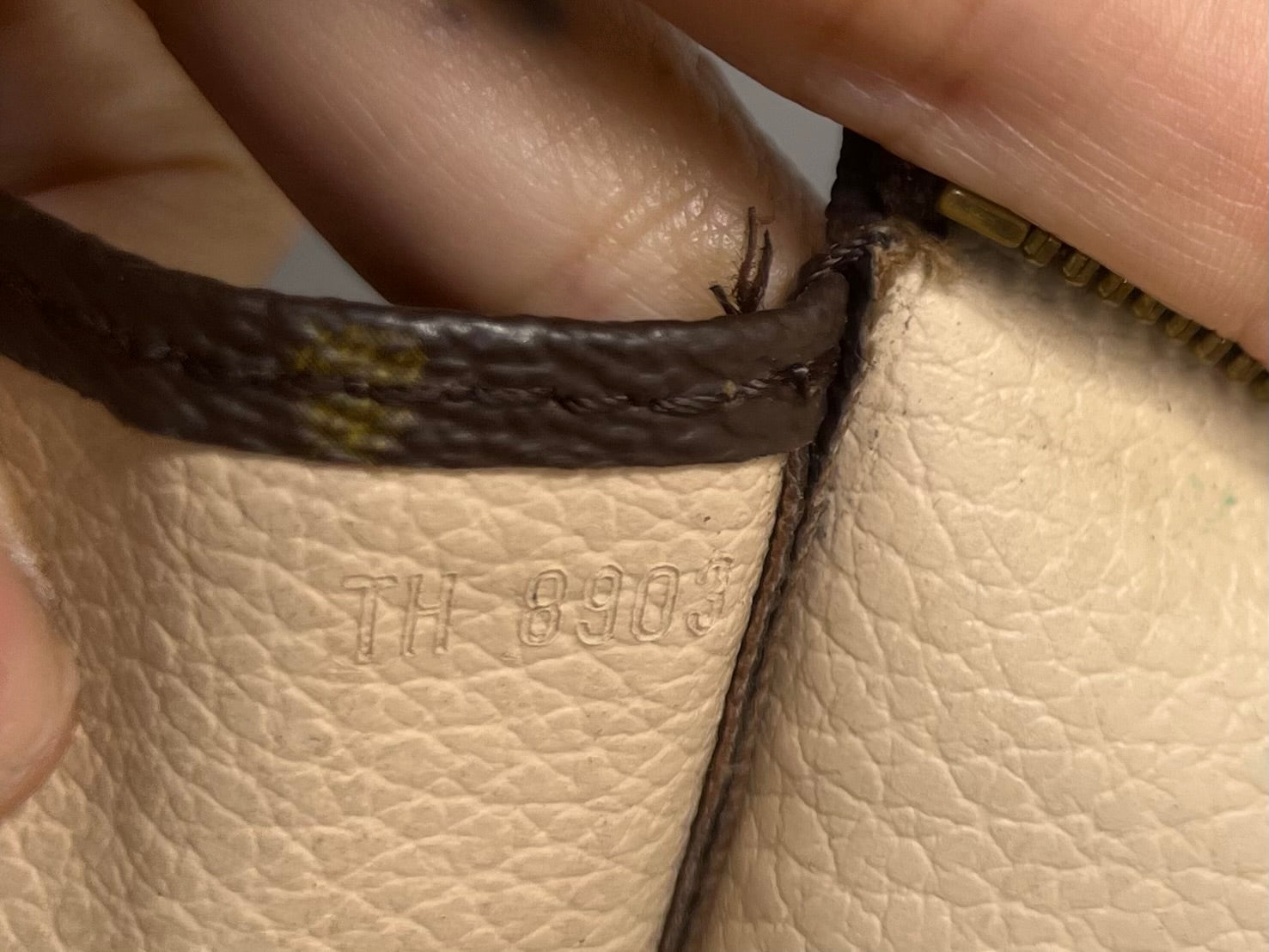 🌸 Canvas has minor chipping at base corners. There is also a tiny amount of hairline cracking hidden at top side folds of the pouch. This flaw is shown in the photos with the green circles. Canvas is overall in good shape. Monogram is bright and clear through out.