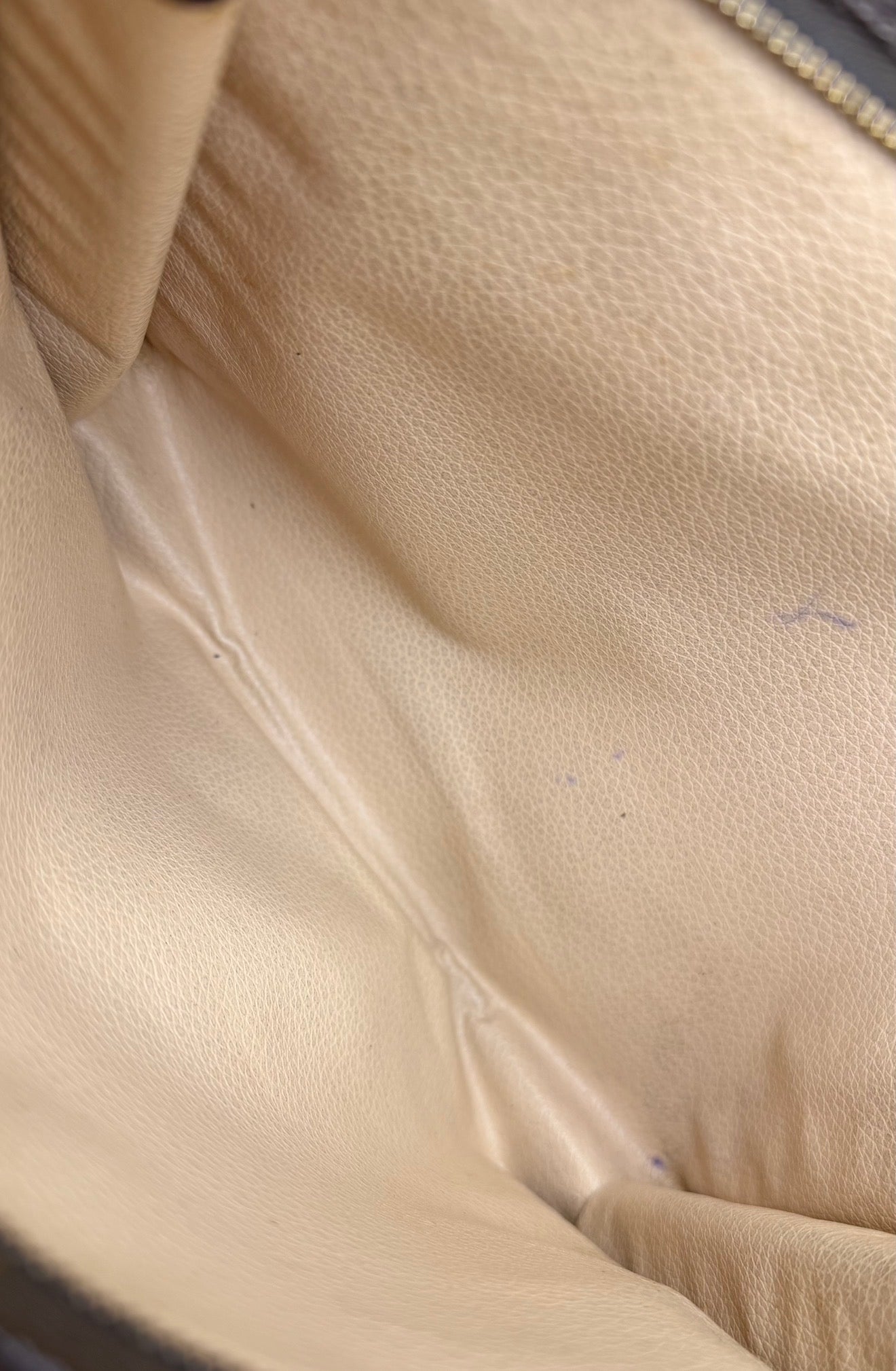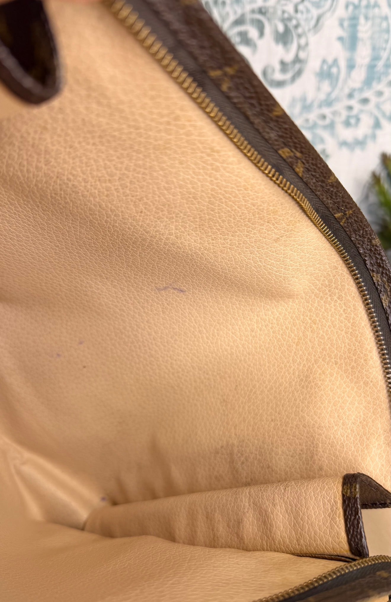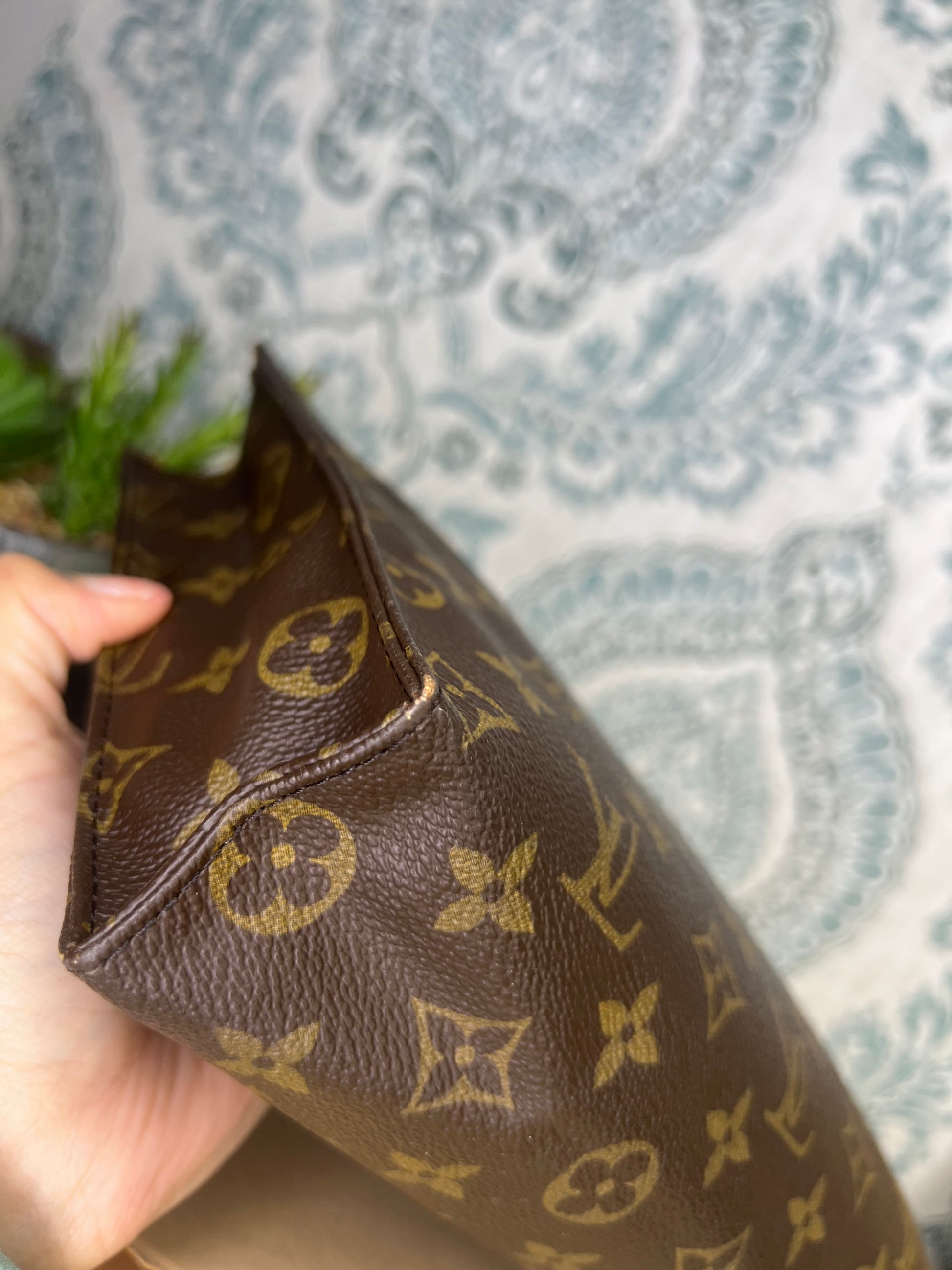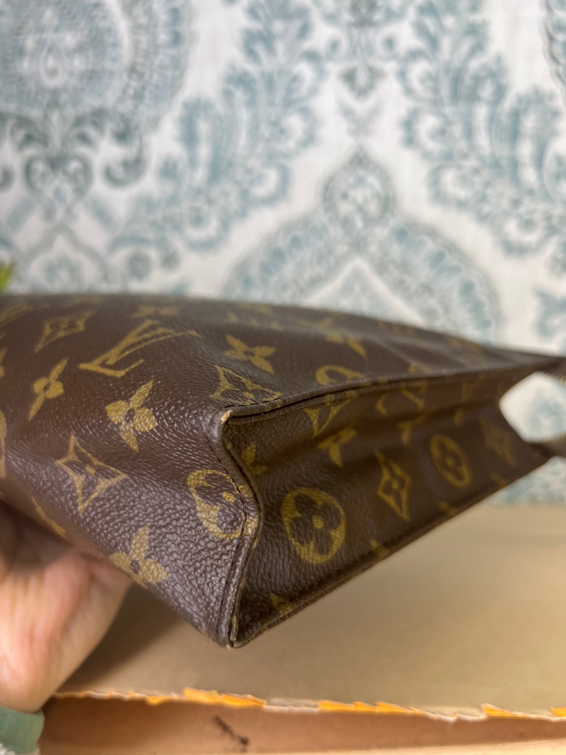🌸 Canvas has minor chipping at base corners. There is also a tiny amount of hairline cracking hidden at top side folds of the pouch. This flaw is shown in the photos with the green circles. Canvas is overall in good shape. Monogram is bright and clear through out.
