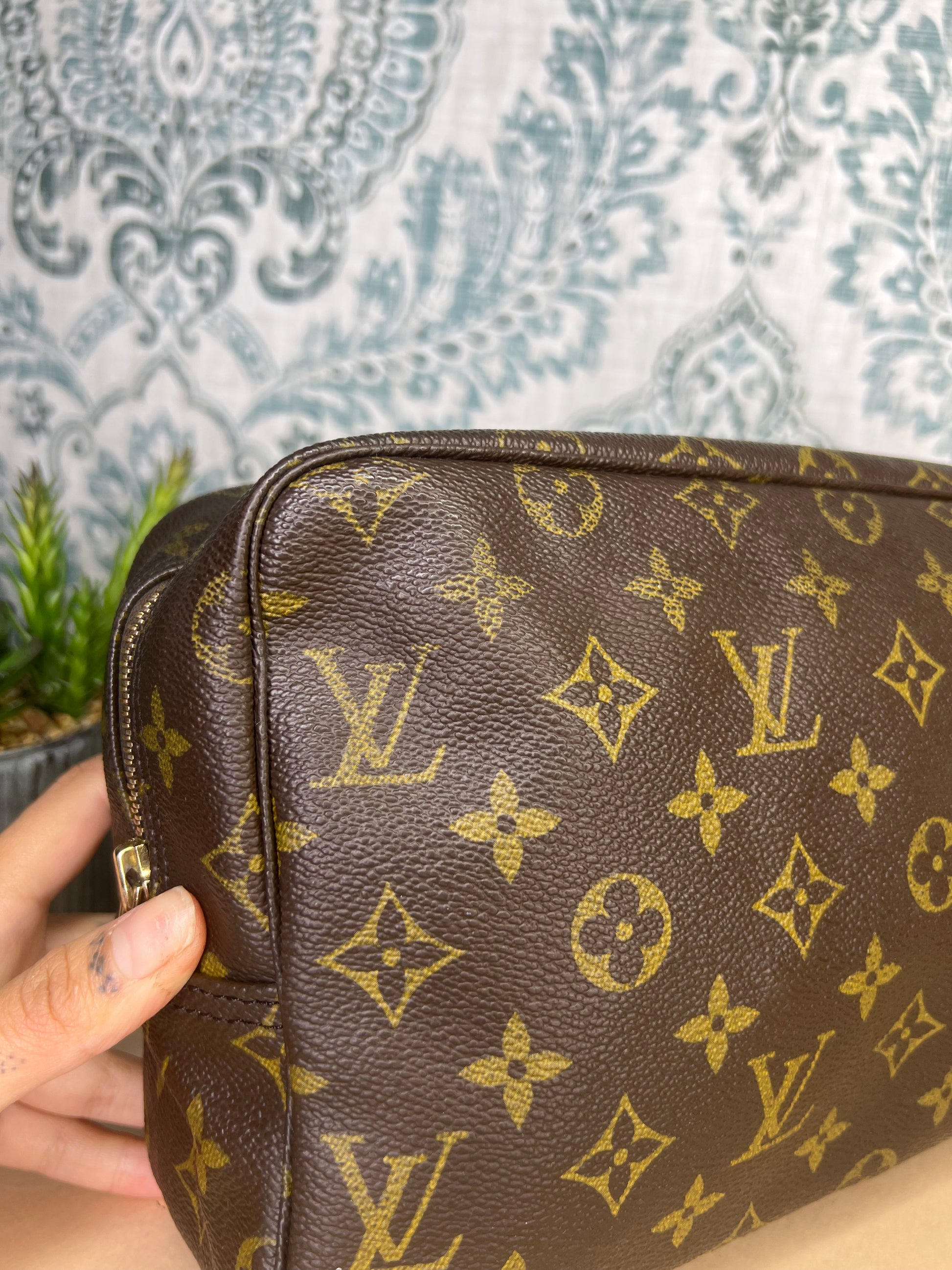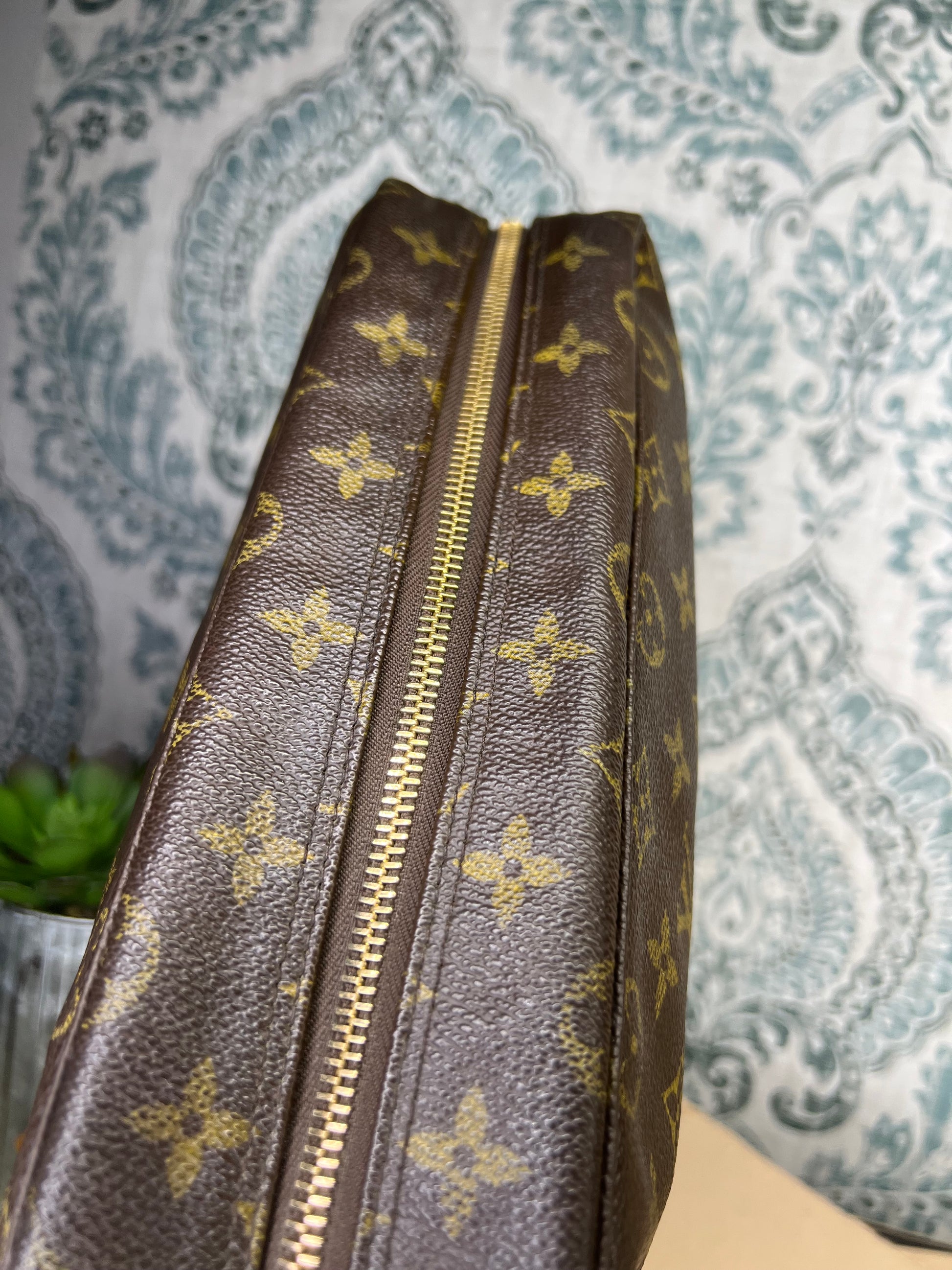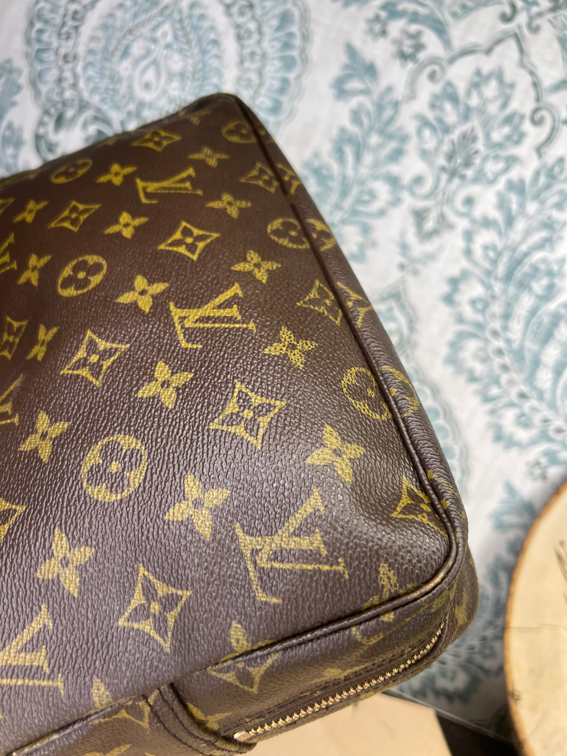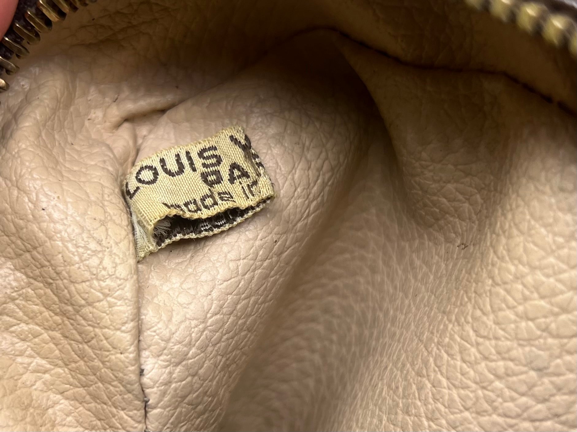 πΈ Canvas is free from any major damage. There is only a small amount of canvas chipping at corners. Monogram does have a bit of fading towards the top of the pouch, but itβs overall clear.