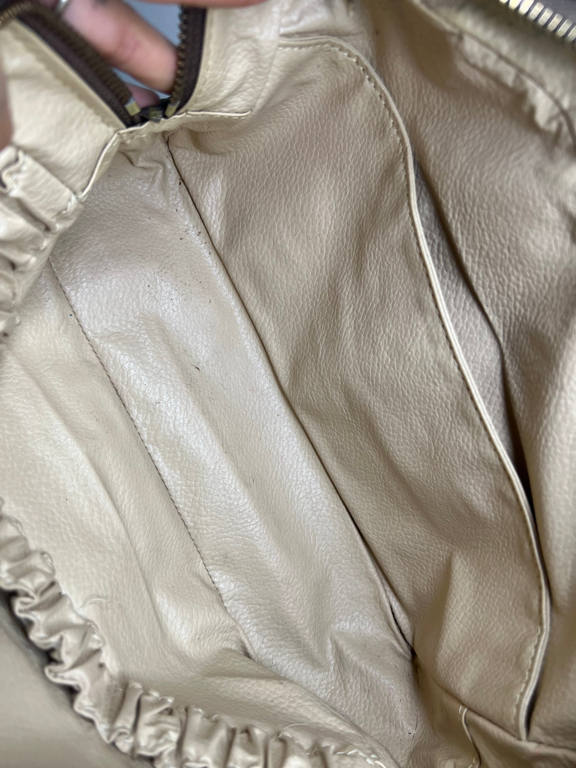 🌸 Interior is peel and sticky free. 100% usable. Interior does have signs of use. There is a tear in the lining at top corner. This does not affect the use of the pouch
