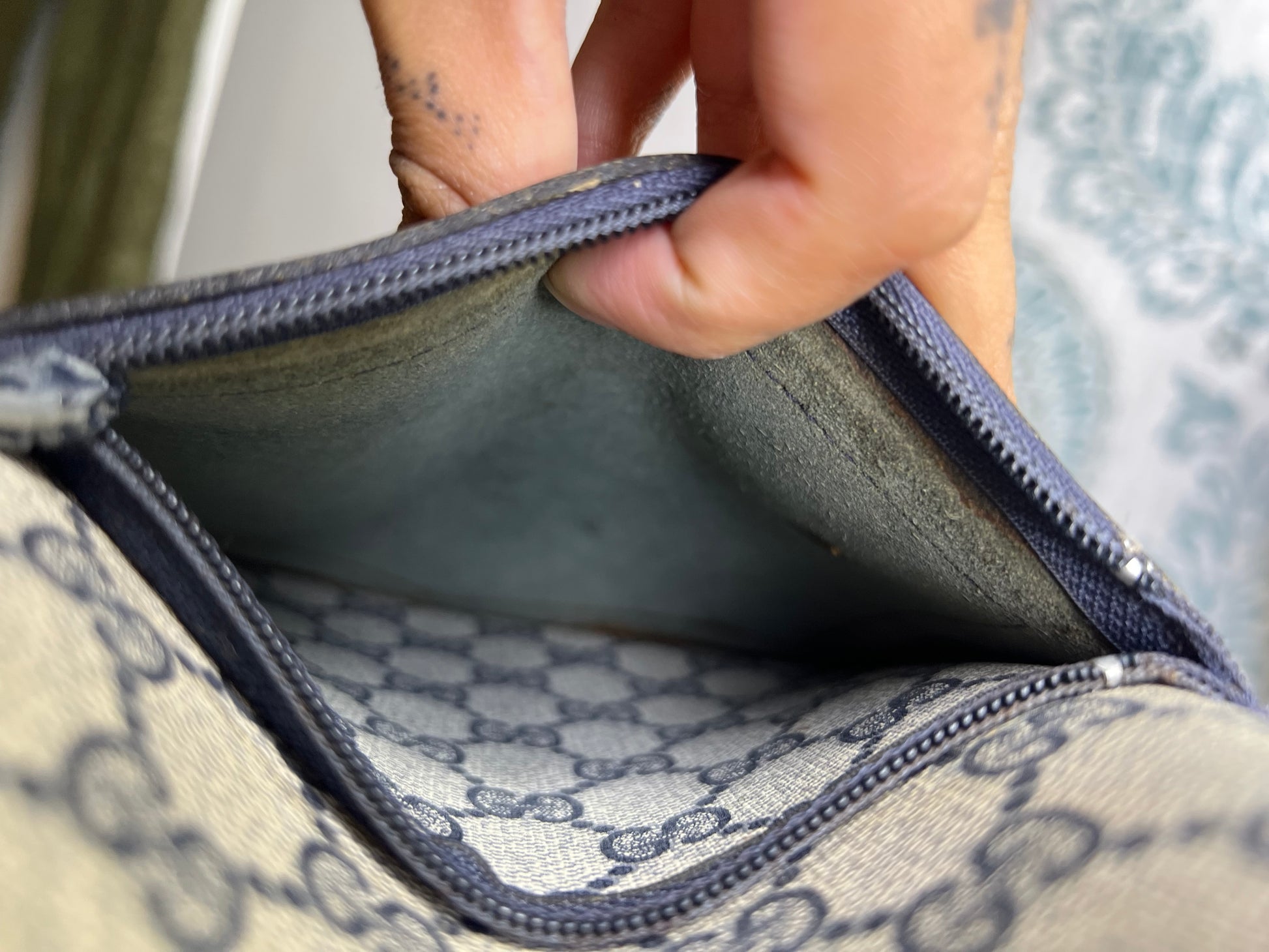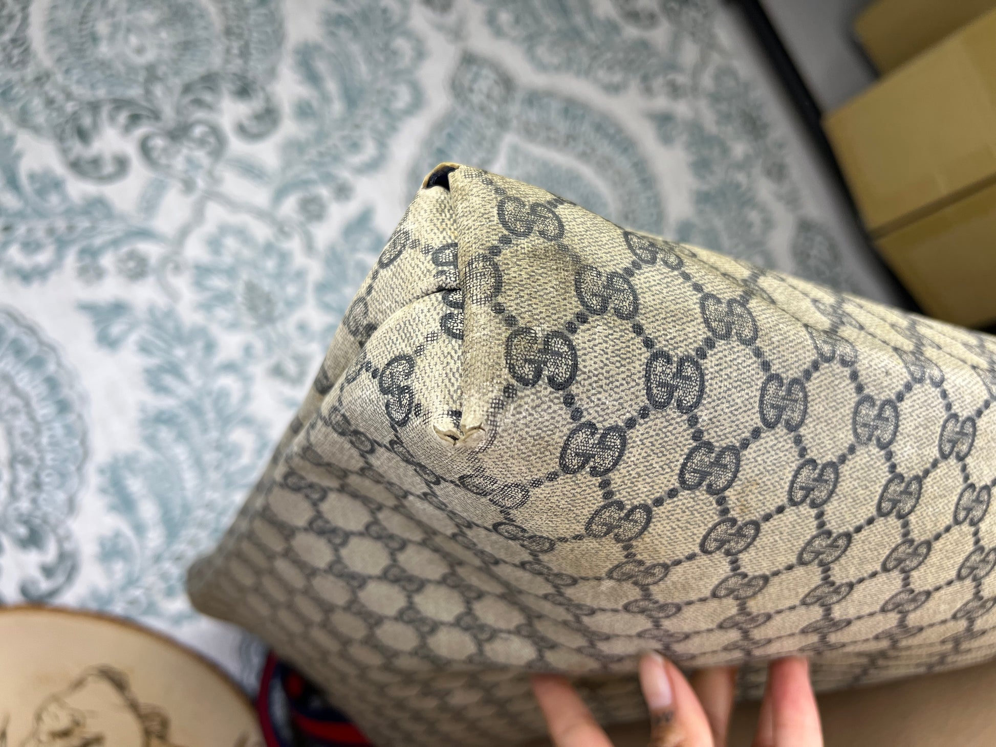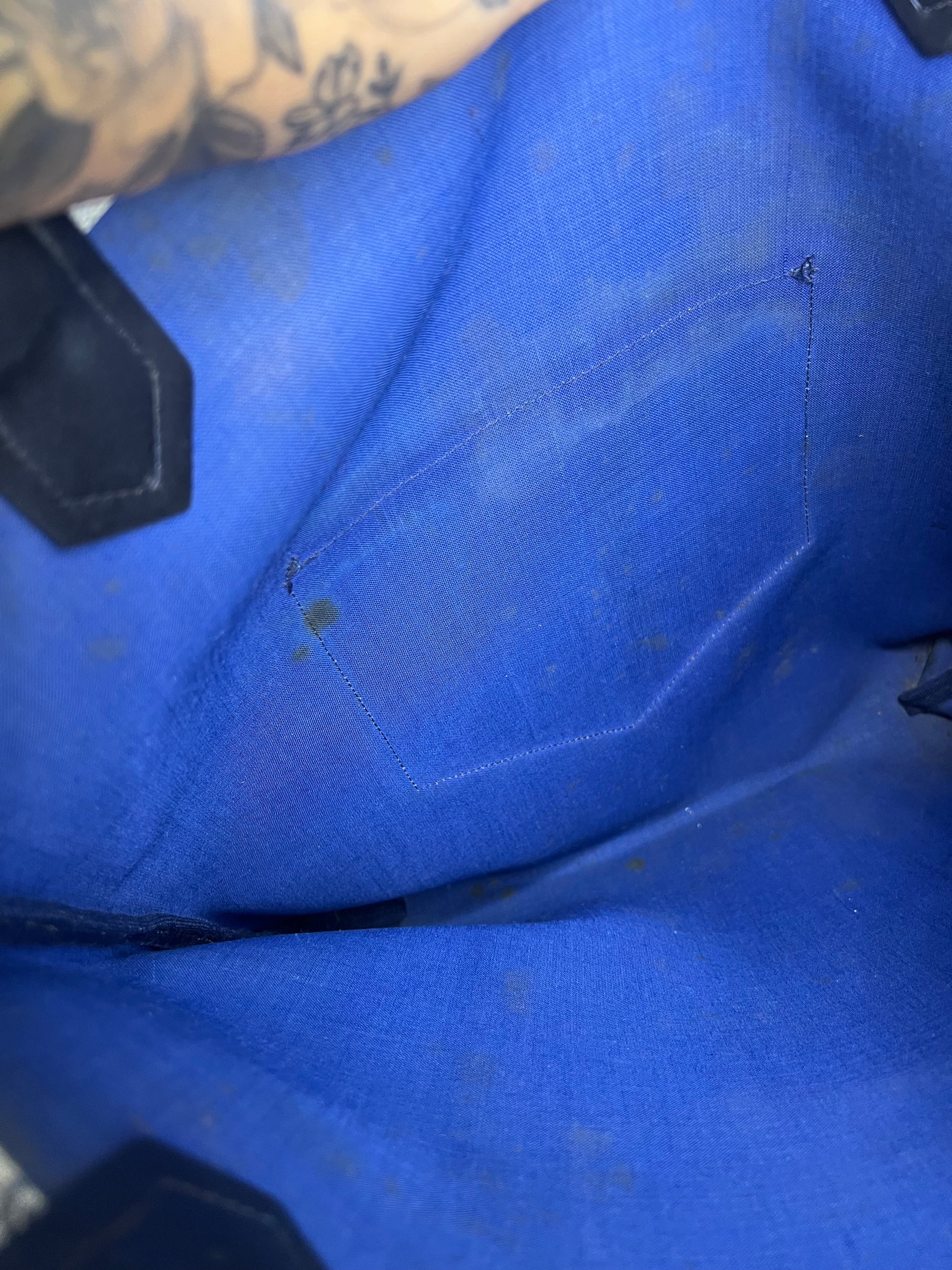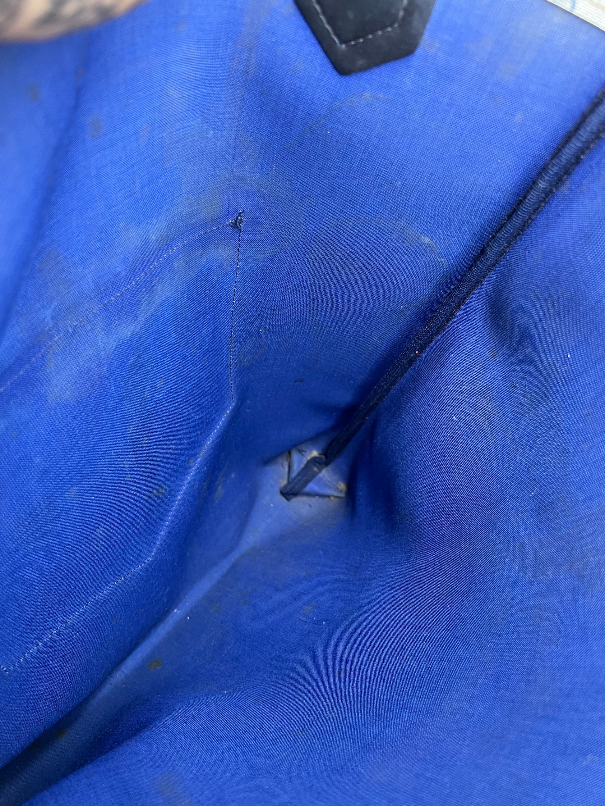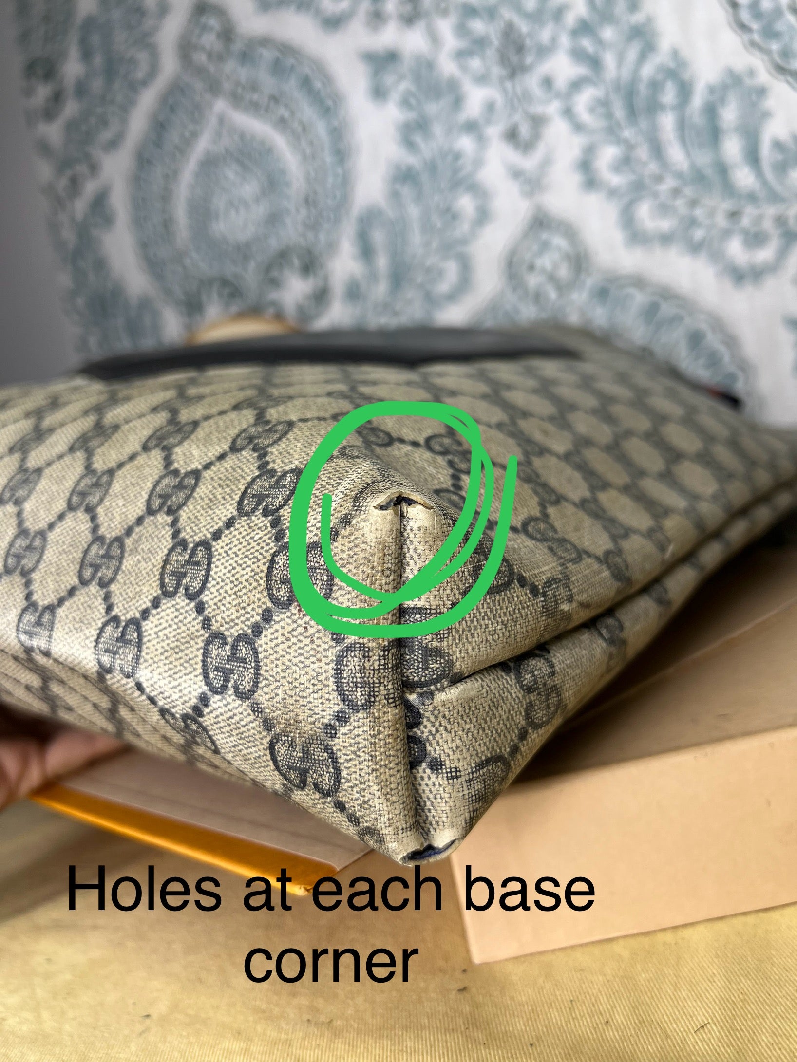 šø Coated canvas has some areas with fading and rubs. Fading is mainly at the edge top of the bag. There are canvas holes at each base corner of the bag. These are small holes and do go through to the inside of the purse