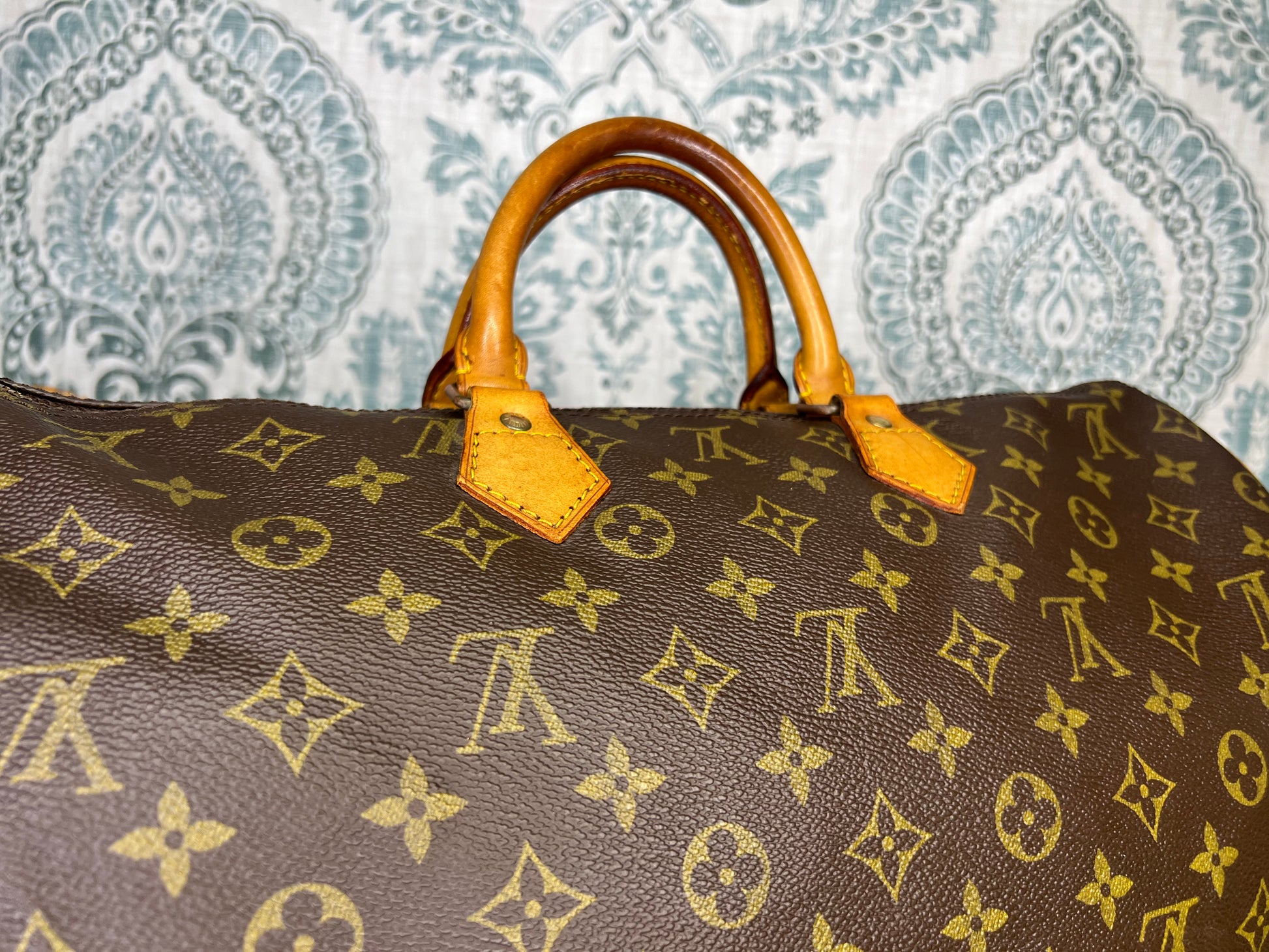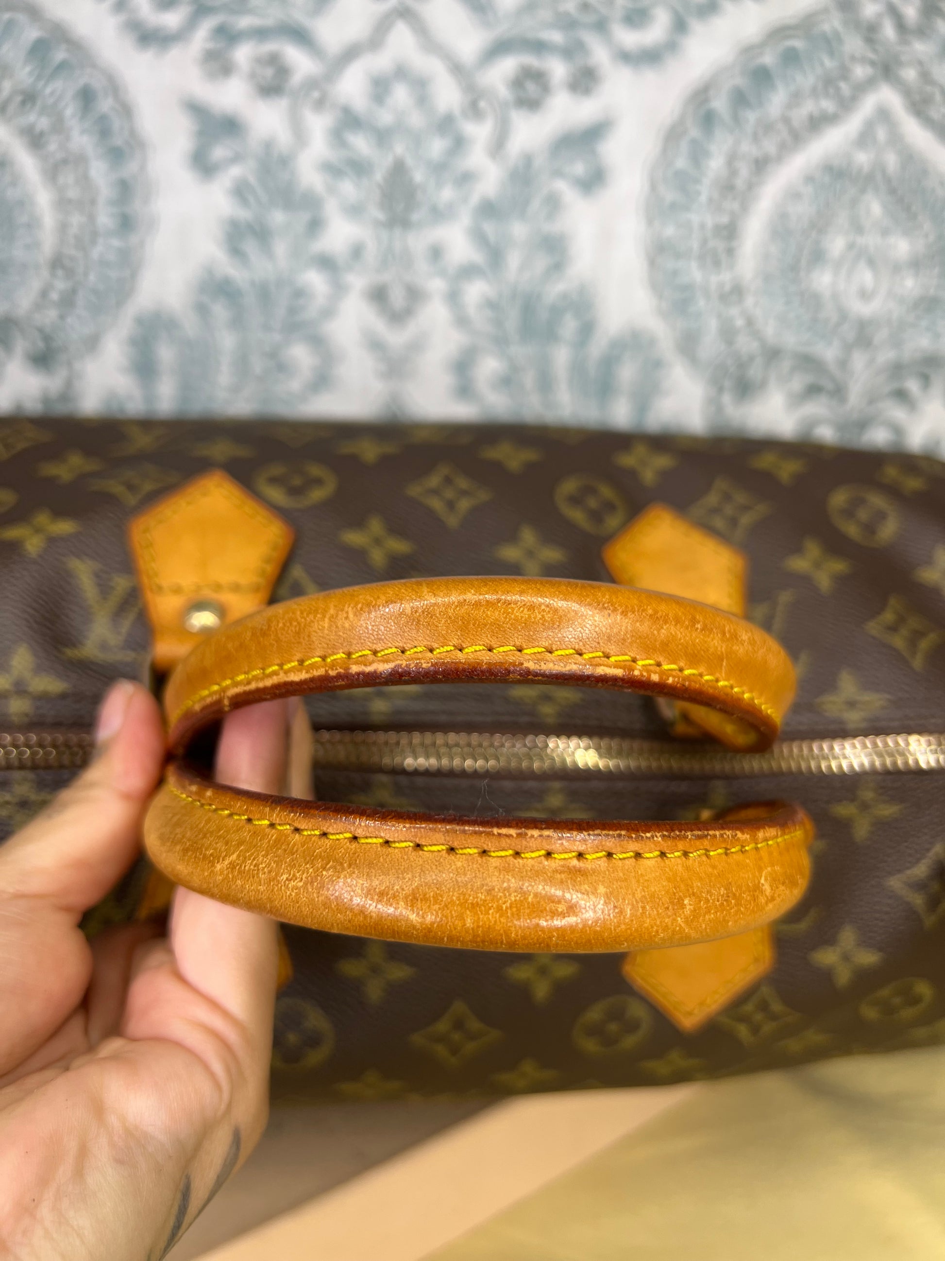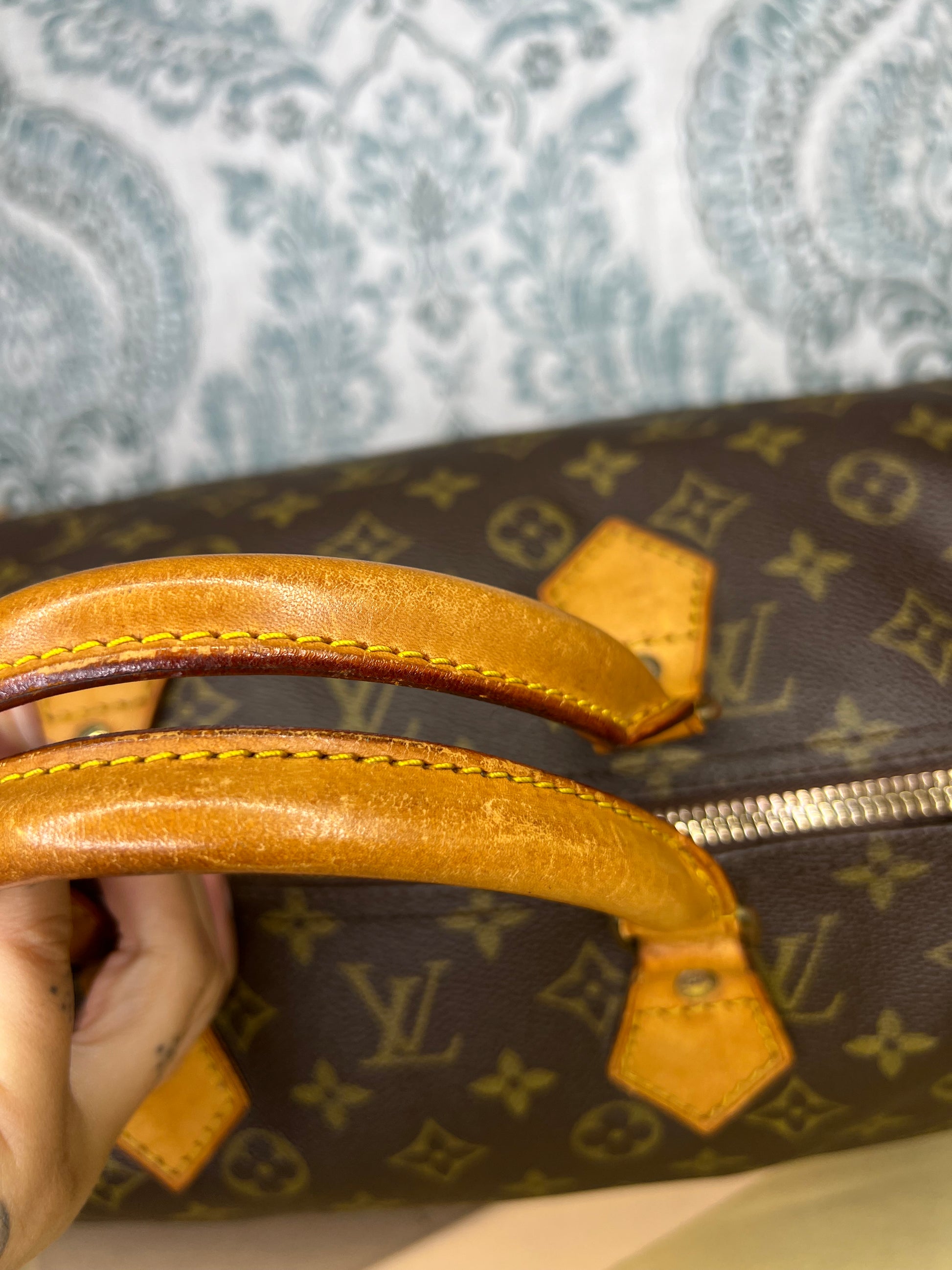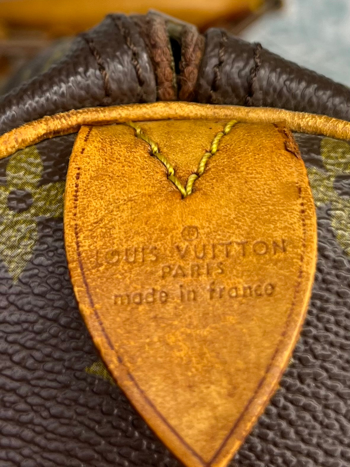 Handles do have minor surface cracks, but are overall sturdy. Chaps are sturdy. Vachetta has discoloration and scuffs. Tail tags are worn and cracked and