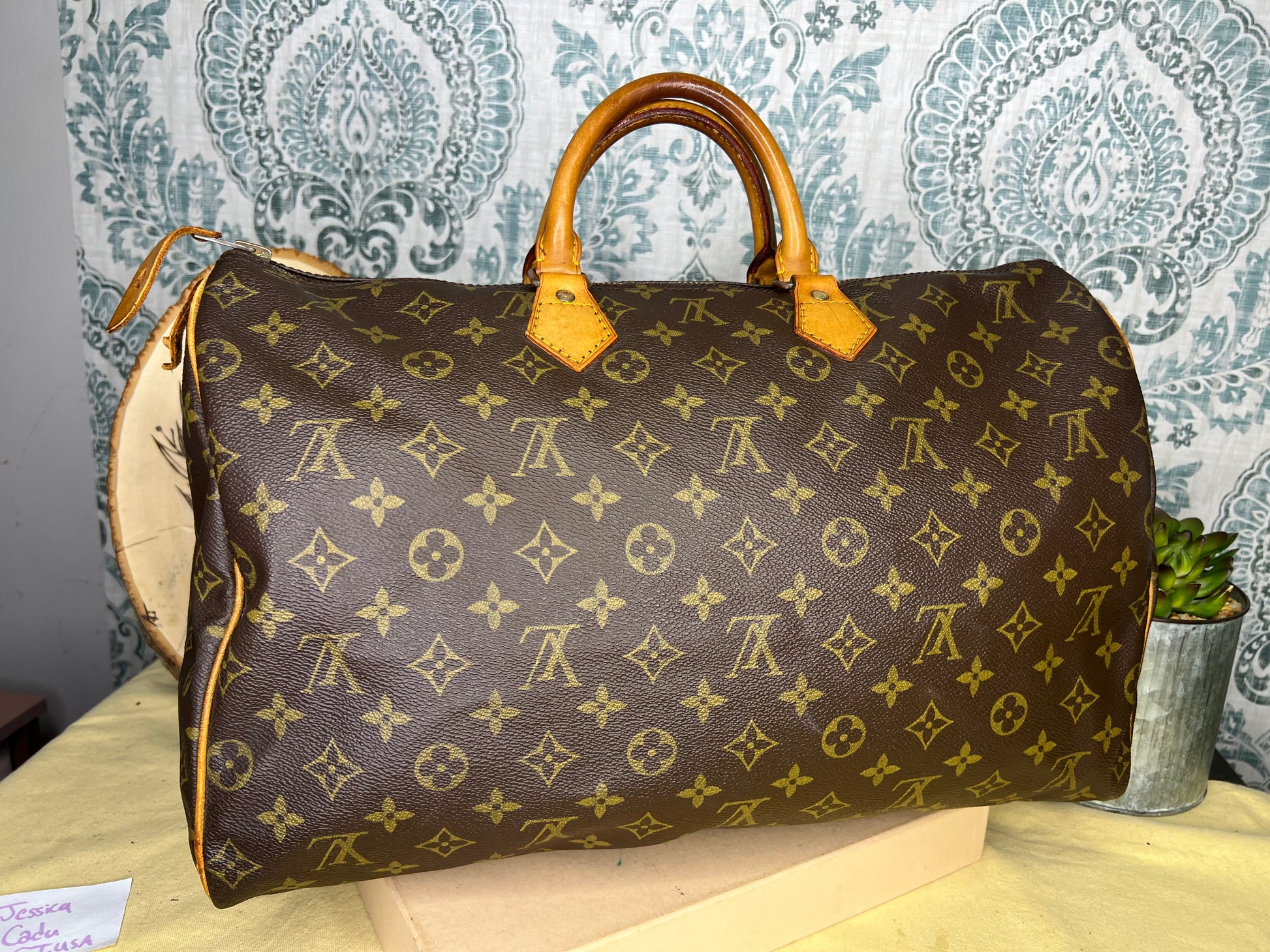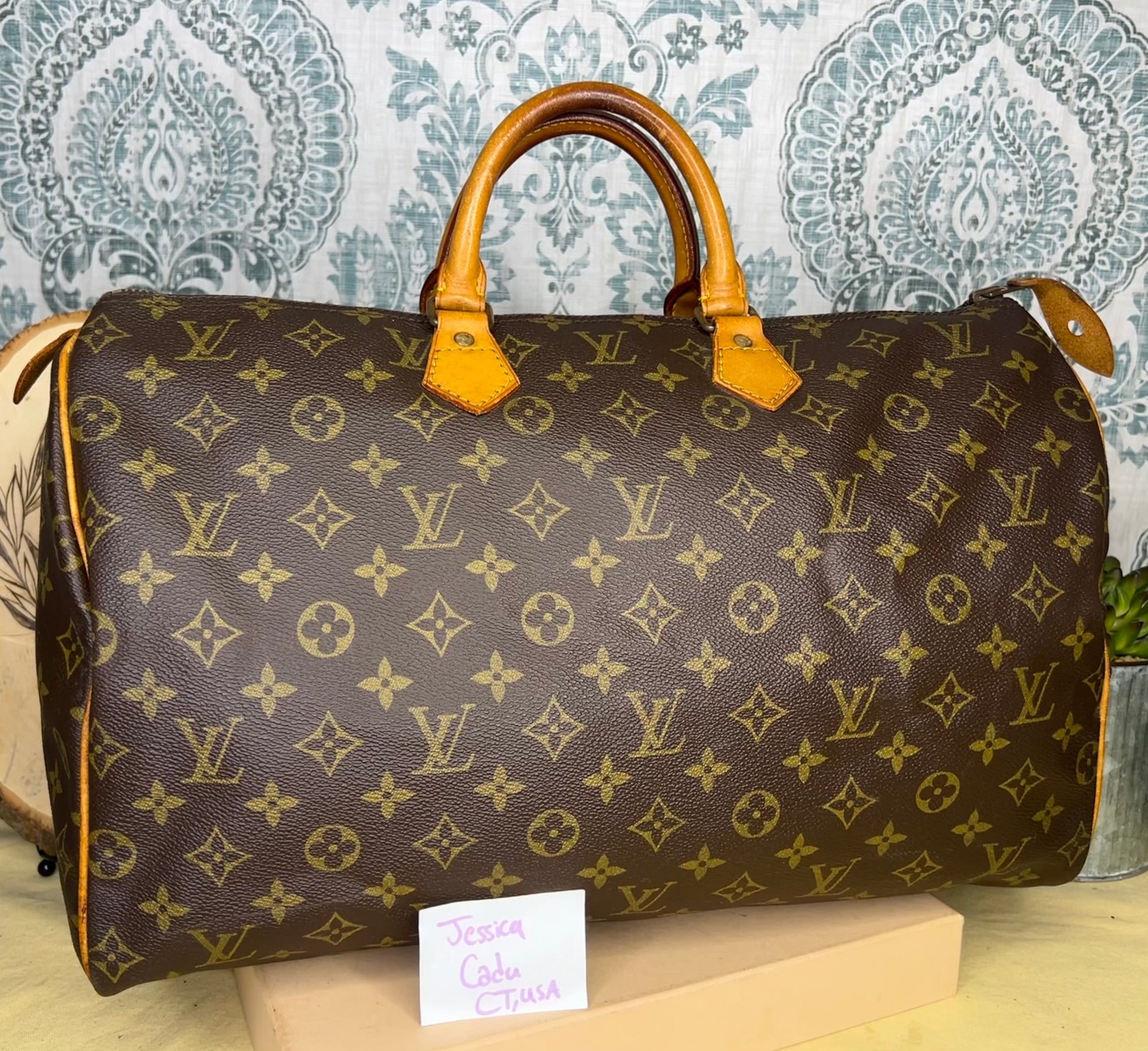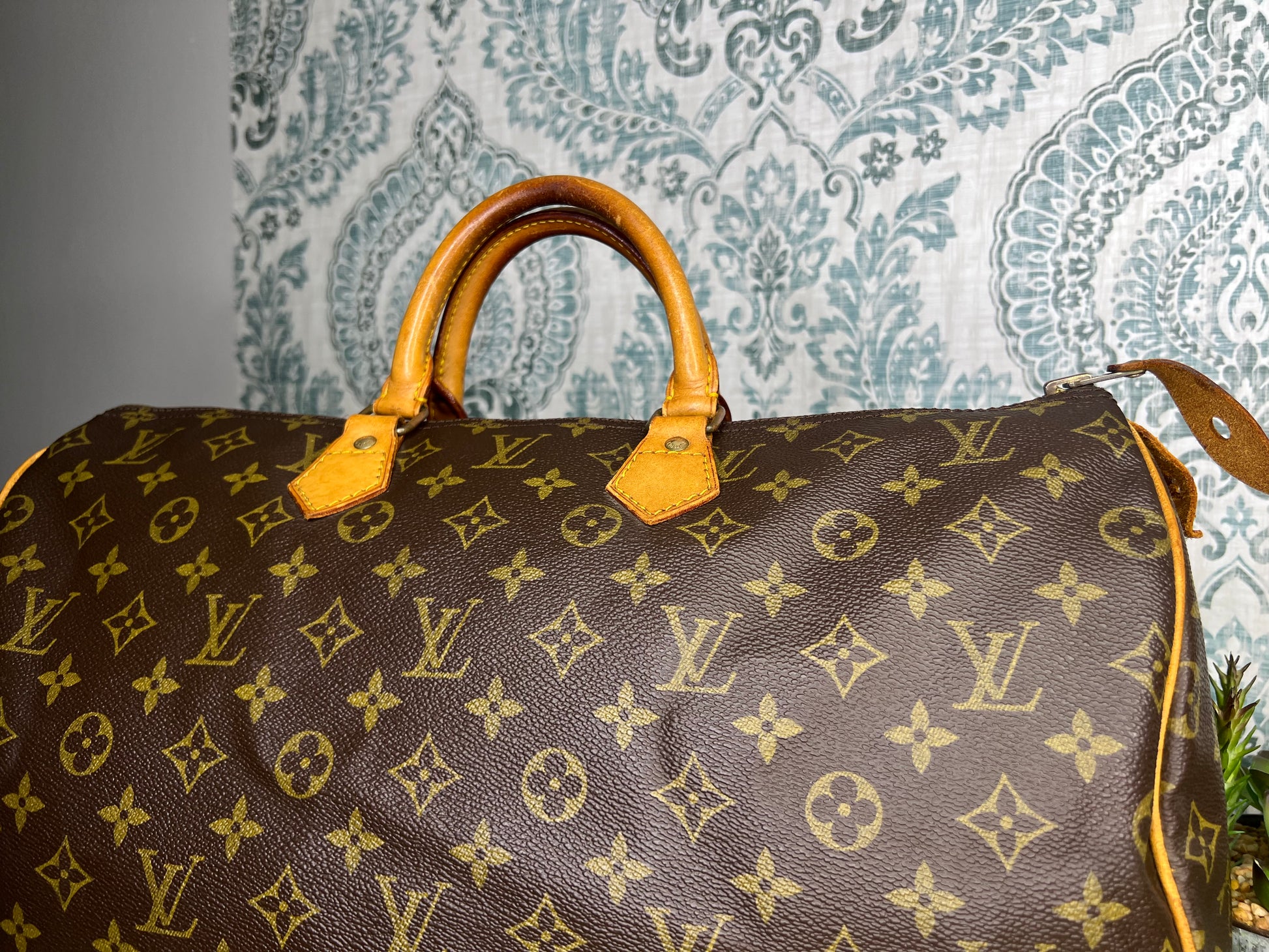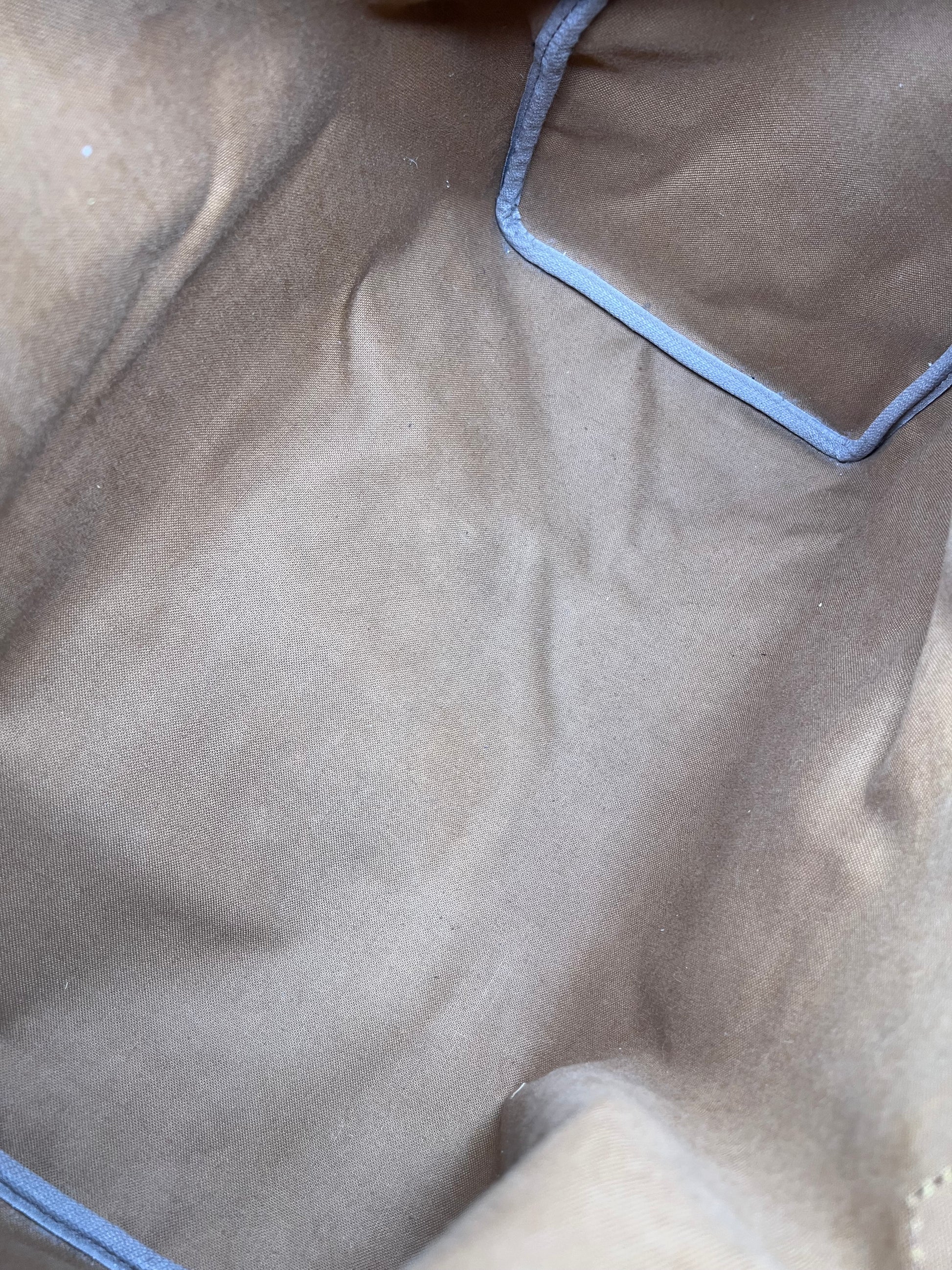 Handles do have minor surface cracks, but are overall sturdy. Chaps are sturdy. Vachetta has discoloration and scuffs. Tail tags are worn and cracked and