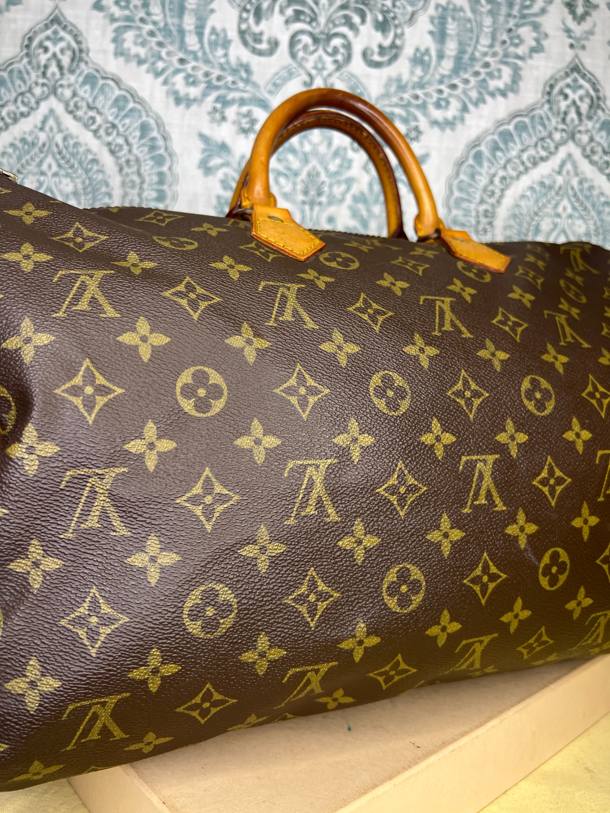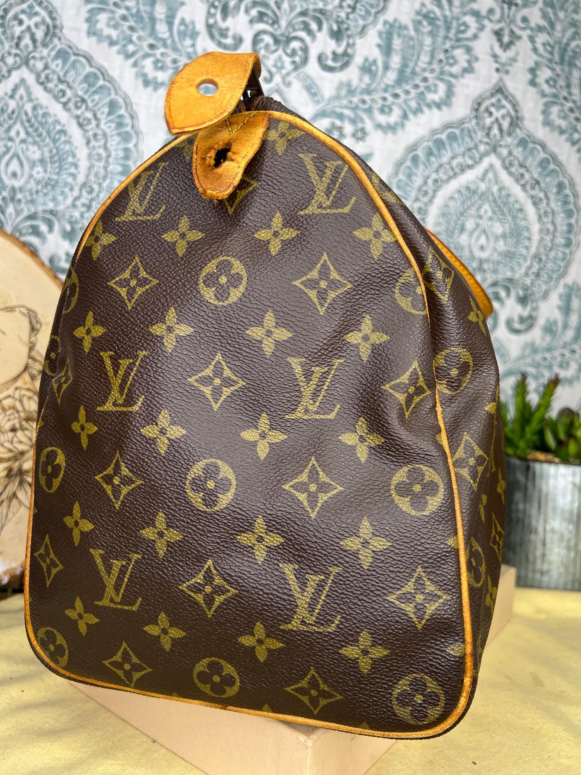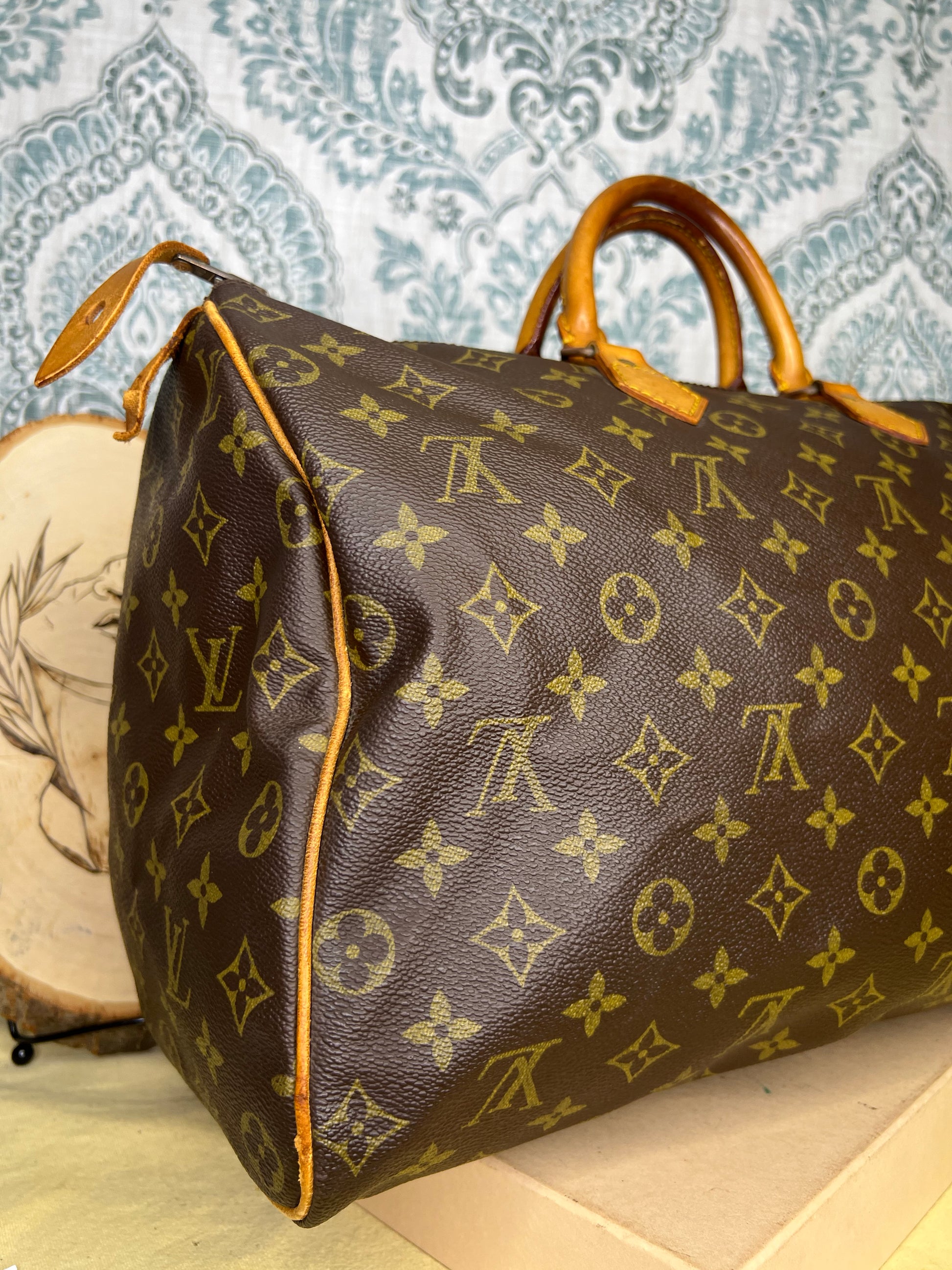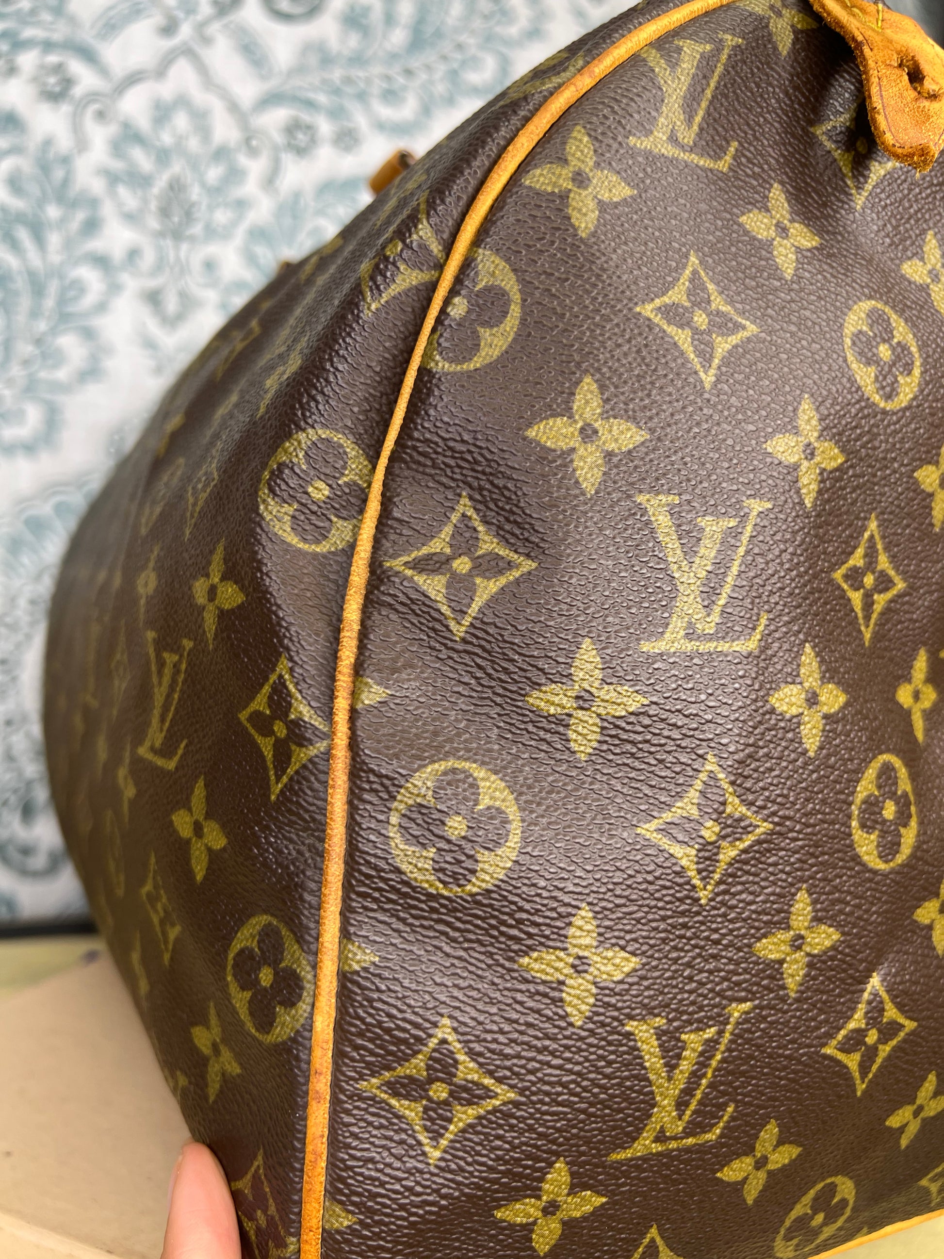 Handles do have minor surface cracks, but are overall sturdy. Chaps are sturdy. Vachetta has discoloration and scuffs. Tail tags are worn and cracked and