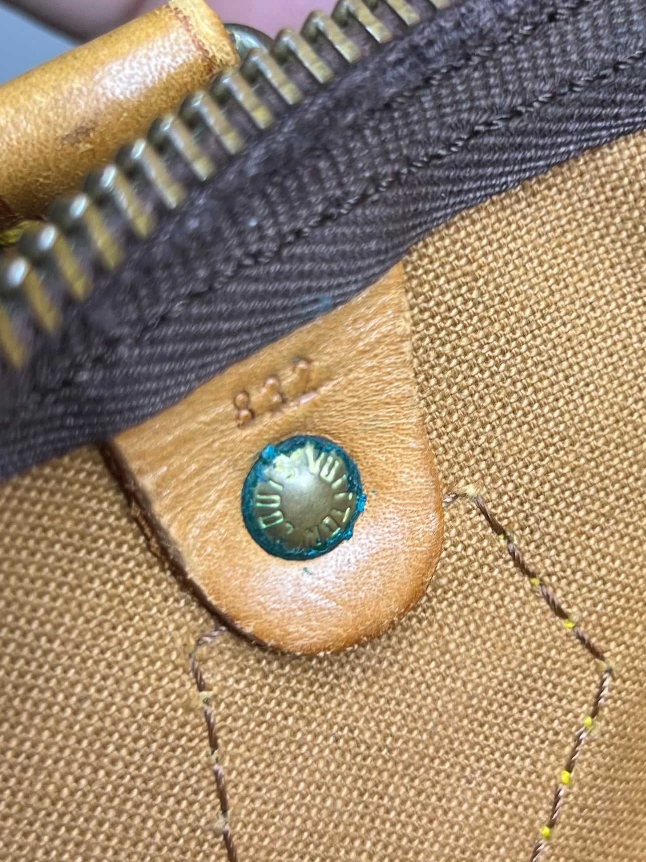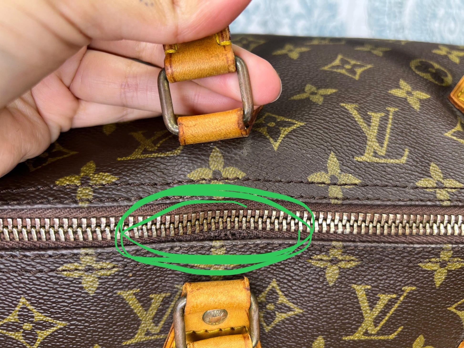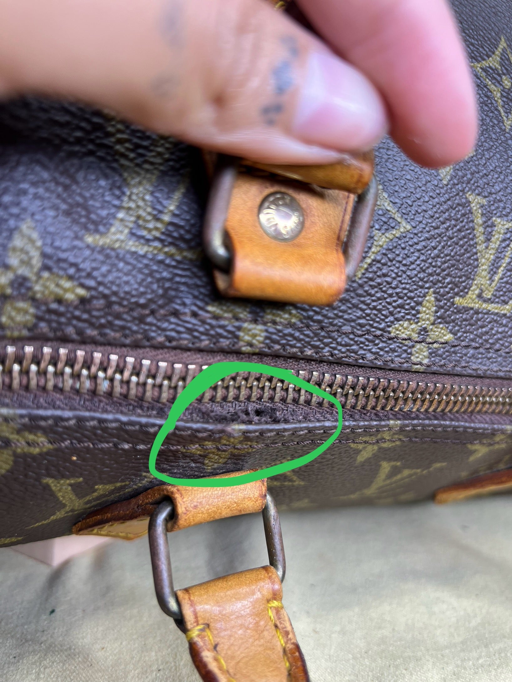 Zipper does have several fabric tears. The zipper does still work, but these tear can worsen over time and may need to be replaced eventually. Zipper pull has wear