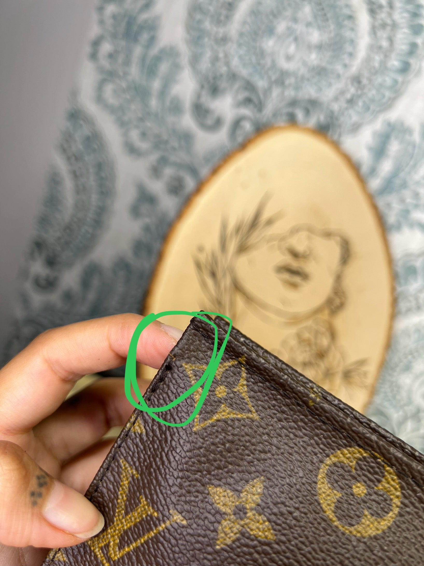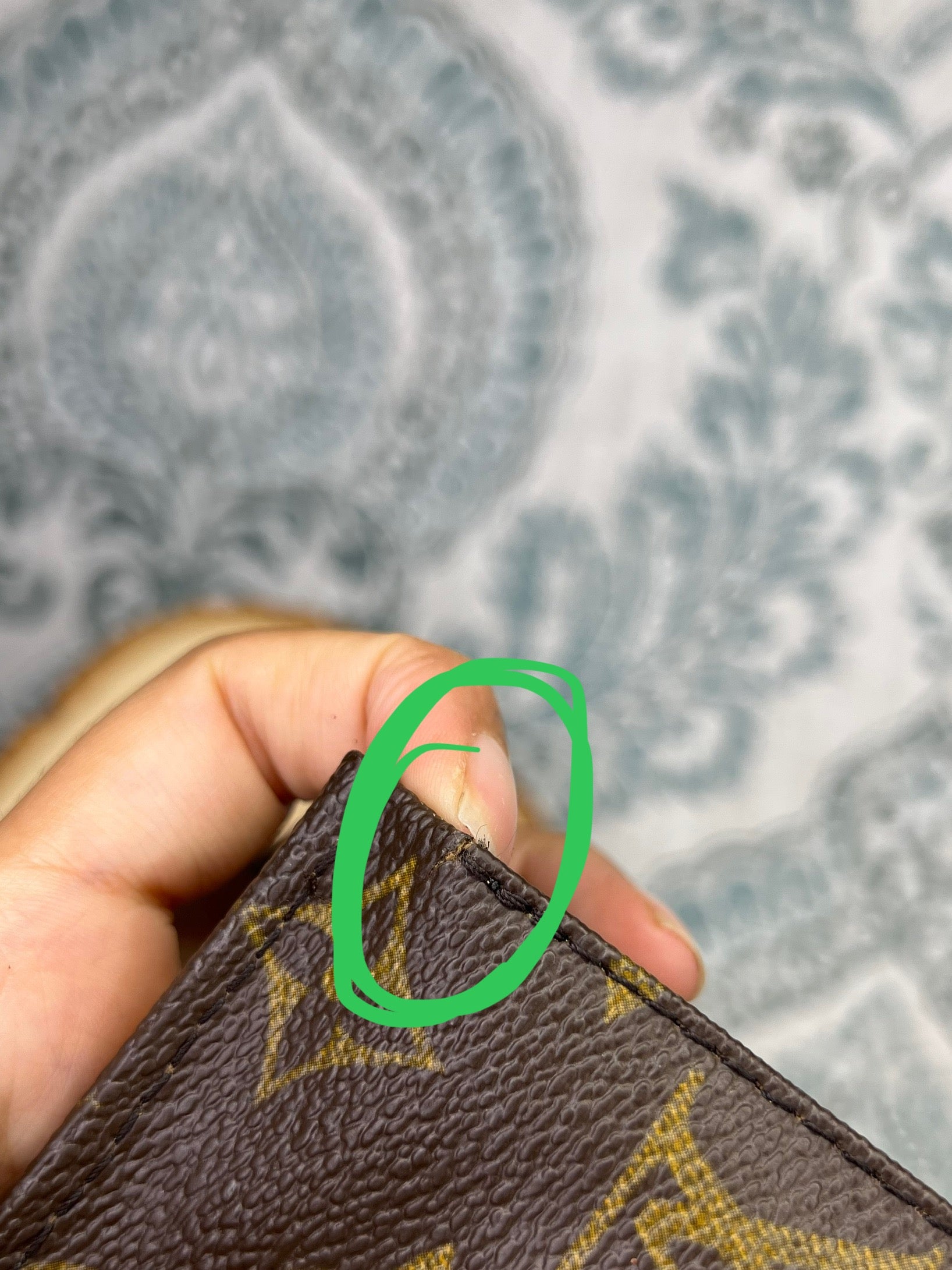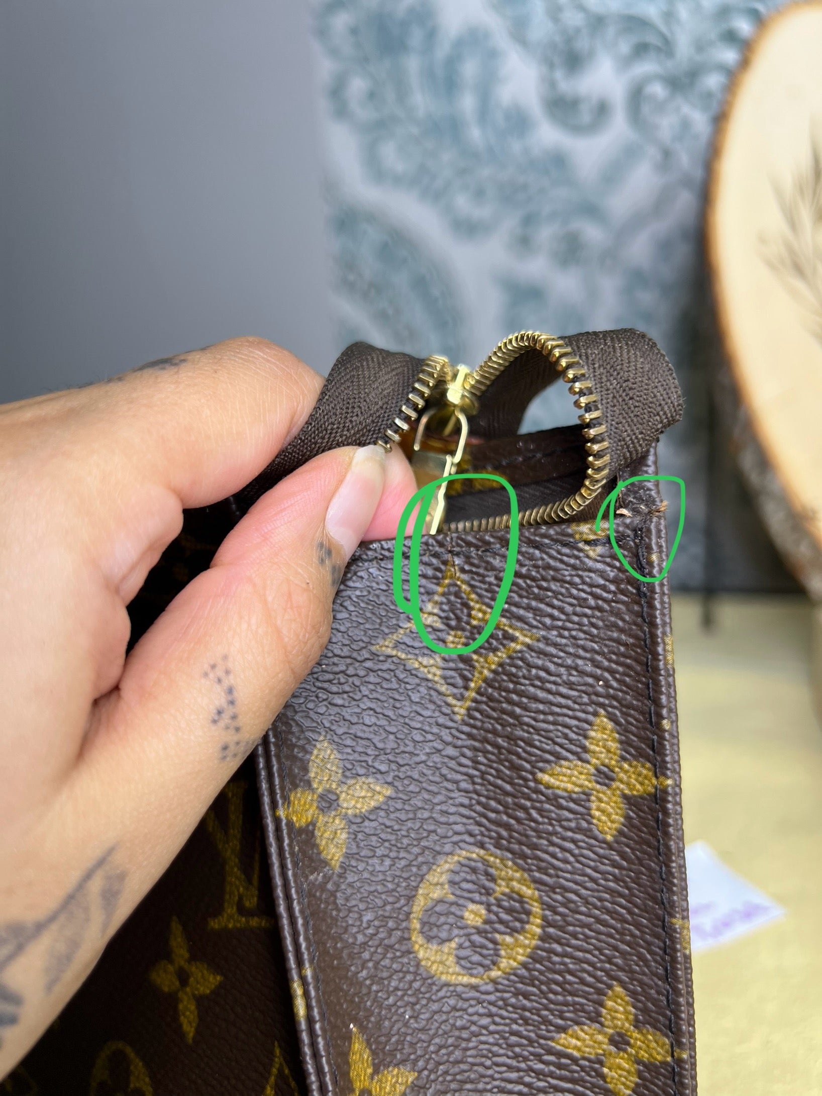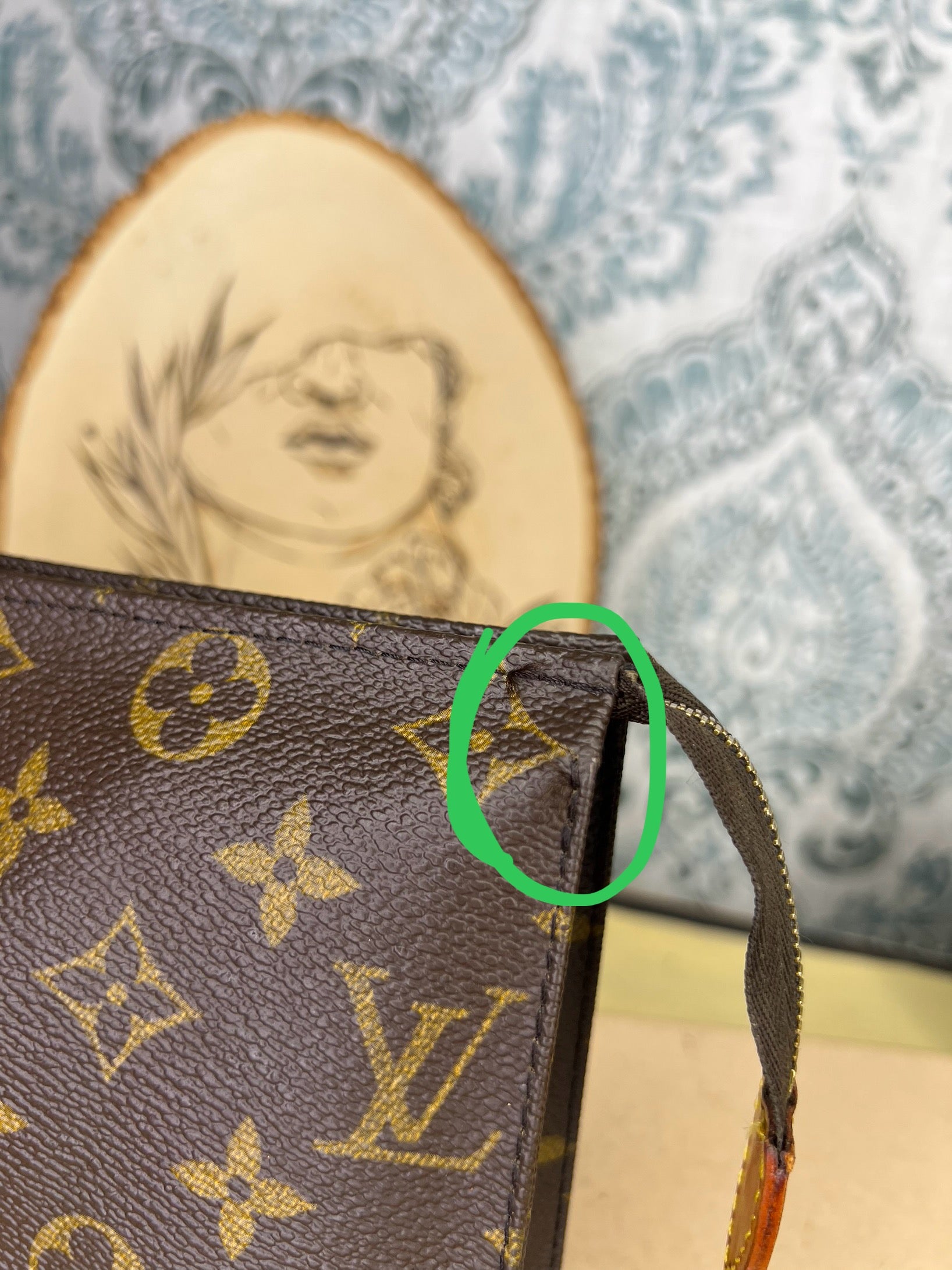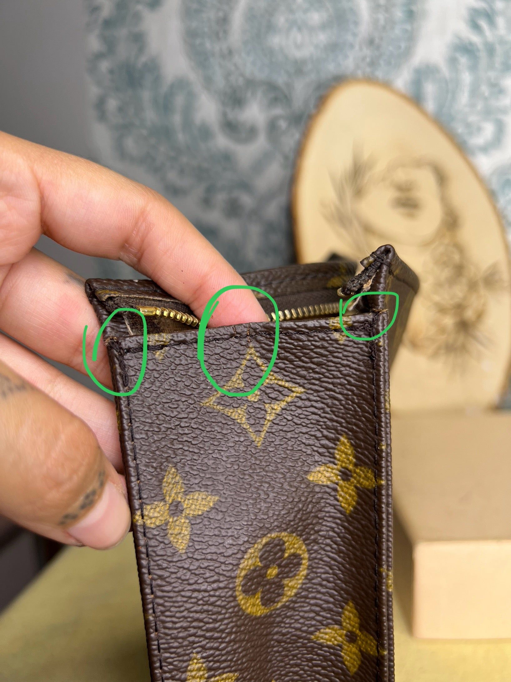 ๐ธ Canvas has cracking at top edge corners of the pouch. Thereโs also some hidden hairlines on the sides of the pouch. Shown in photos with green circles. Minor popped stitching around the same area