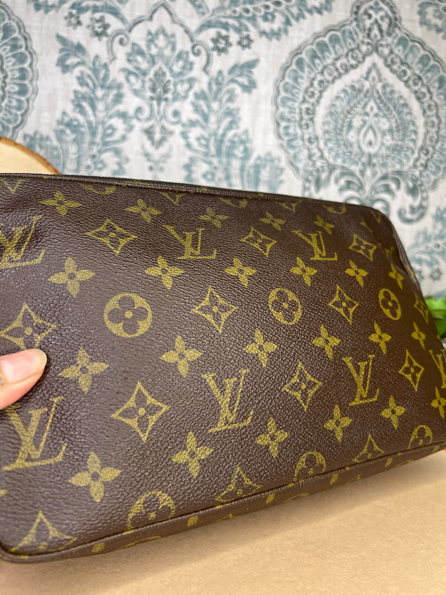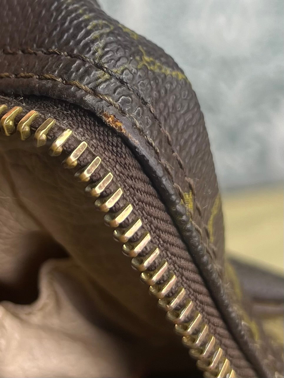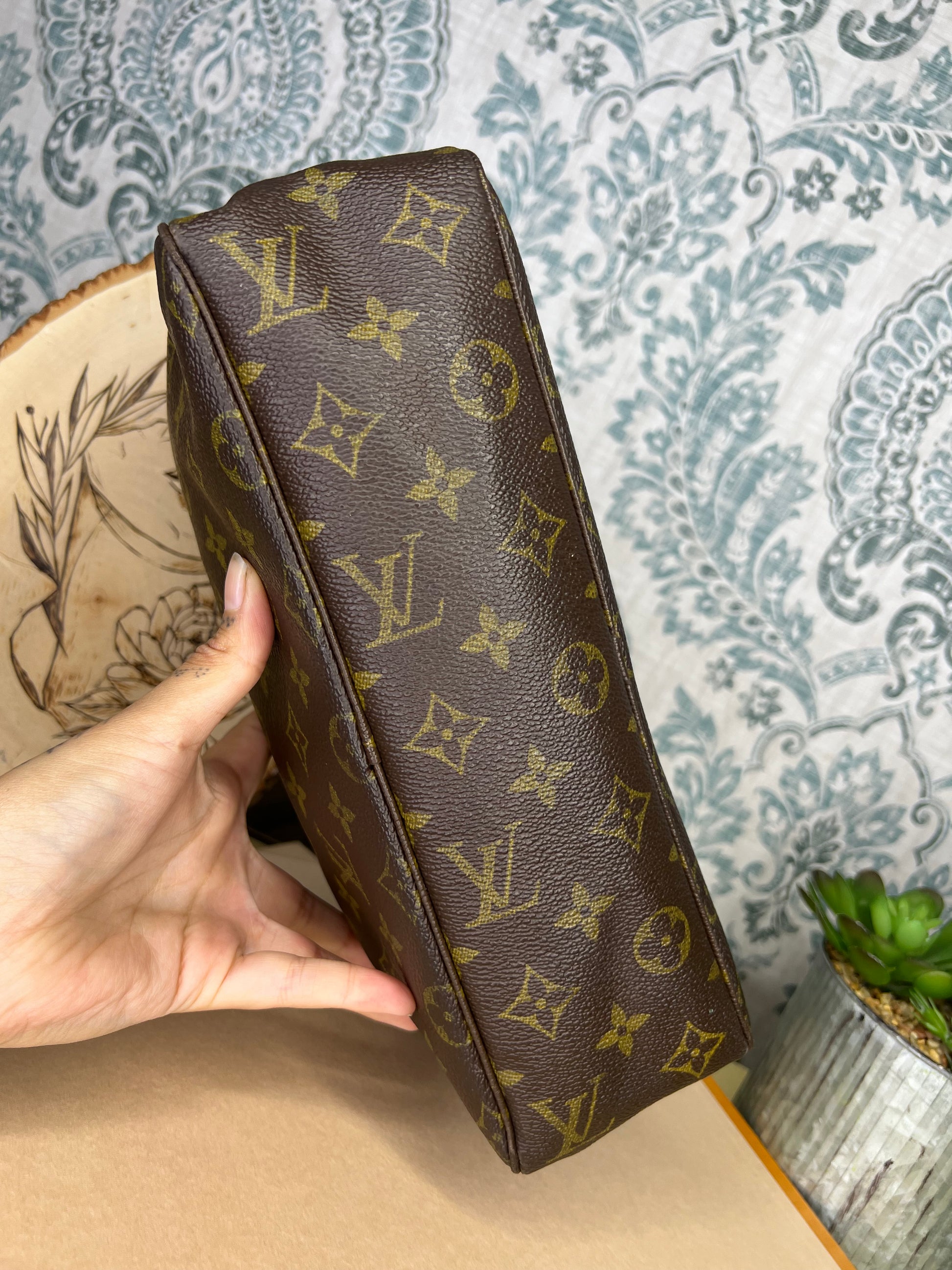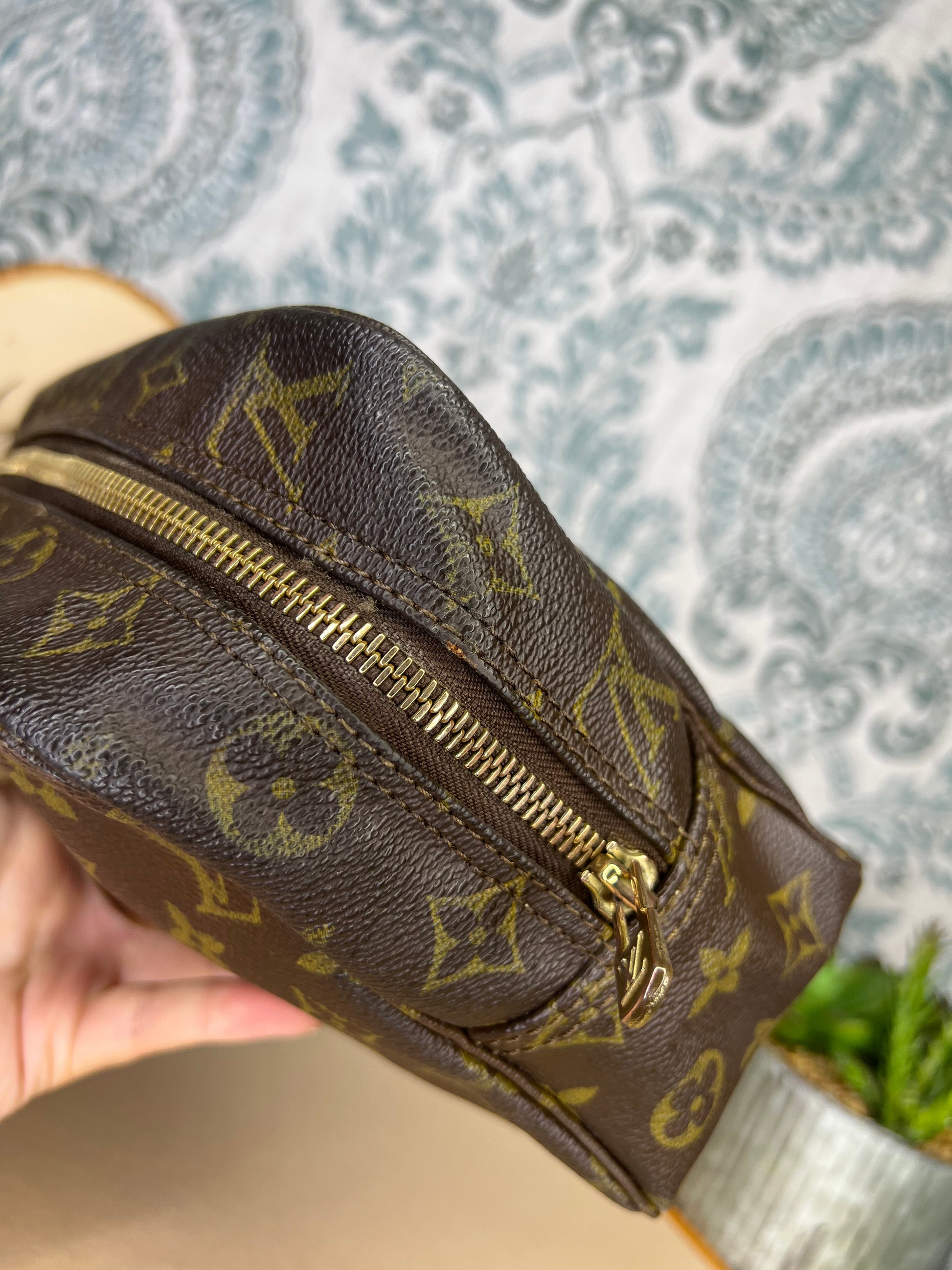 ๐ธ Canvas is intact and has no major damage. There is just minor canvas rubbing at corners of the pouch. Monogram has fading, but overall clear