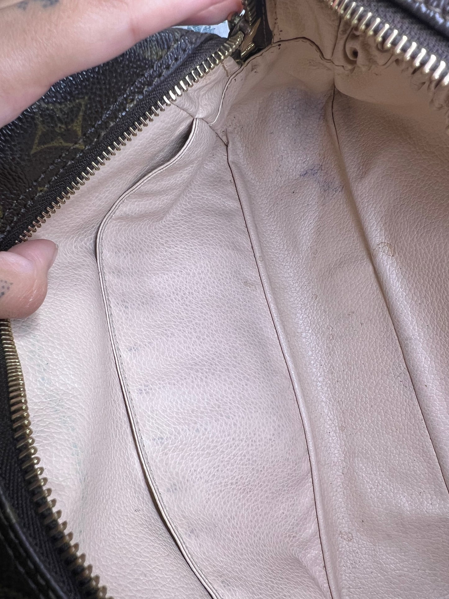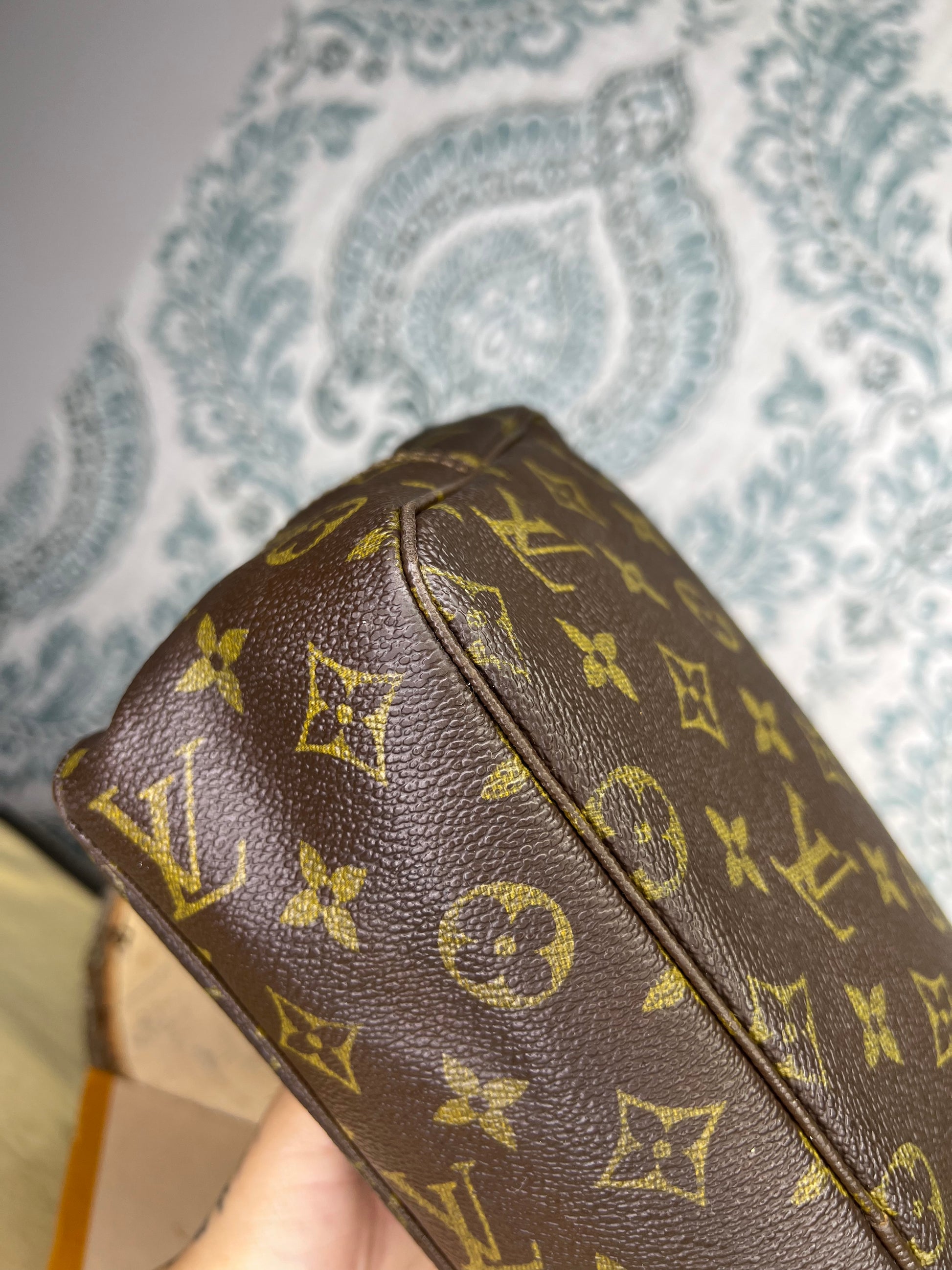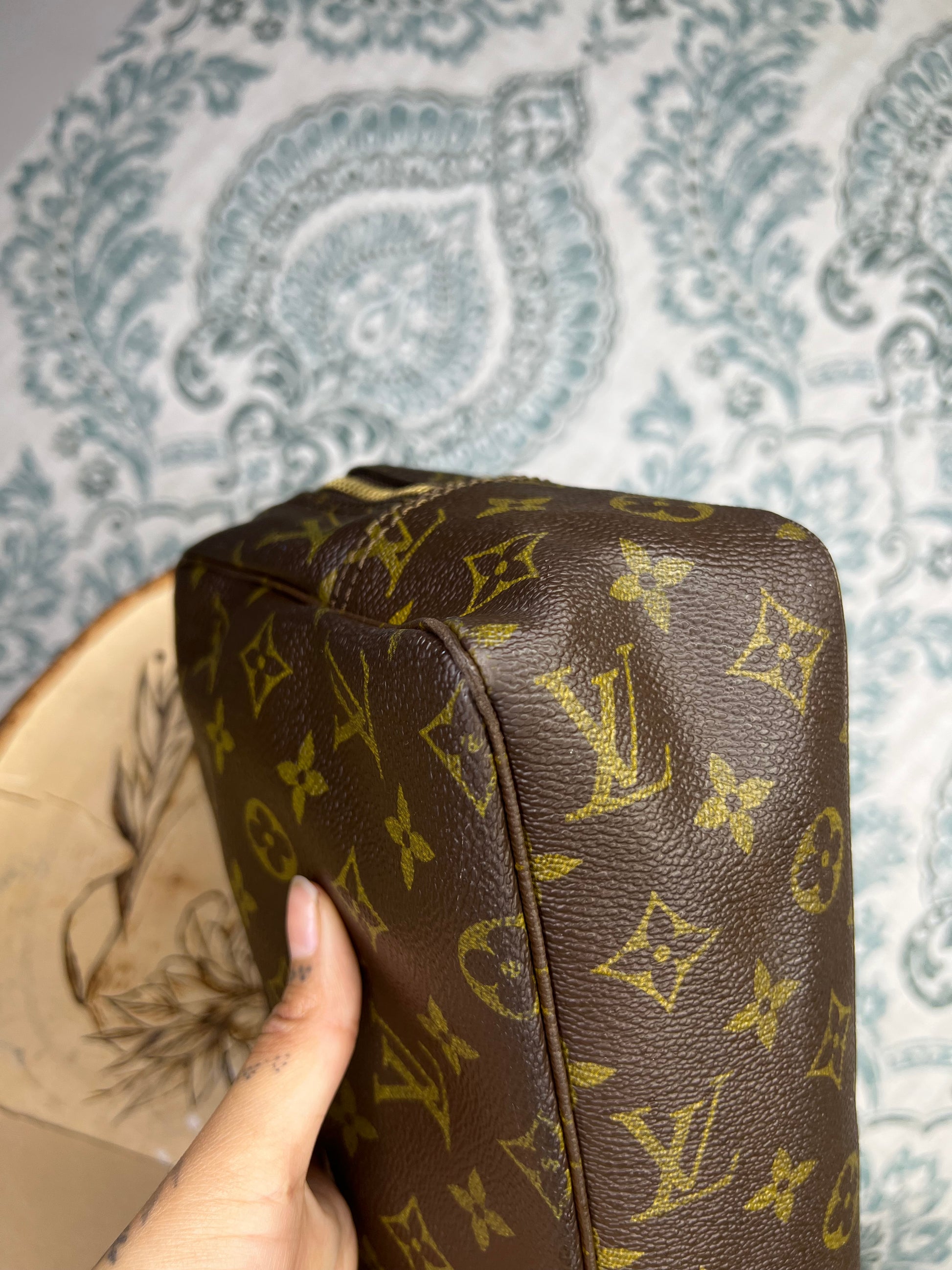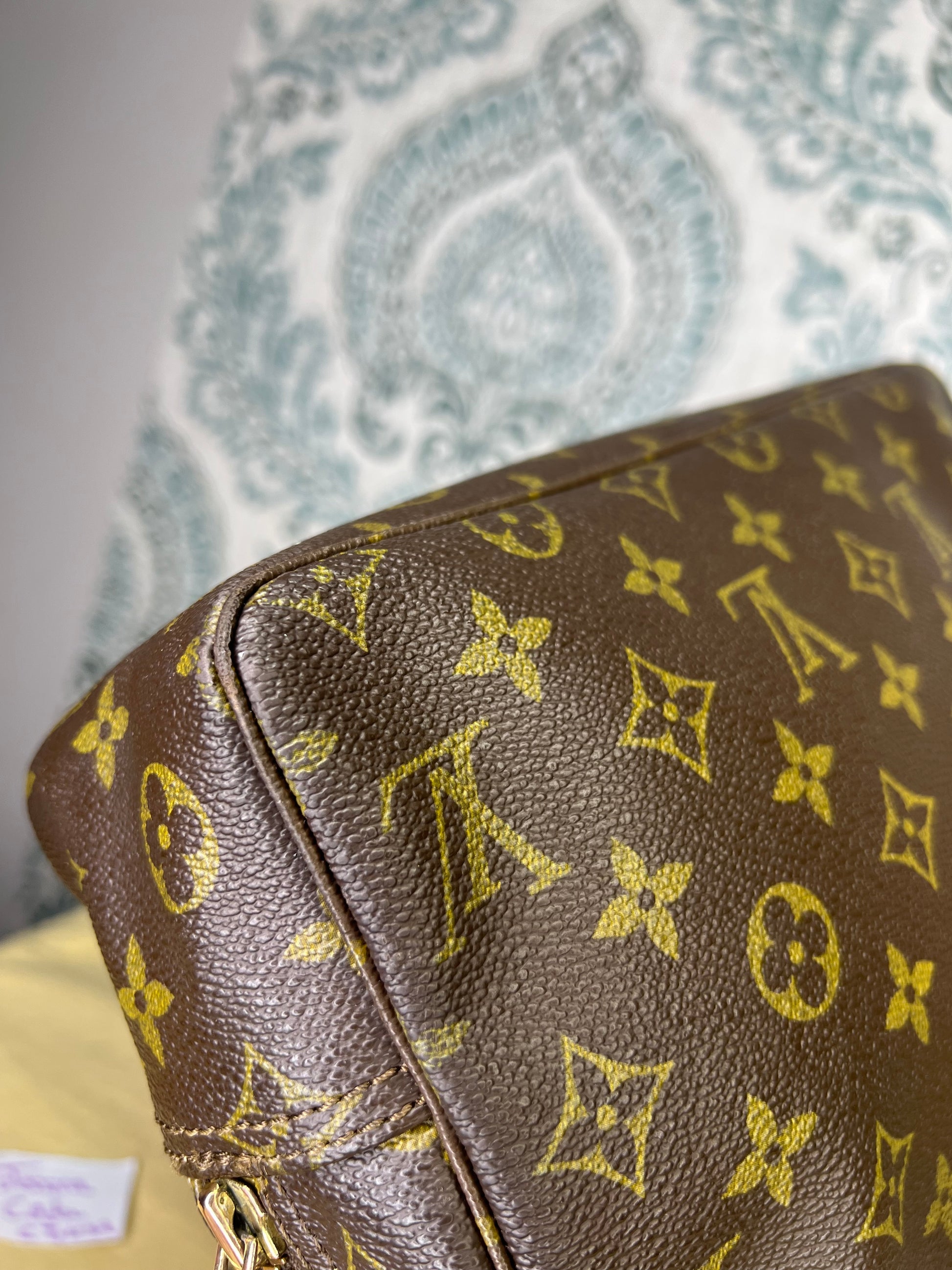 ๐ธ Canvas is intact and has no major damage. There is just minor canvas rubbing at corners of the pouch. Monogram has fading, but overall clear
