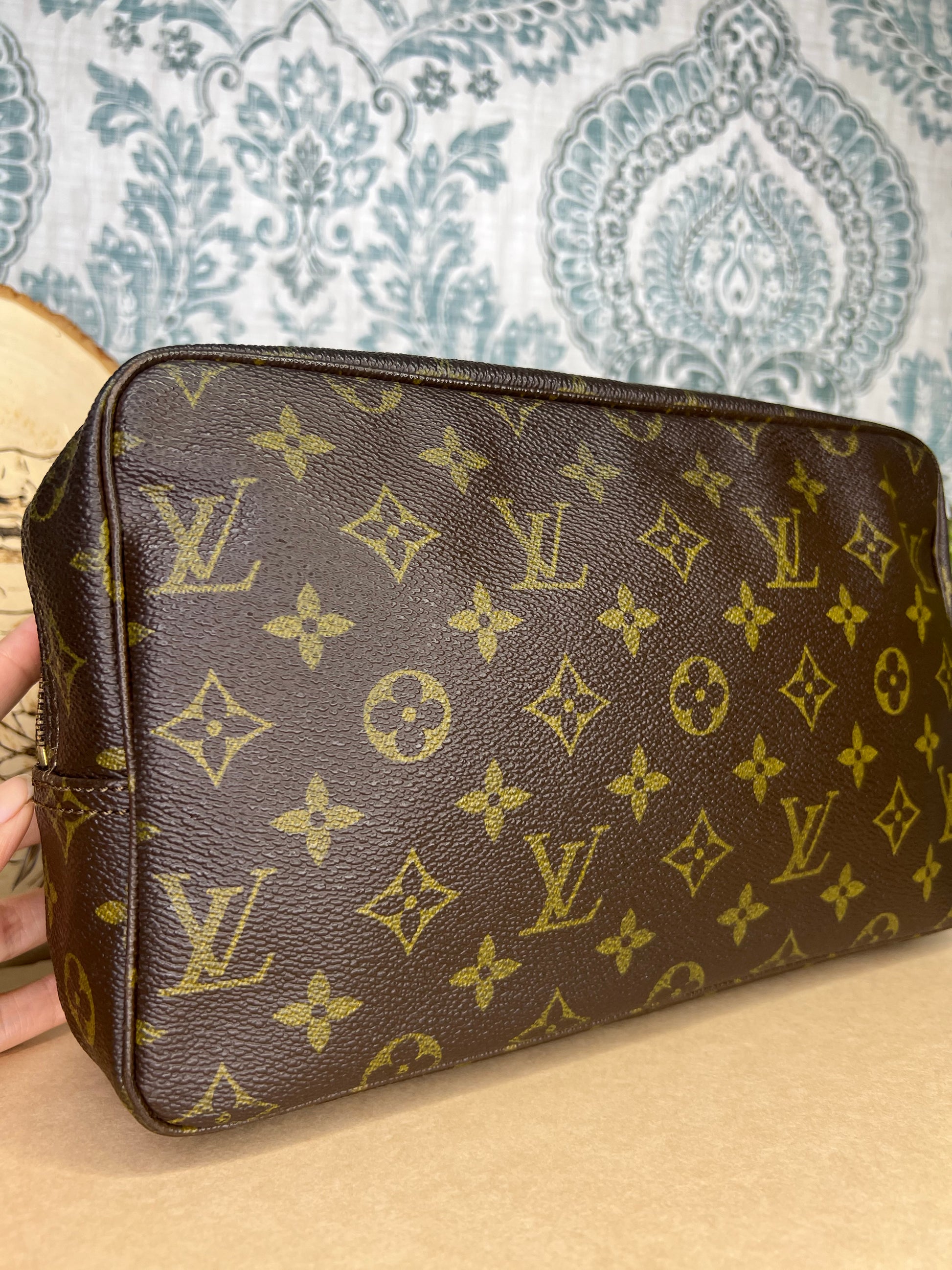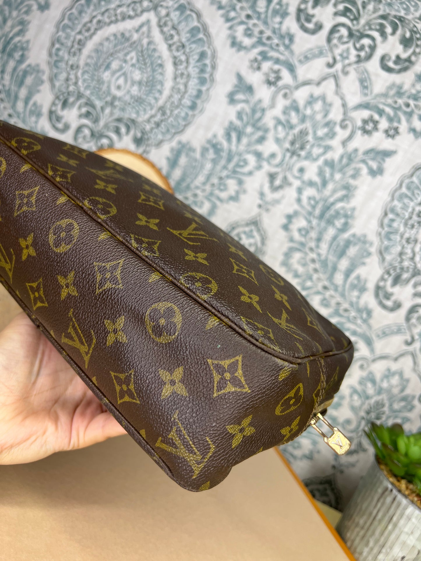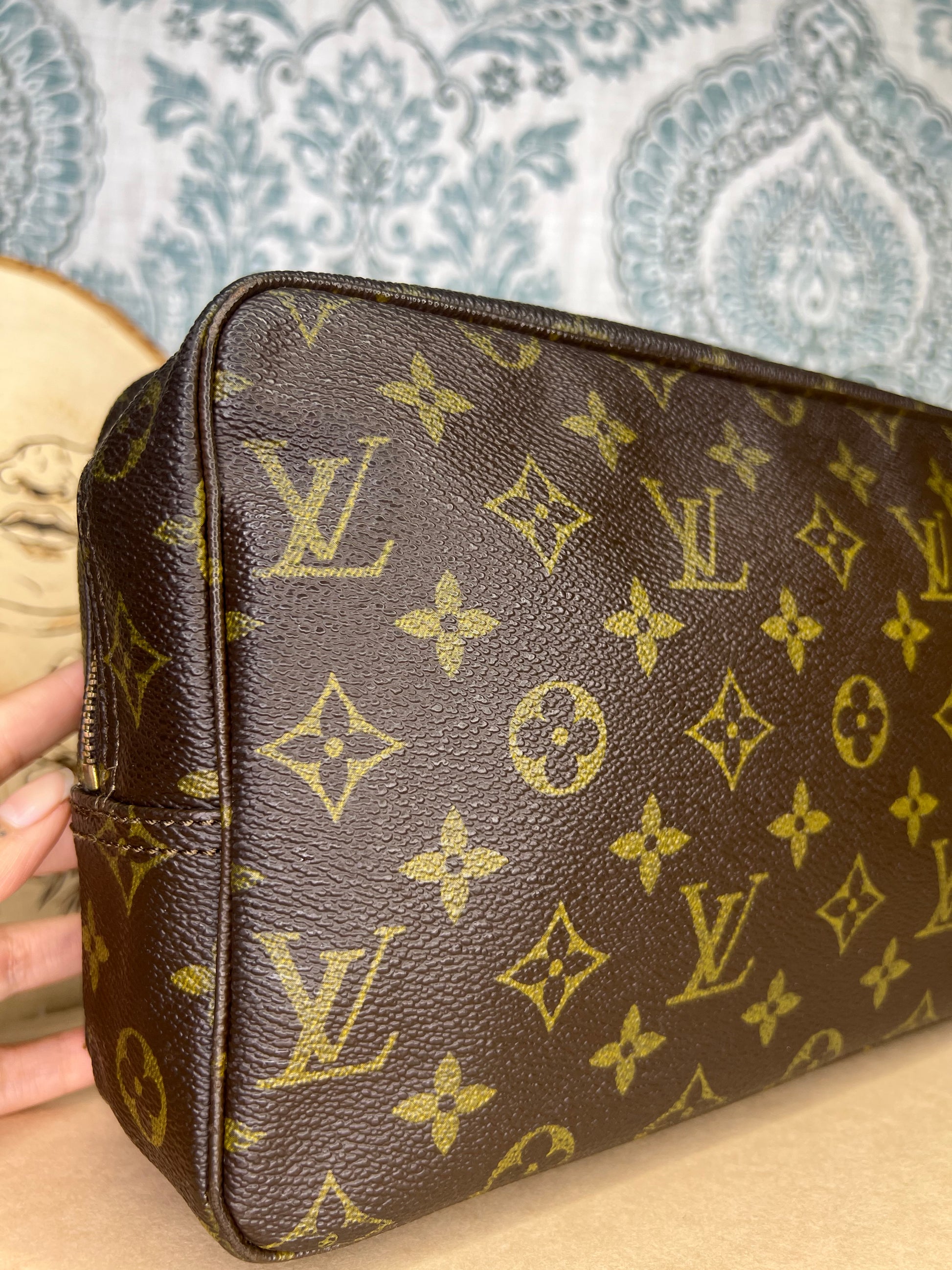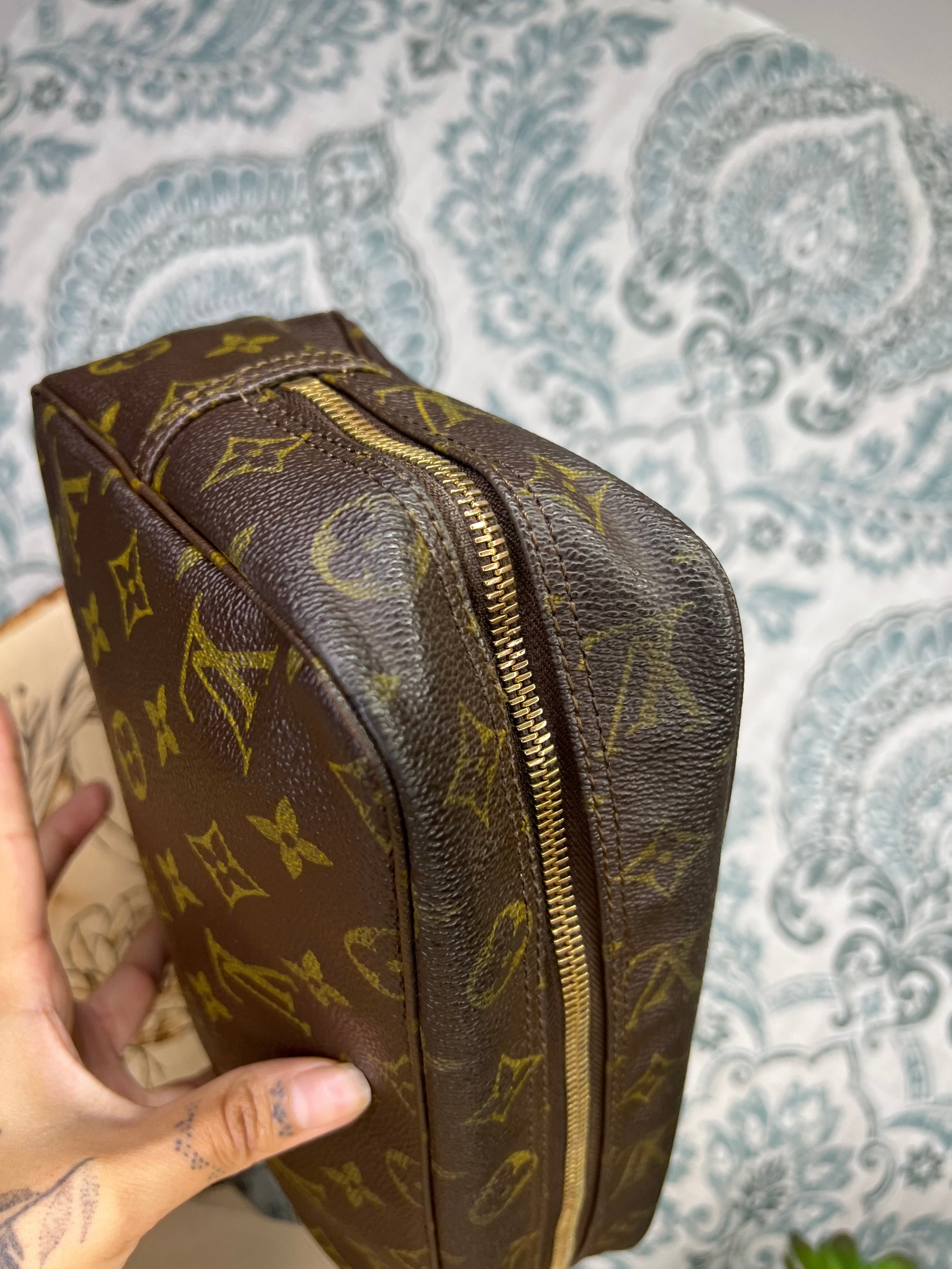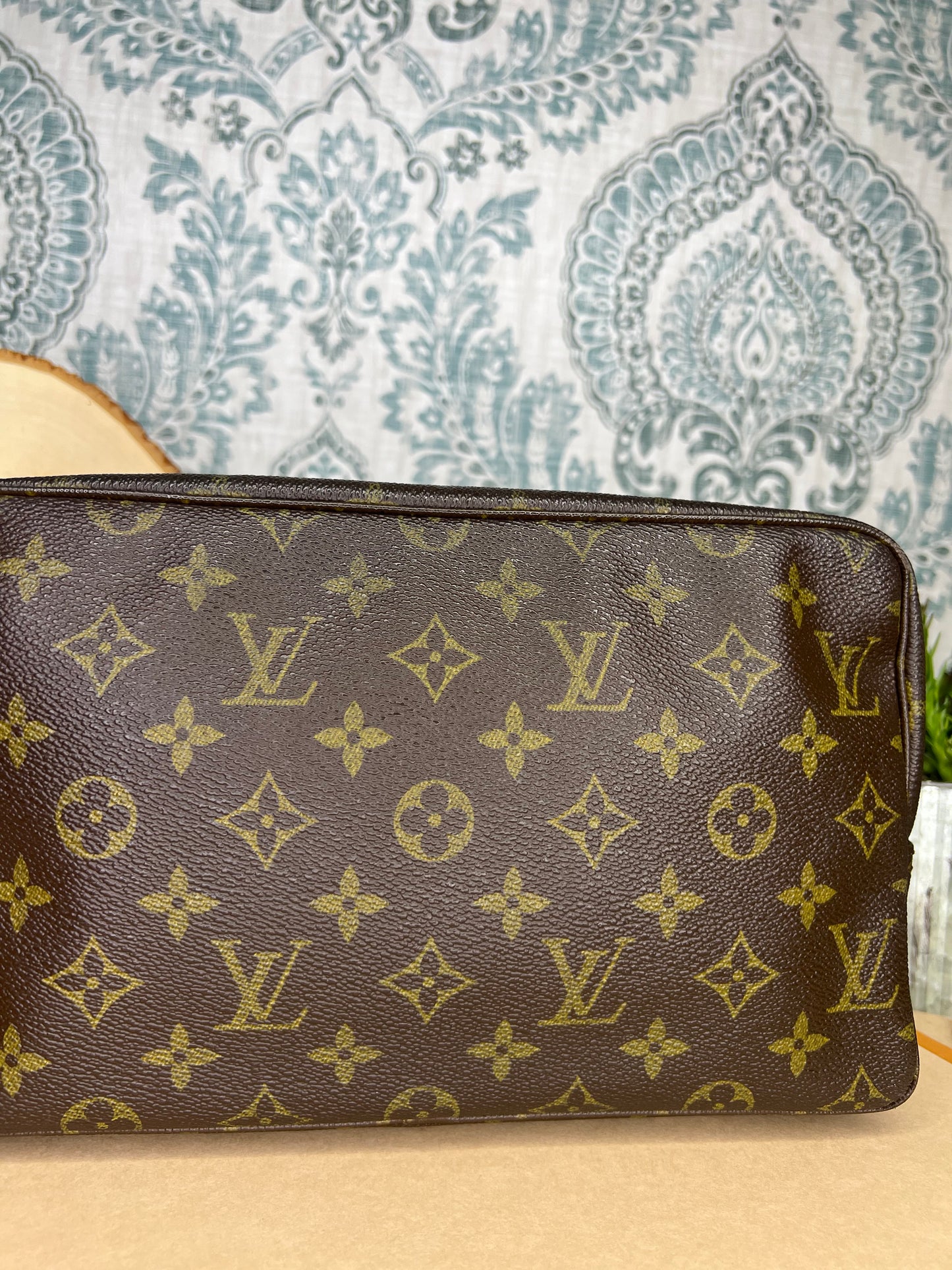 ๐ธ Canvas is intact and has no major damage. There is just minor canvas rubbing at corners of the pouch. Monogram has fading, but overall clear