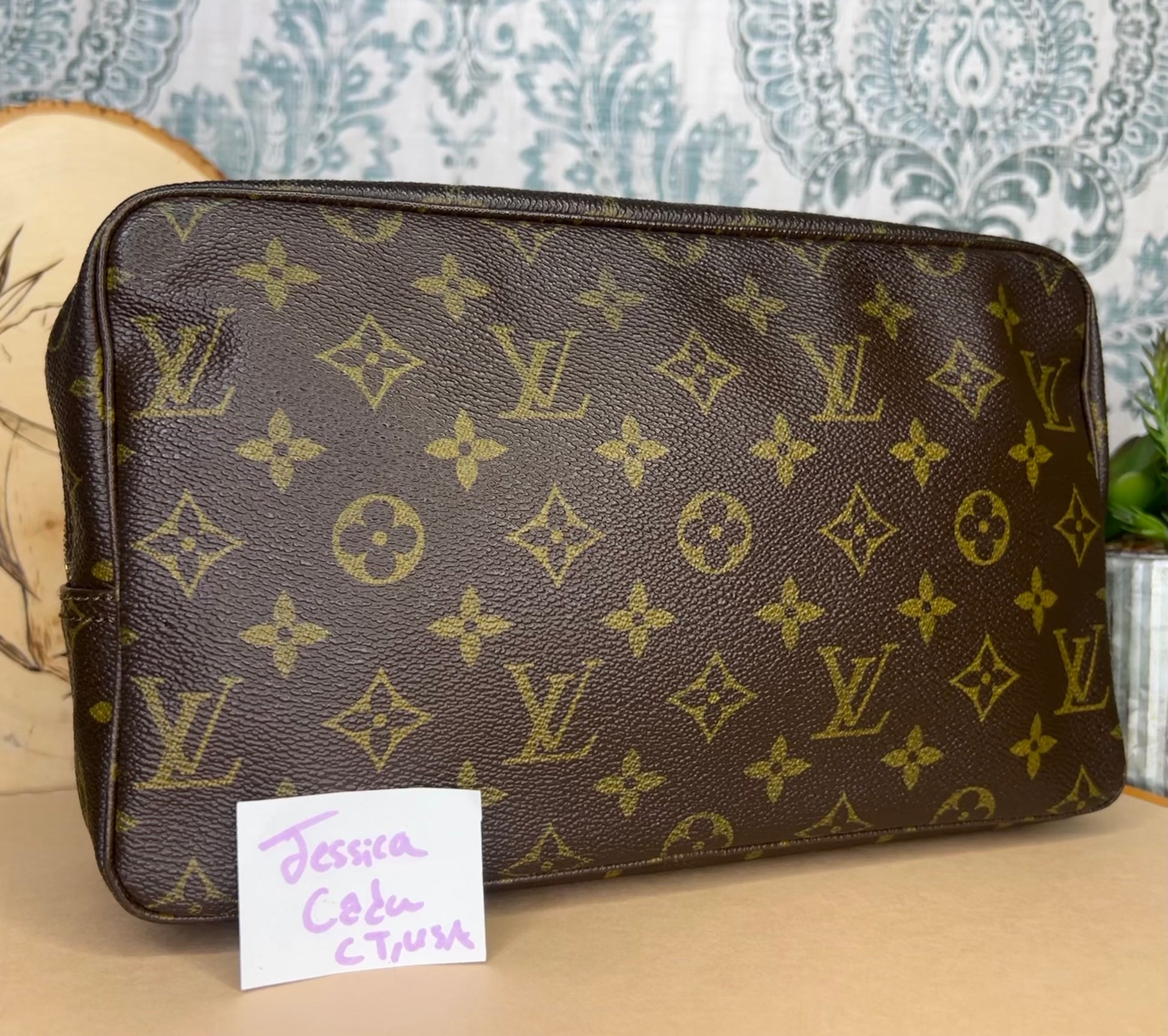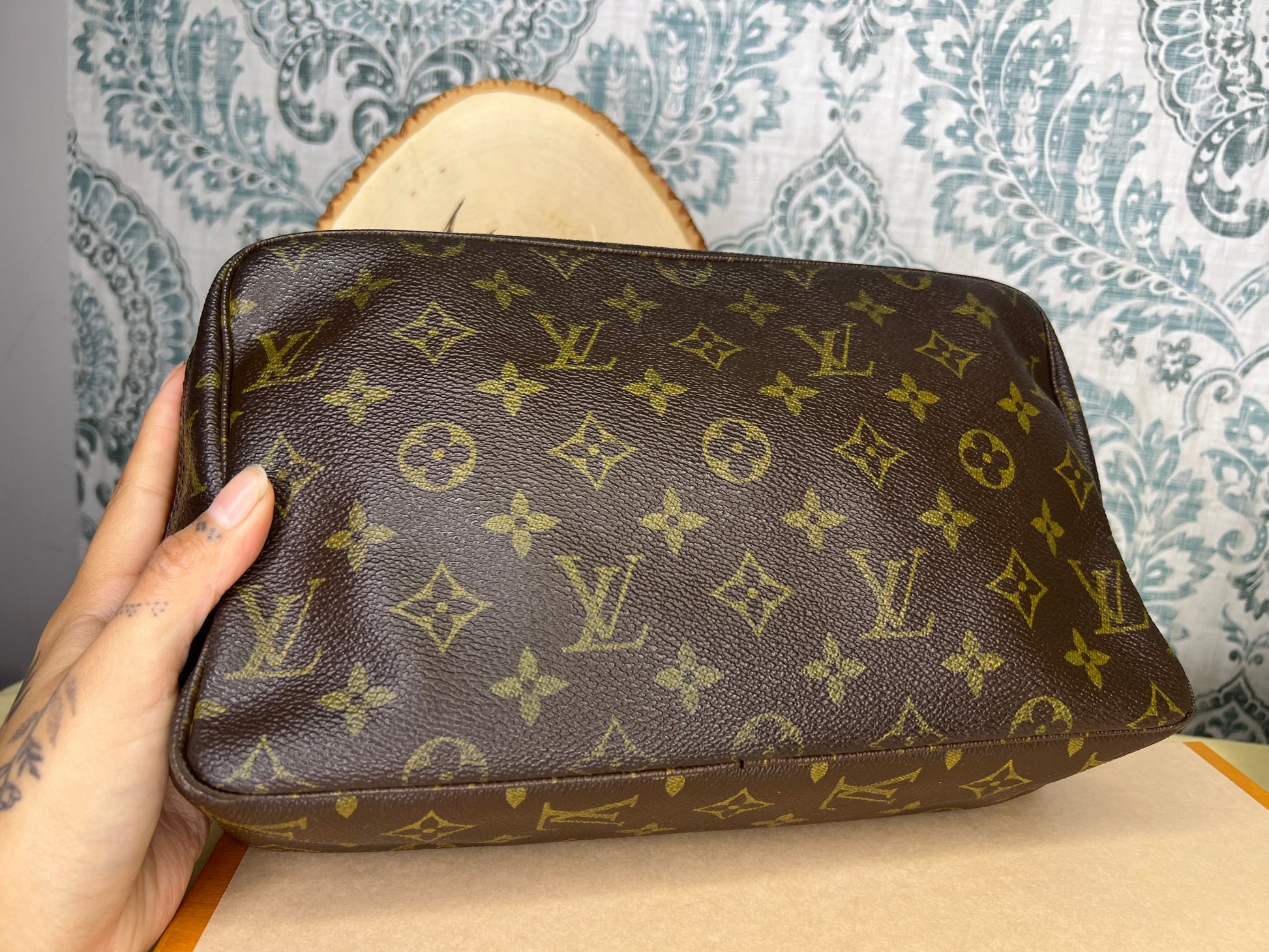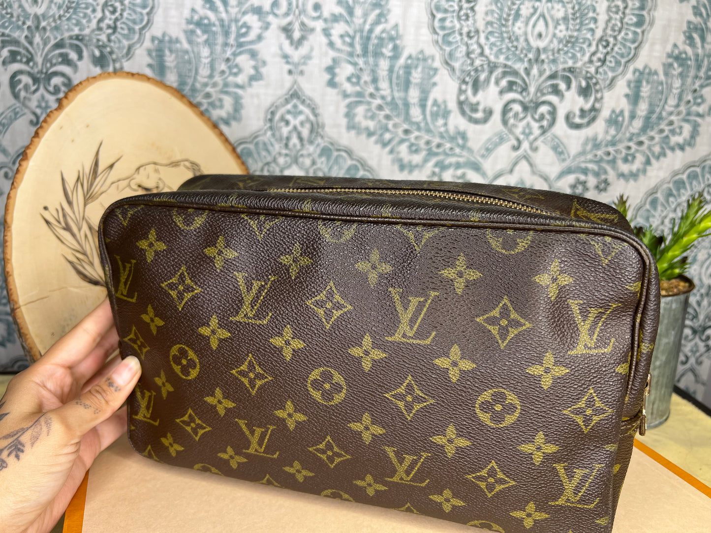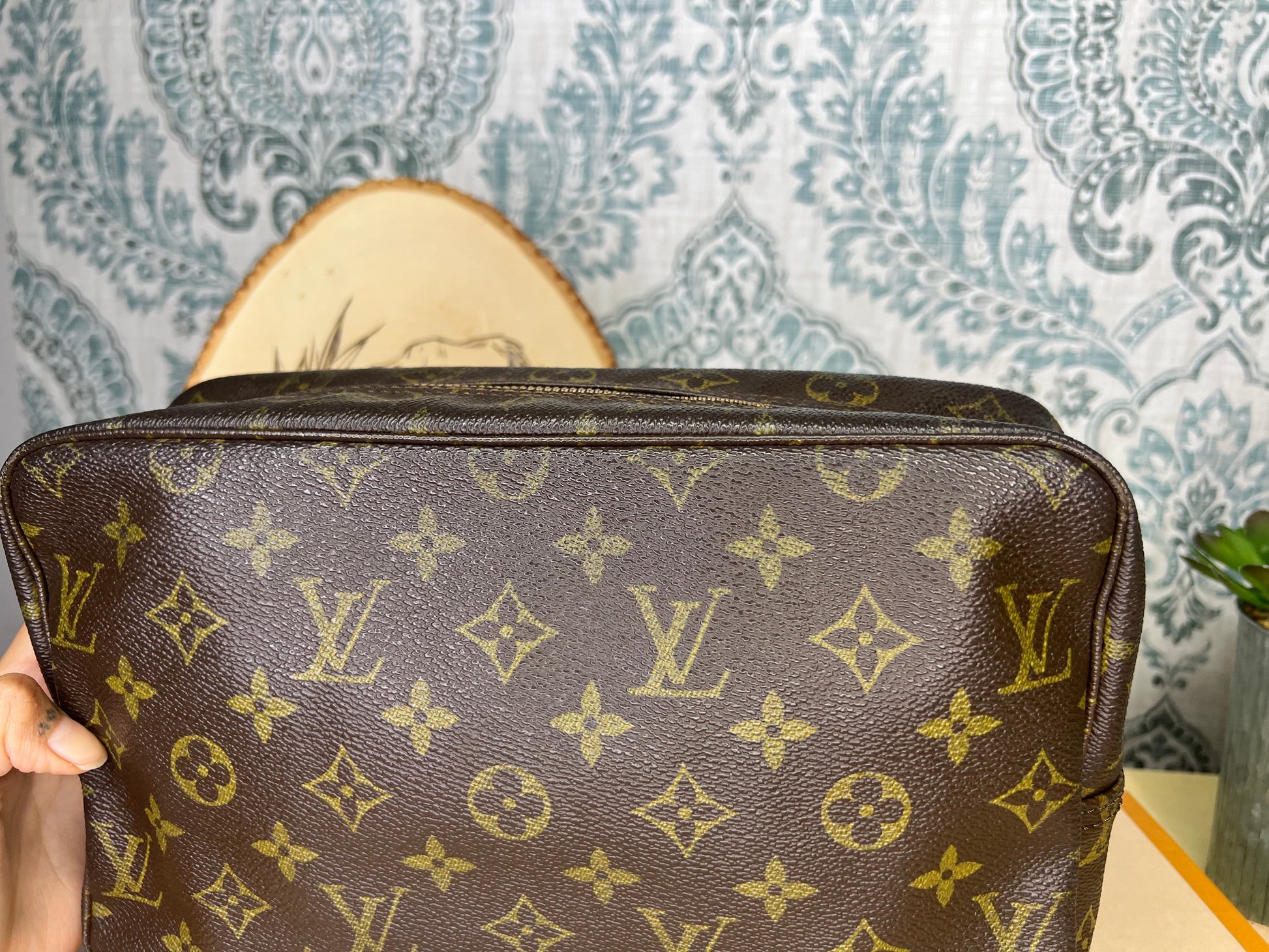 ๐ธ Canvas is intact and has no major damage. There is just minor canvas rubbing at corners of the pouch. Monogram has fading, but overall clear